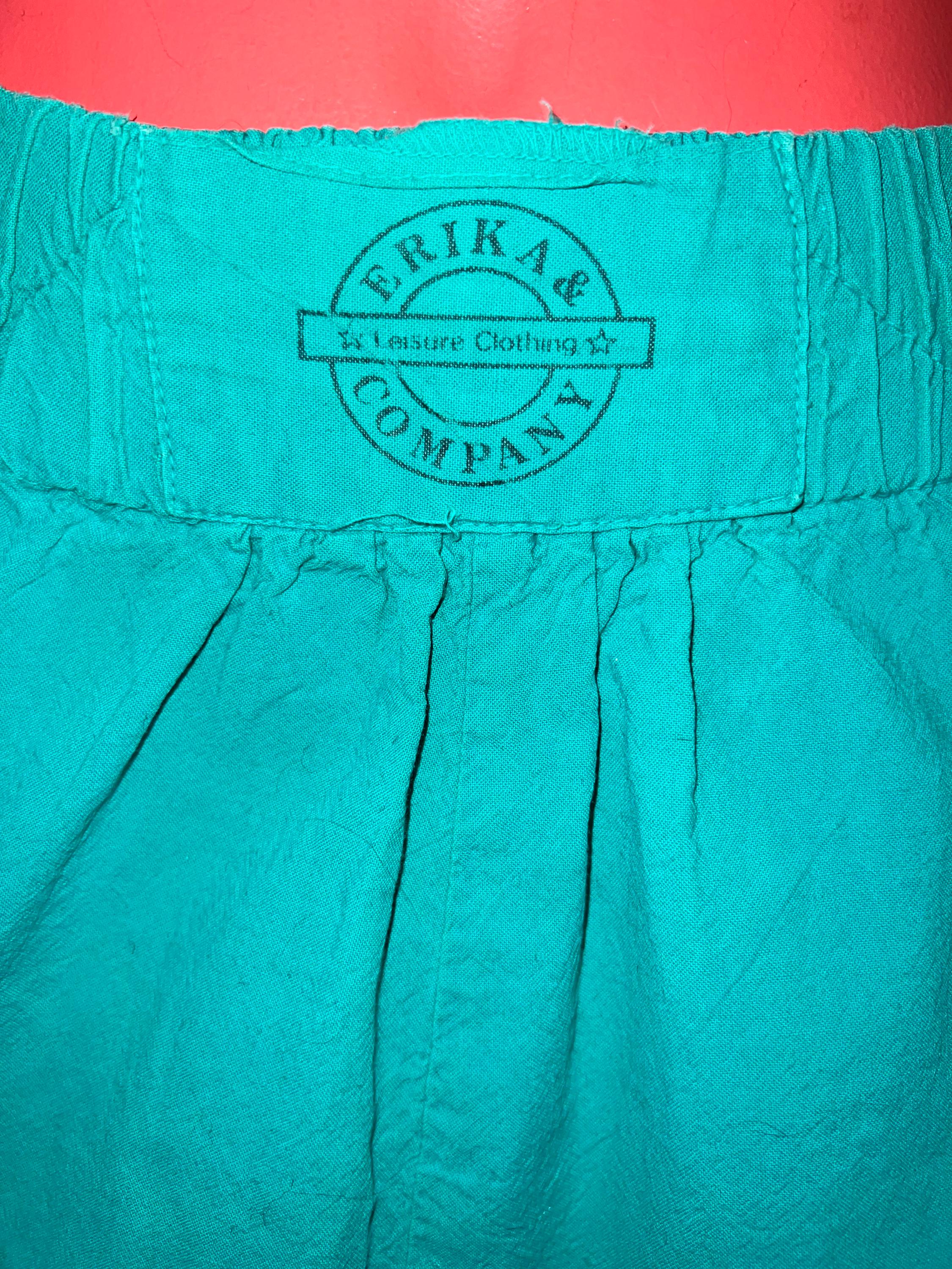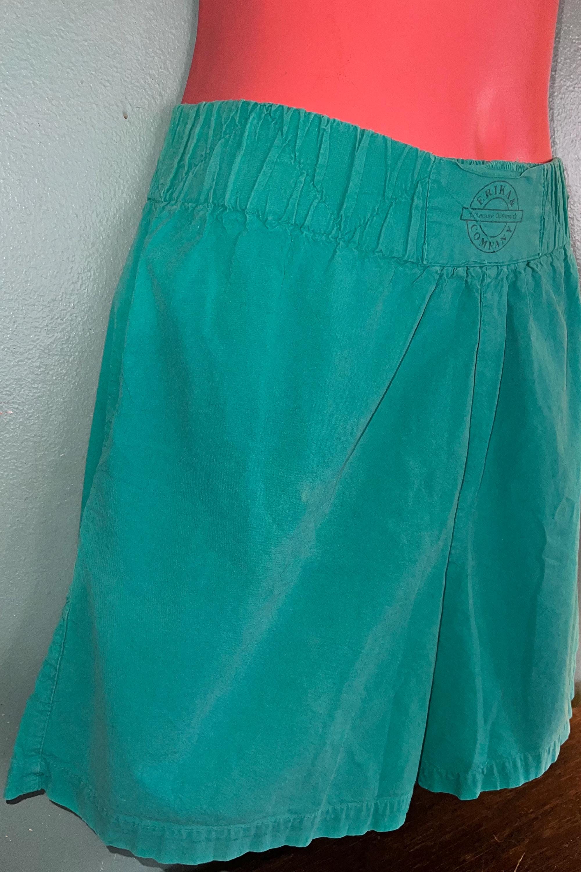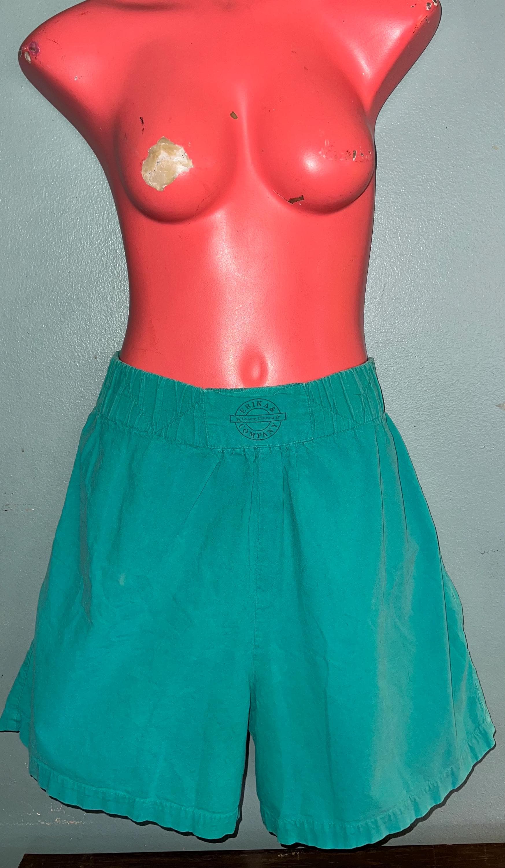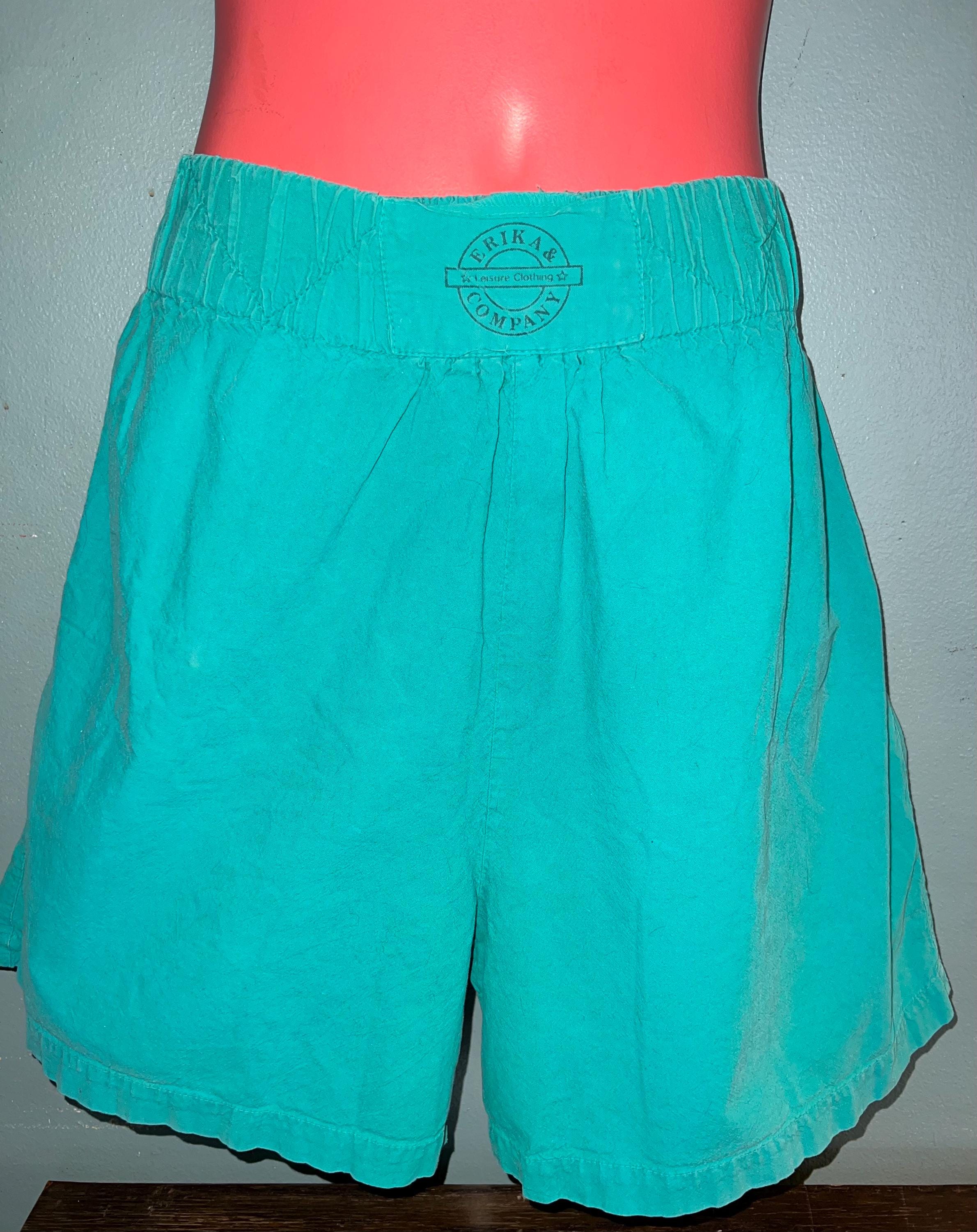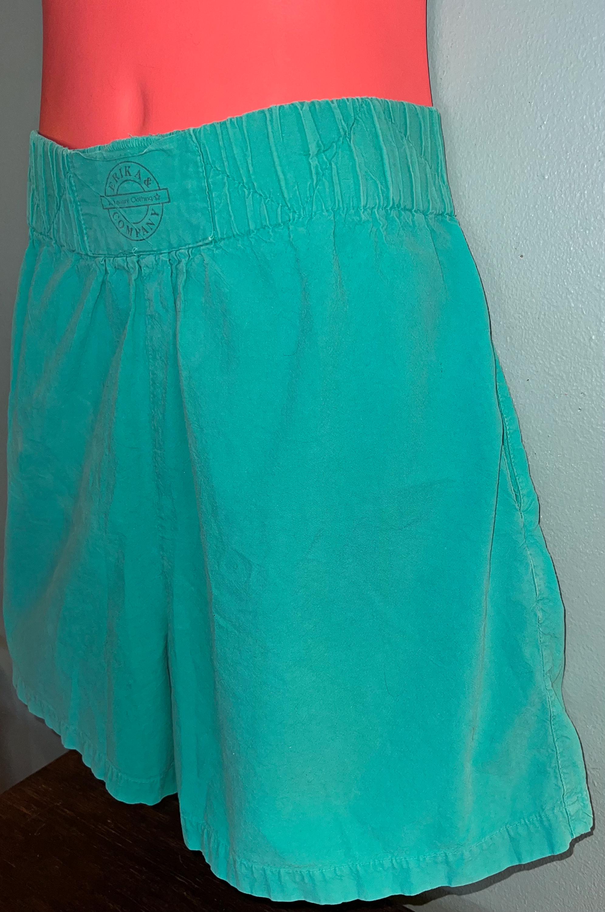 These are great extra comfy everyday aqua green shorts, with a thick elastic waist. They are loose, long, and again comfy. They have side pockets and no back pockets. They are in good vintage condition BUT do have a faded worn look to them, which is what I like about them.