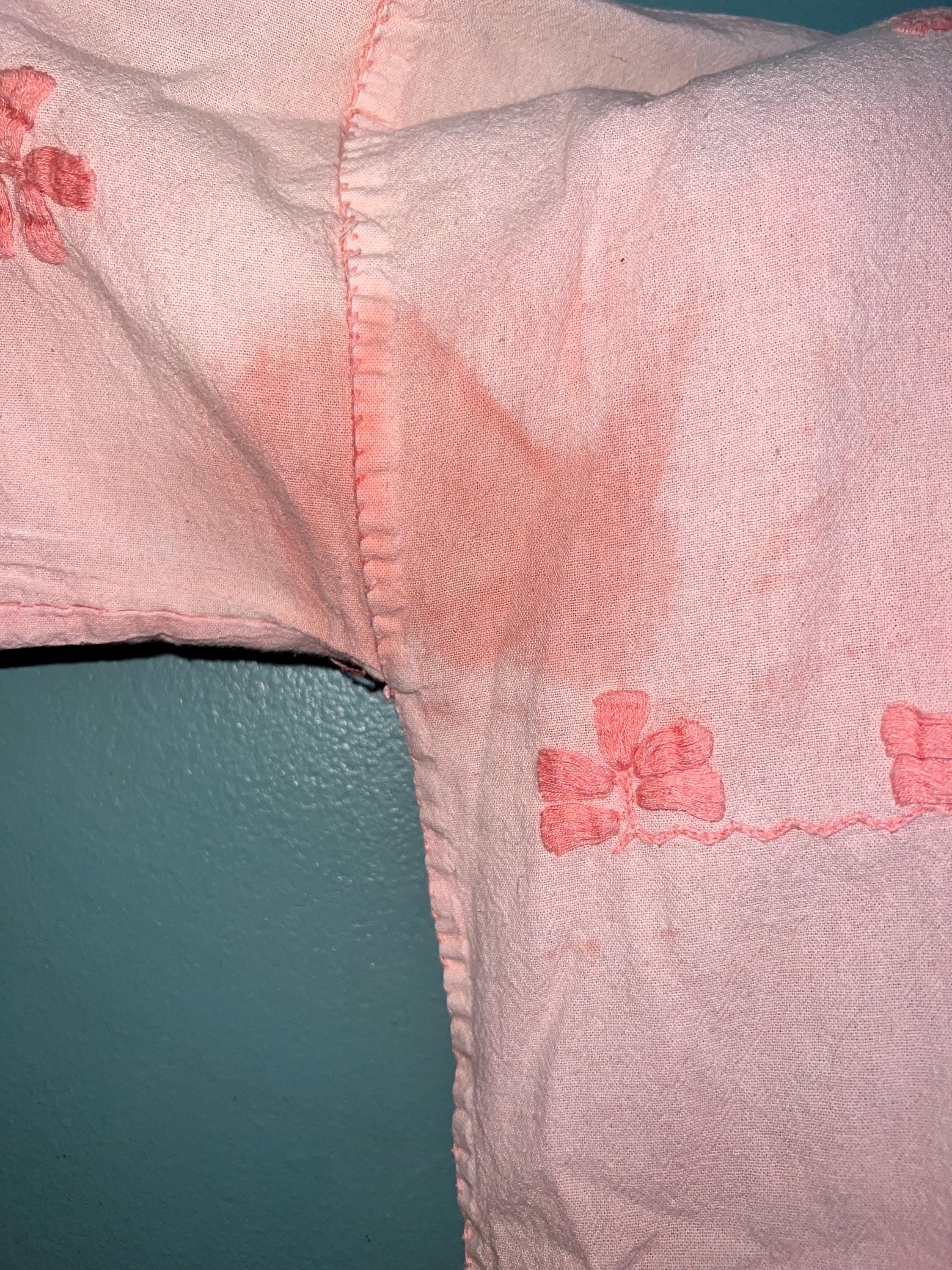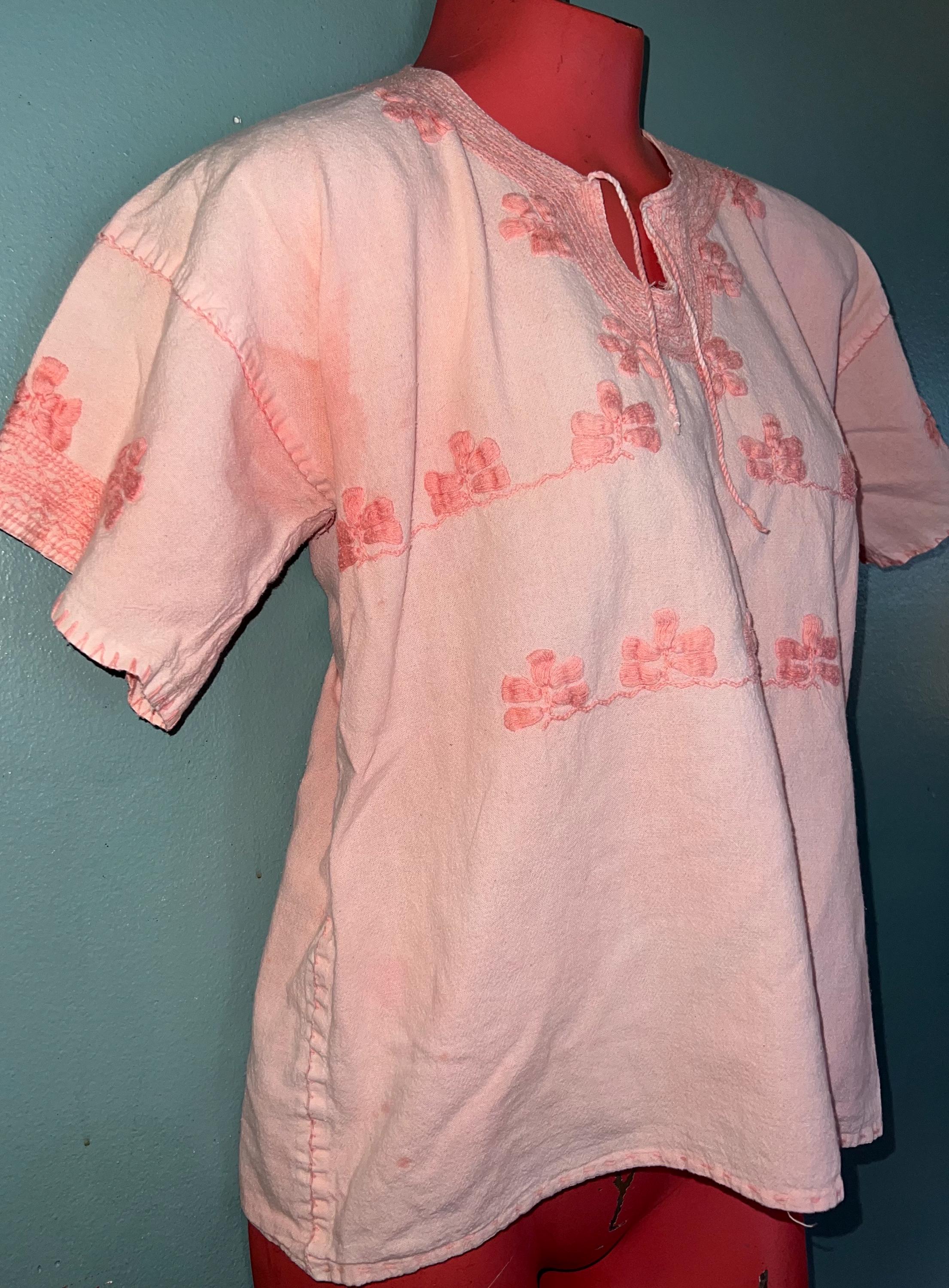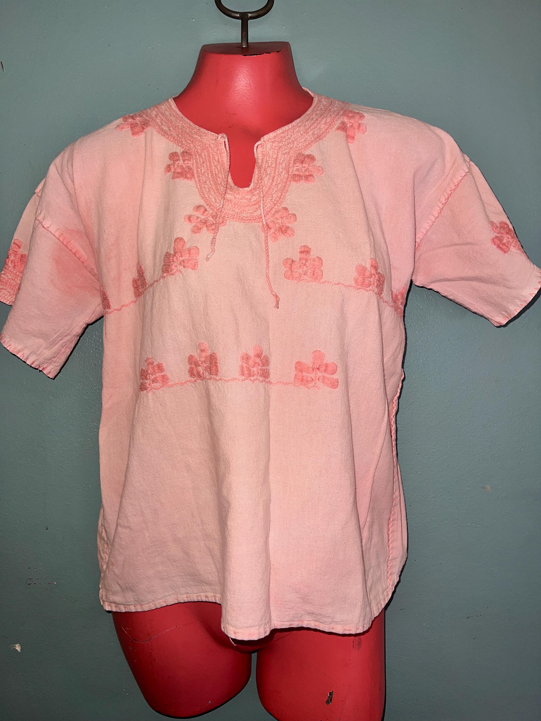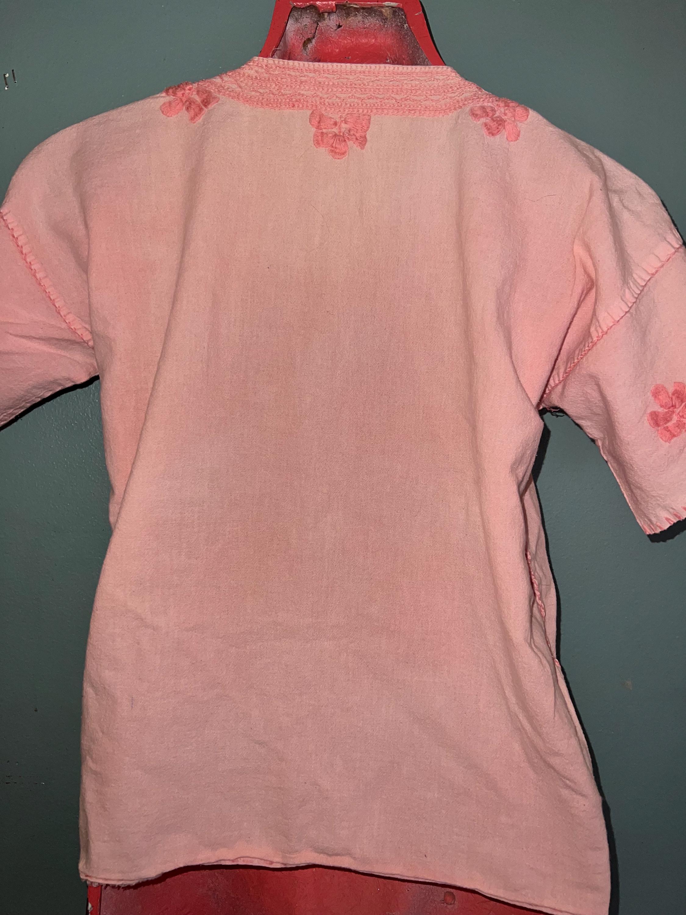 Very cool 60s shirt. It’s totally a hippie shirt. It’s light pink with dark pink embroidered on it. There are a few areas where darker pink has bled onto it, (see photos) In my opinion that just gives it even more character. It’s very awesome!