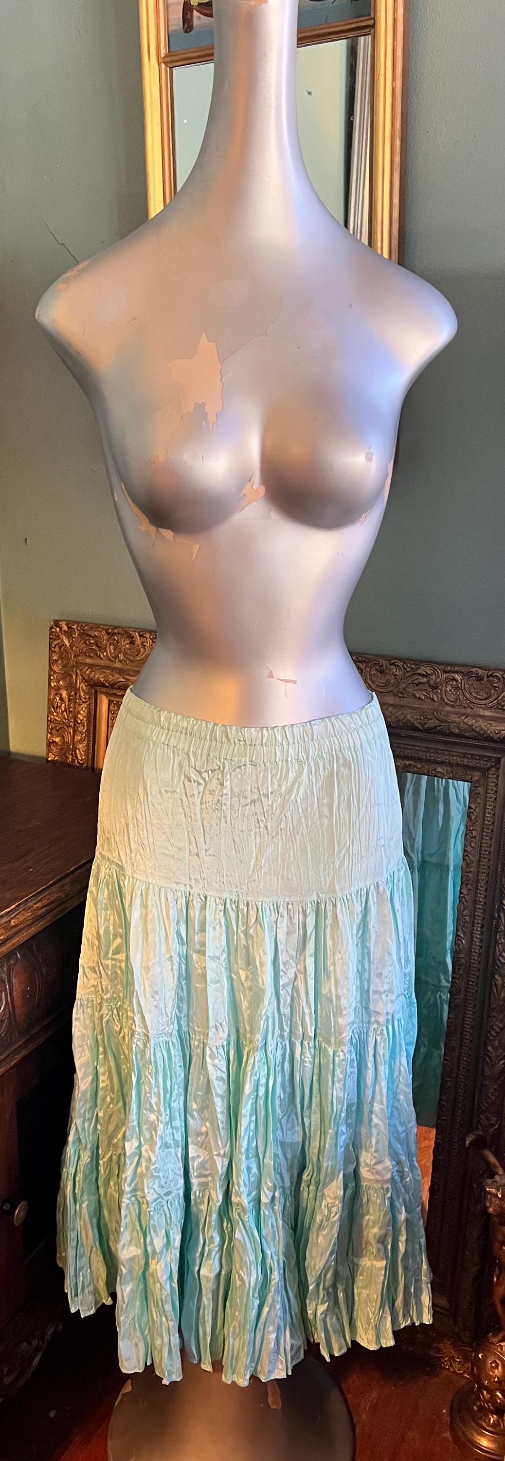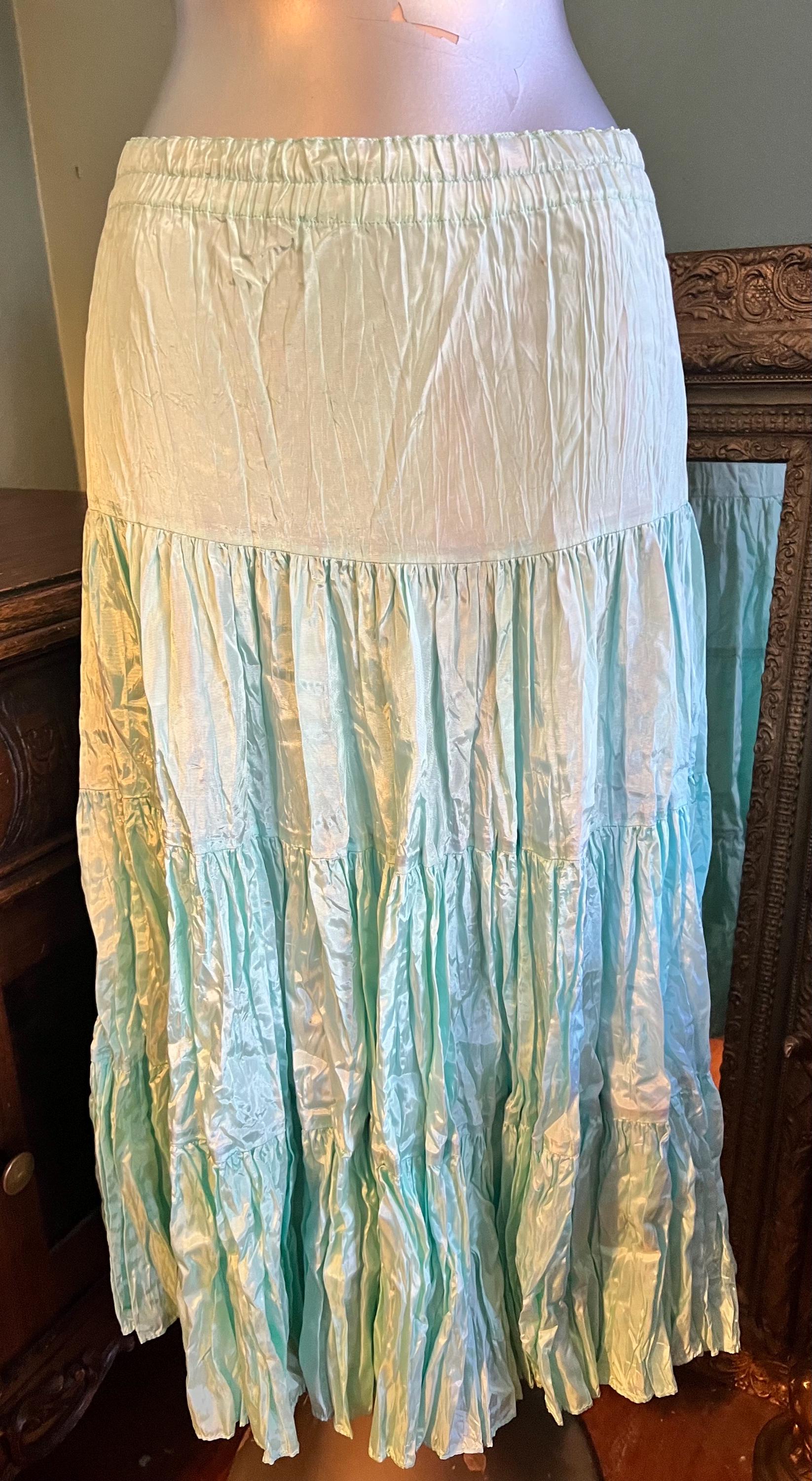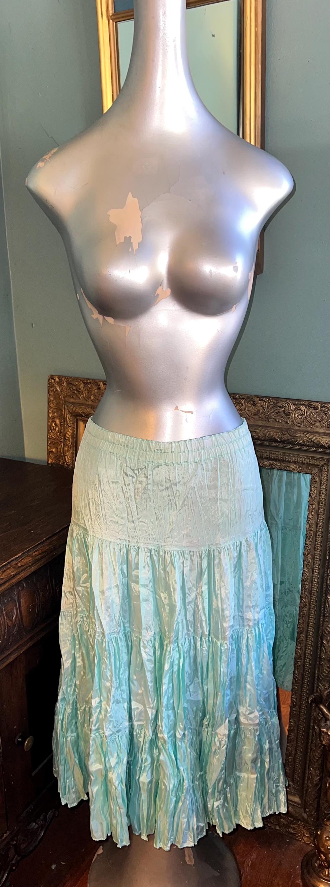 This is a great beautiful classic maxi skirt. I think it’s from the 70’s or early 80’s. The brand is very hard to decipher and I couldn’t find anymore like it but It’s so awesome! it’s full and flowy so it flairs! Its got the feel of crushed satin, but it’s actually rayon. It’s got an elastic waist for ultimate comfort! Very nice, in good vintage condition.