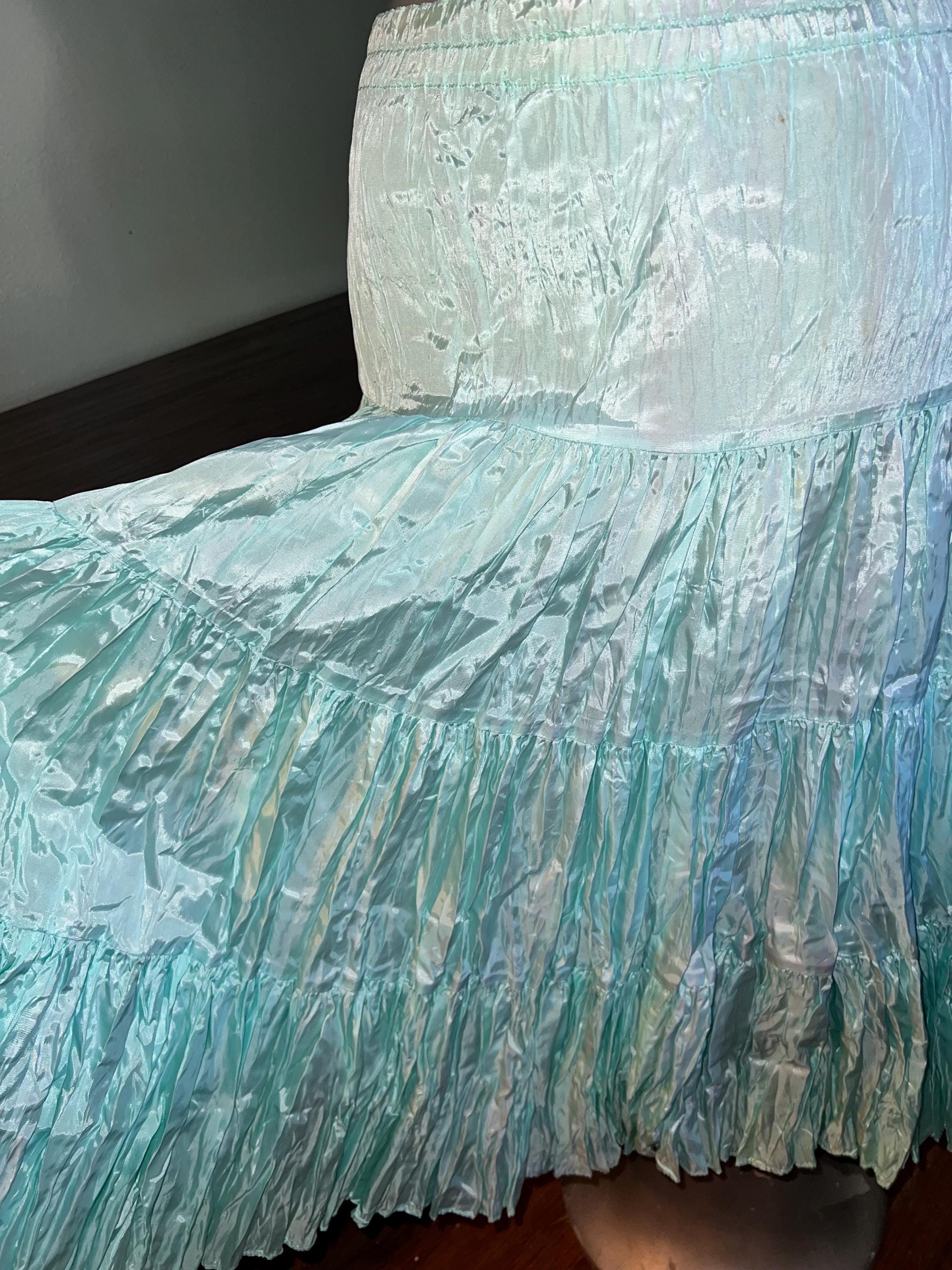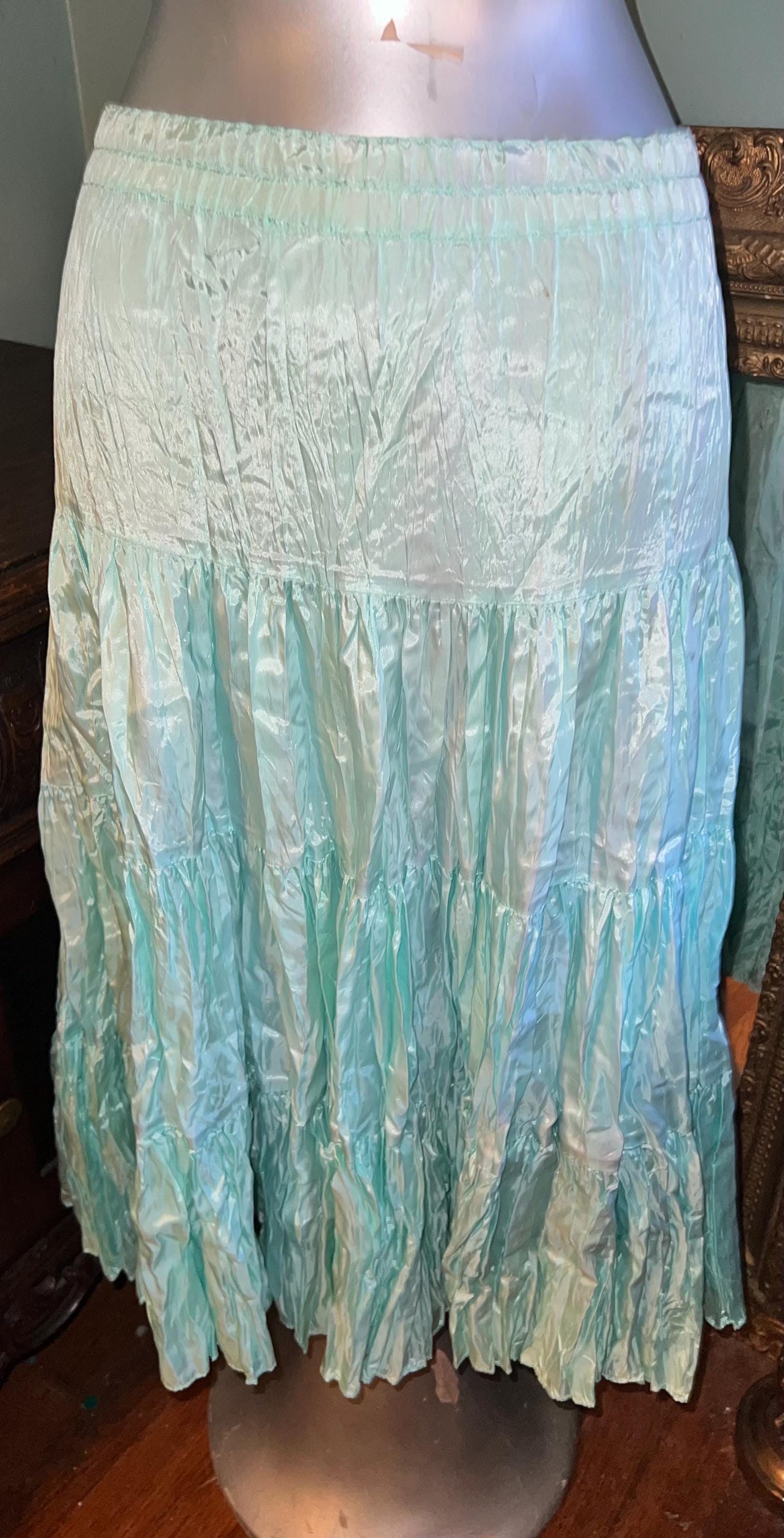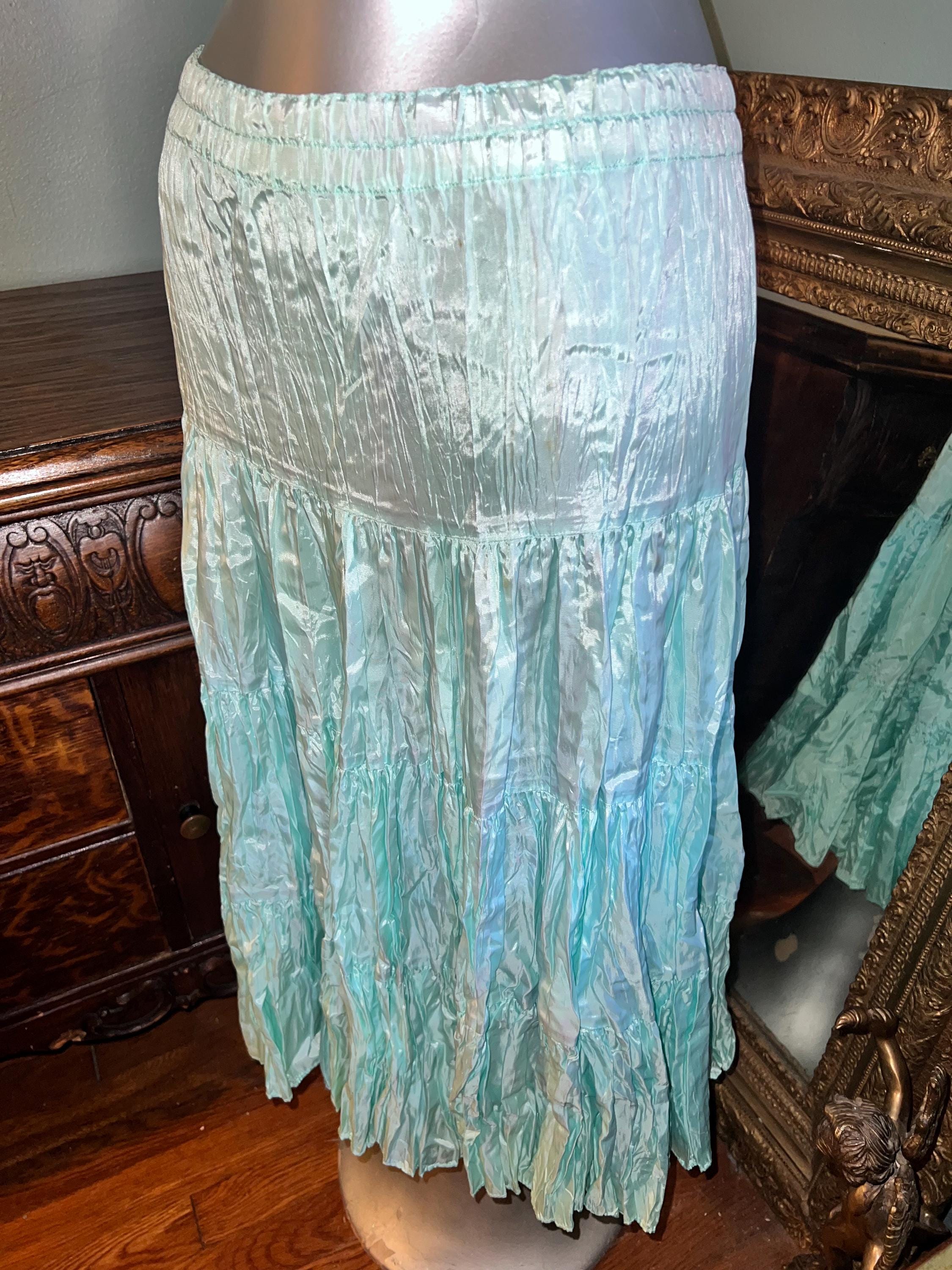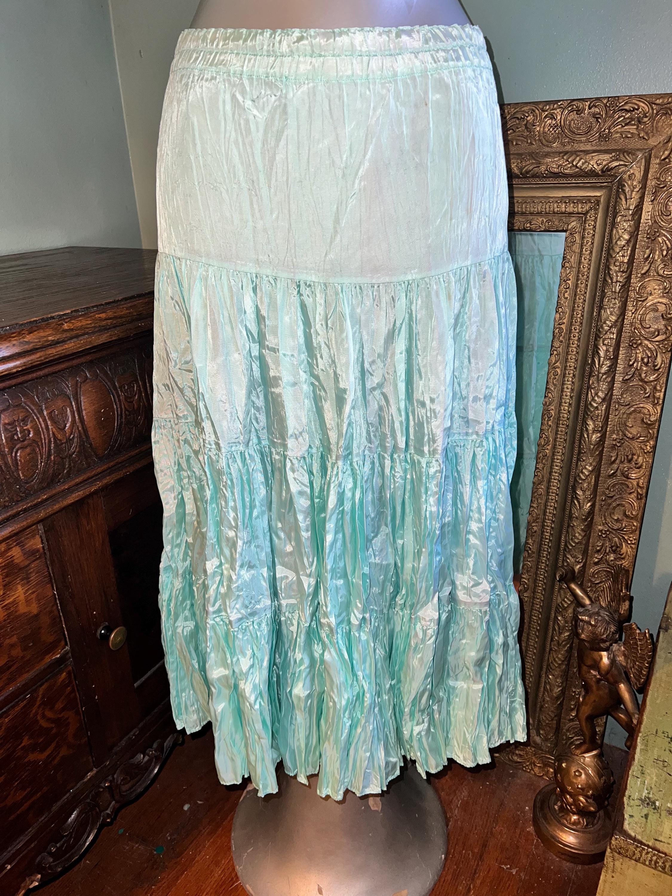 This is a great beautiful classic maxi skirt. I think it’s from the 70’s or early 80’s. The brand is very hard to decipher and I couldn’t find anymore like it but It’s so awesome! it’s full and flowy so it flairs! Its got the feel of crushed satin, but it’s actually rayon. It’s got an elastic waist for ultimate comfort! Very nice, in good vintage condition.