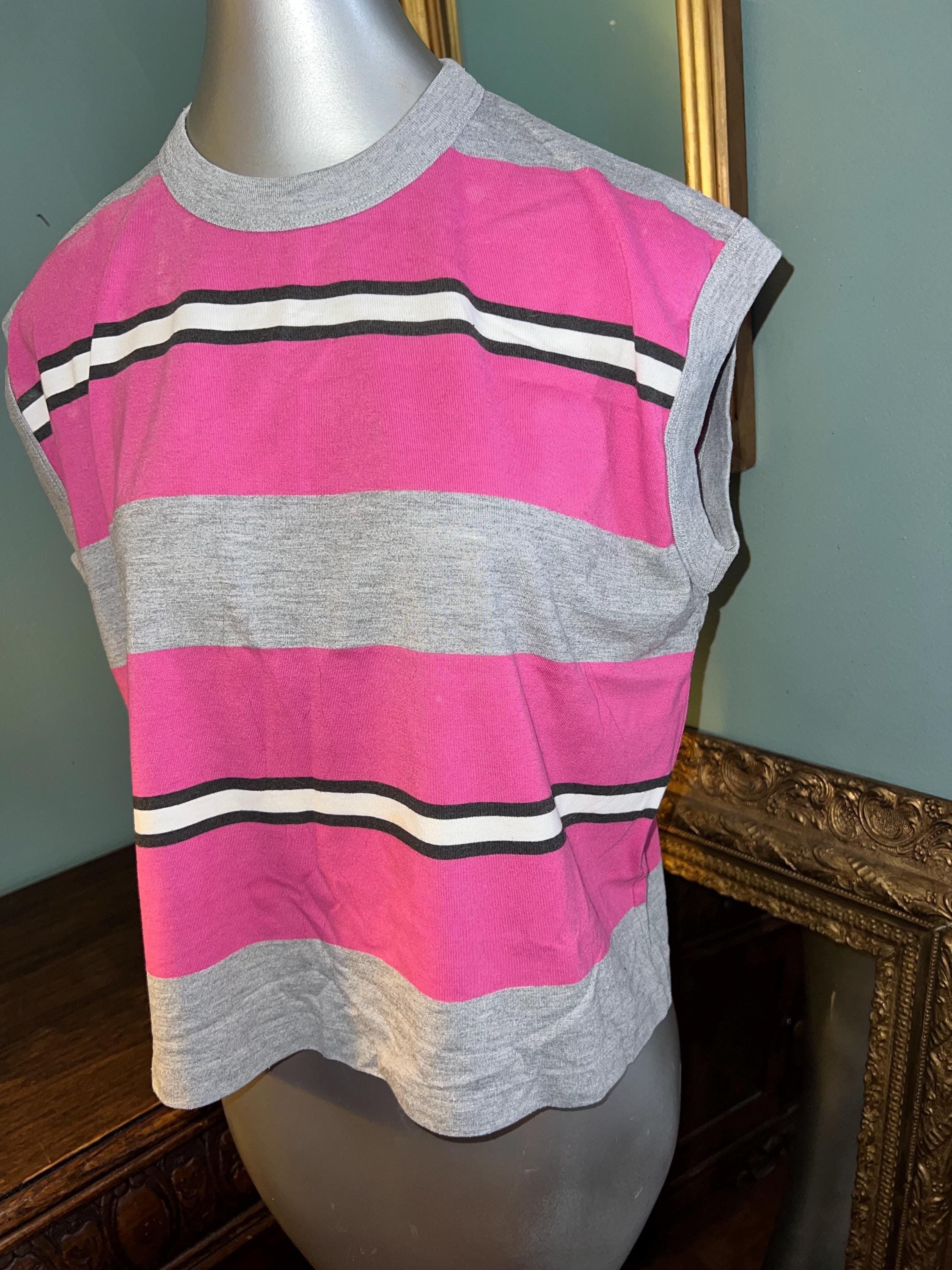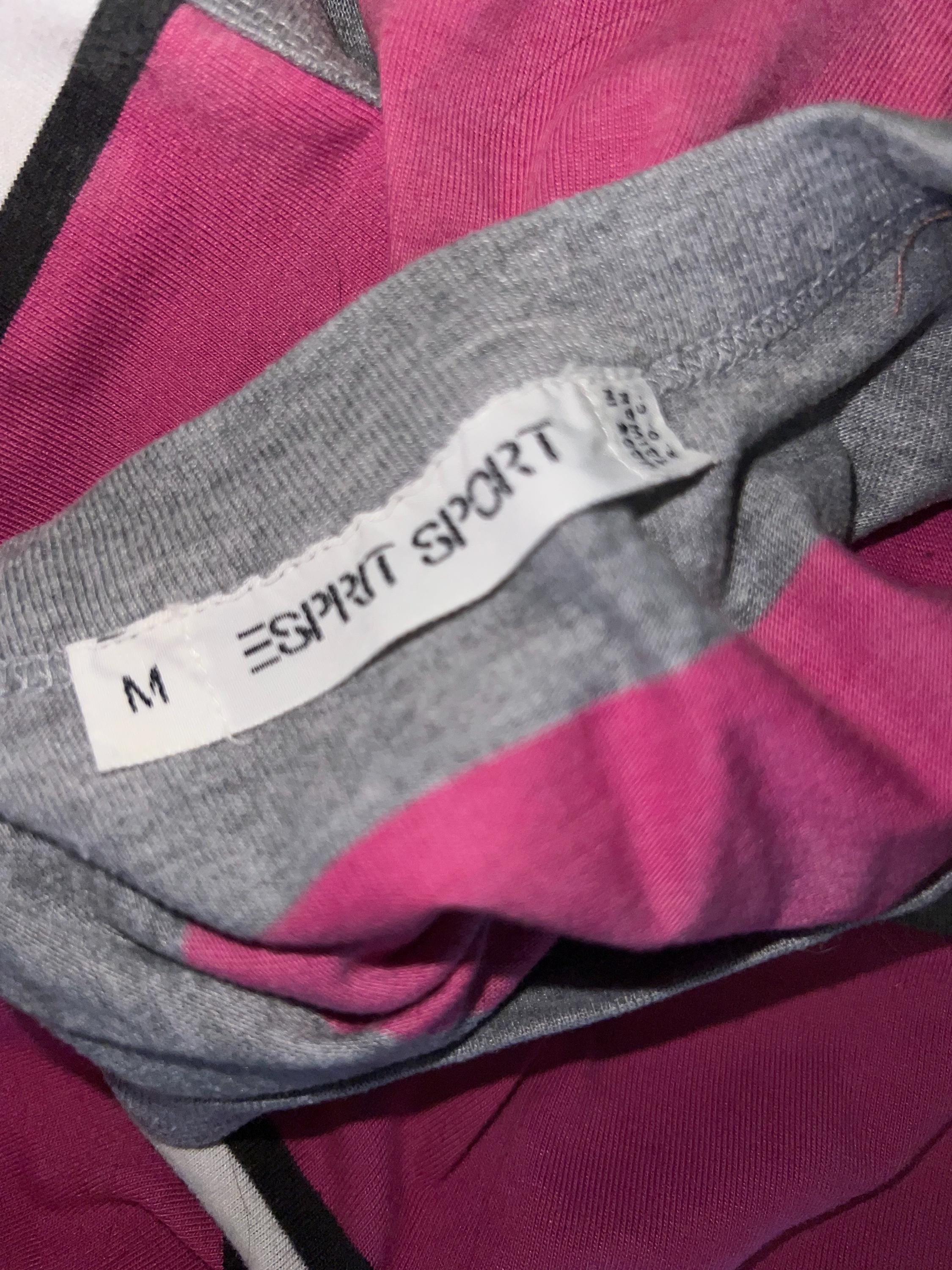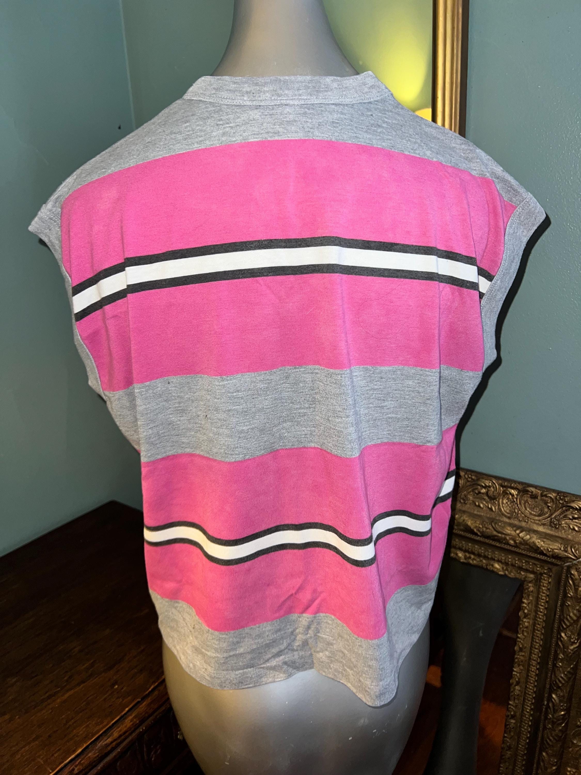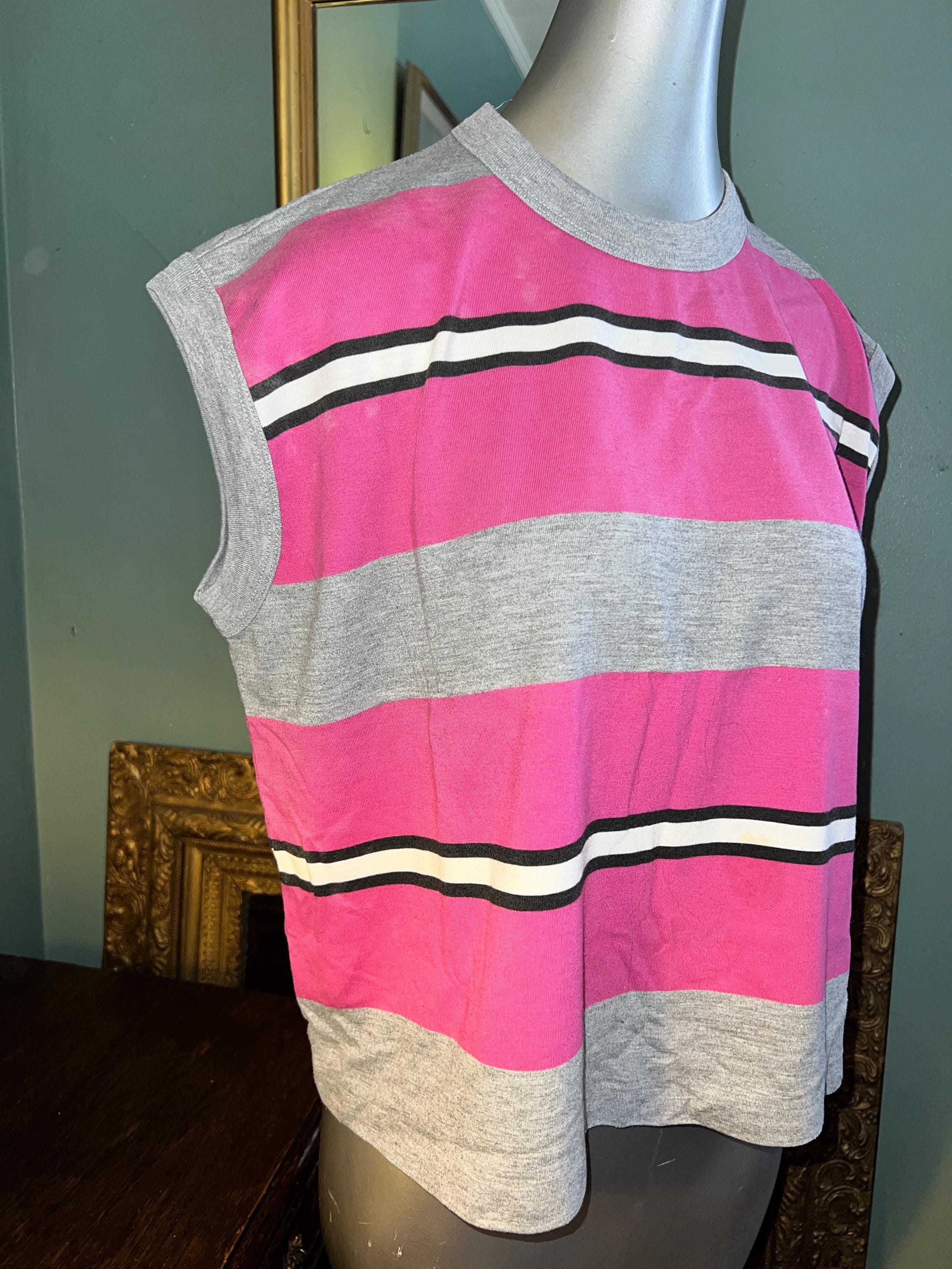 I love this great 80’s shirt! It is an Esprit Sport! I It has a simple design and it’s a half shirt and sleeveless. It’s a little worn and has a couple of white spots on it (see final photo ) but it’s still really great!