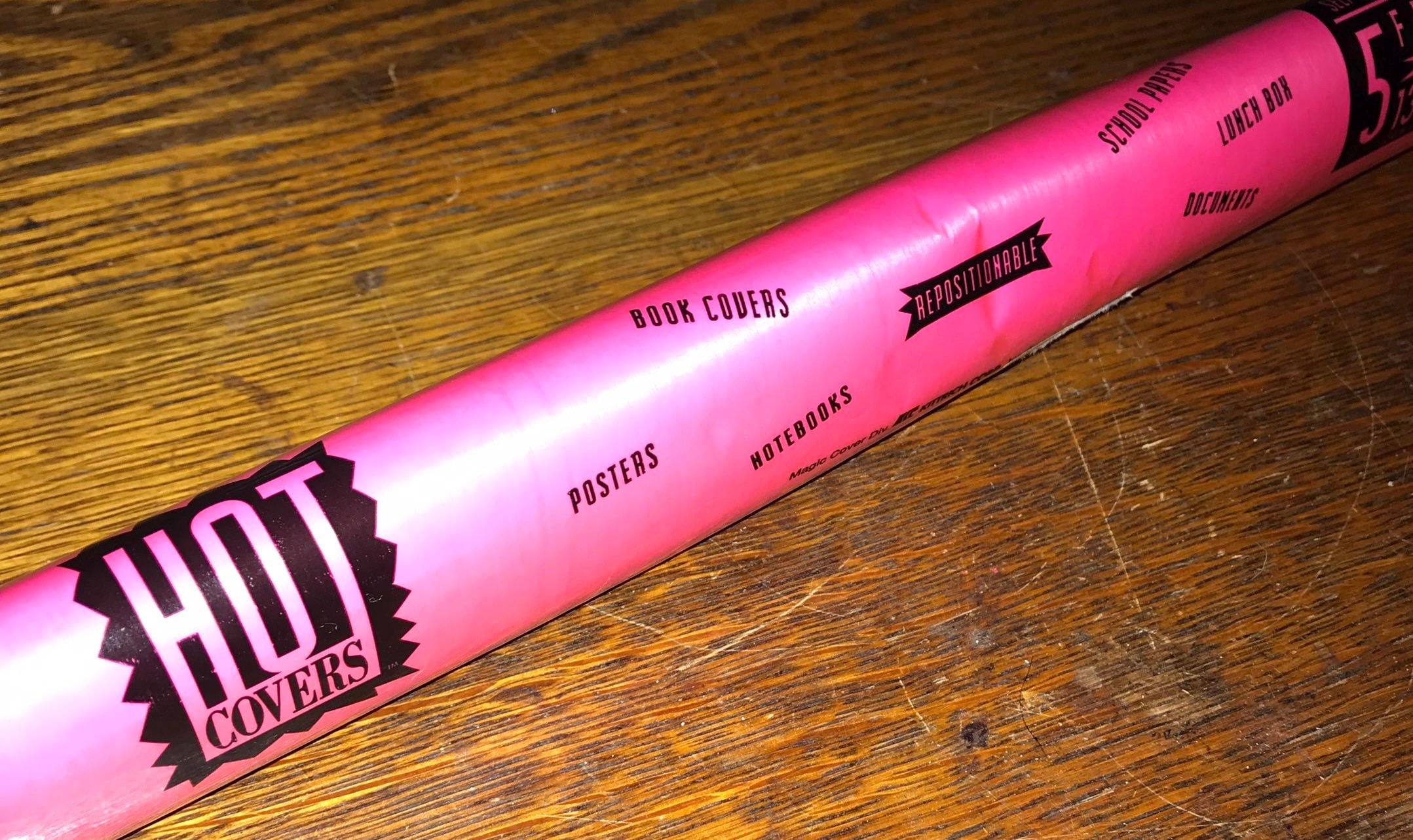 This is cool! It’s a bright pink “Hot Covers” self adhesive vinyl. It’s to be used to cover basically anything you want! The roll is a little bent too but that won’t affect the paper.
