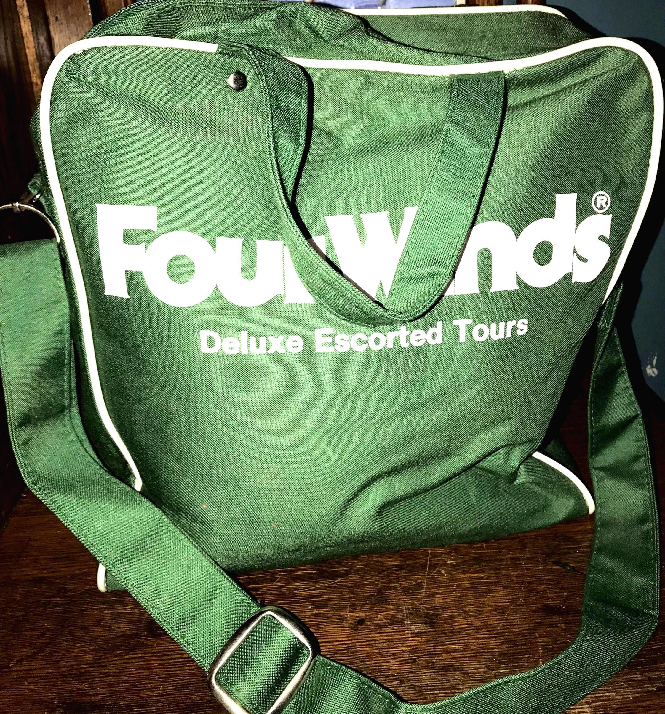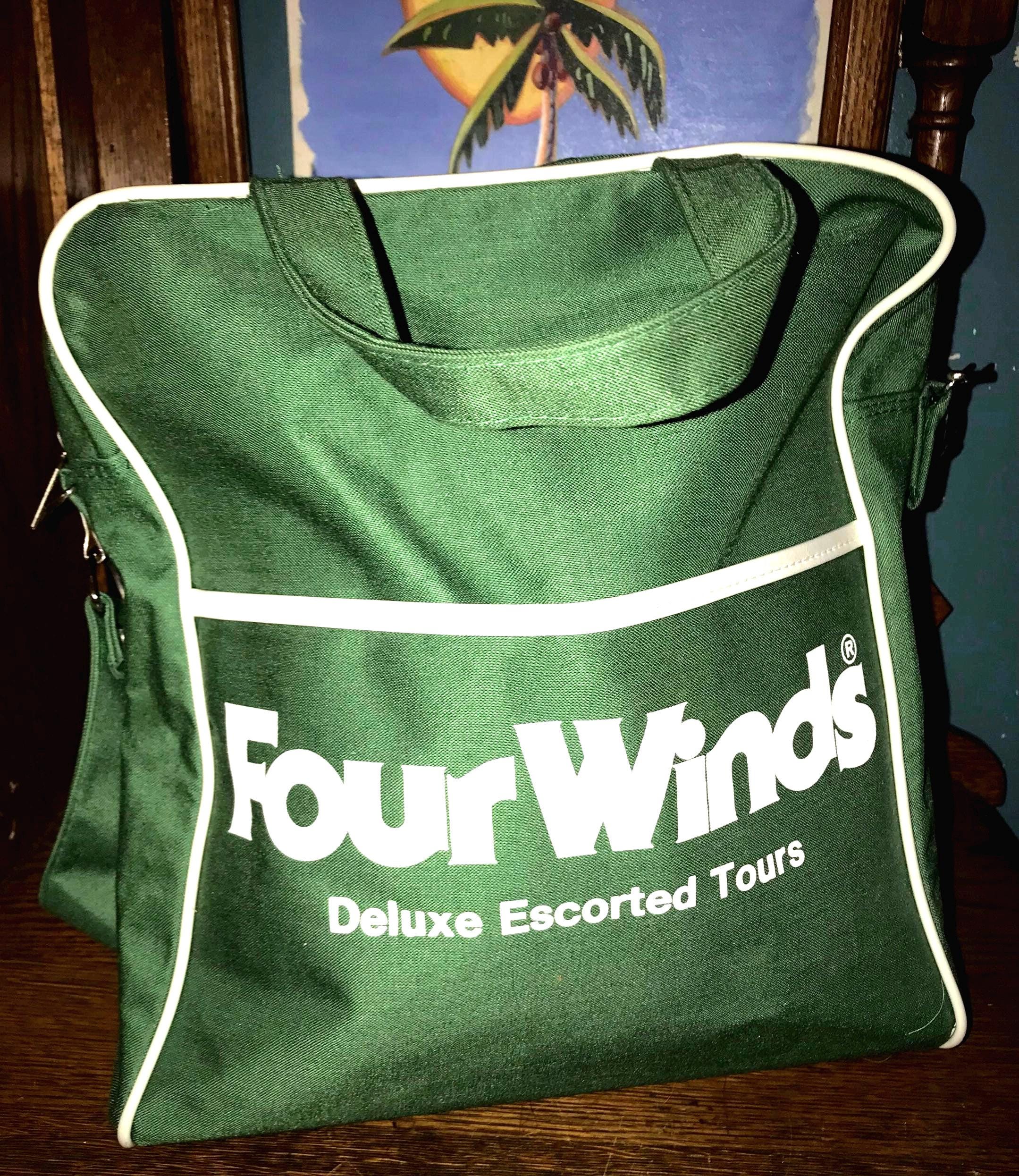This is an awesome 1960’s or 70’s maybe green and white Four Winds Deluxe Escorted Tours carry on bag! it has a white area on the bottom to fill in your name and address (cool that it was never used)! It’s has a front pocket and no pockets. it’s in good vintage condition.