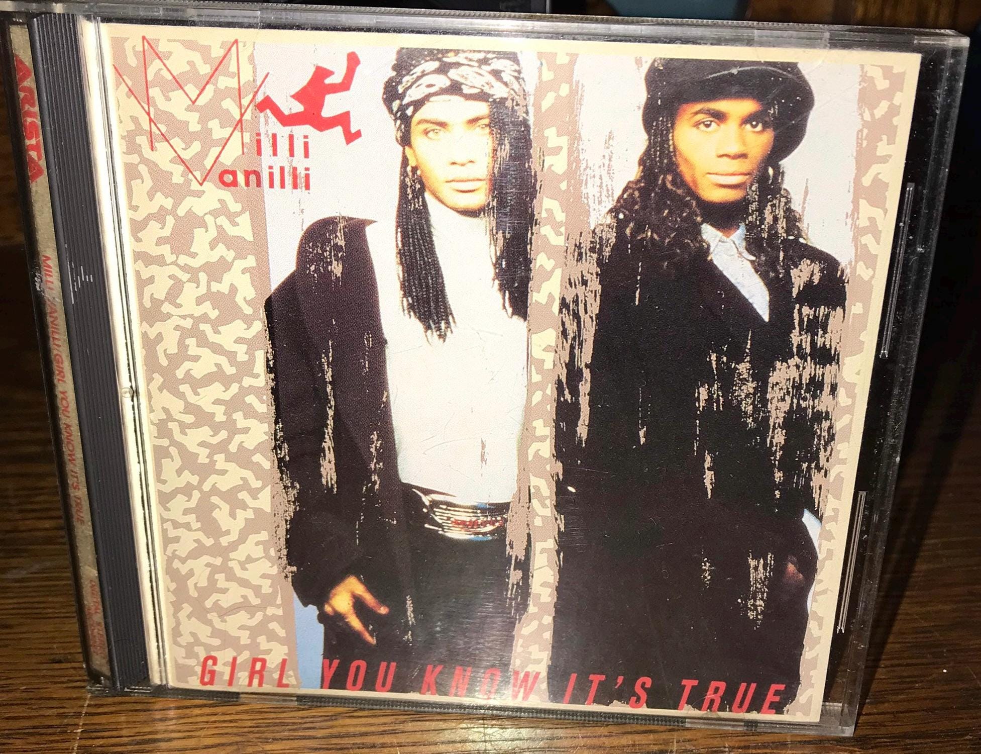 This is a Milli Vanilli CD from their album, Girl You Know It’s True. The disc is in good vintage condition but the case shows some wear and tear.