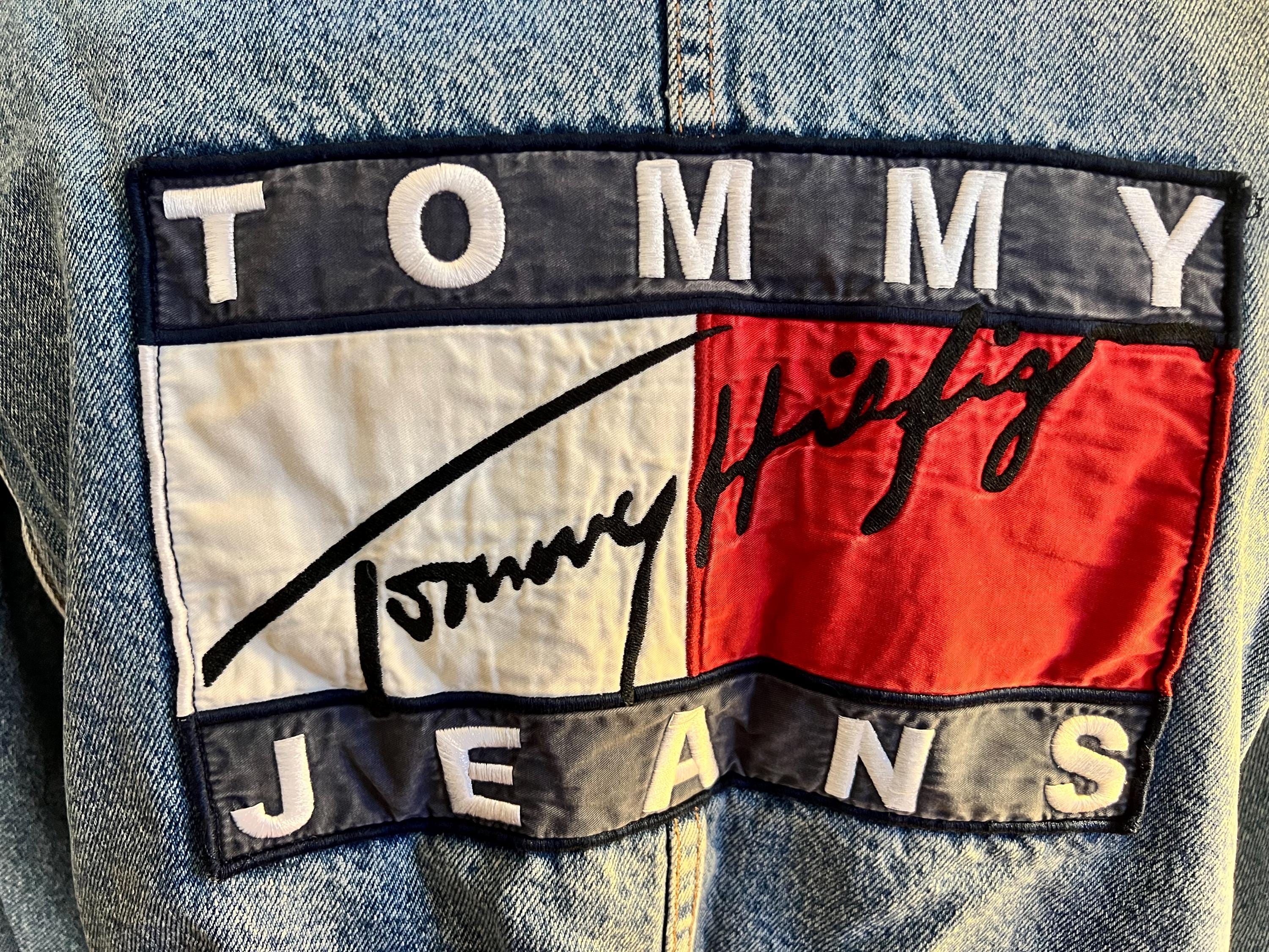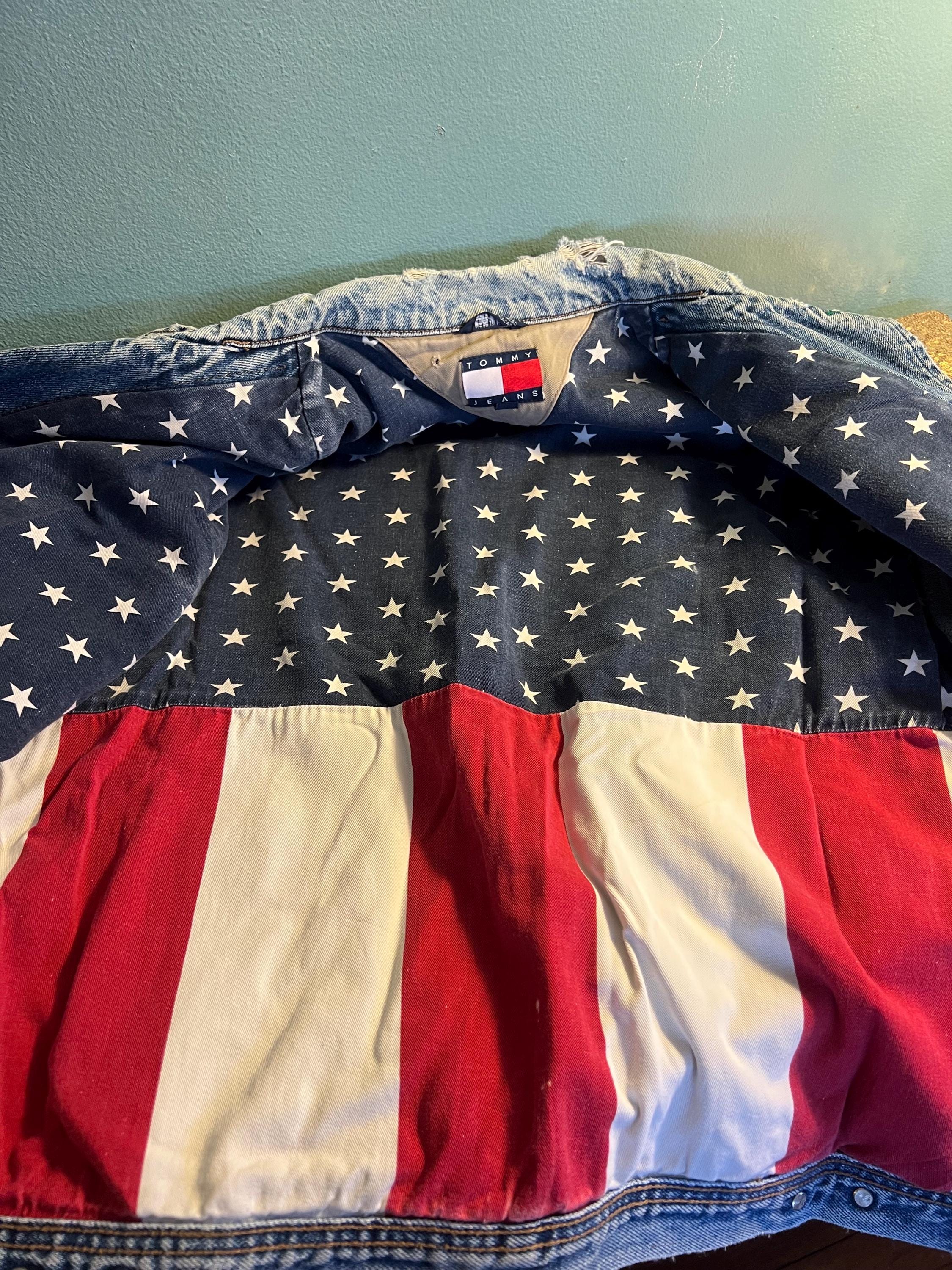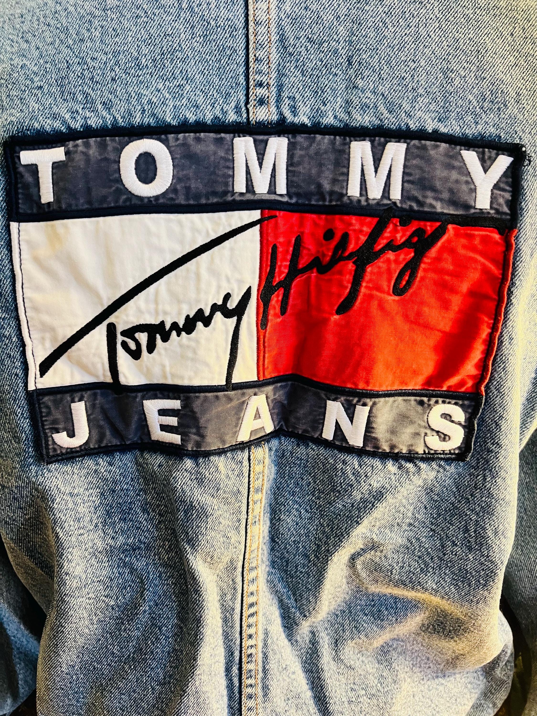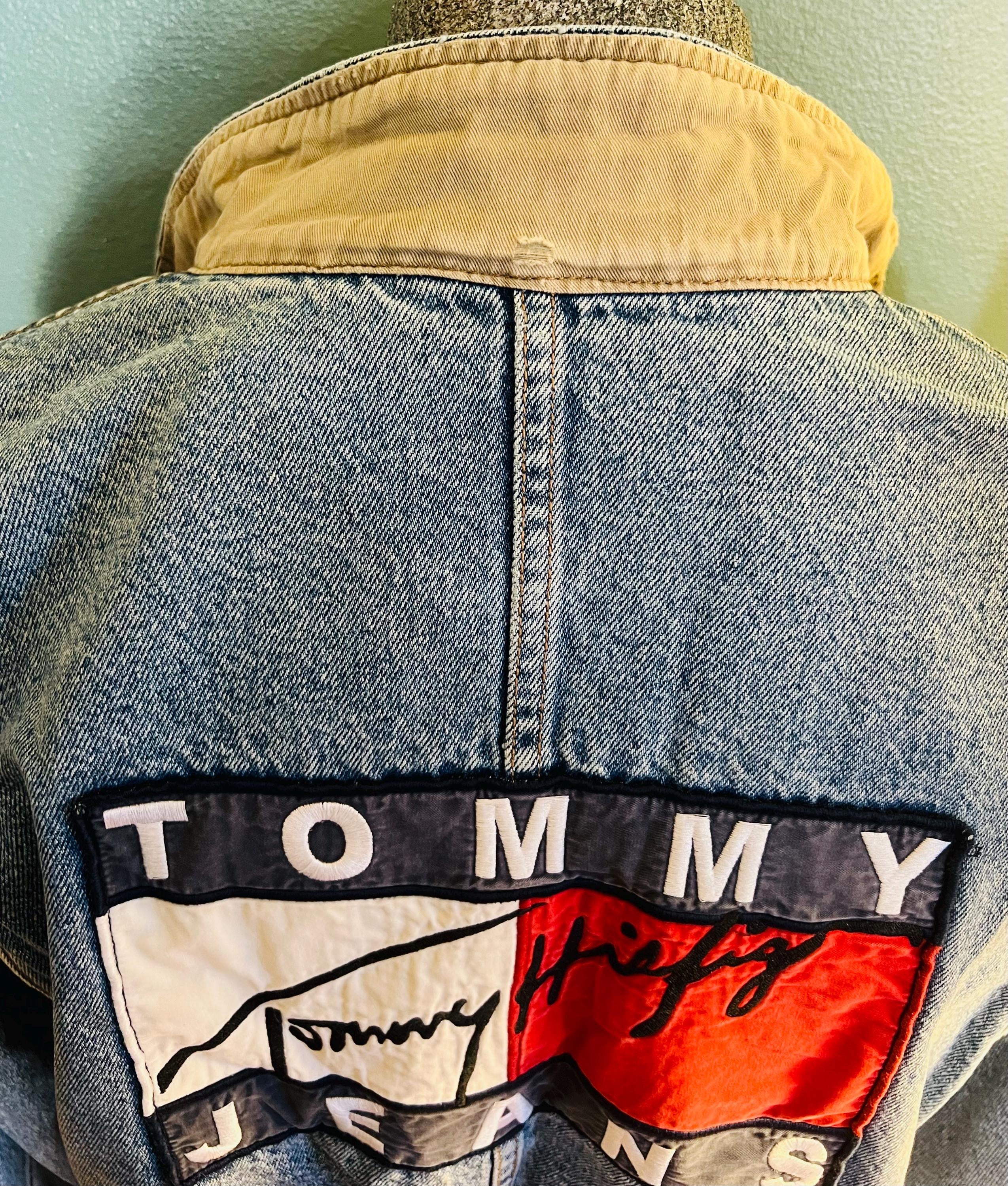 Super awesome 90’s Tommy jean jacket. It has the American flag lining and the big Tommy patch on the back. It has some distressed areas, but it just gives it character in my mind, (see ALL photos). The collar is worn in areas, edging is worn in areas, a little white stain on a part of the red lining, the back patch is perfectly worn in looking. All in all It’s in good vintage condition!