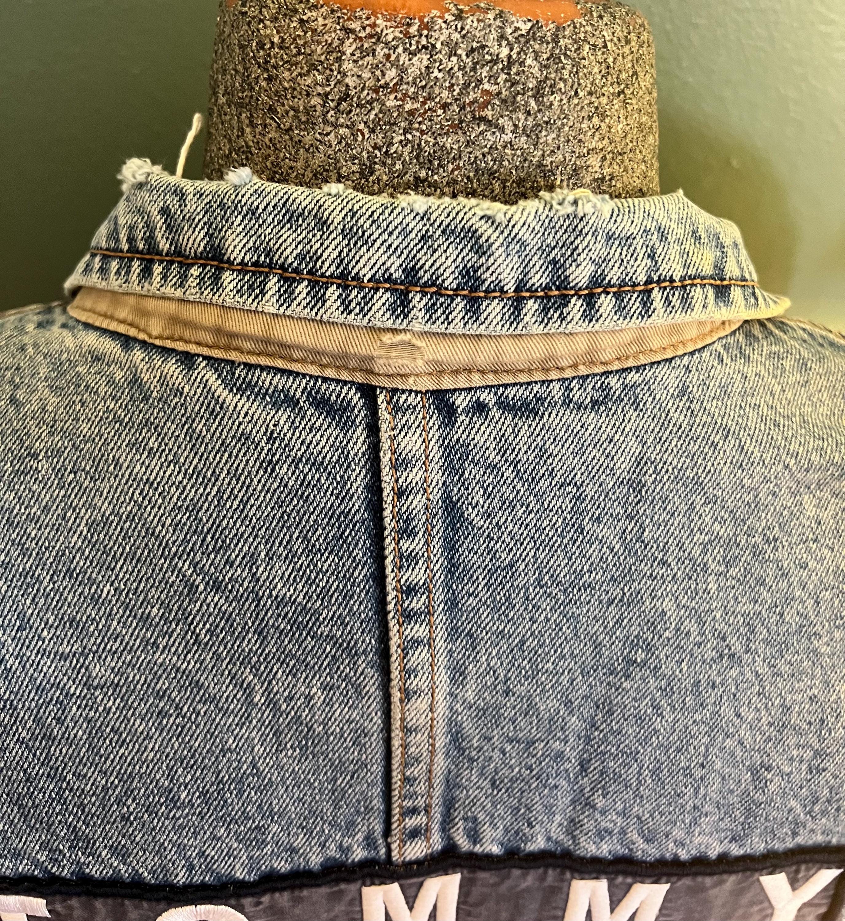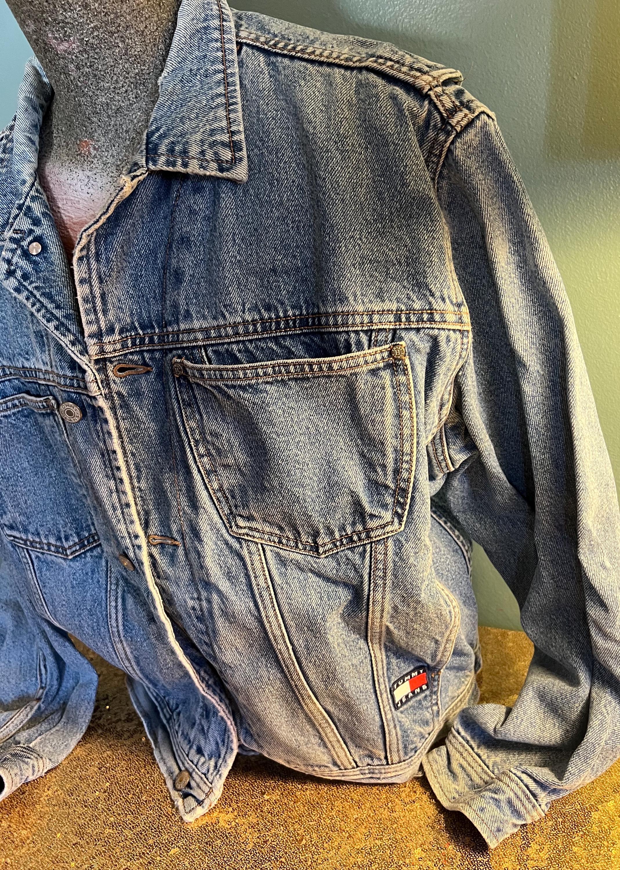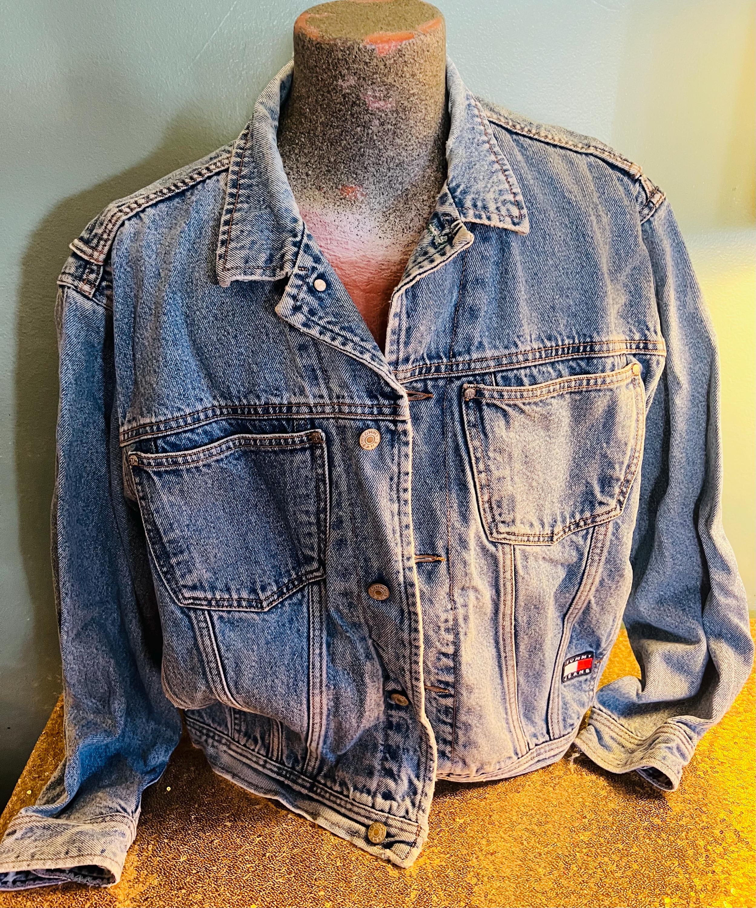 Super awesome 90’s Tommy jean jacket. It has the American flag lining and the big Tommy patch on the back. It has some distressed areas, but it just gives it character in my mind, (see ALL photos). The collar is worn in areas, edging is worn in areas, a little white stain on a part of the red lining, the back patch is perfectly worn in looking. All in all It’s in good vintage condition!