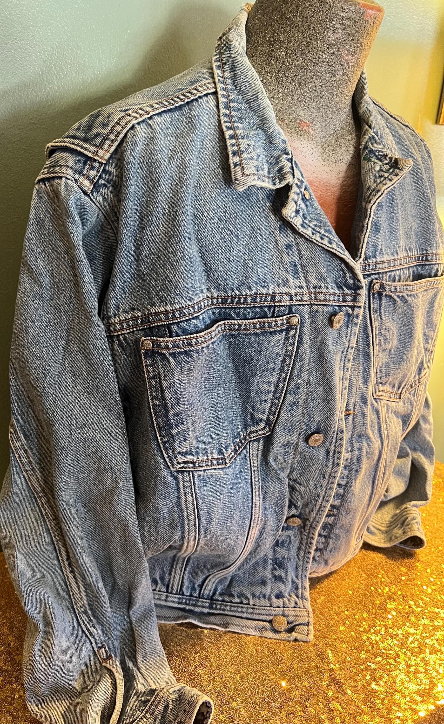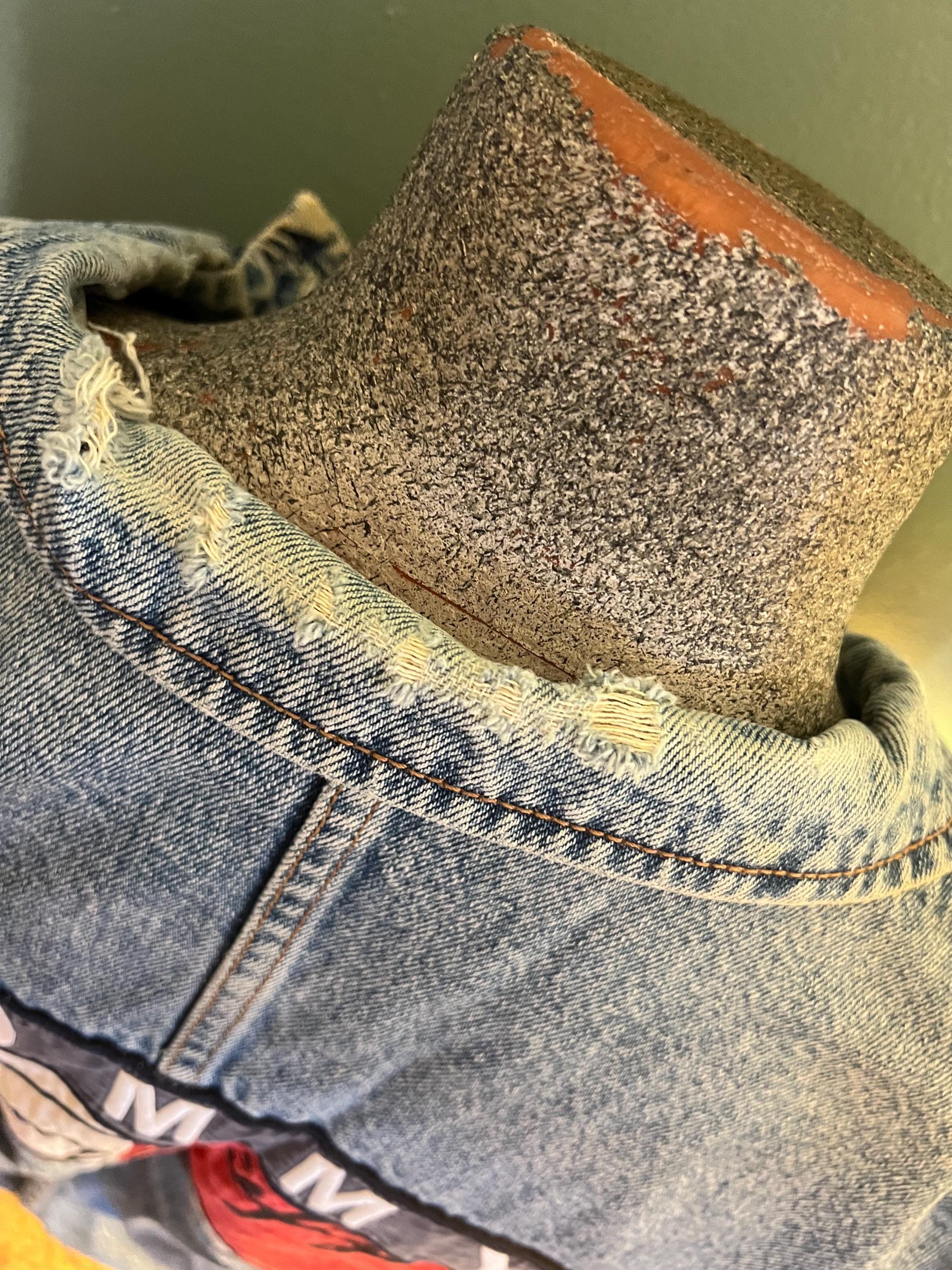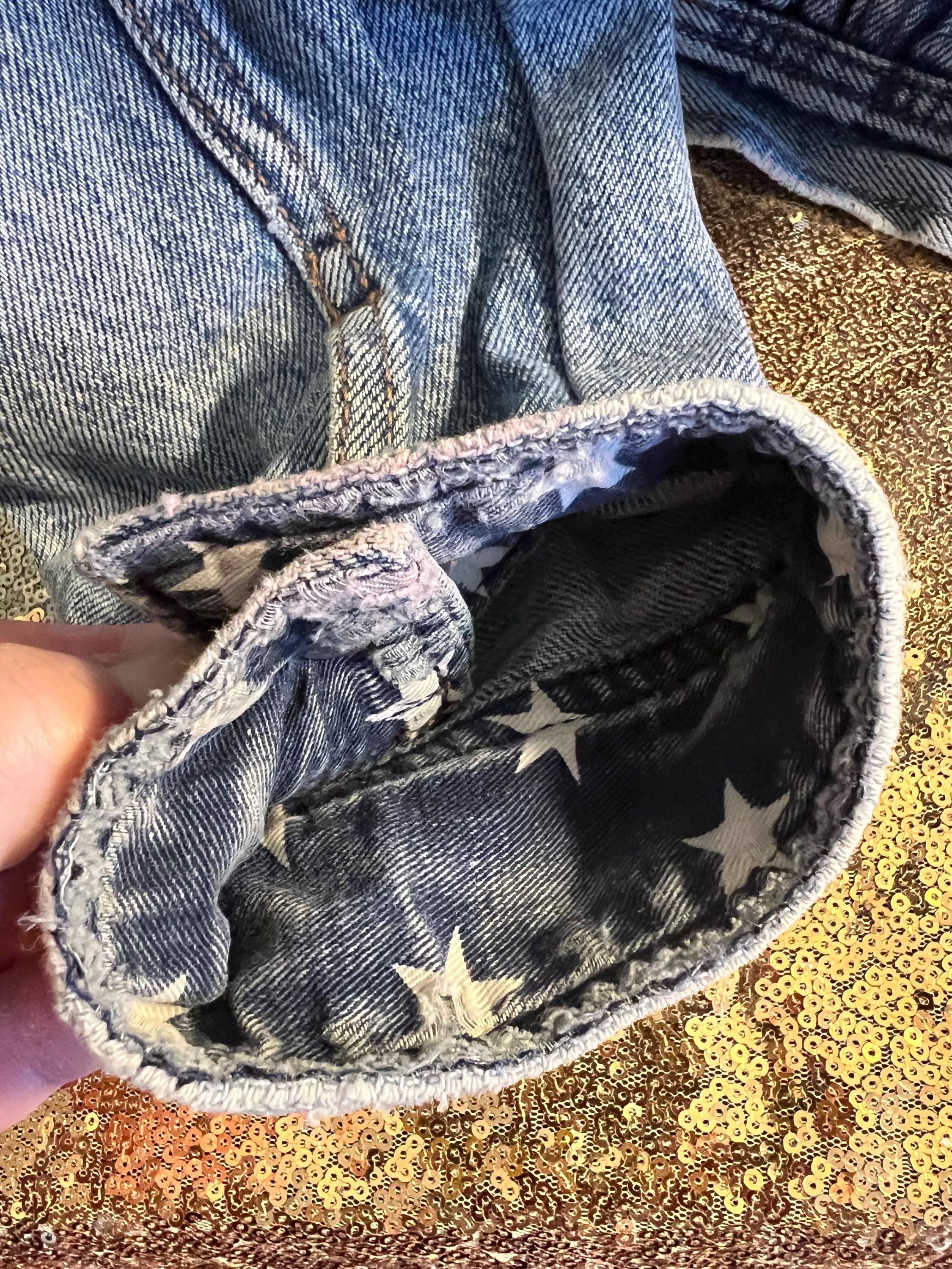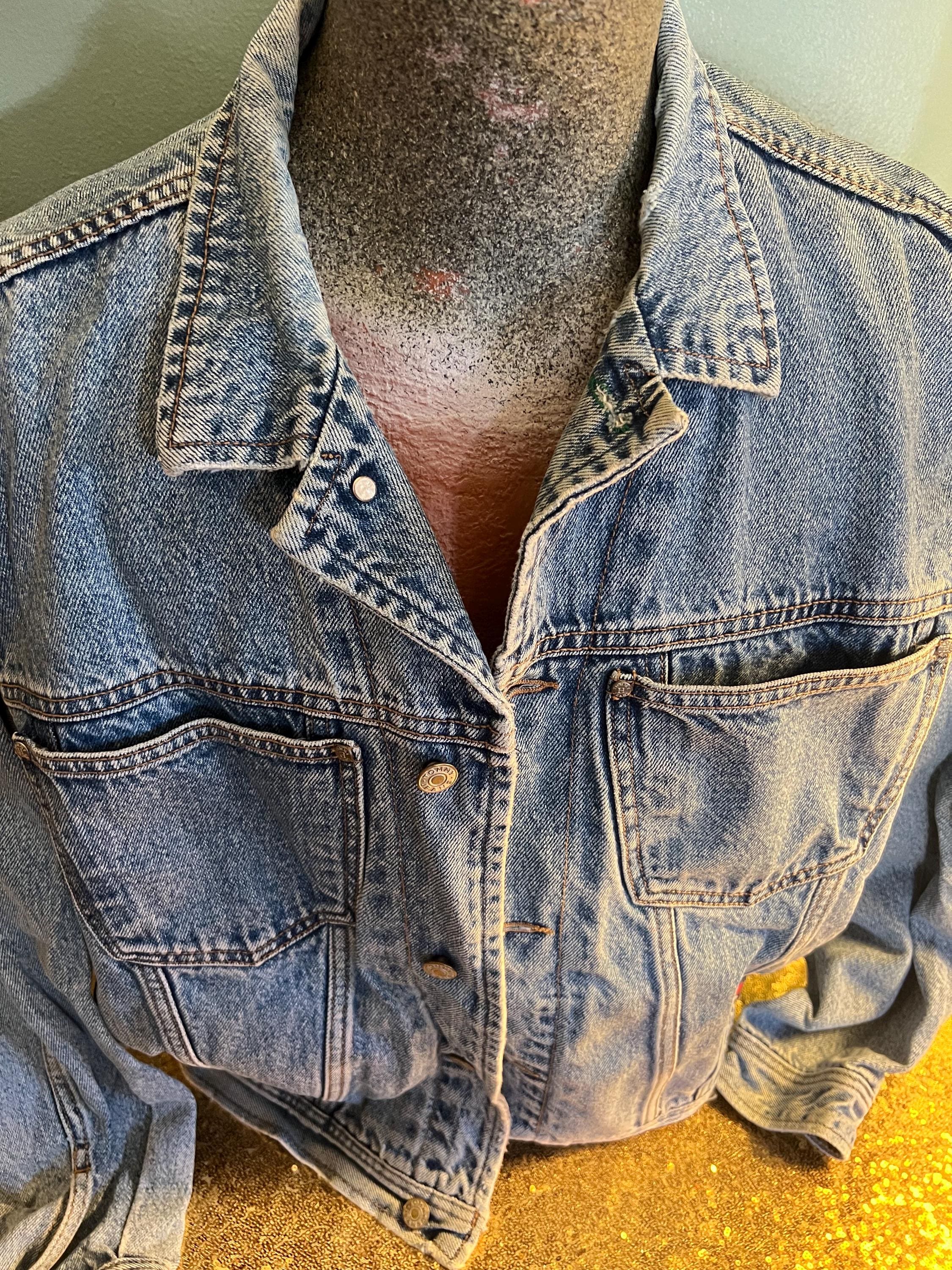 Super awesome 90’s Tommy jean jacket. It has the American flag lining and the big Tommy patch on the back. It has some distressed areas, but it just gives it character in my mind, (see ALL photos). The collar is worn in areas, edging is worn in areas, a little white stain on a part of the red lining, the back patch is perfectly worn in looking. All in all It’s in good vintage condition!