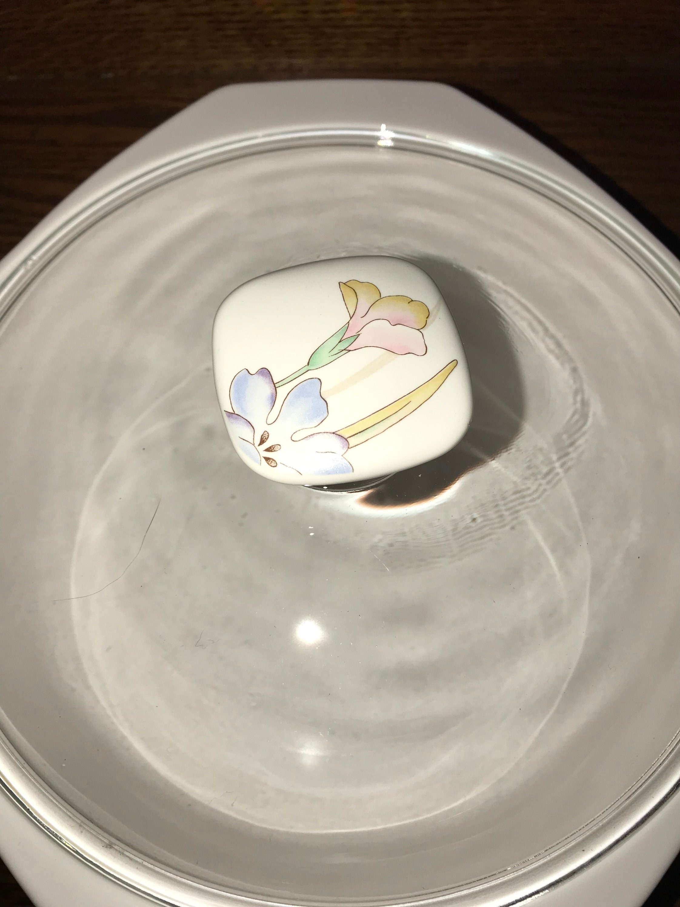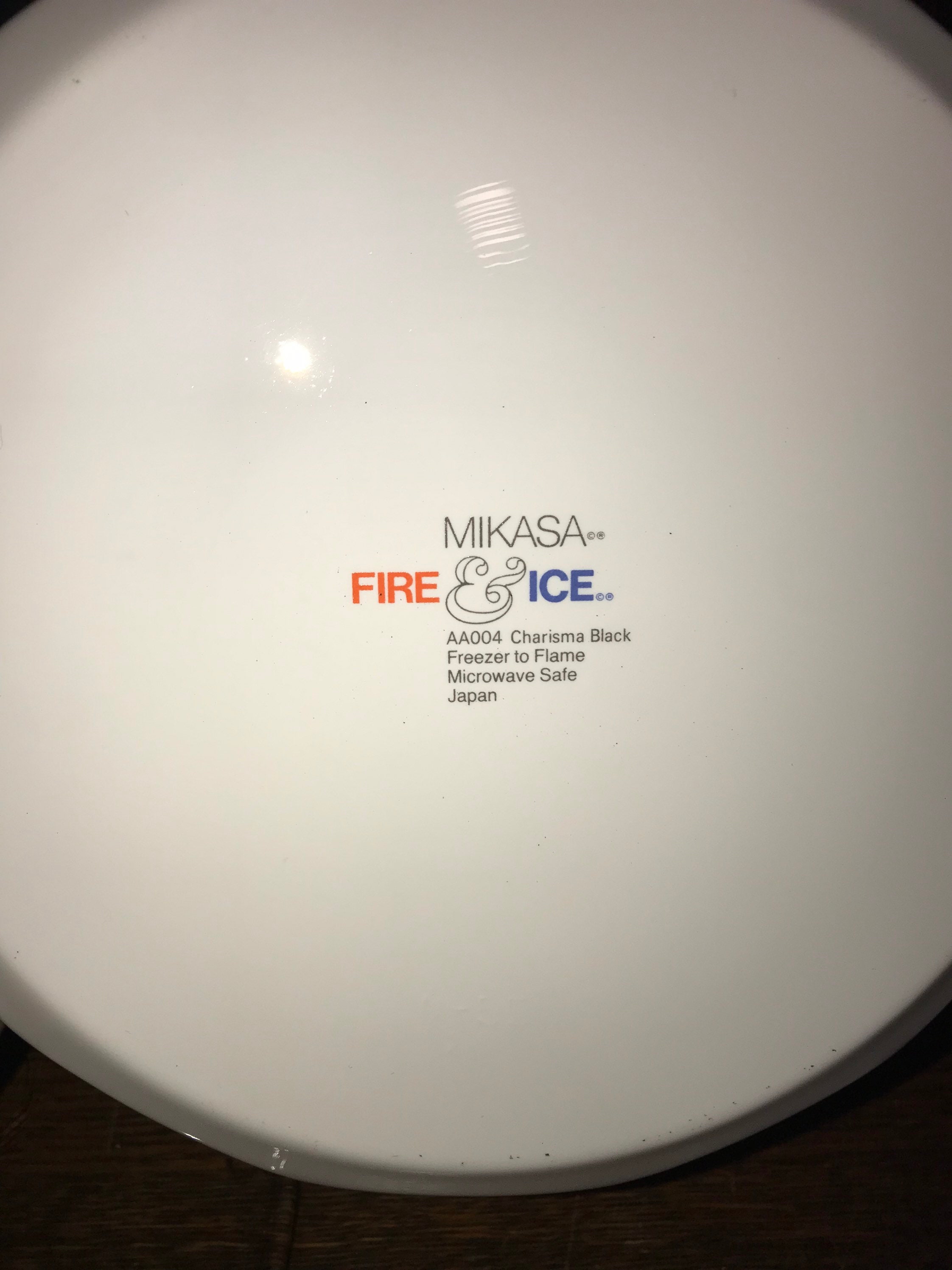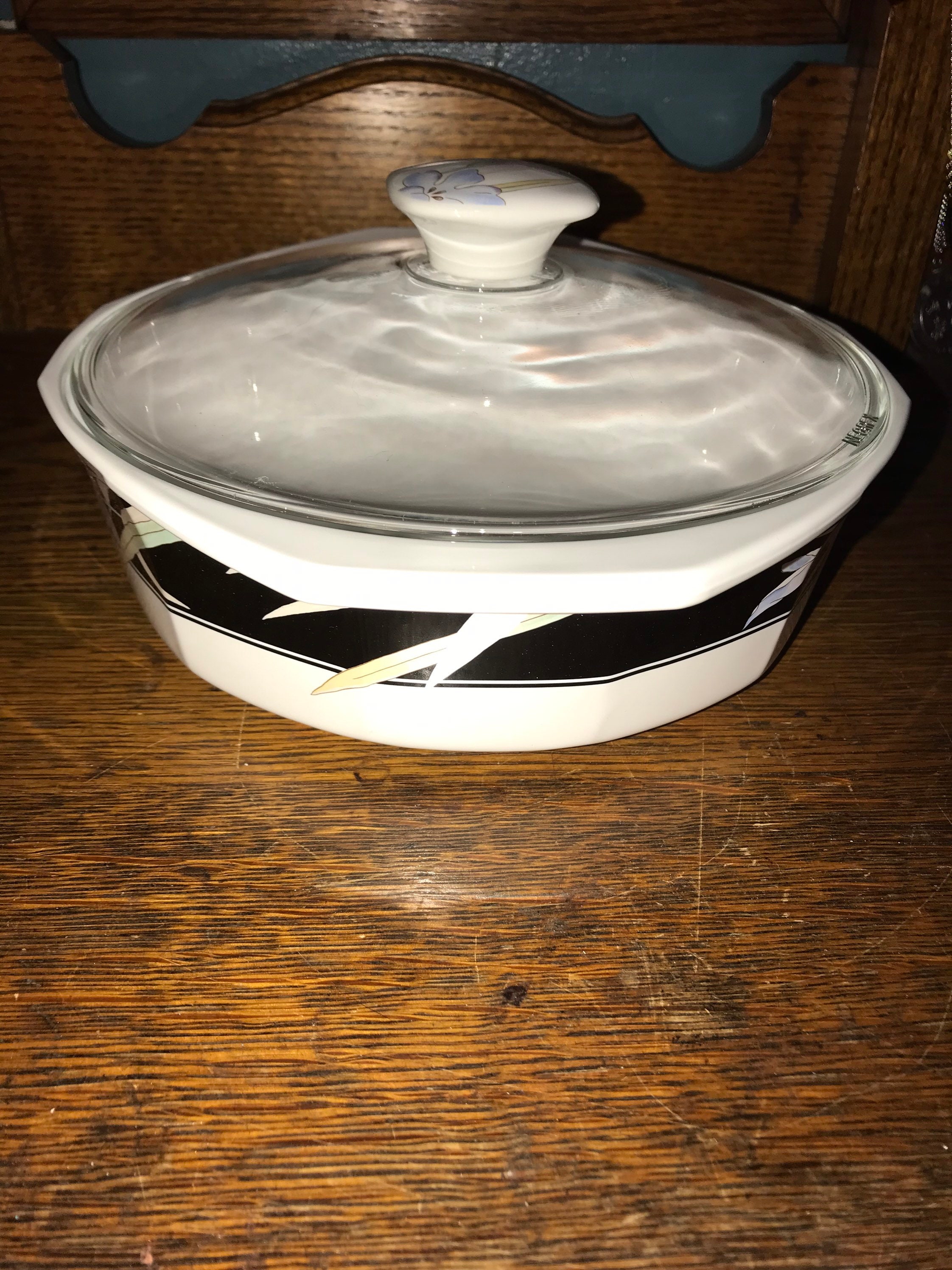 This is a real nice Mikasa two quart casserole dish with lid. This one is brand new, still in the original box. It’s from the Mikasa “Fire & Ice” collection, which means it can go straight from the freezer and into the flame/oven. It’s oven proof and microwave proof. The black floral pattern is called “Charisma Black”. It’s in great vintage condition.
