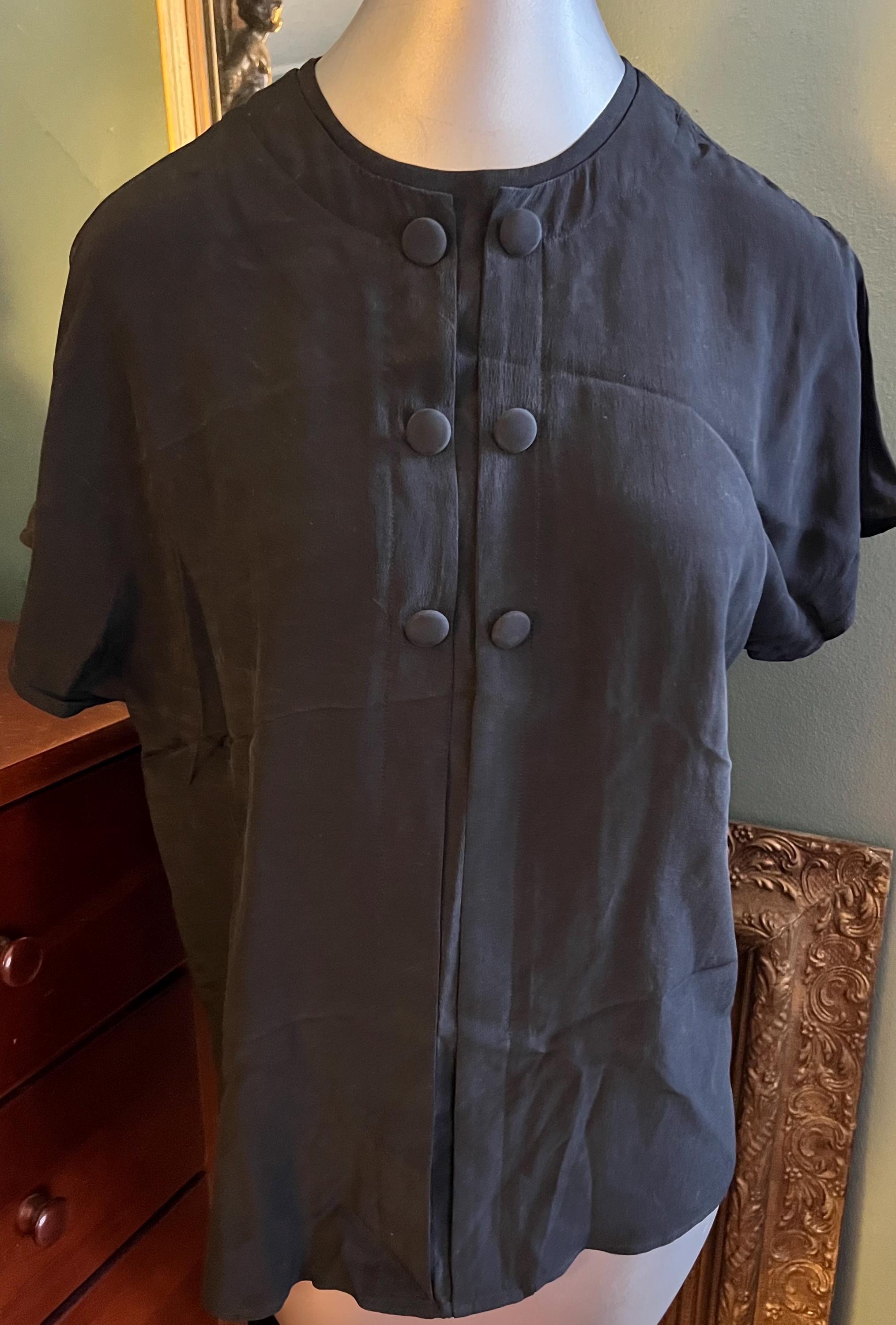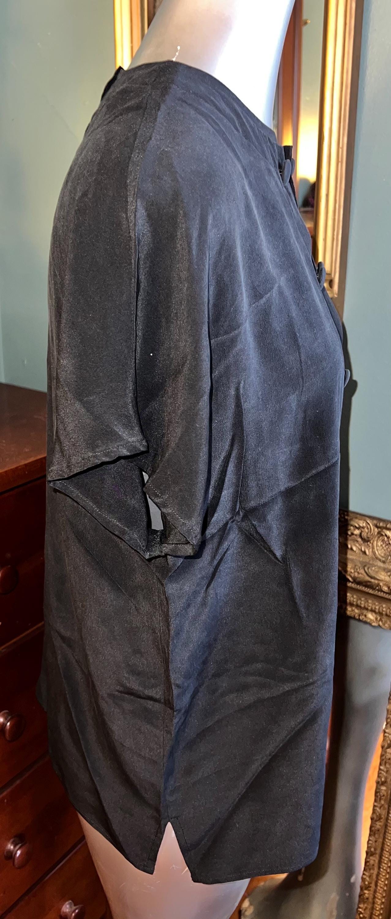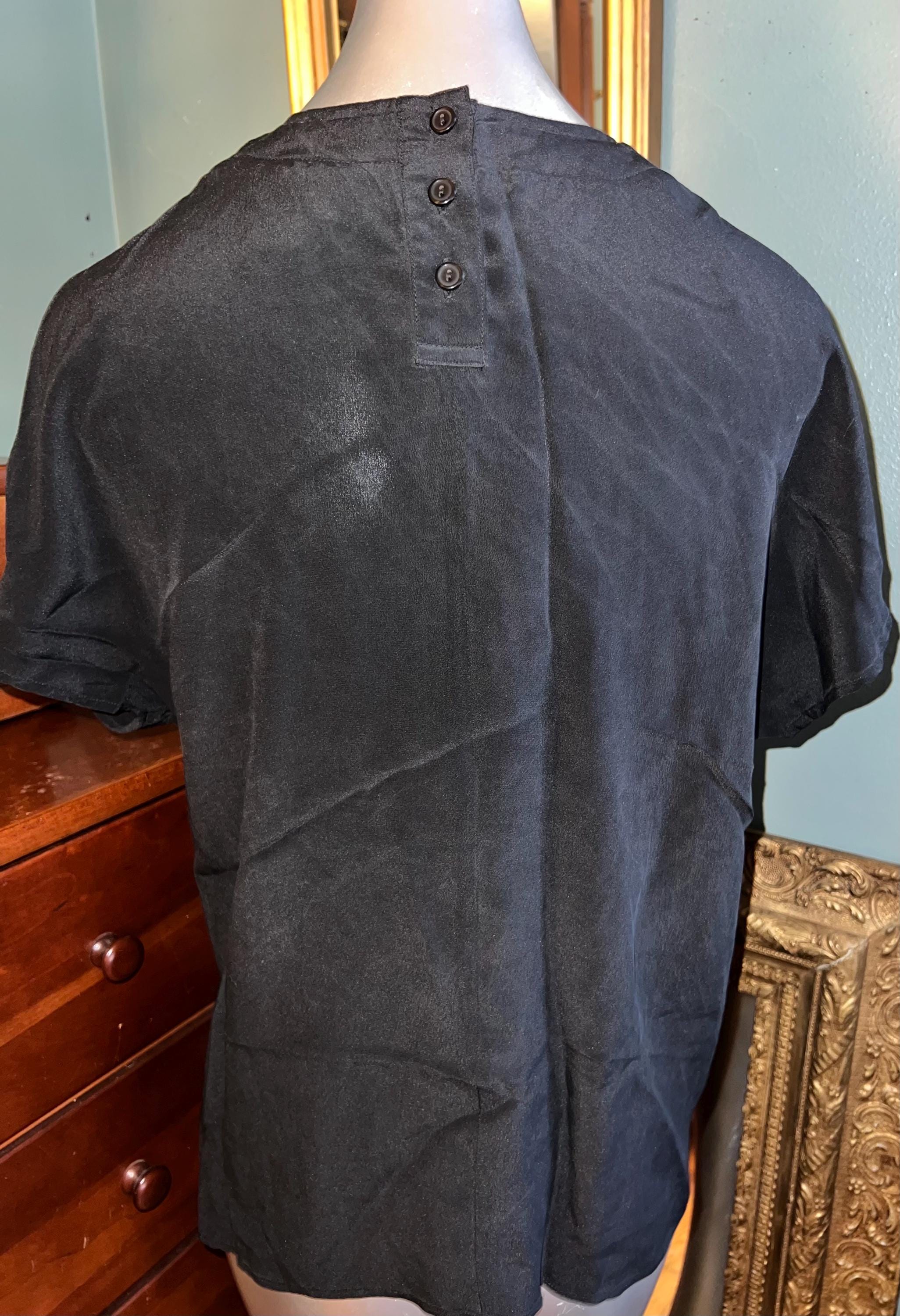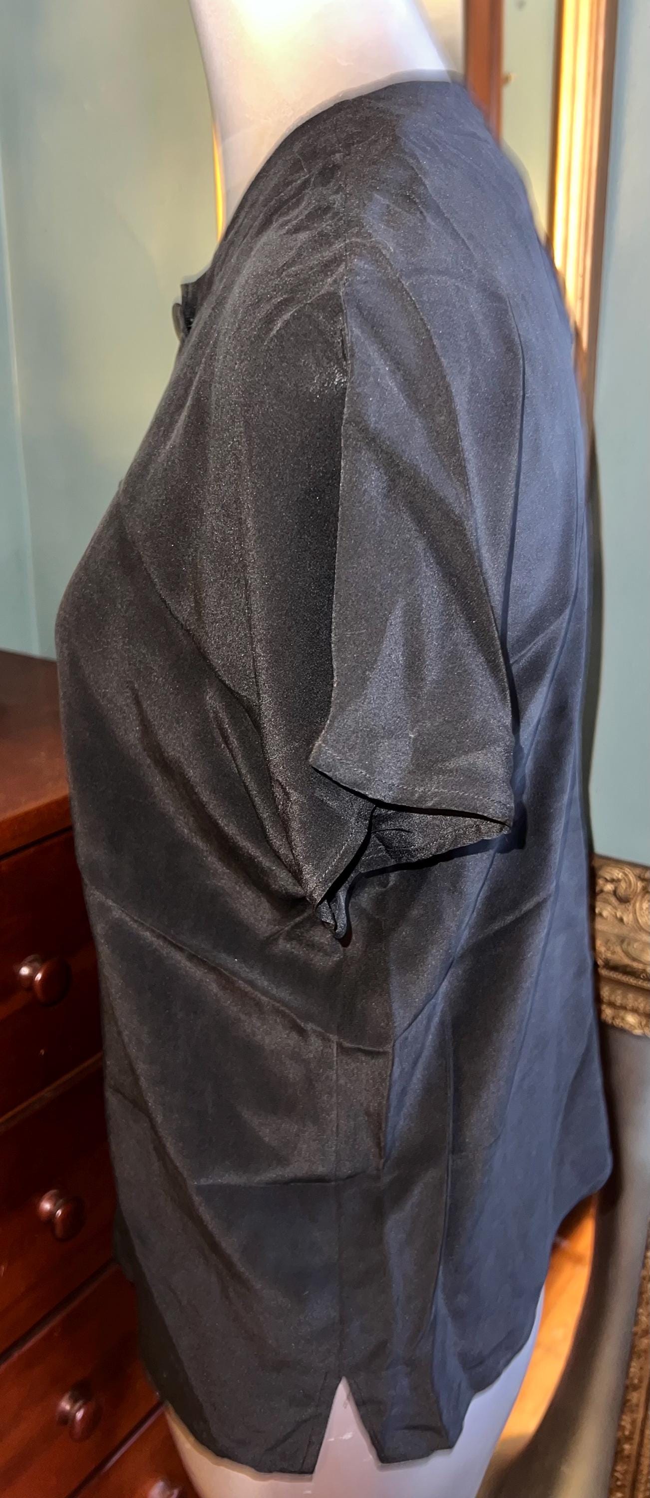 I love this beautiful simple black silk shirt! It’s a late 80’s early 90’s 100% silk shirt. It’s in good vintage condition.