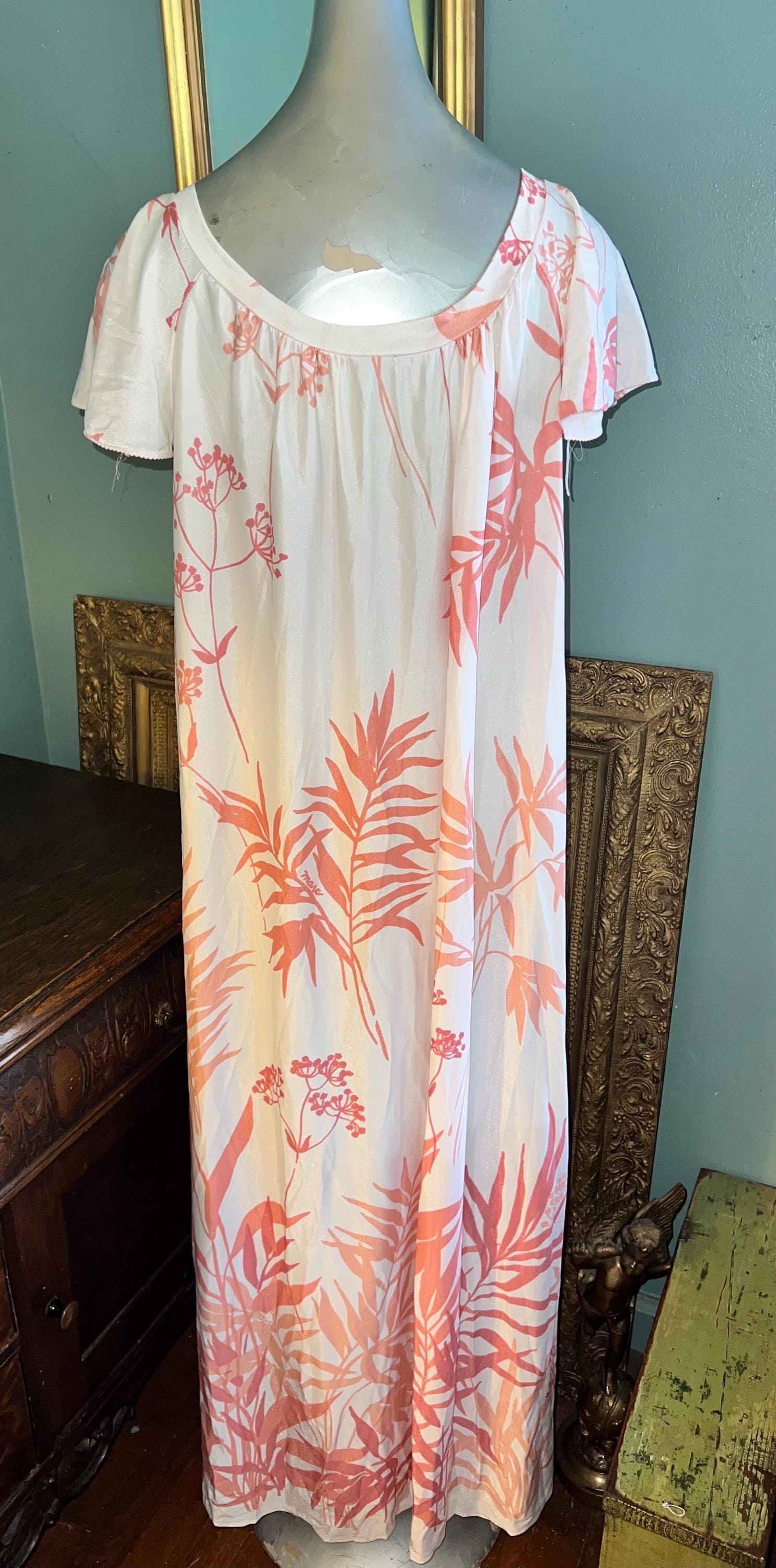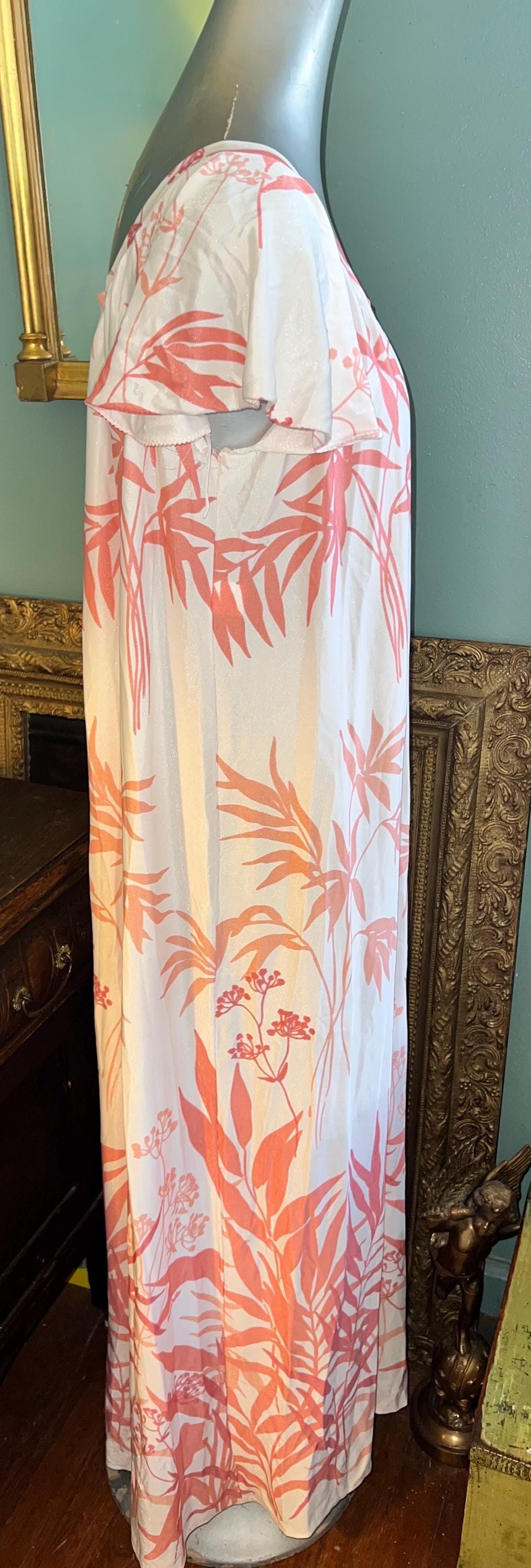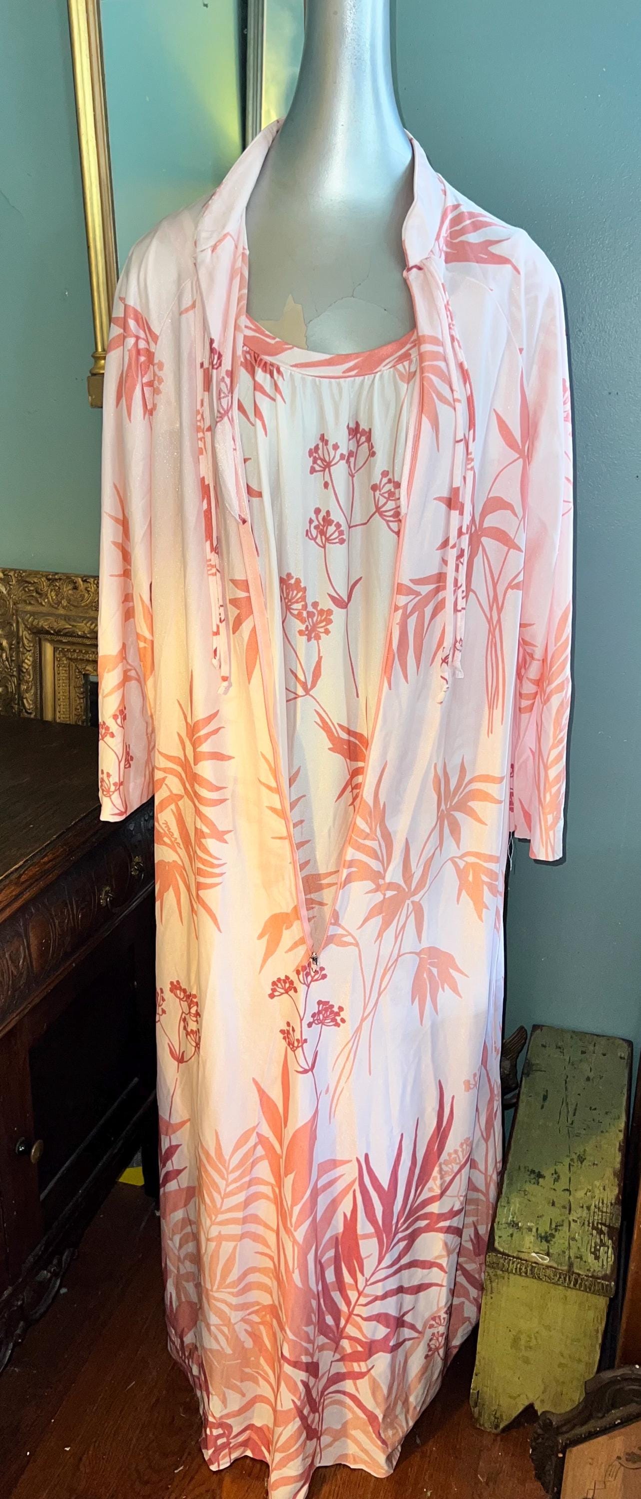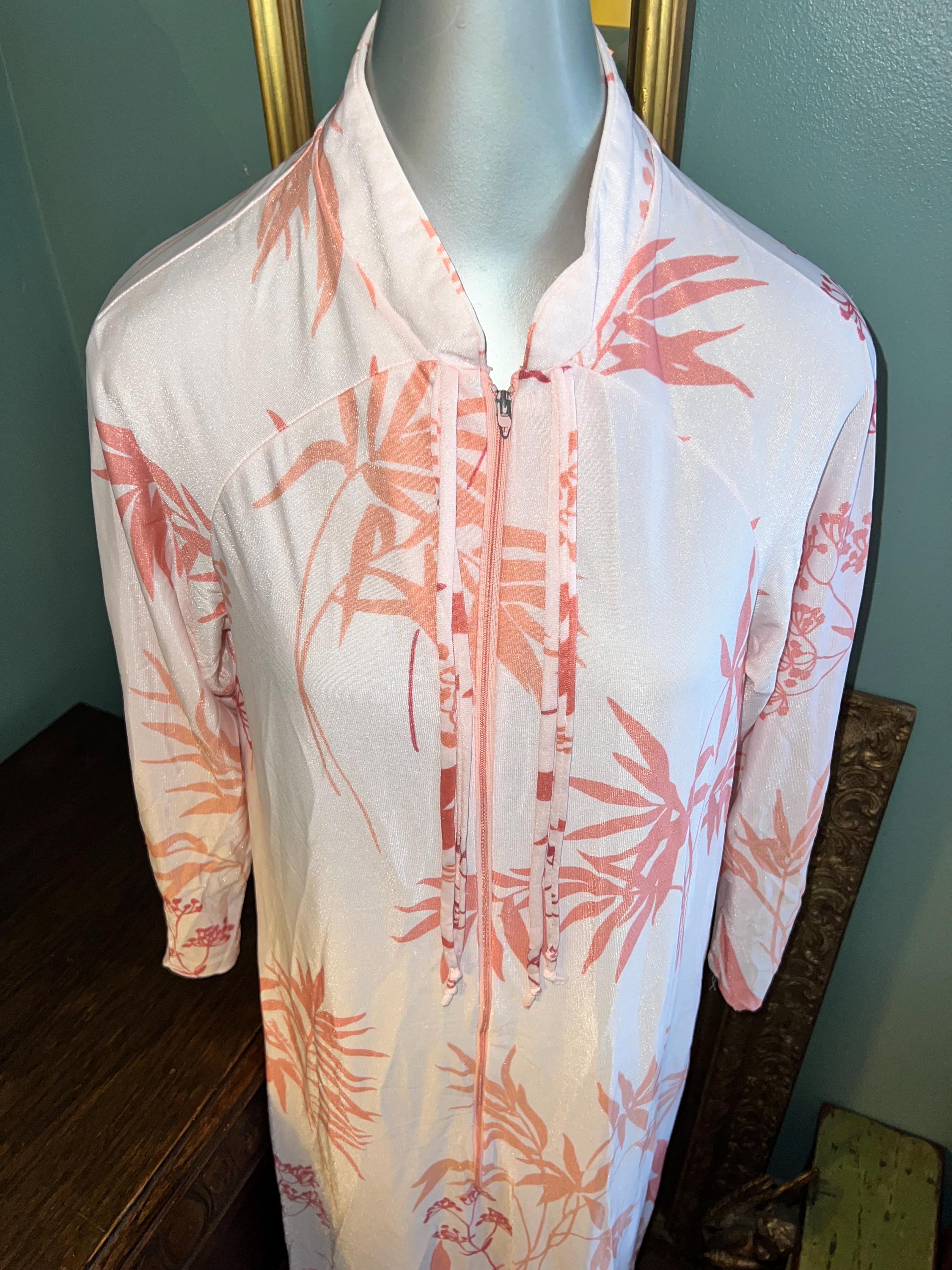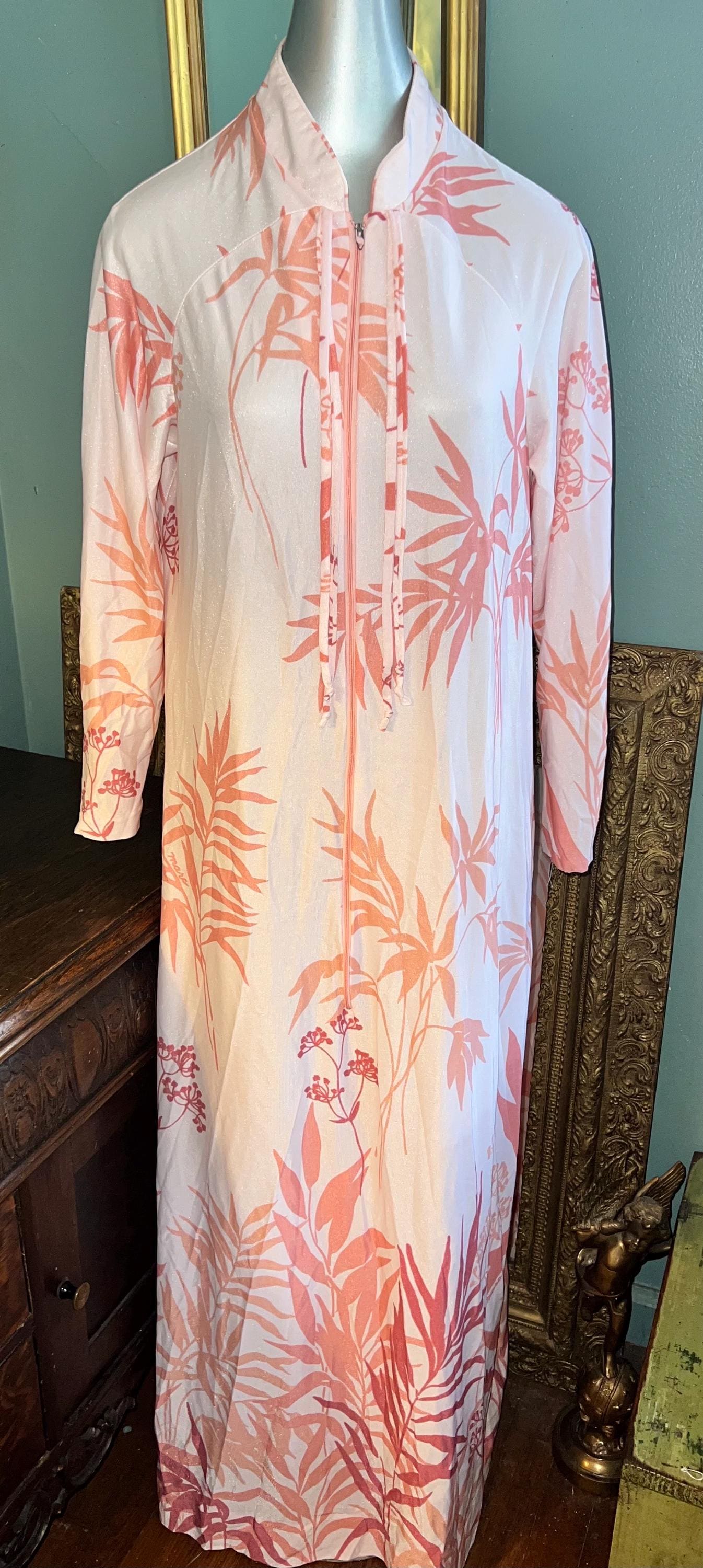 This is a really pretty 1970’s nylon peignoir set, made by Miss Elaine. It’s a long peach color with leaves and small flowers nightgown with matching robe/dressing gown, it doesn’t unzip all the way down. It is a really cool set and in good vintage condition.