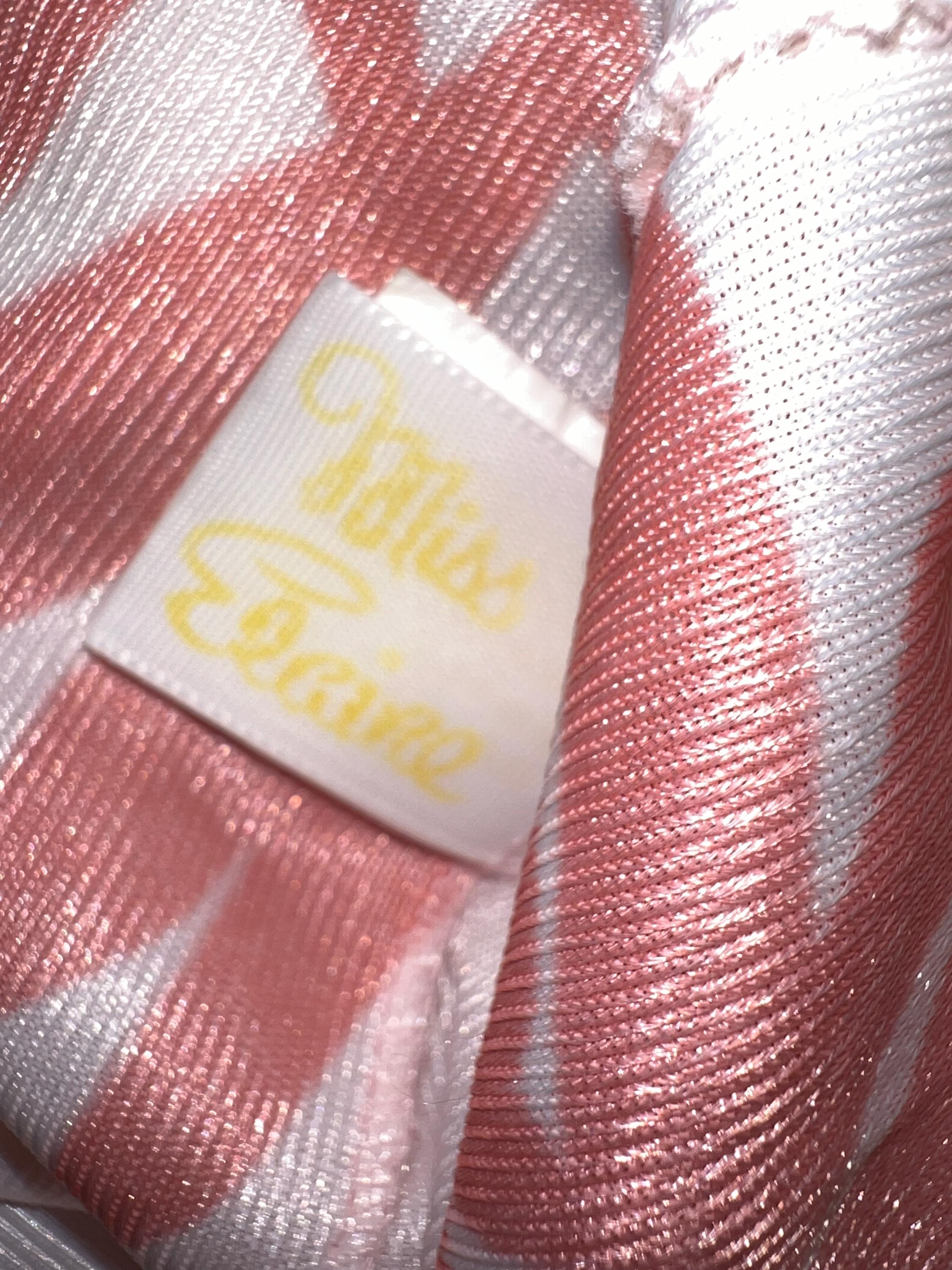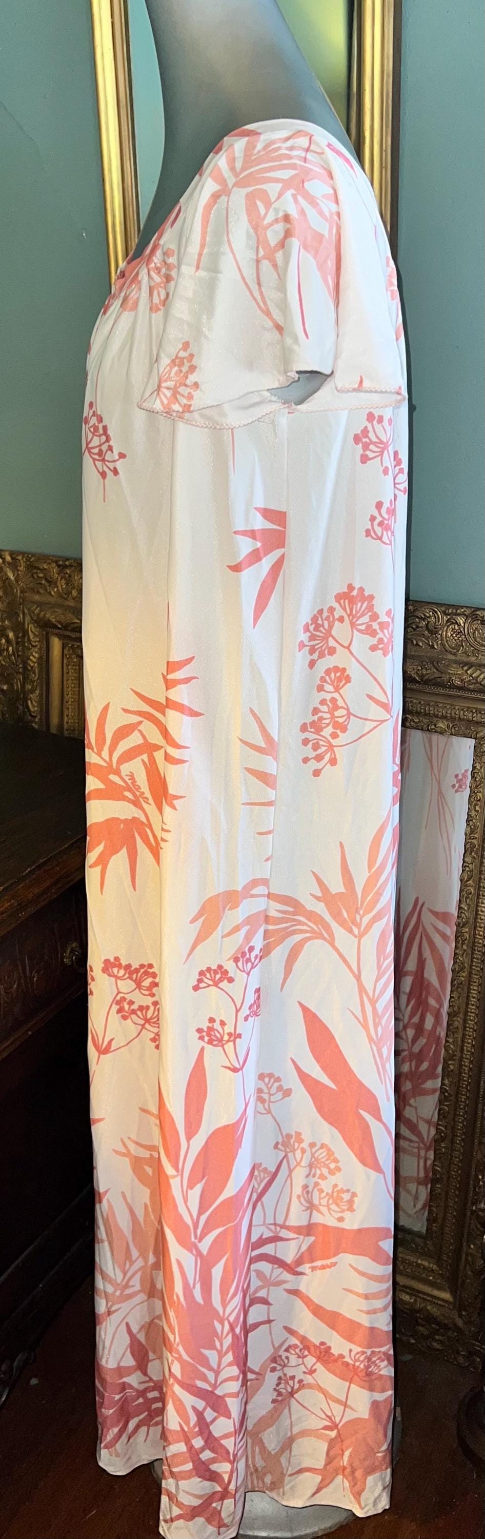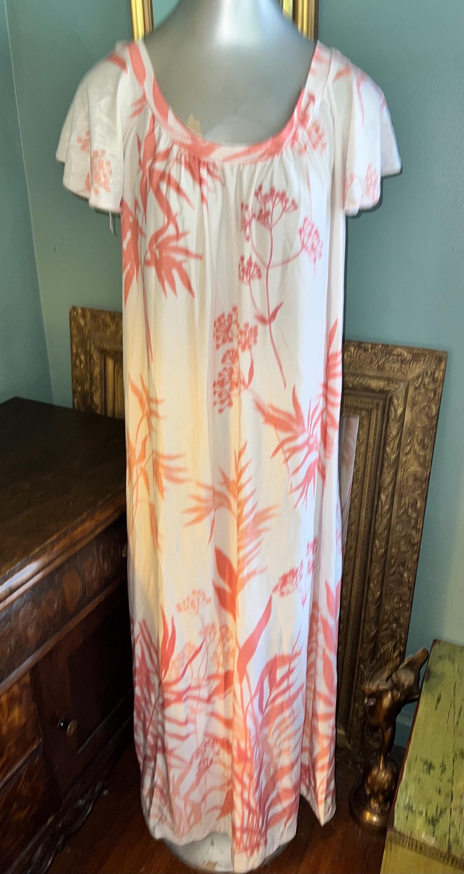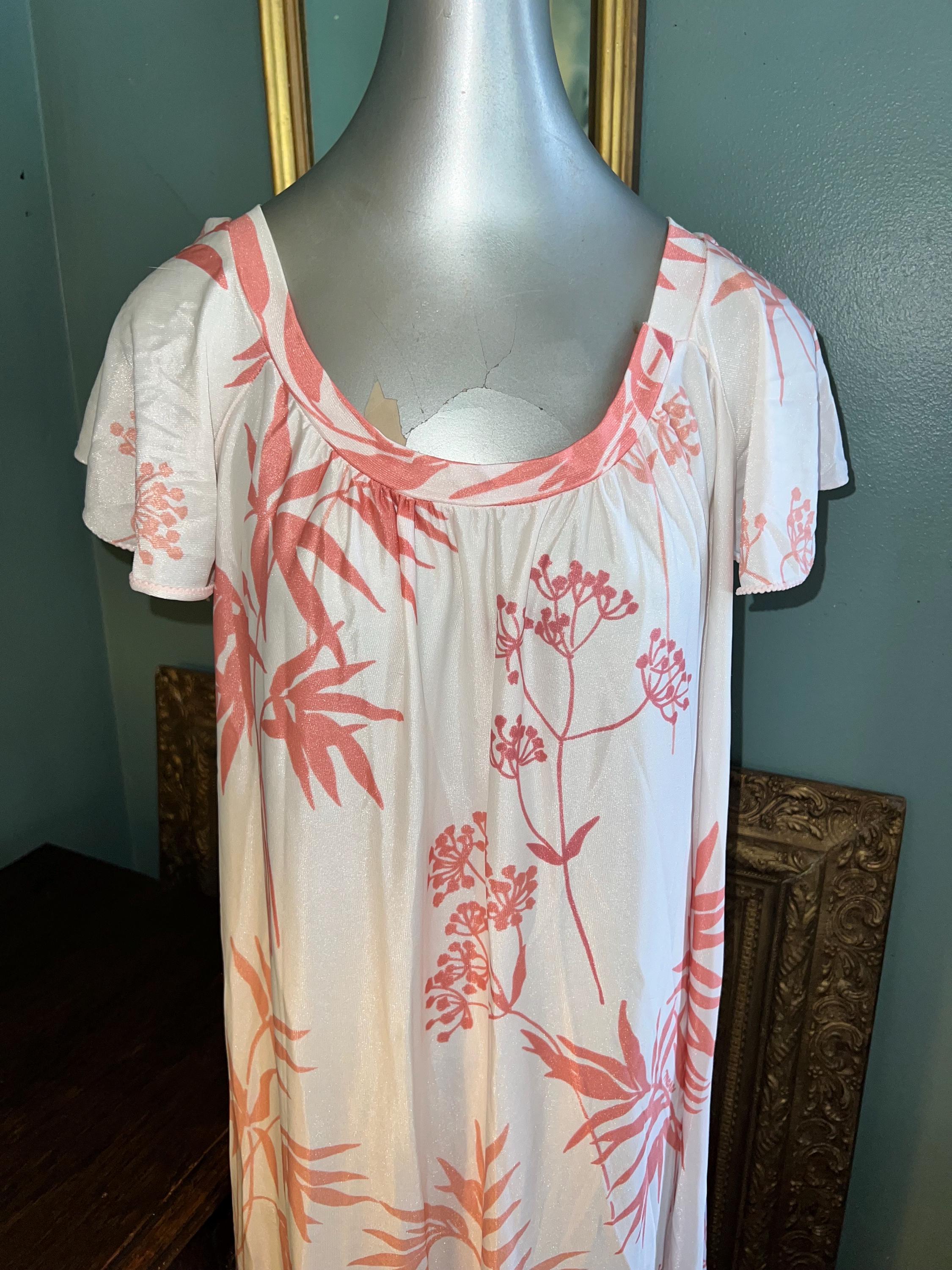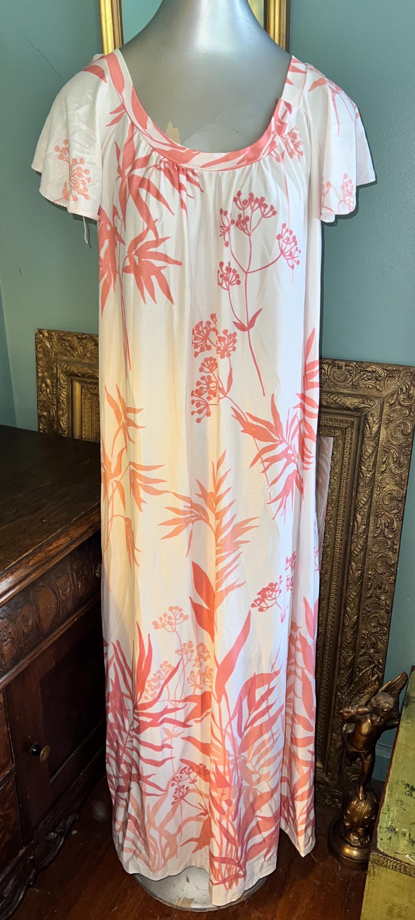 This is a really pretty 1970’s nylon peignoir set, made by Miss Elaine. It’s a long peach color with leaves and small flowers nightgown with matching robe/dressing gown, it doesn’t unzip all the way down. It is a really cool set and in good vintage condition.