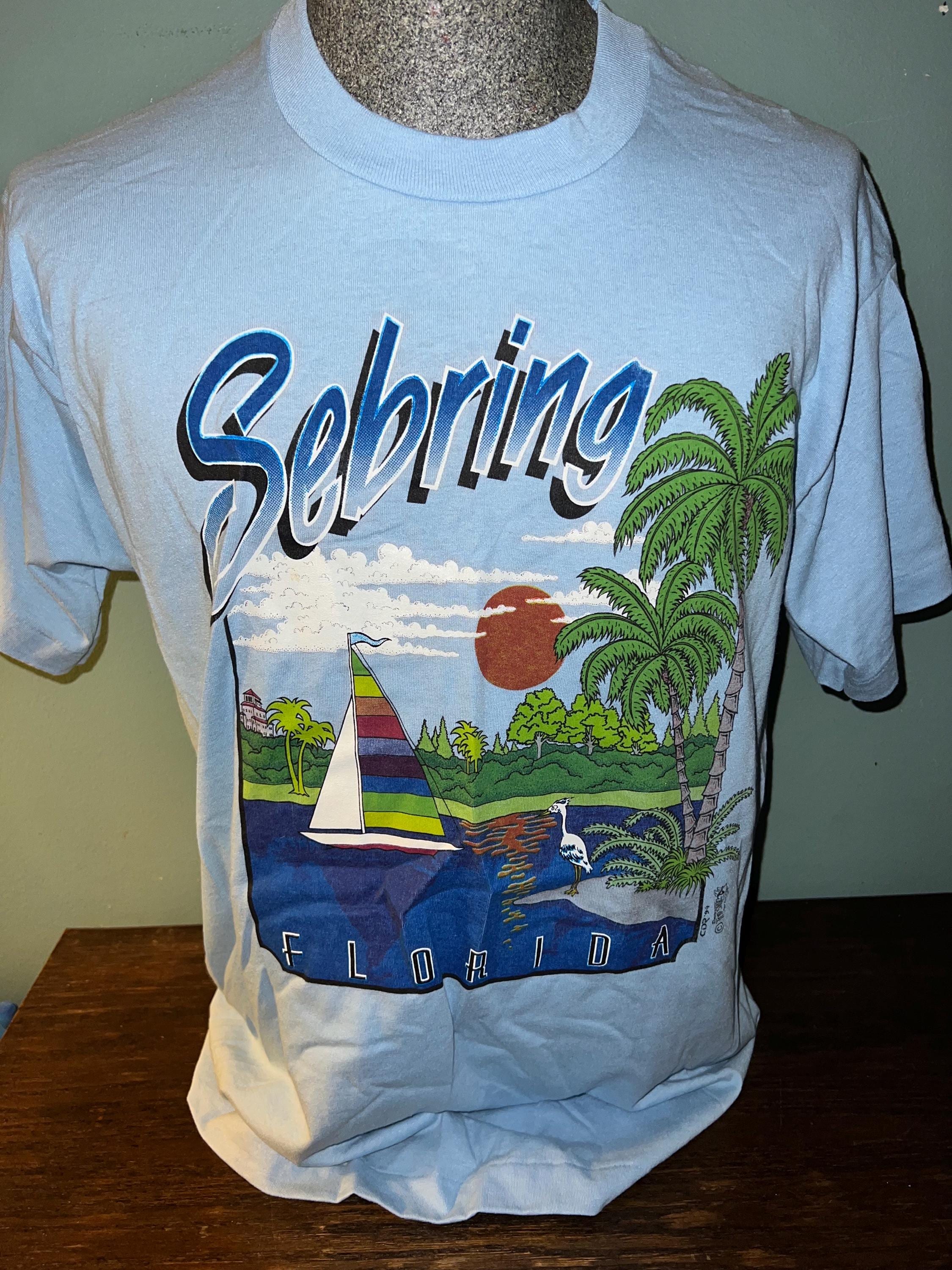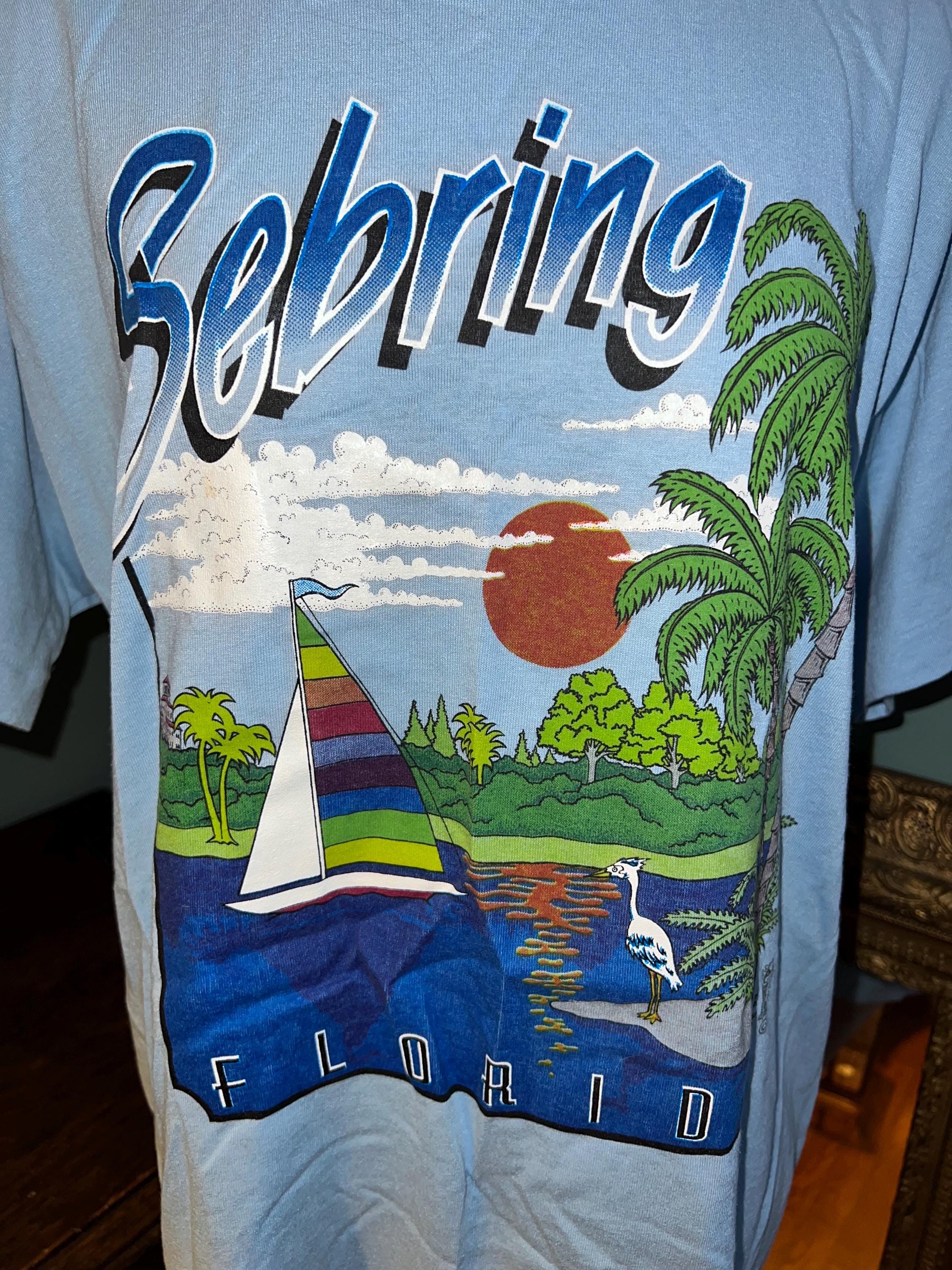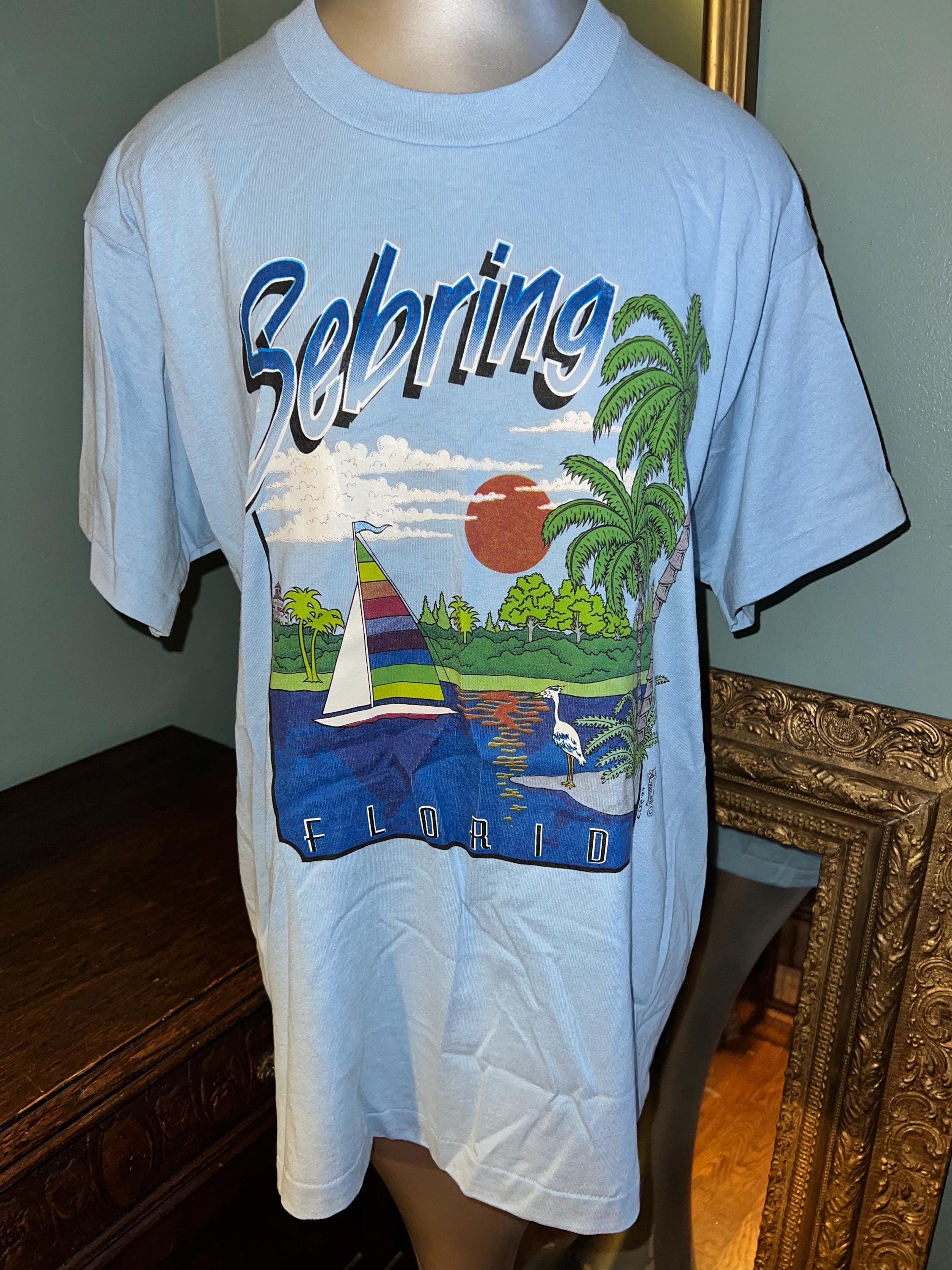 Oh how I love love love this beautiful 1980’s brand new without tags Sebring Florida tee! The baby blue color of the tee looks amazing with the excellent sailboat scene on the front!Its single stitch, USA made “Best” tee. It’s in great vintage condition.