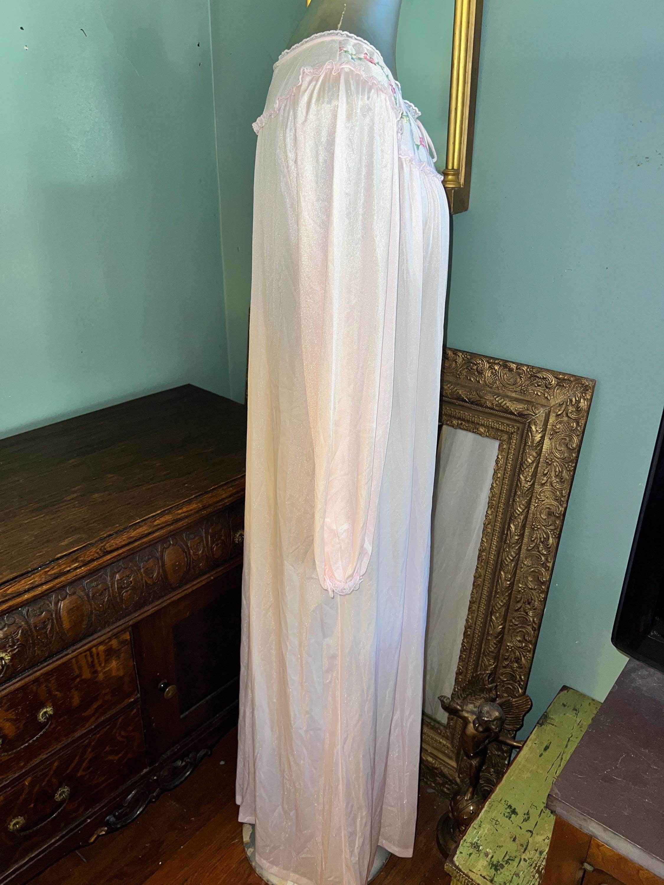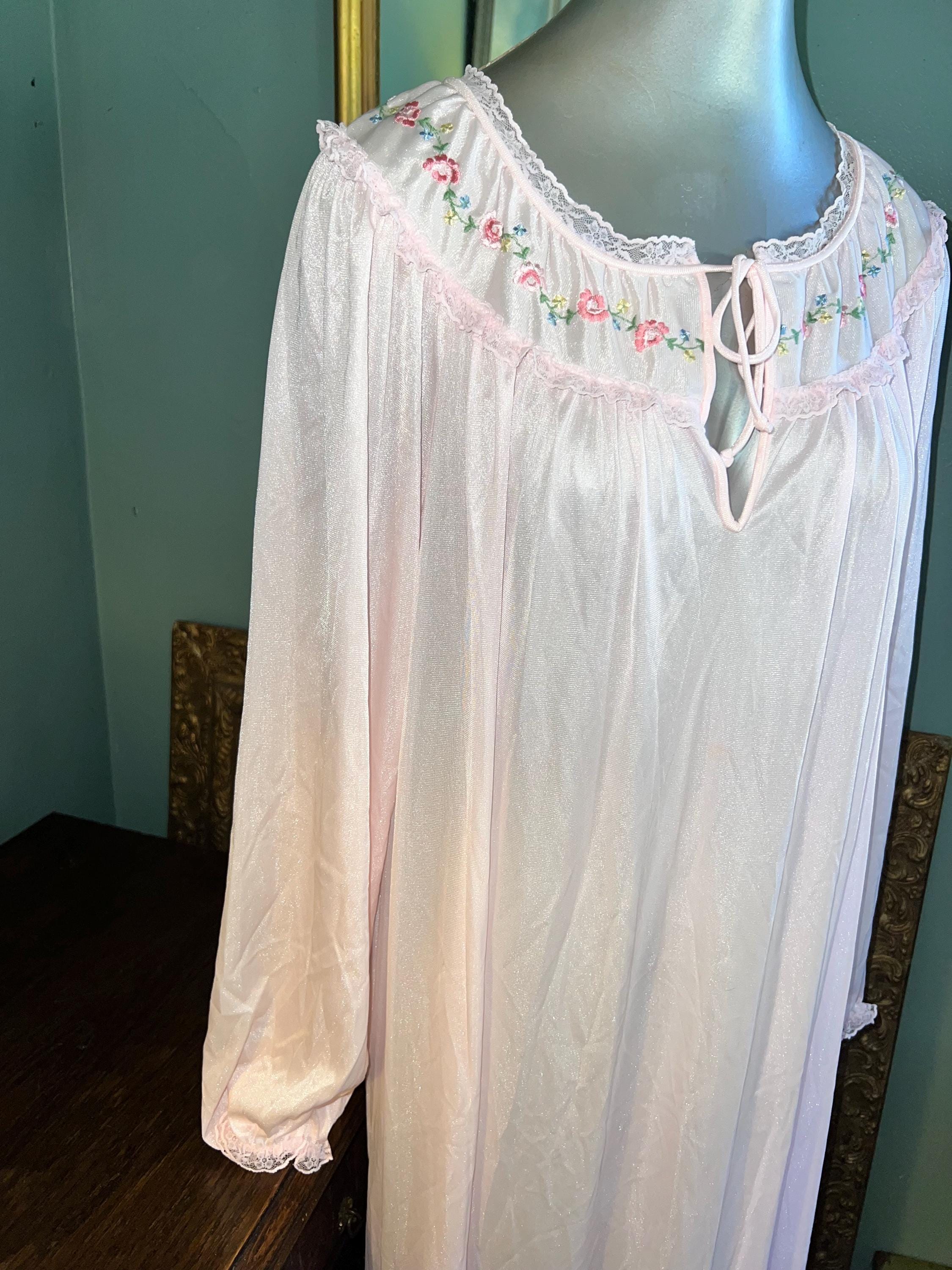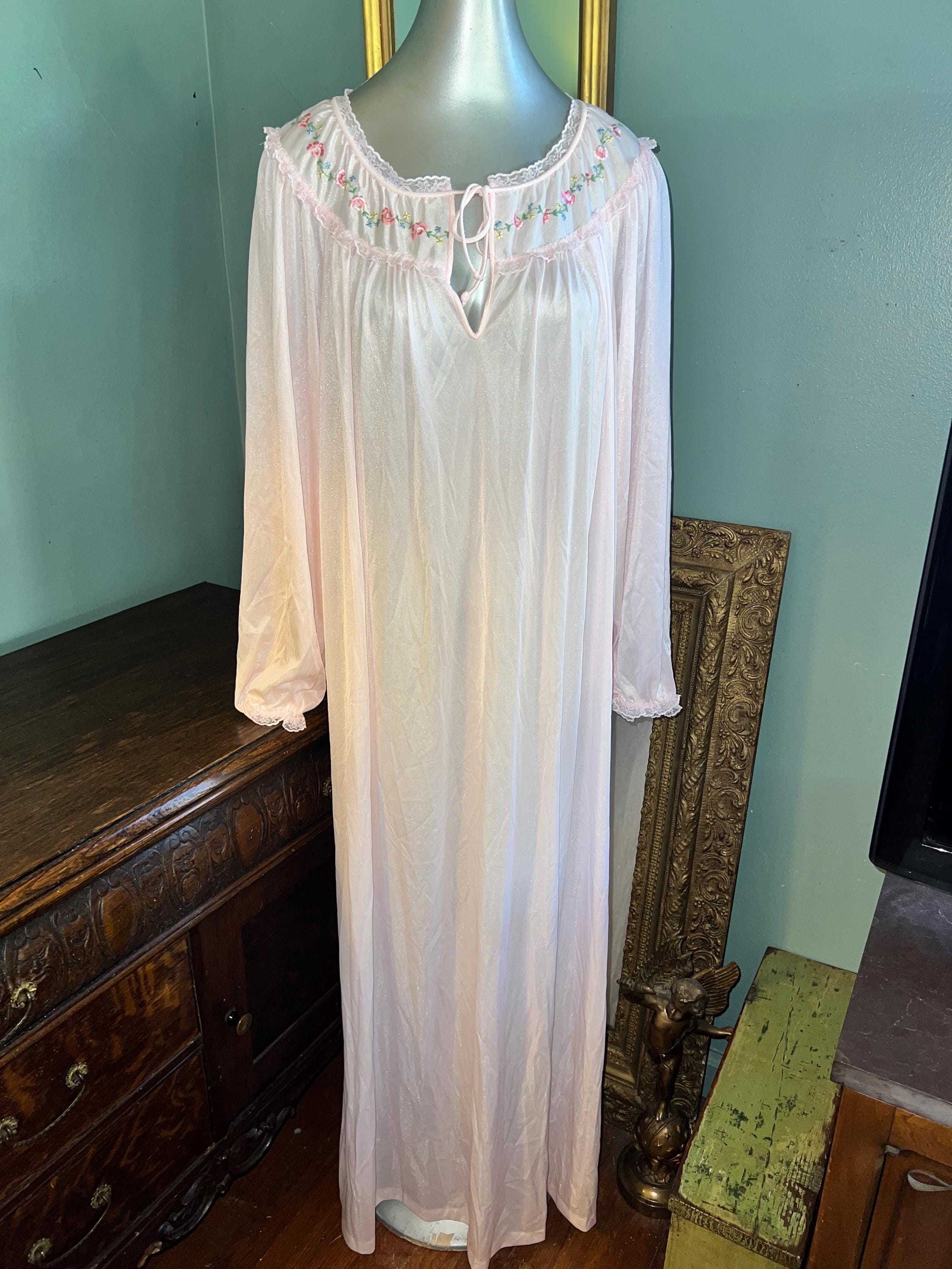 Very pretty and simple long flowing light pink nightgown with long sleeves and lace trim with embroidered flowers. It’s in really good vintage condition.