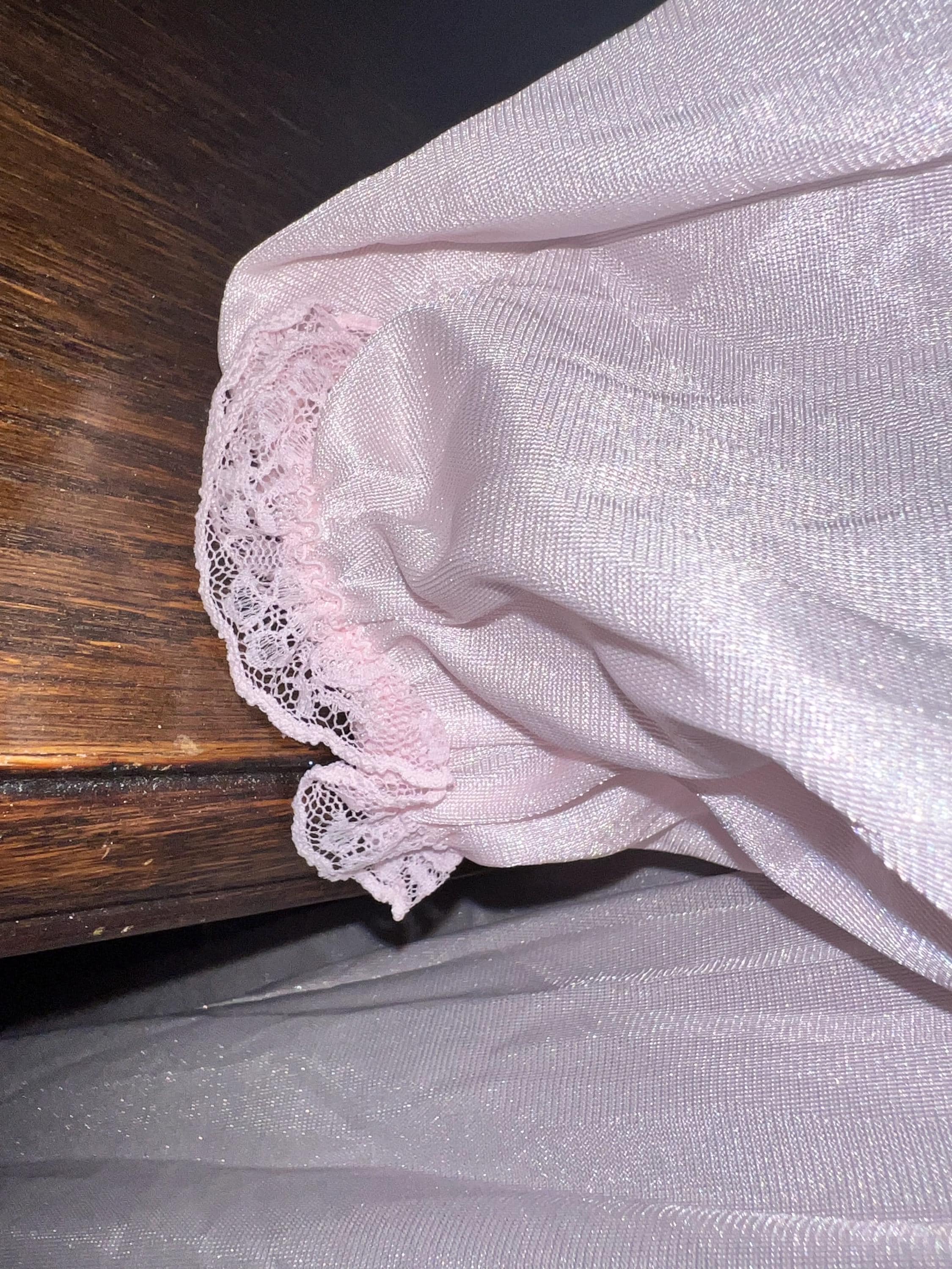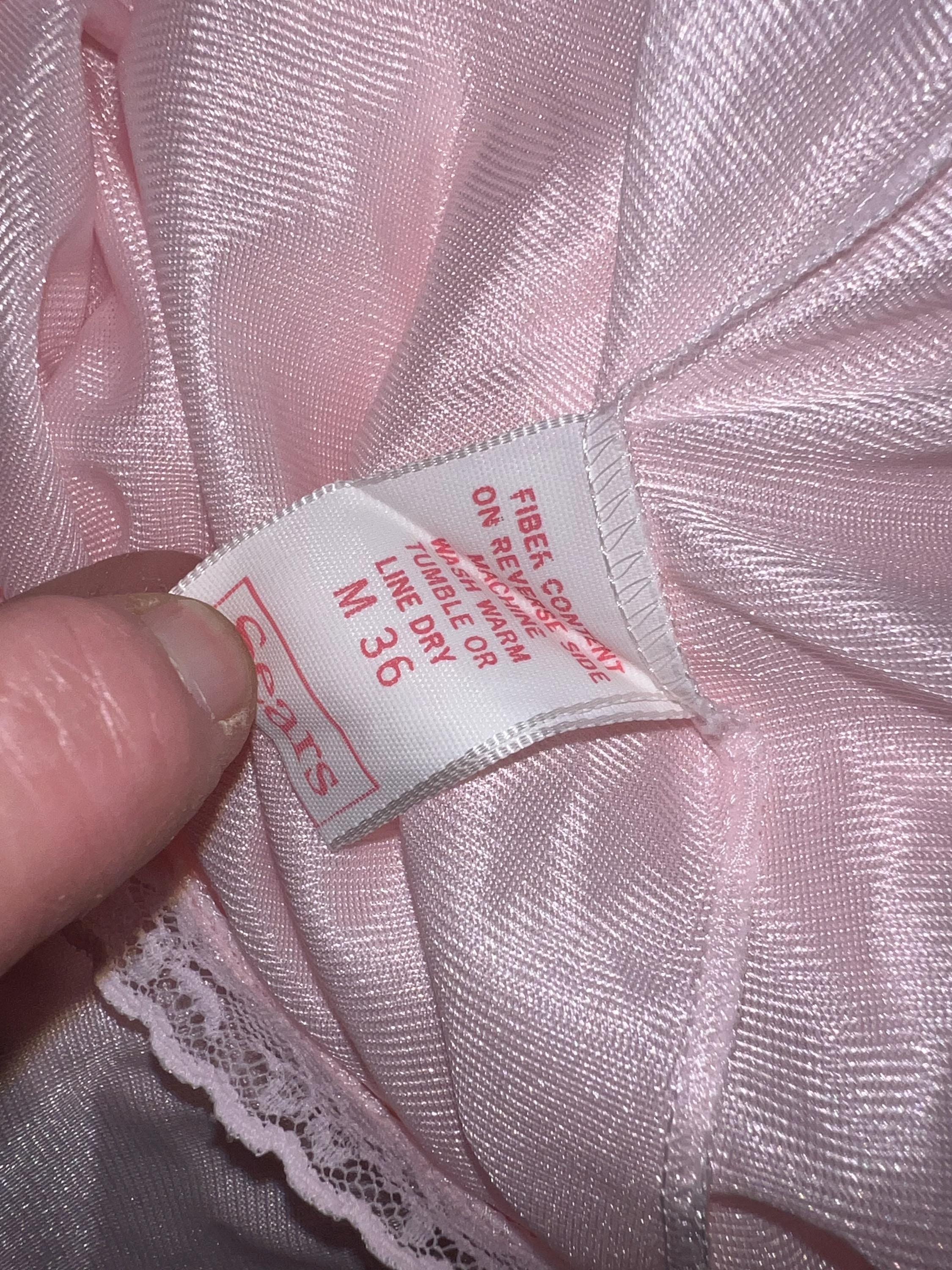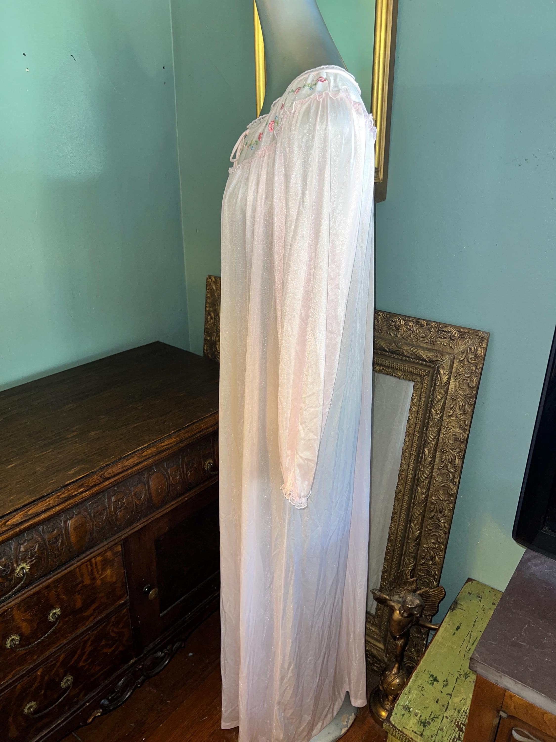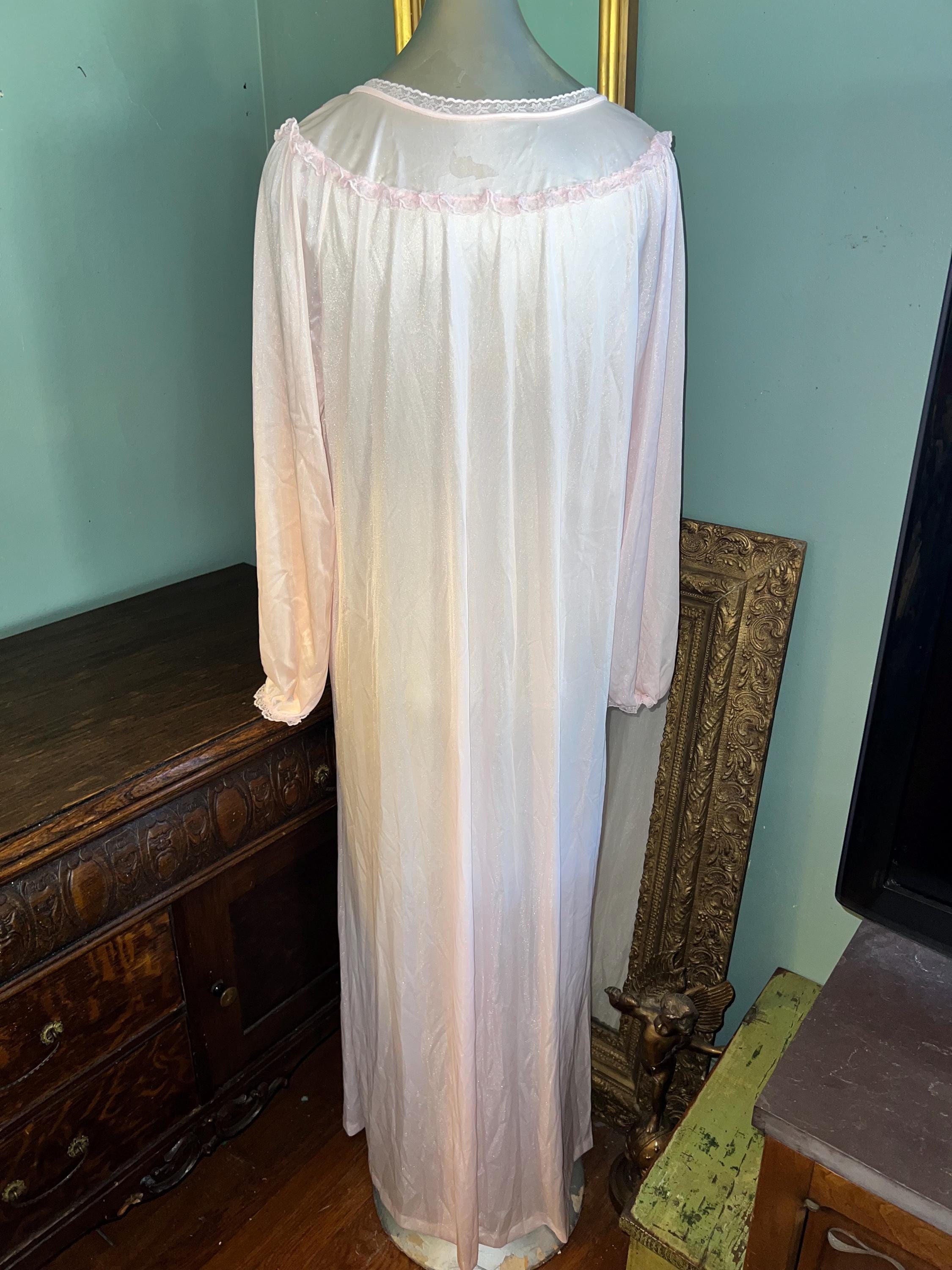 Very pretty and simple long flowing light pink nightgown with long sleeves and lace trim with embroidered flowers. It’s in really good vintage condition.