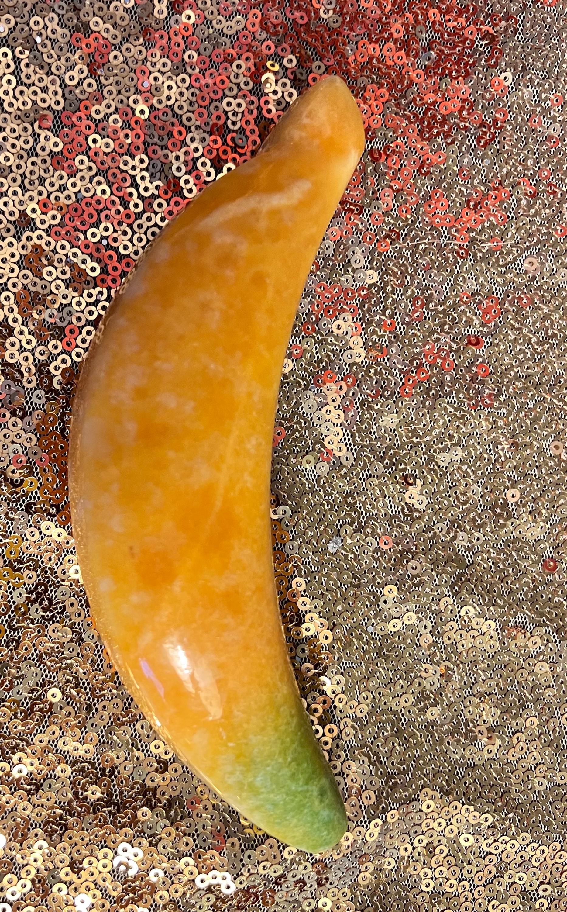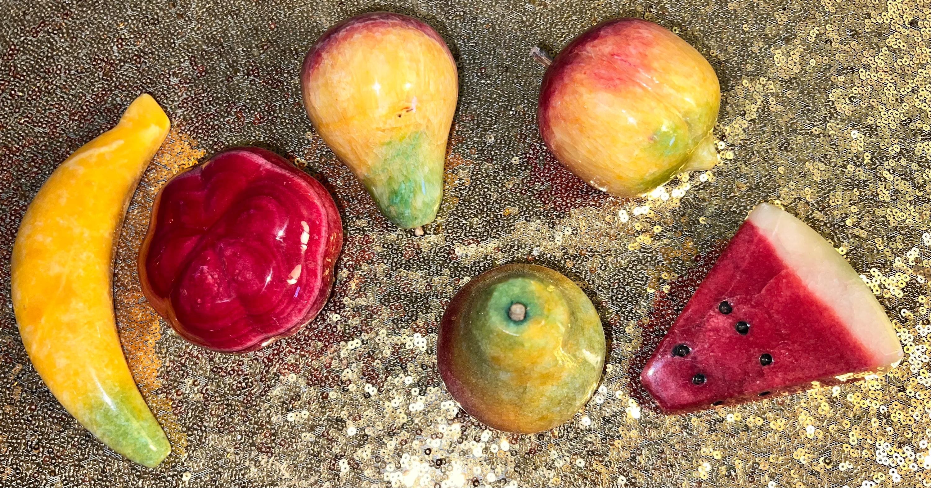 This is a set of six pieces of carved alabaster fruit. It includes two pears, one pomegranate , one banana, one watermelon slice, and one tomato. They are all really pretty, and in good condition.