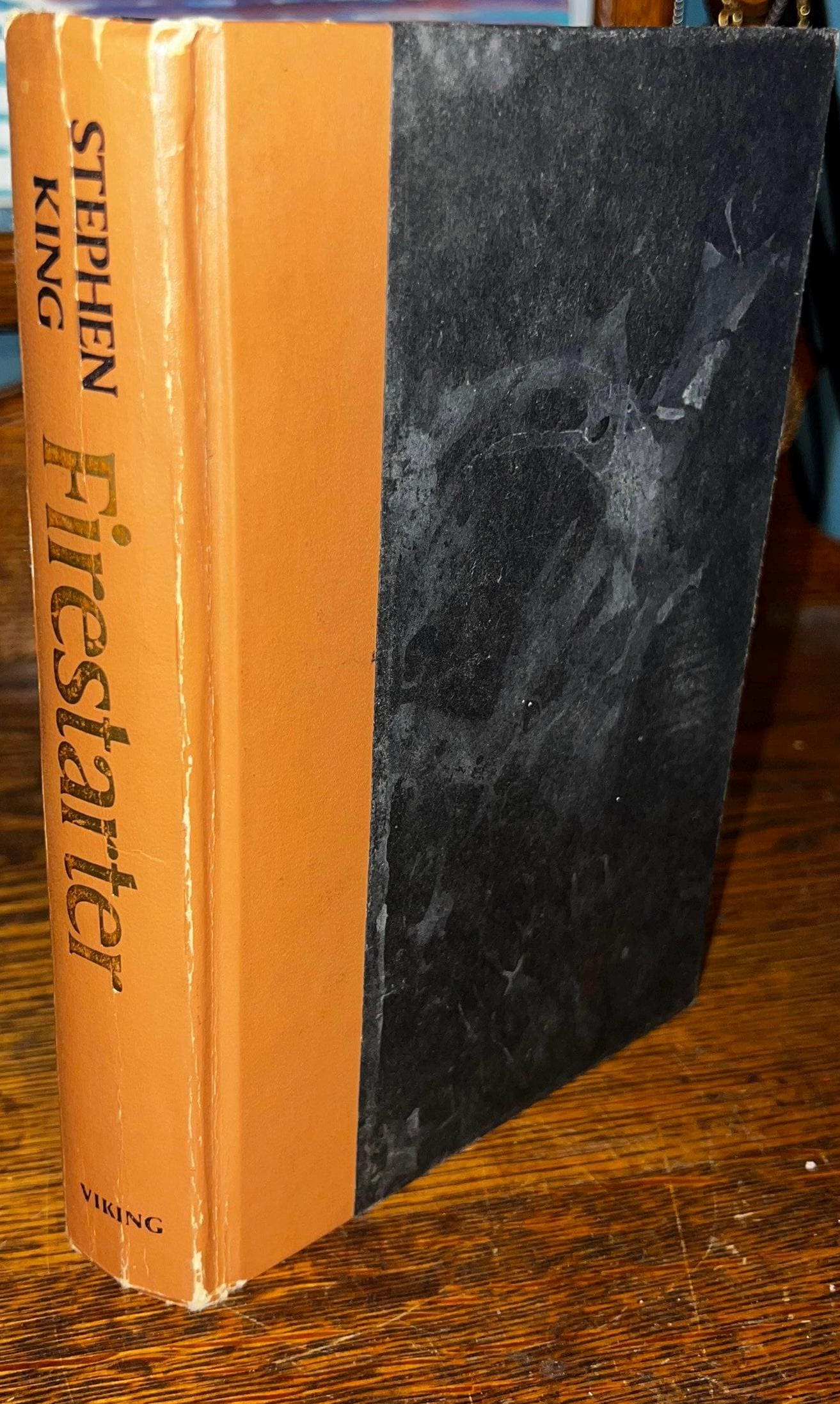 This is a an excellent Stephen King book! This is the 1980 Book Club edition of Firestarter. The paper cover is missing, and the book shows some wear and tear and so dive colored on the first blank page. Please review all photos!