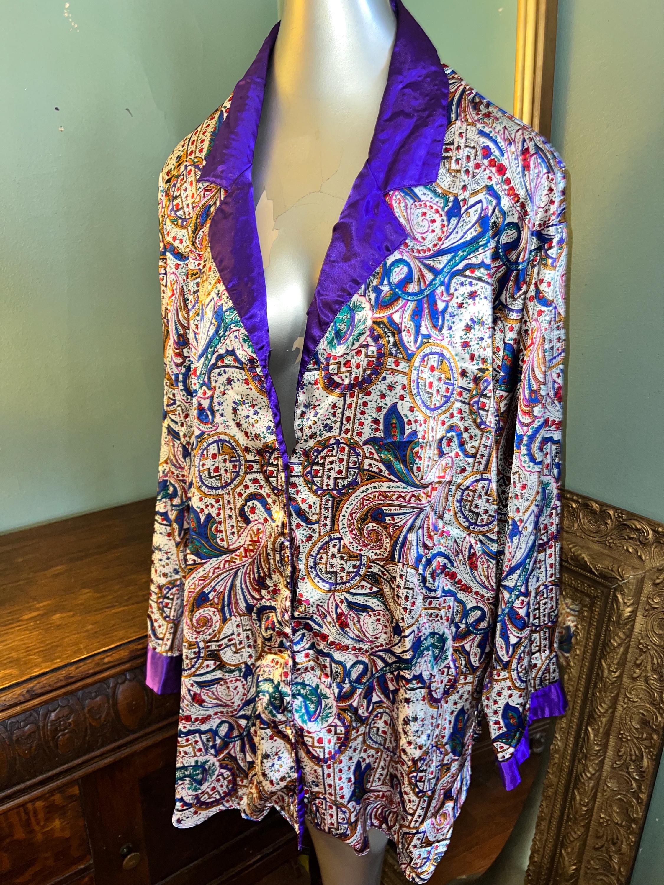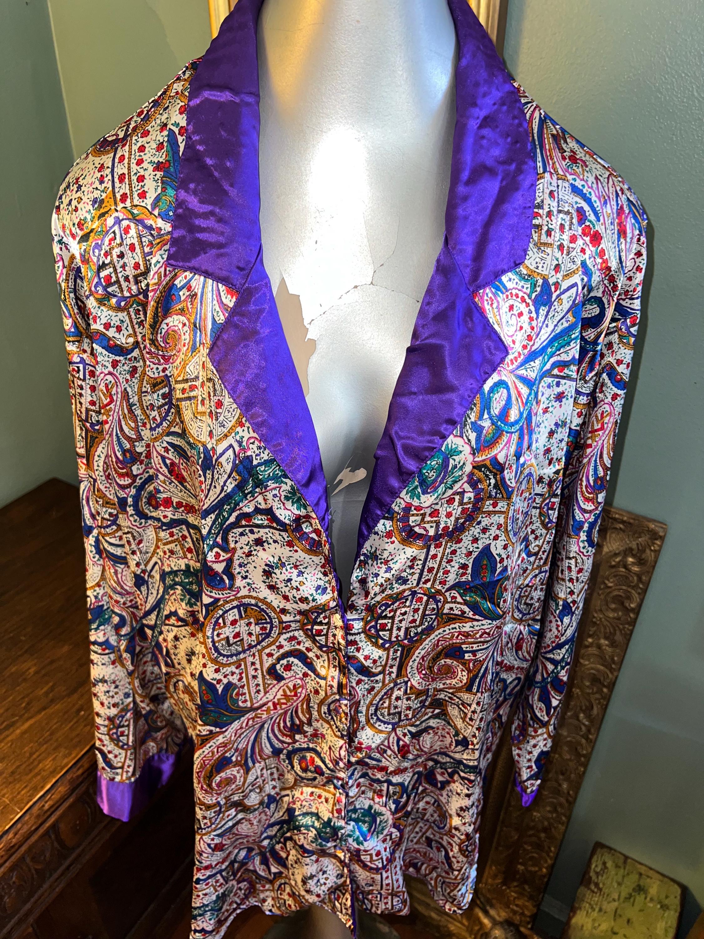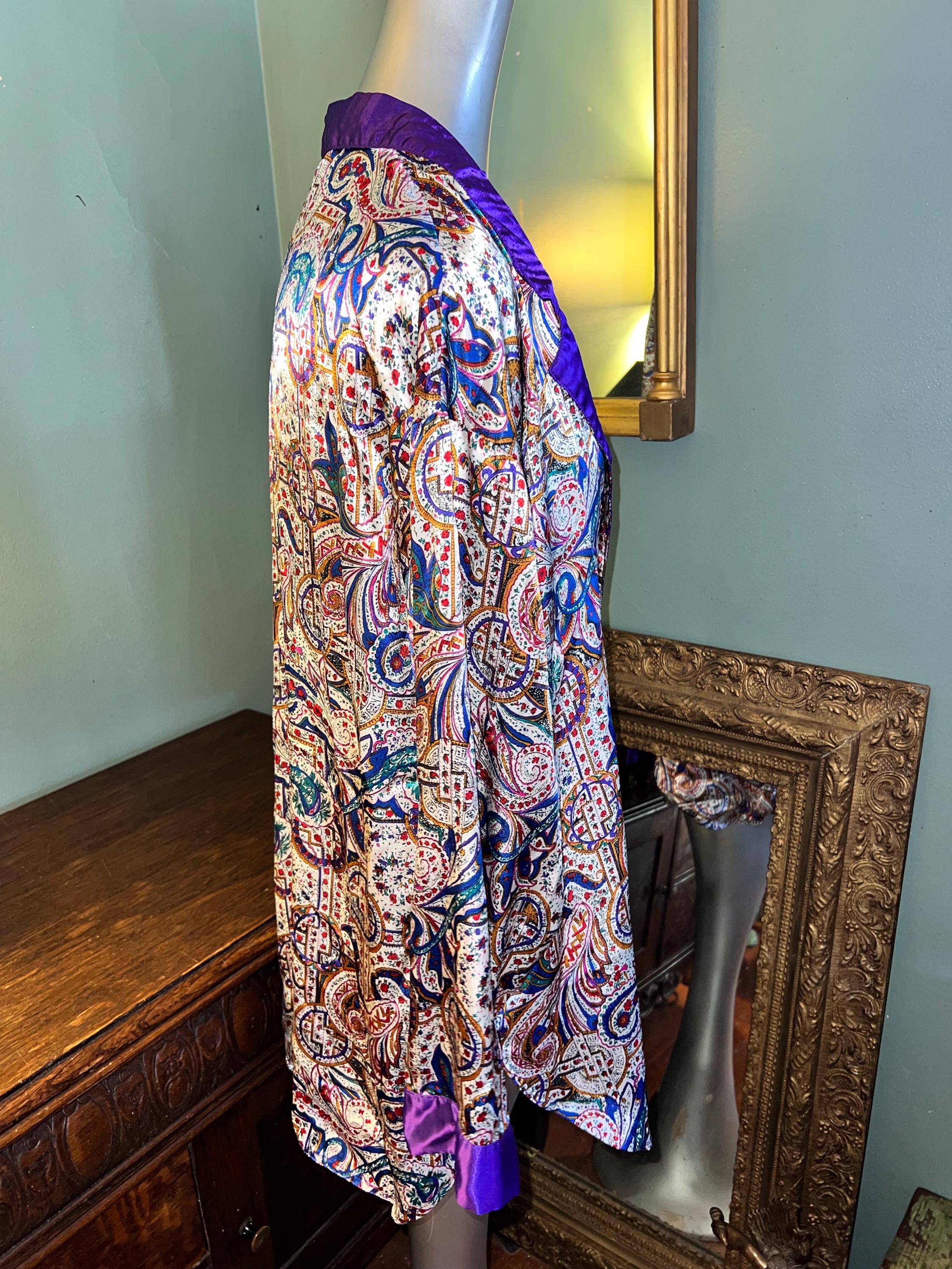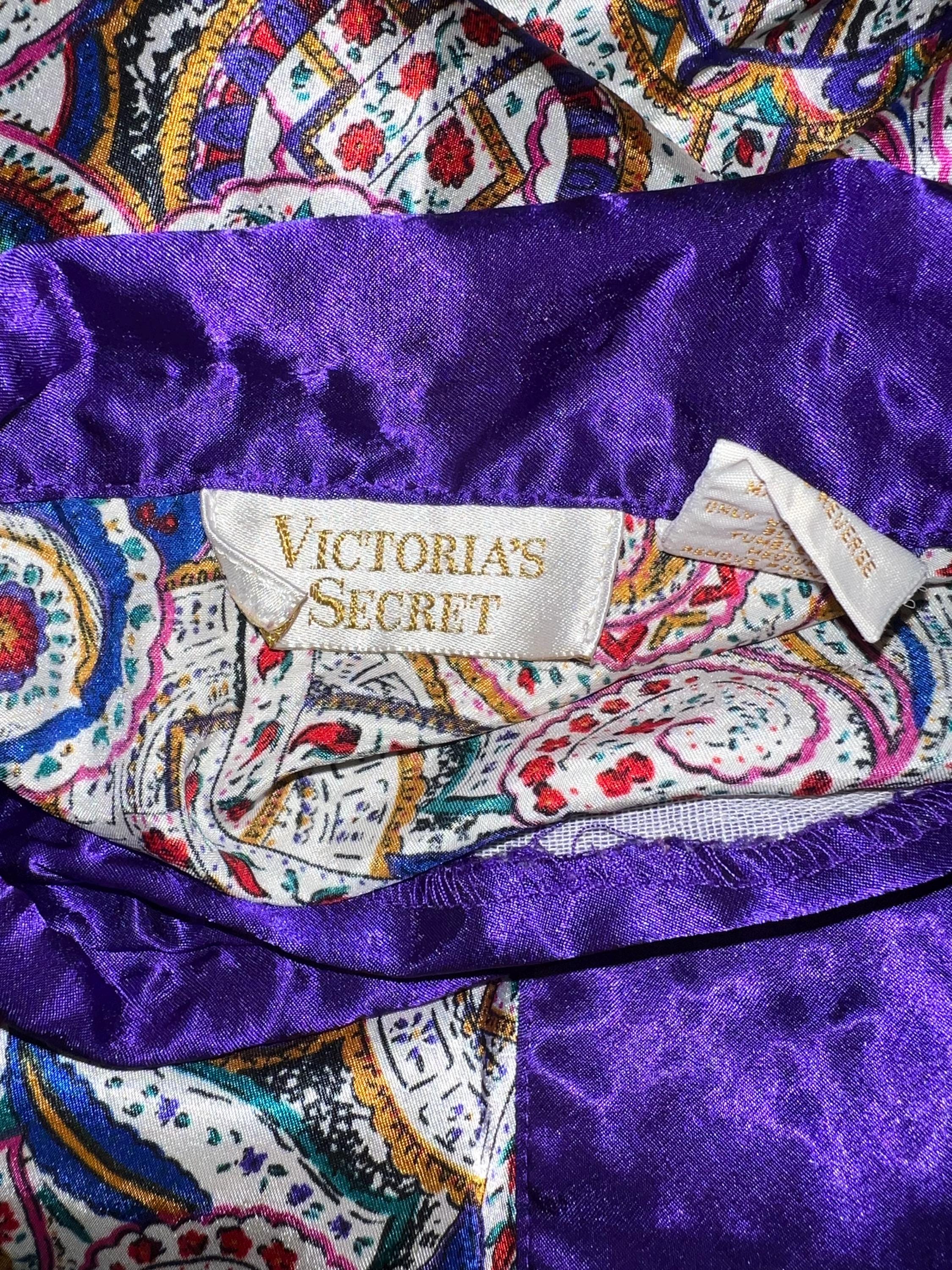 This is an amazing 80’s/90’s Victorias Secret white satin with a gorgeous purple paisley flower pattern and a big thick purple satin collar and double buttons. it has slits up the side. It’s meant to be big and oversized as you can see by the model. It’s a size medium but could easily be a large. I’ll post measurements.
