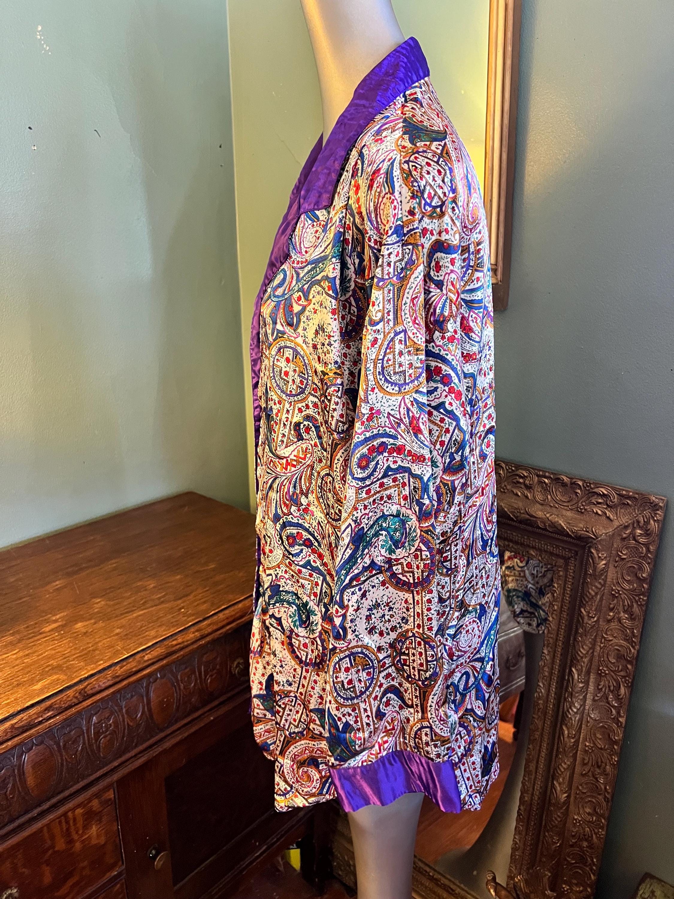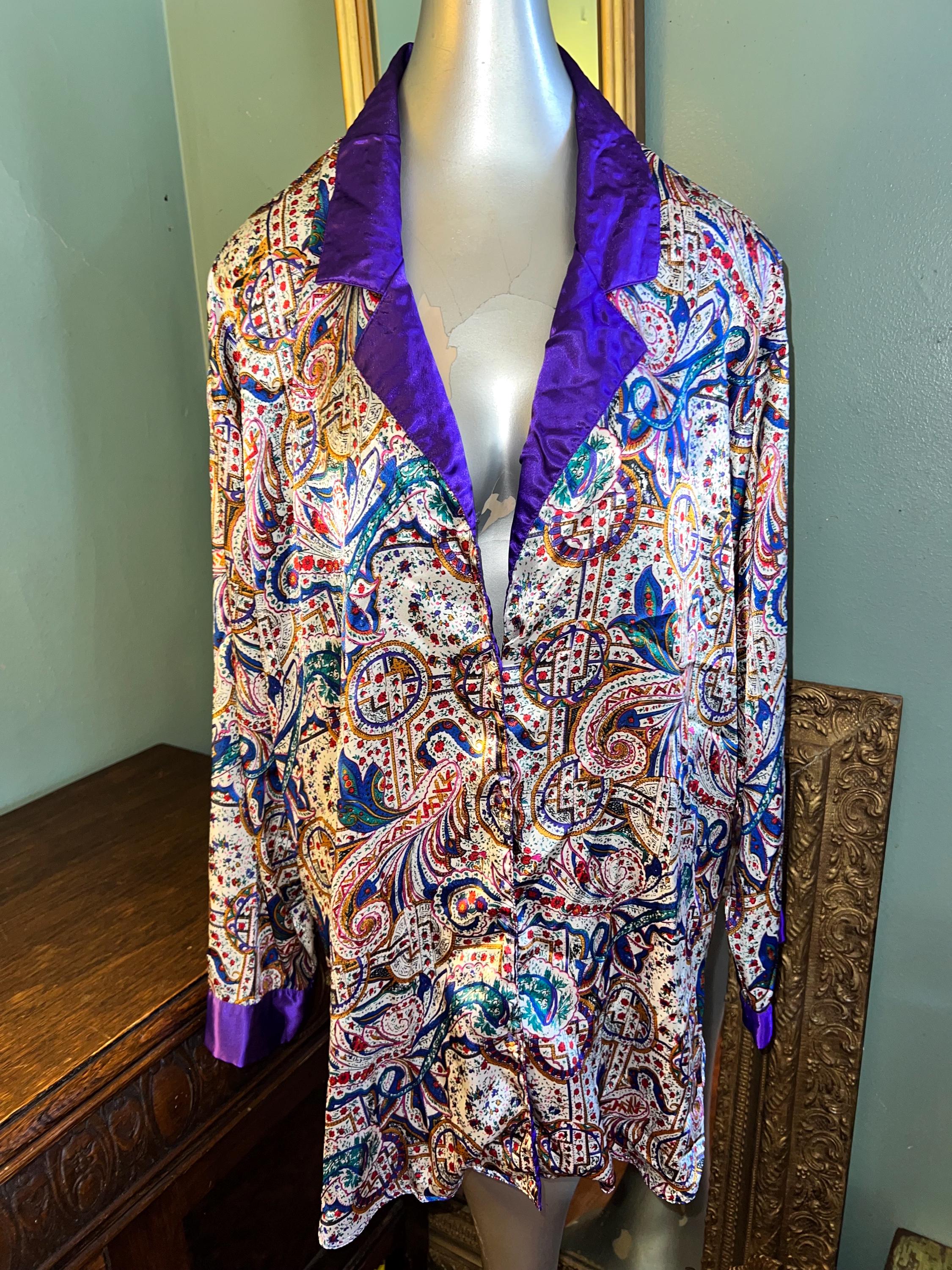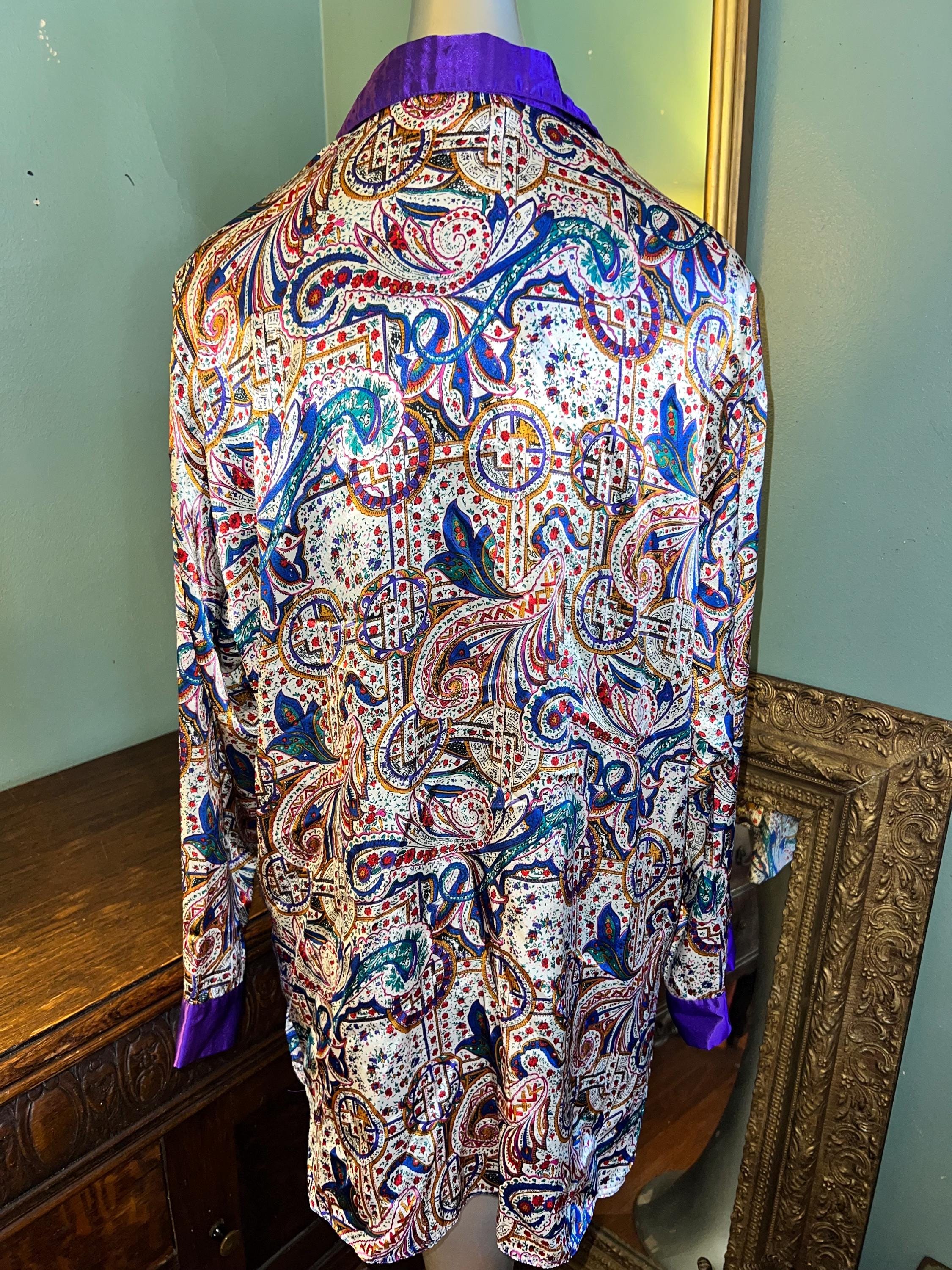 This is an amazing 80’s/90’s Victorias Secret white satin with a gorgeous purple paisley flower pattern and a big thick purple satin collar and double buttons. it has slits up the side. It’s meant to be big and oversized as you can see by the model. It’s a size medium but could easily be a large. I’ll post measurements.