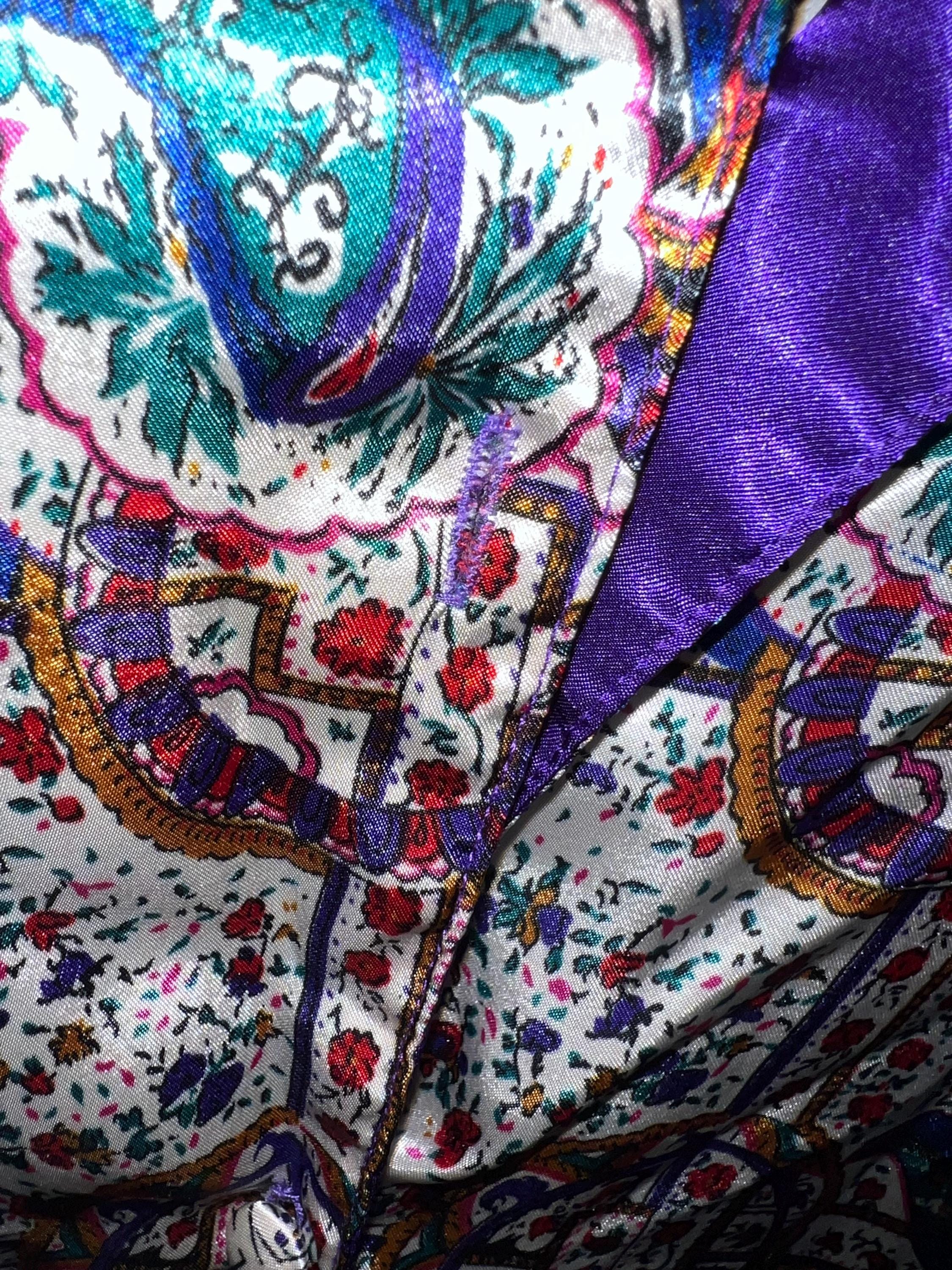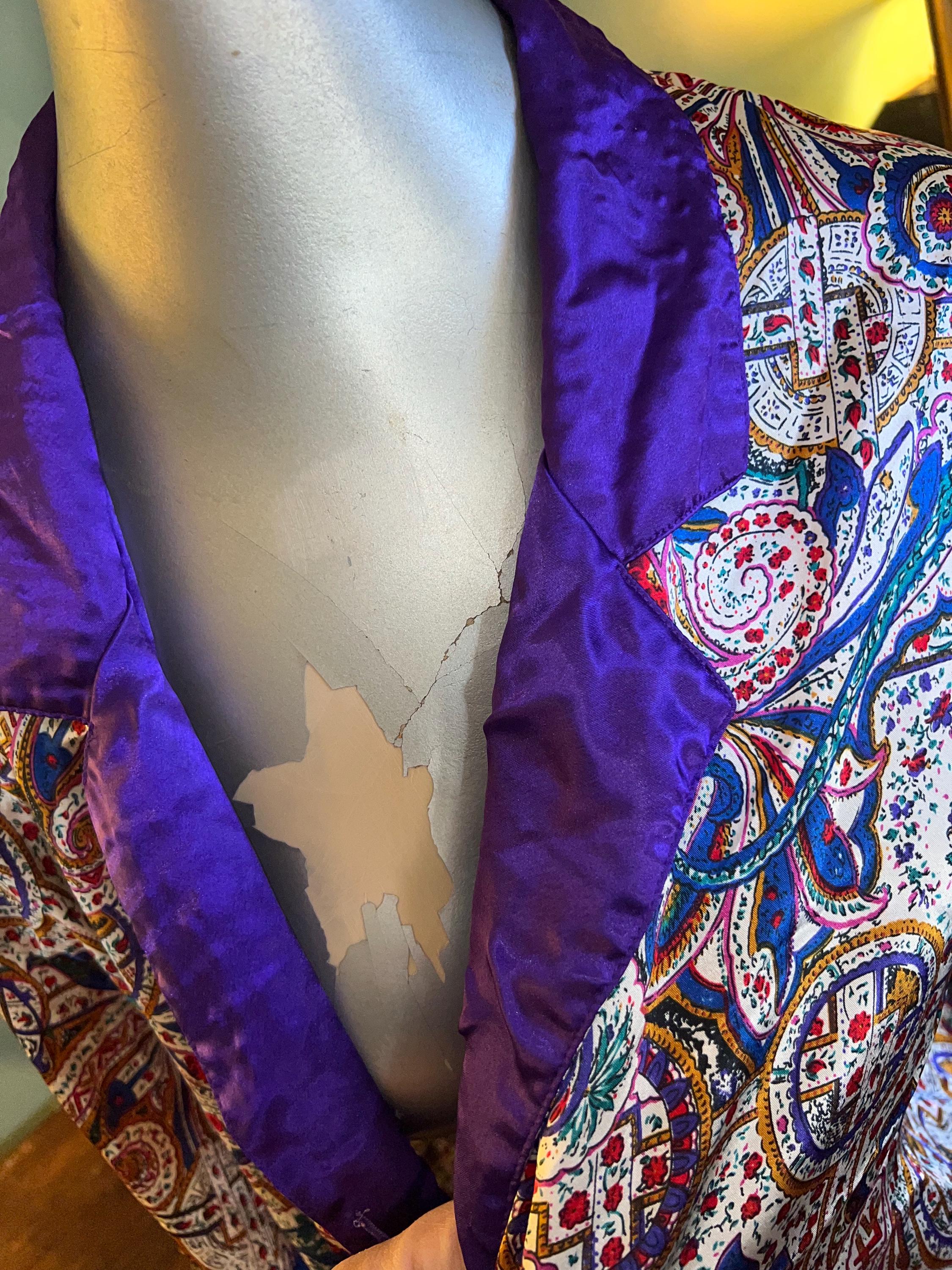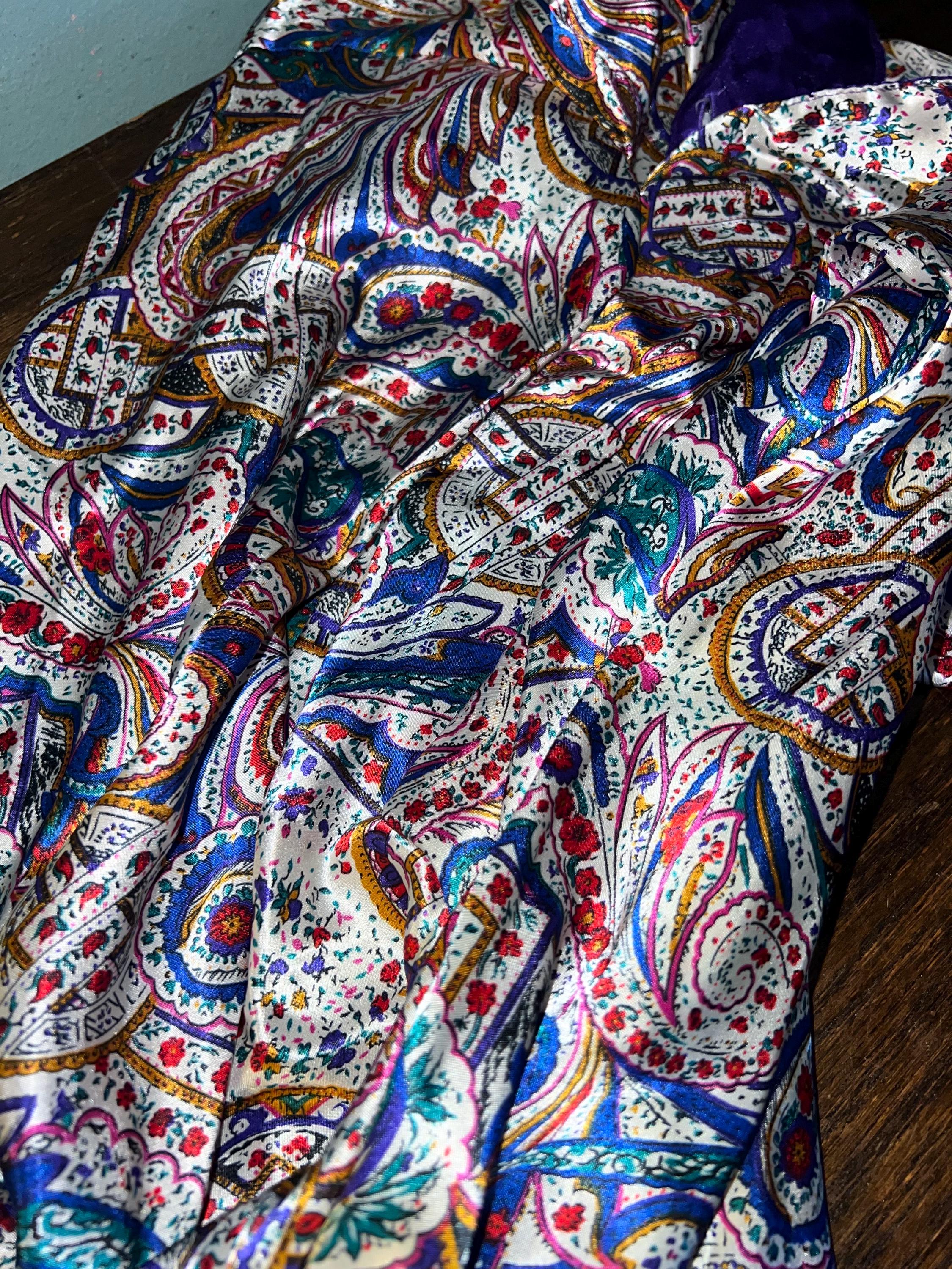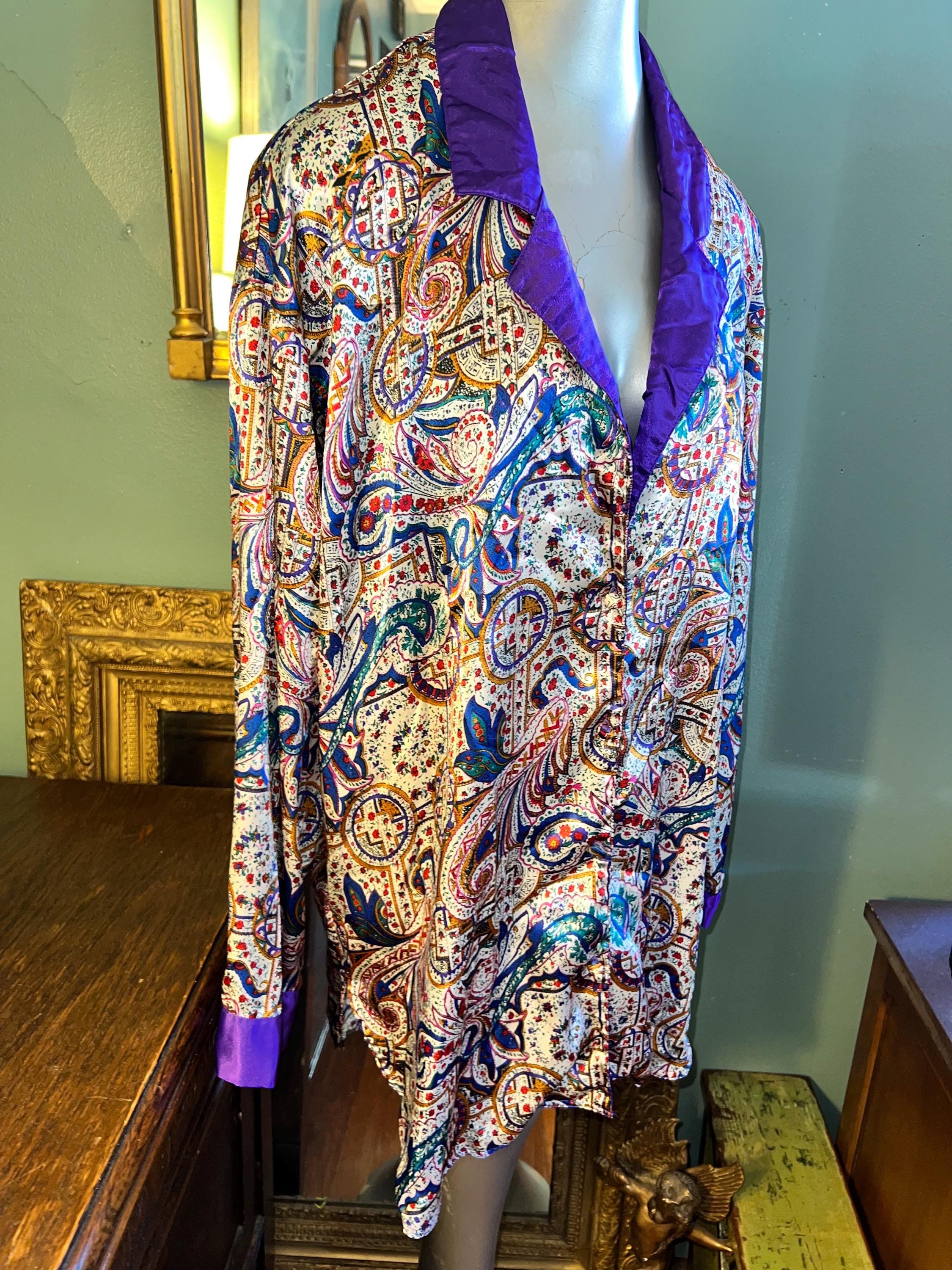 This is an amazing 80’s/90’s Victorias Secret white satin with a gorgeous purple paisley flower pattern and a big thick purple satin collar and double buttons. it has slits up the side. It’s meant to be big and oversized as you can see by the model. It’s a size medium but could easily be a large. I’ll post measurements.