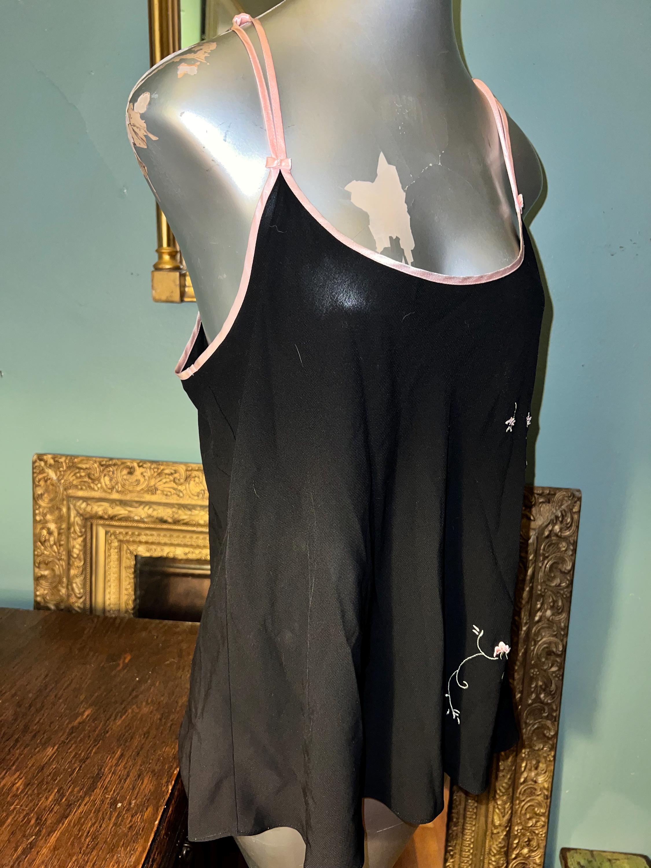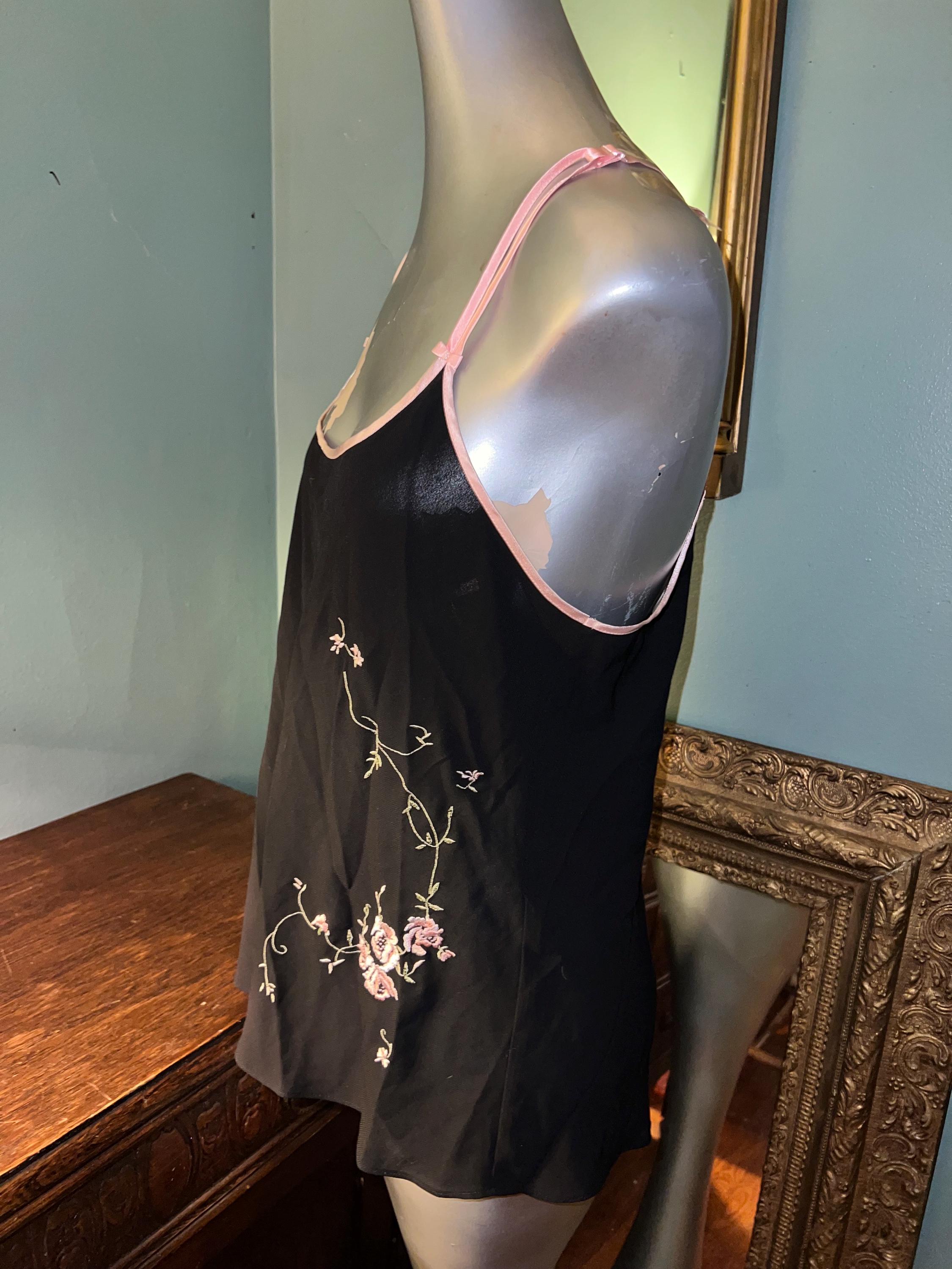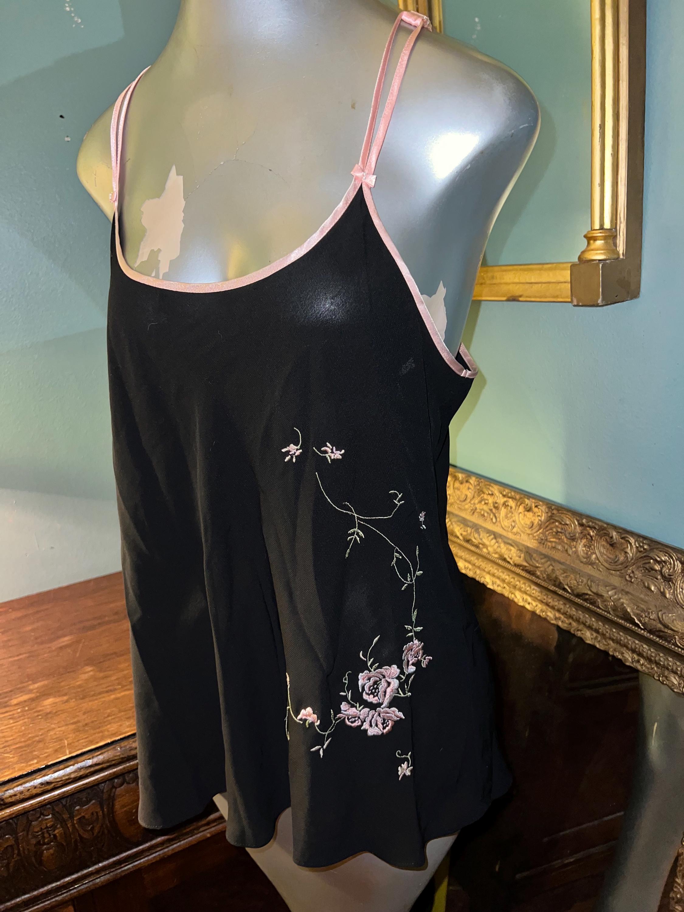 This is a very pretty black, sheer camisole. It has thick satin adjustable straps and flowers embroidered on it. it’s really pretty and It’s in good vintage condition.