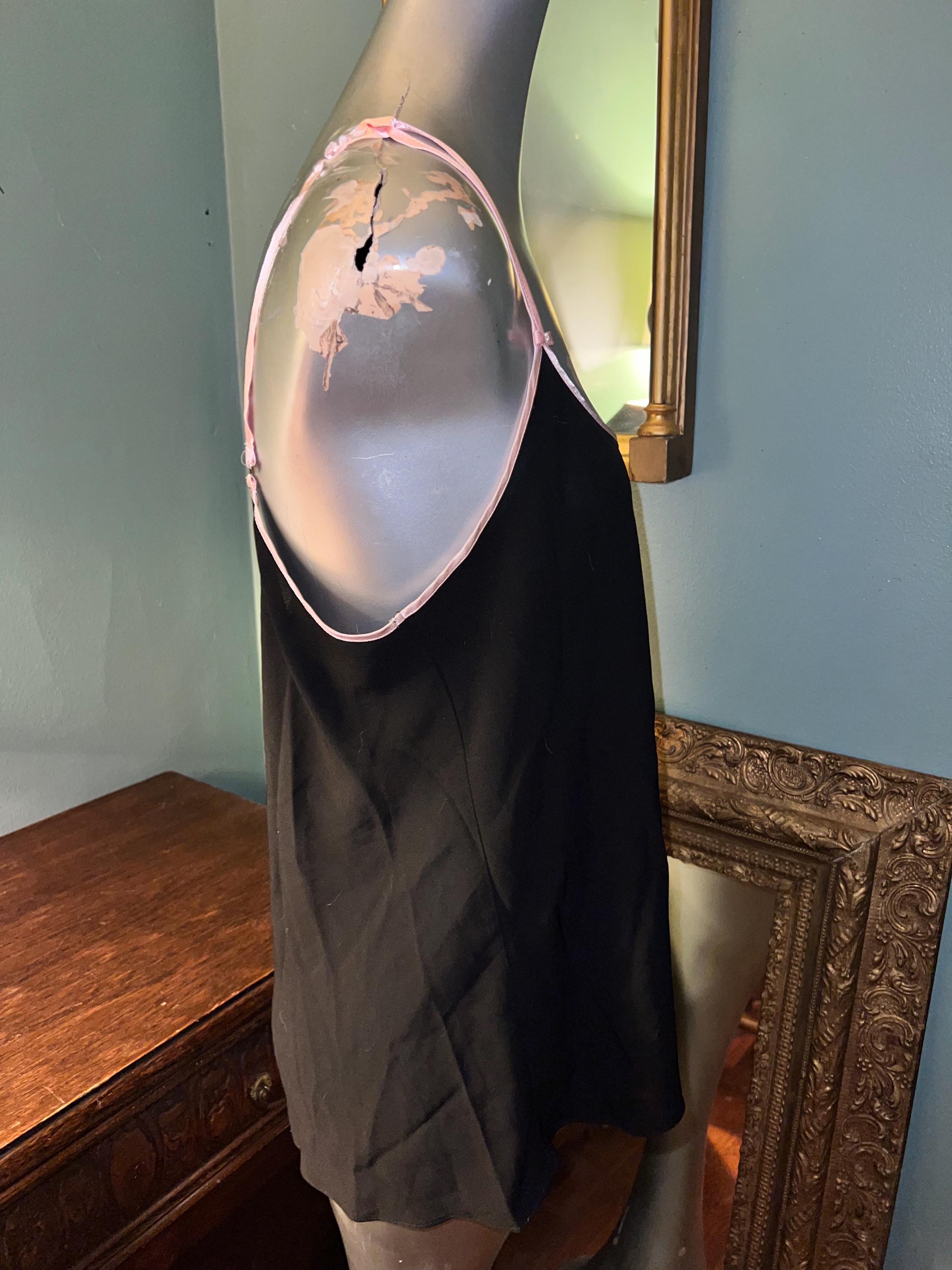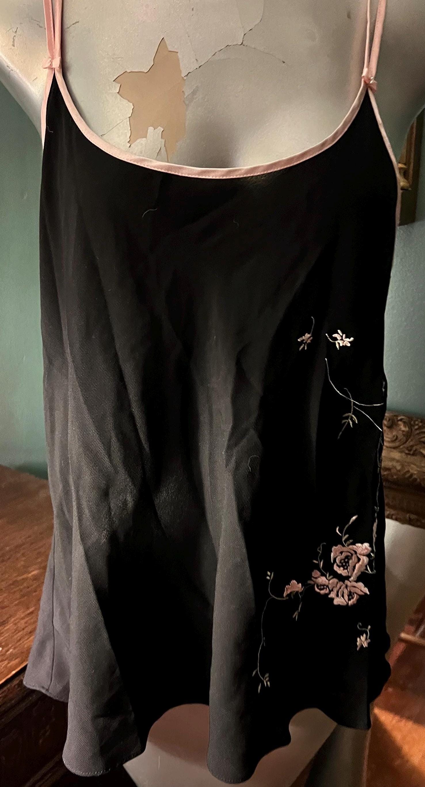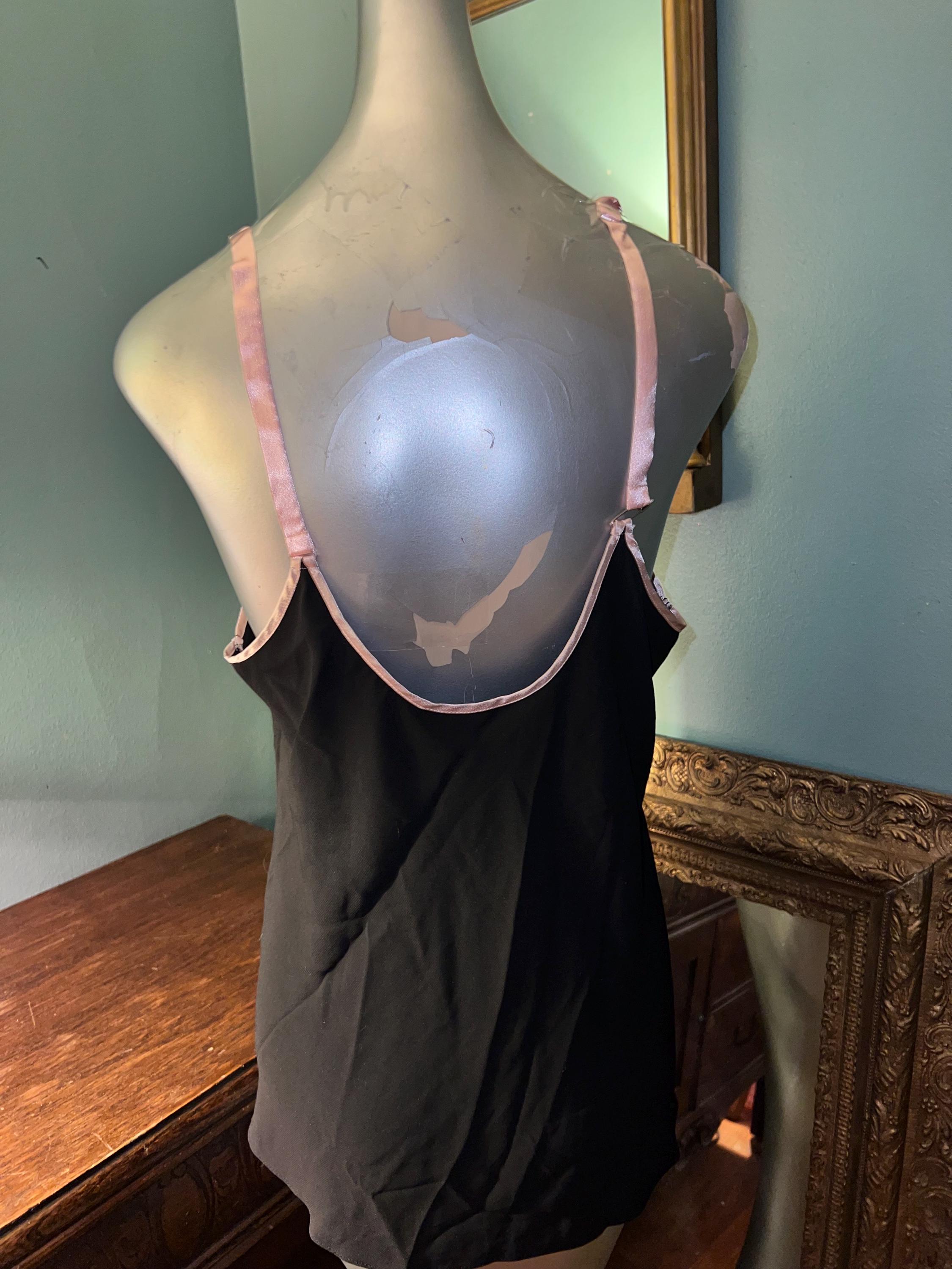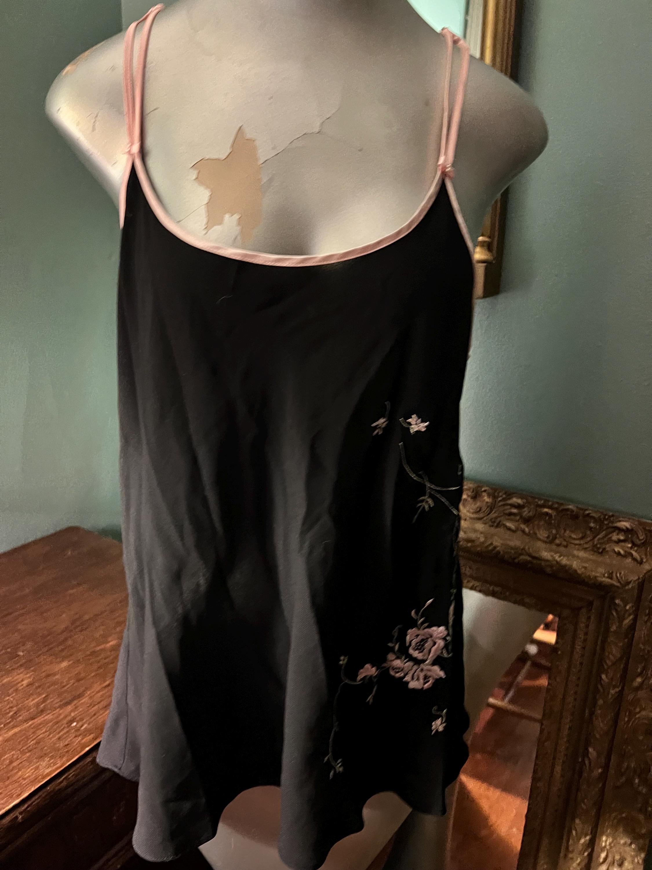 This is a very pretty black, sheer camisole. It has thick satin adjustable straps and flowers embroidered on it. it’s really pretty and It’s in good vintage condition.