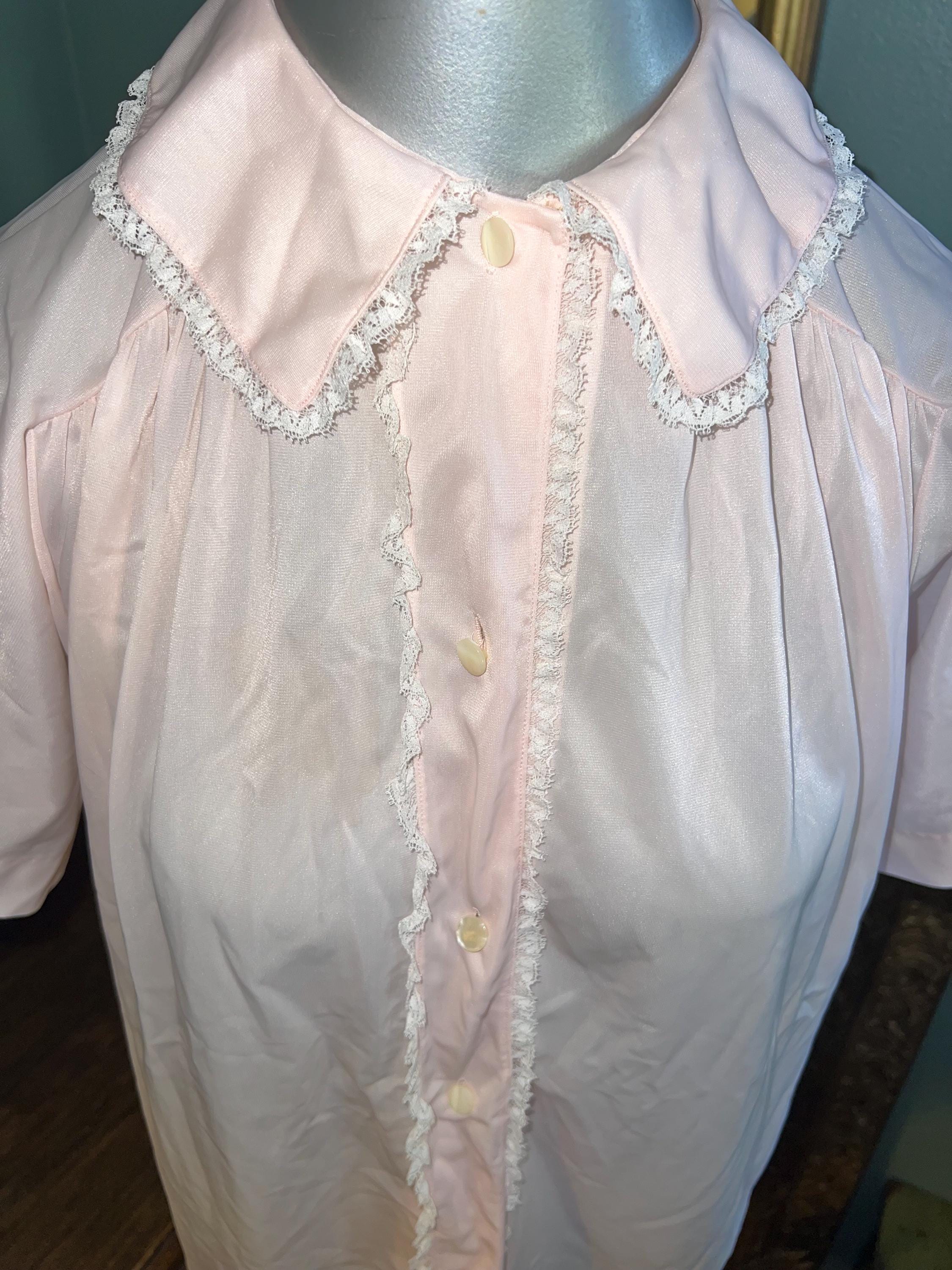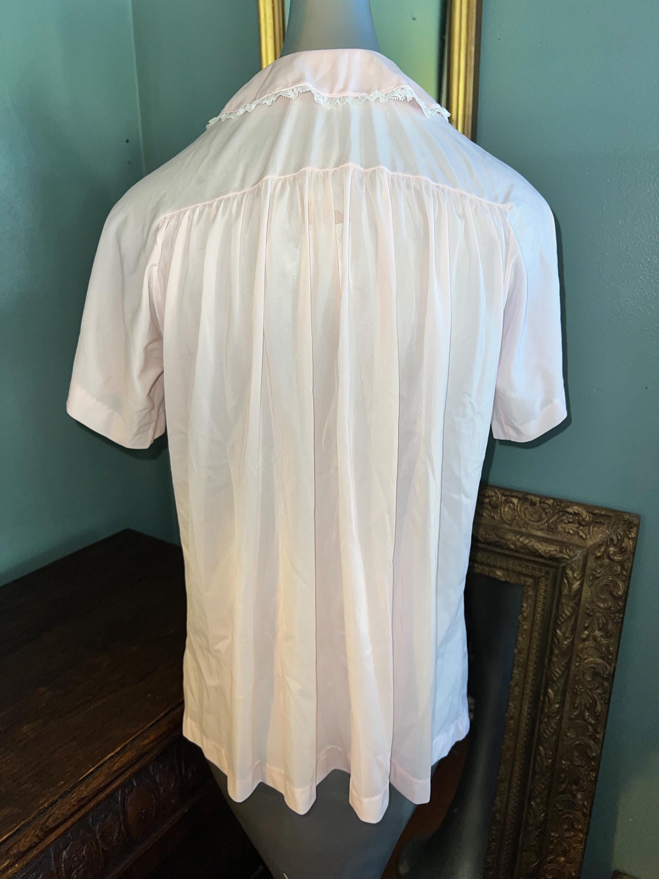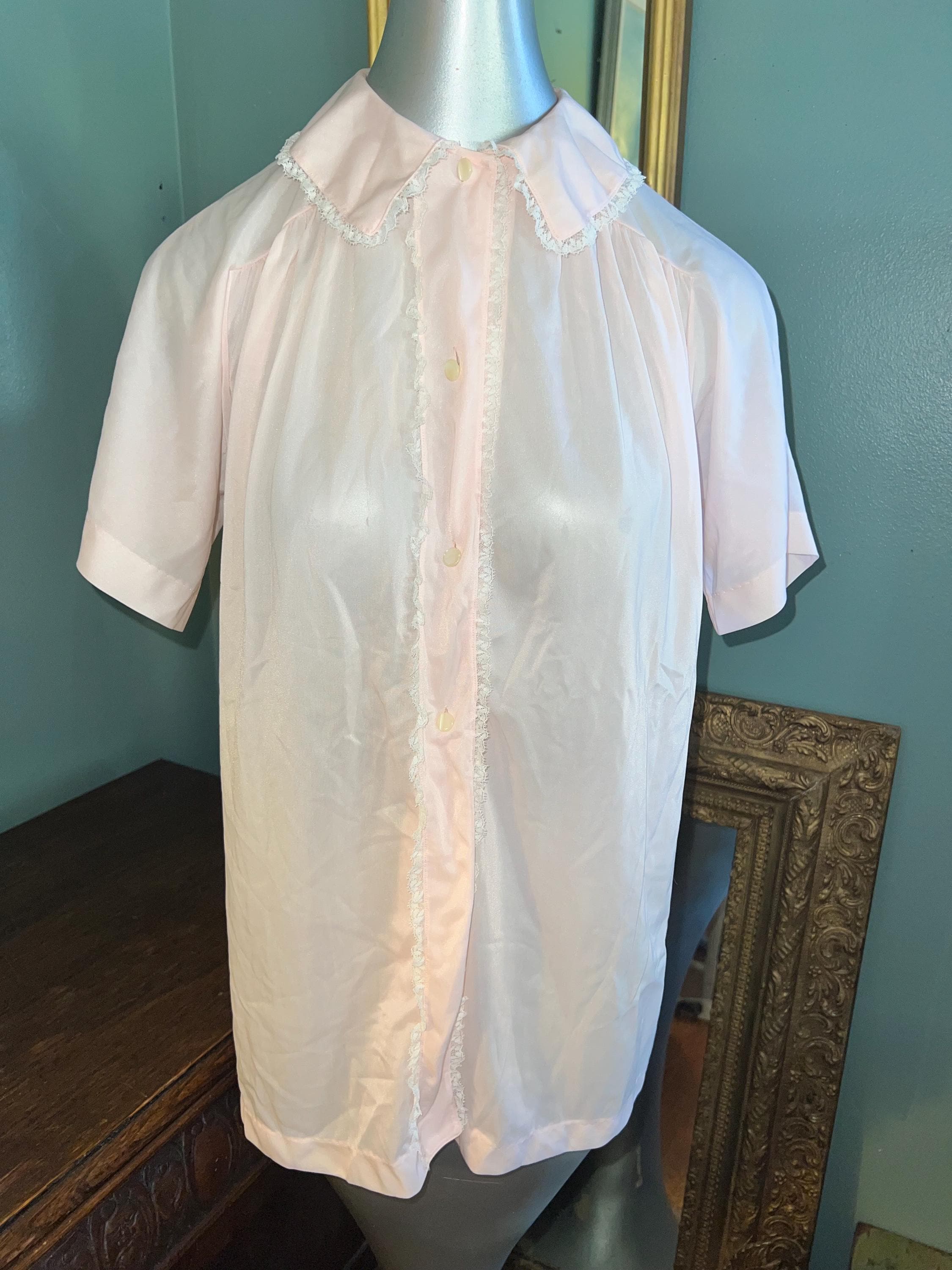 Very pretty and simple pink night shirt with lace trim. I do not have the matching pants. I think this would look amazing with jeans! It’s in good vintage condition.
