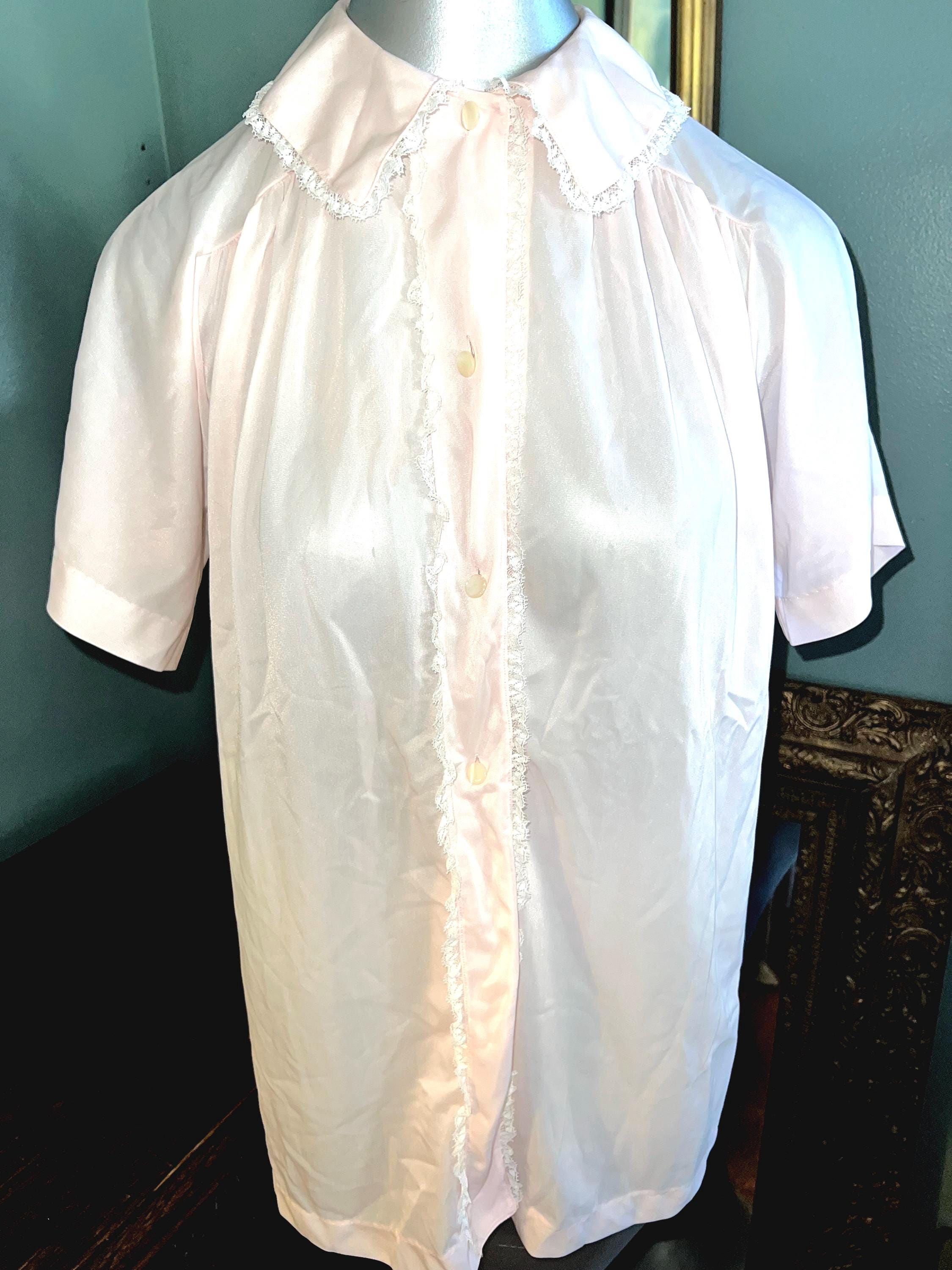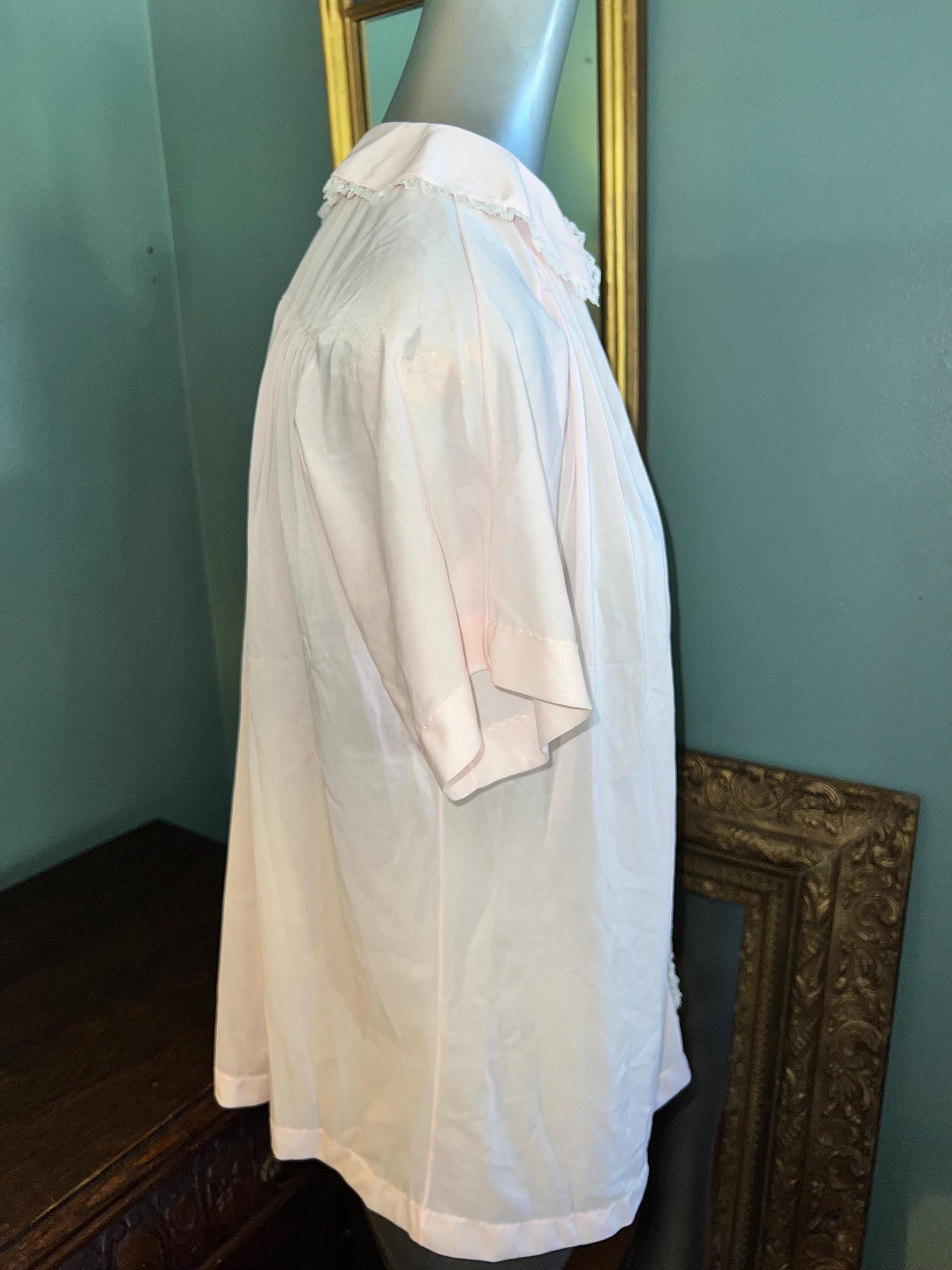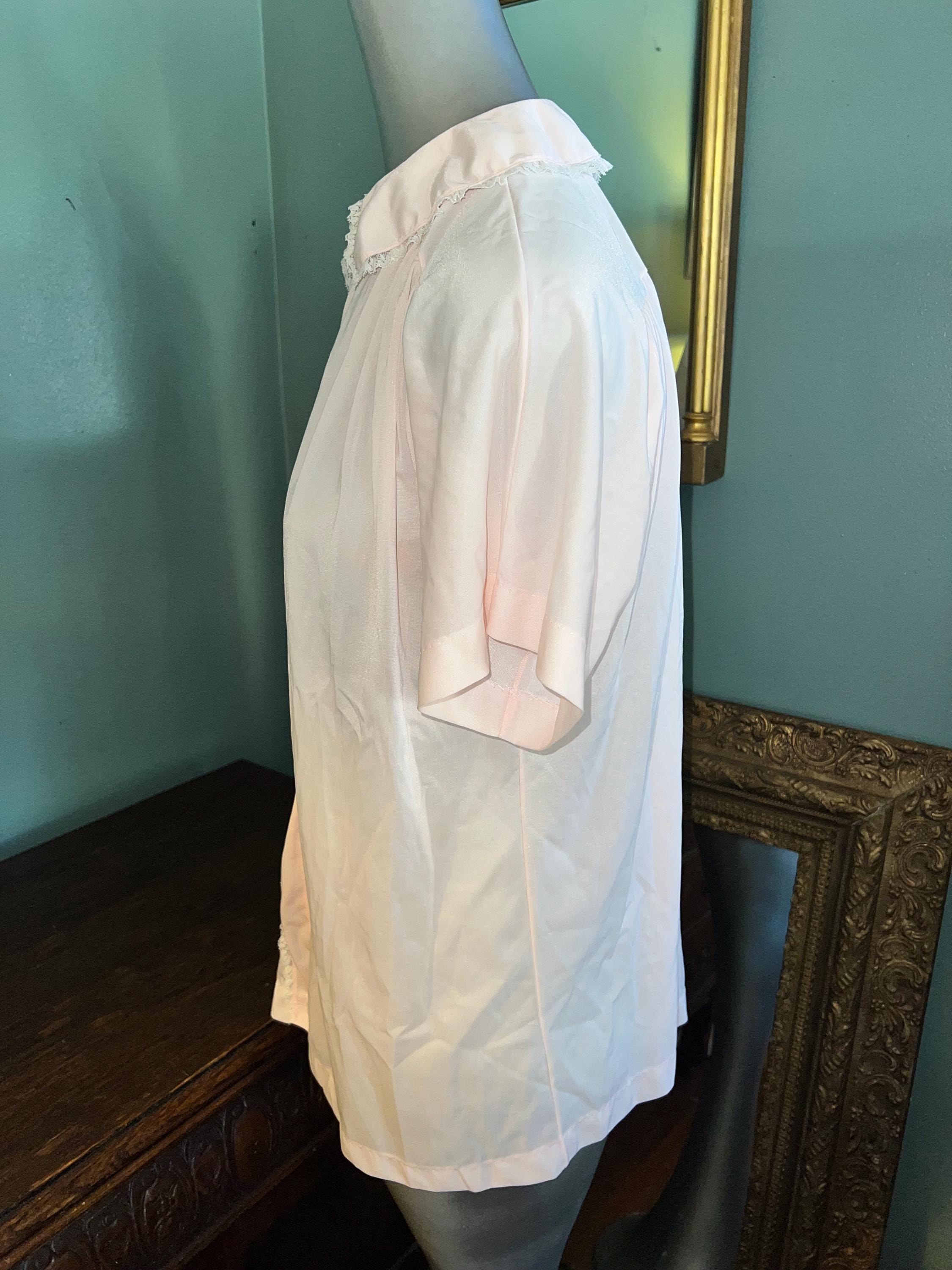 Very pretty and simple pink night shirt with lace trim. I do not have the matching pants. I think this would look amazing with jeans! It’s in good vintage condition.