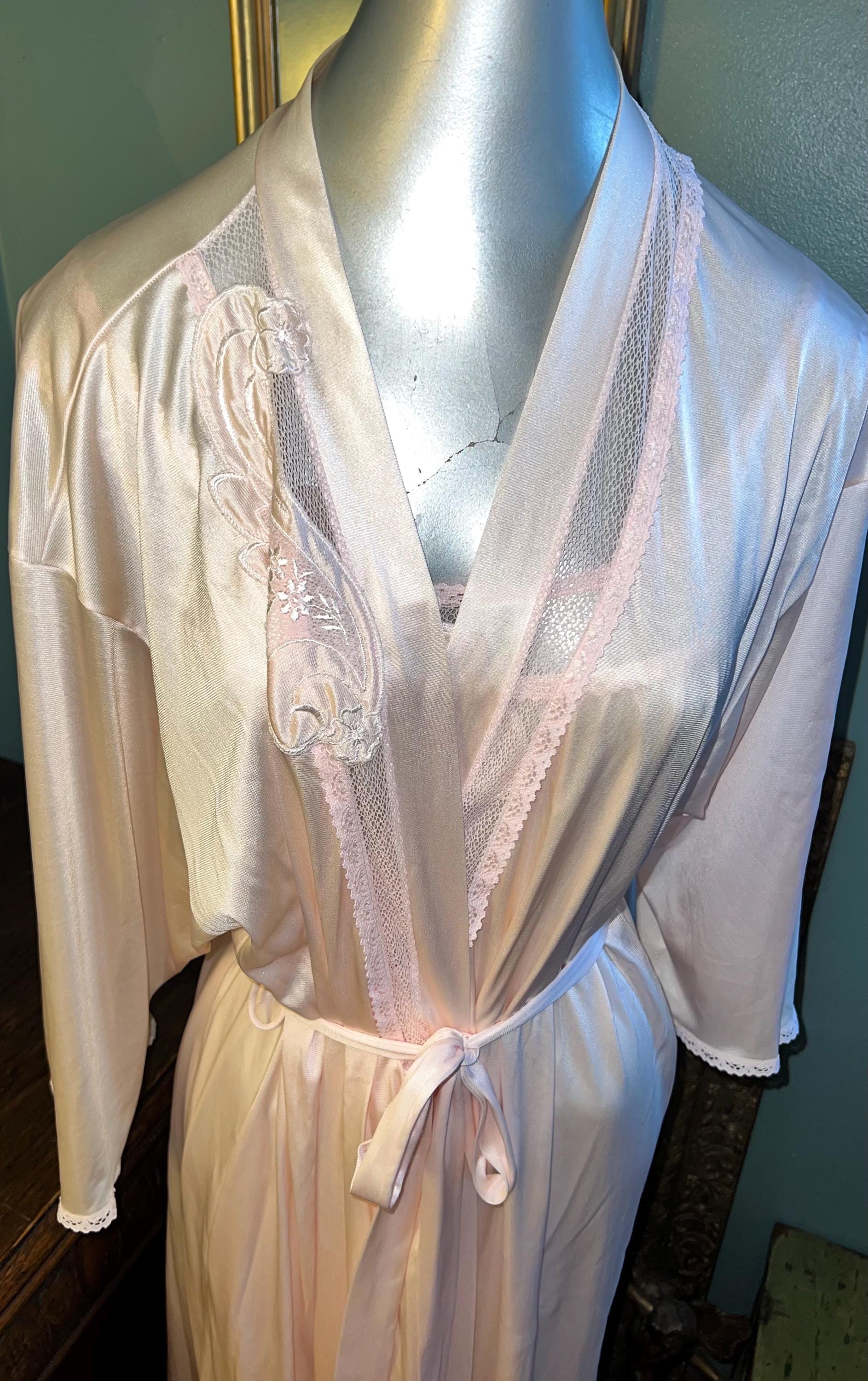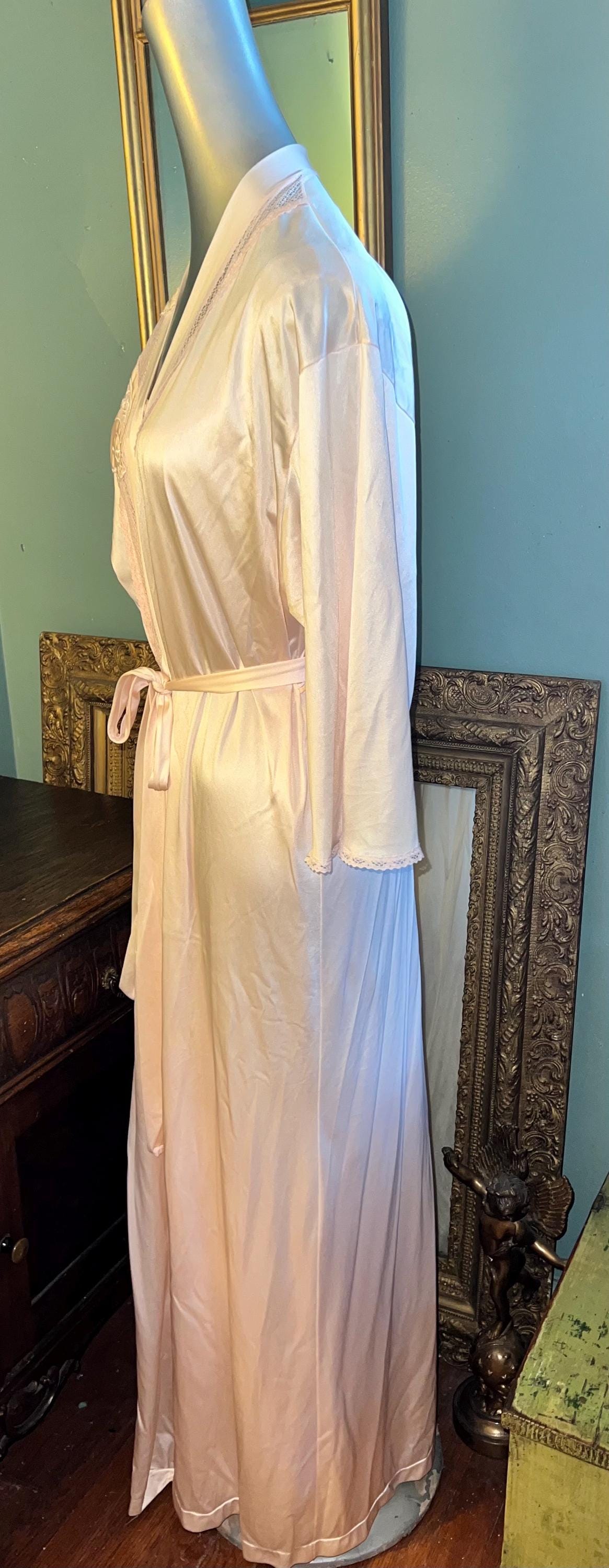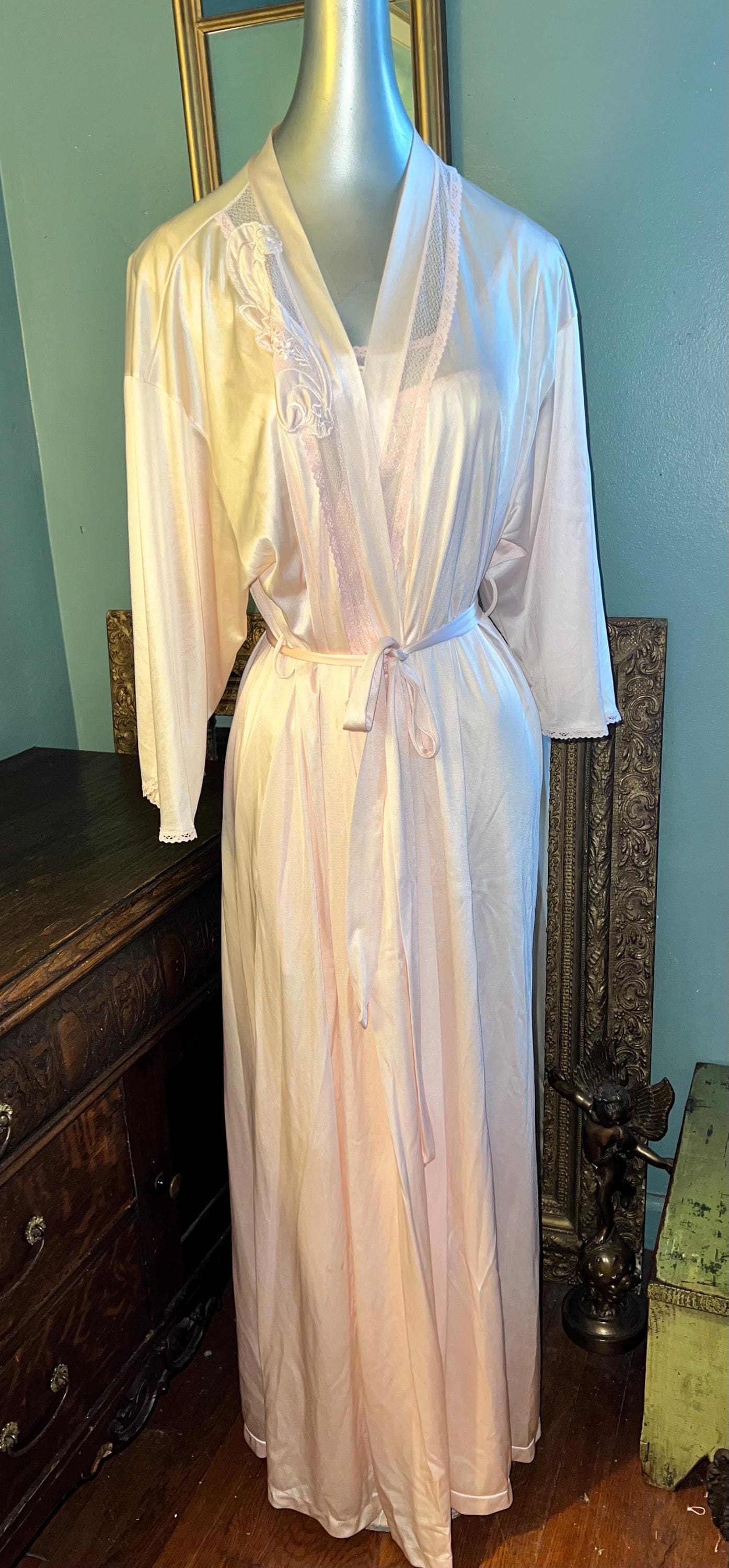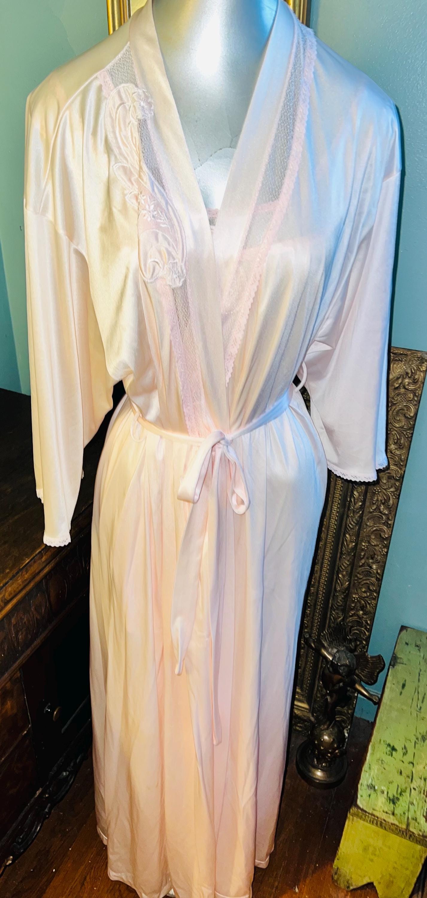 This is a really pretty 1970’s nylon Vanity Fair peignoir set. It’s a long pale pink lace nightgown with matching robe/dressing gown. It is a really pretty set and in good vintage condition.