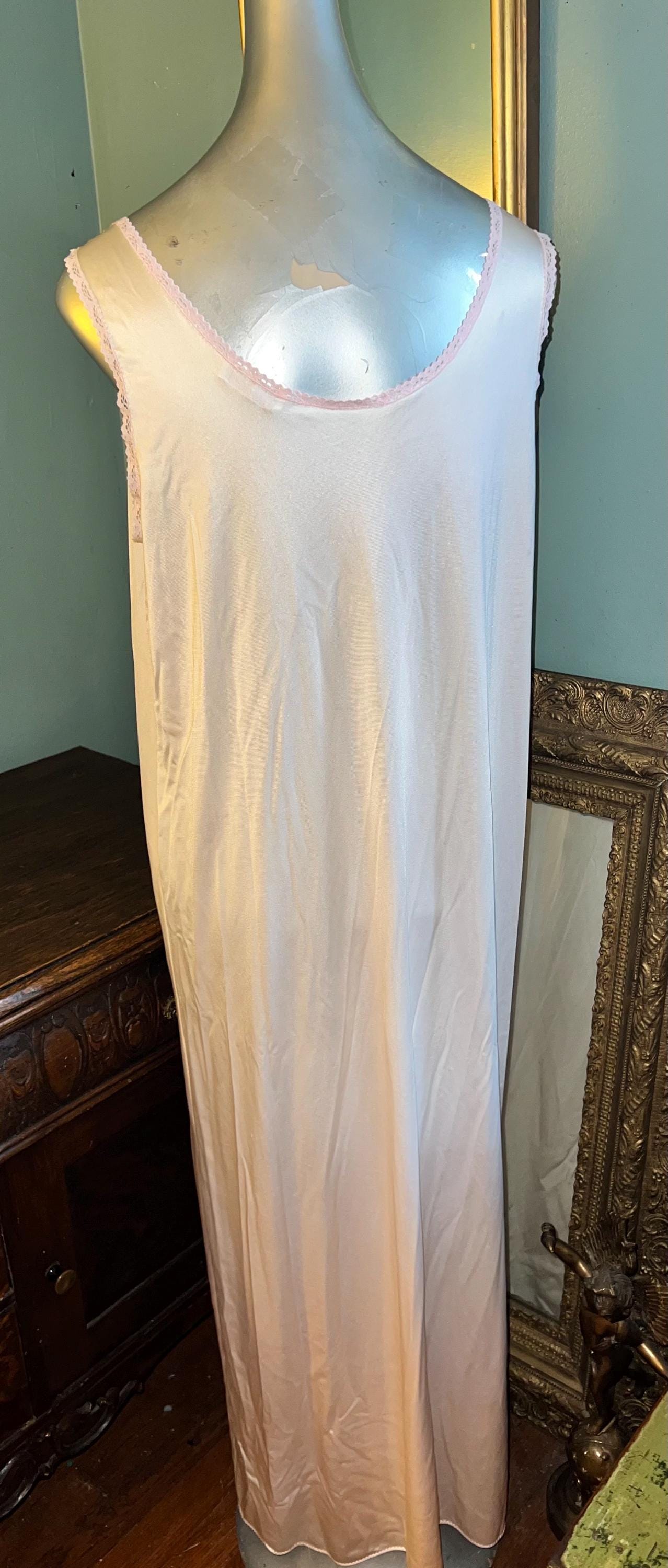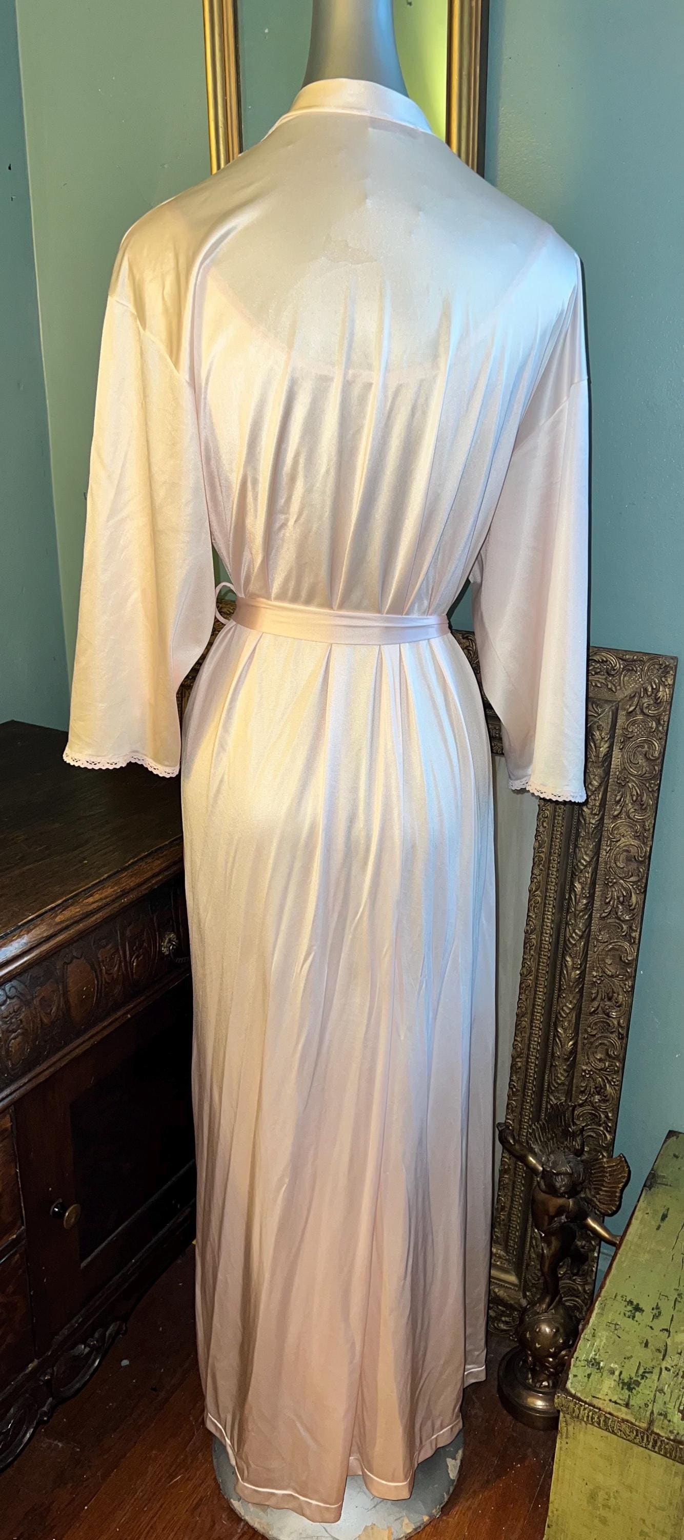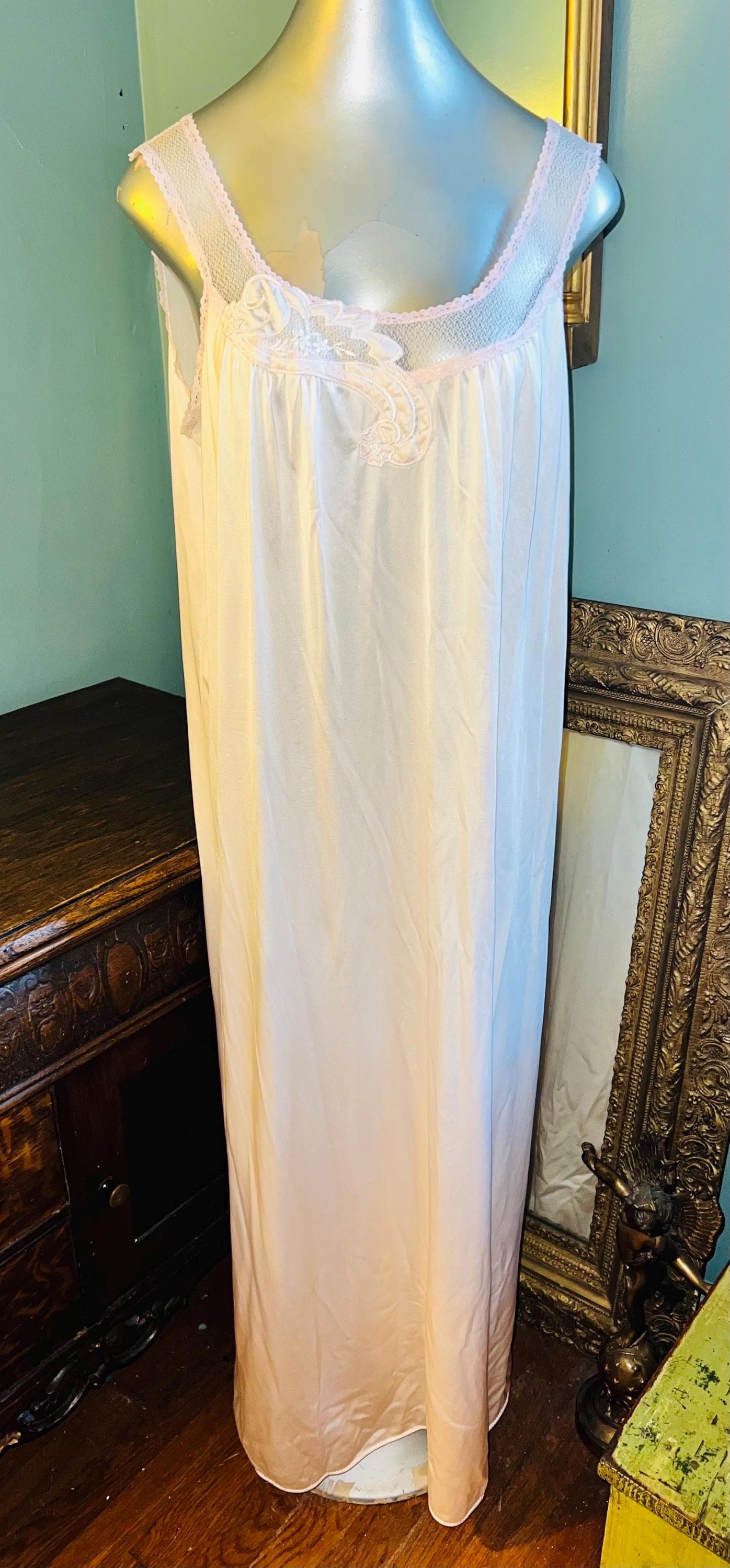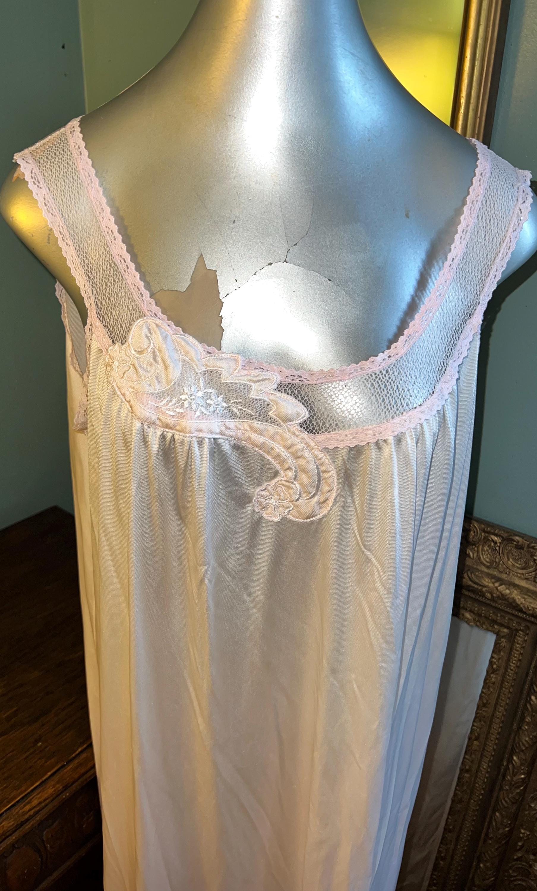 This is a really pretty 1970’s nylon Vanity Fair peignoir set. It’s a long pale pink lace nightgown with matching robe/dressing gown. It is a really pretty set and in good vintage condition.