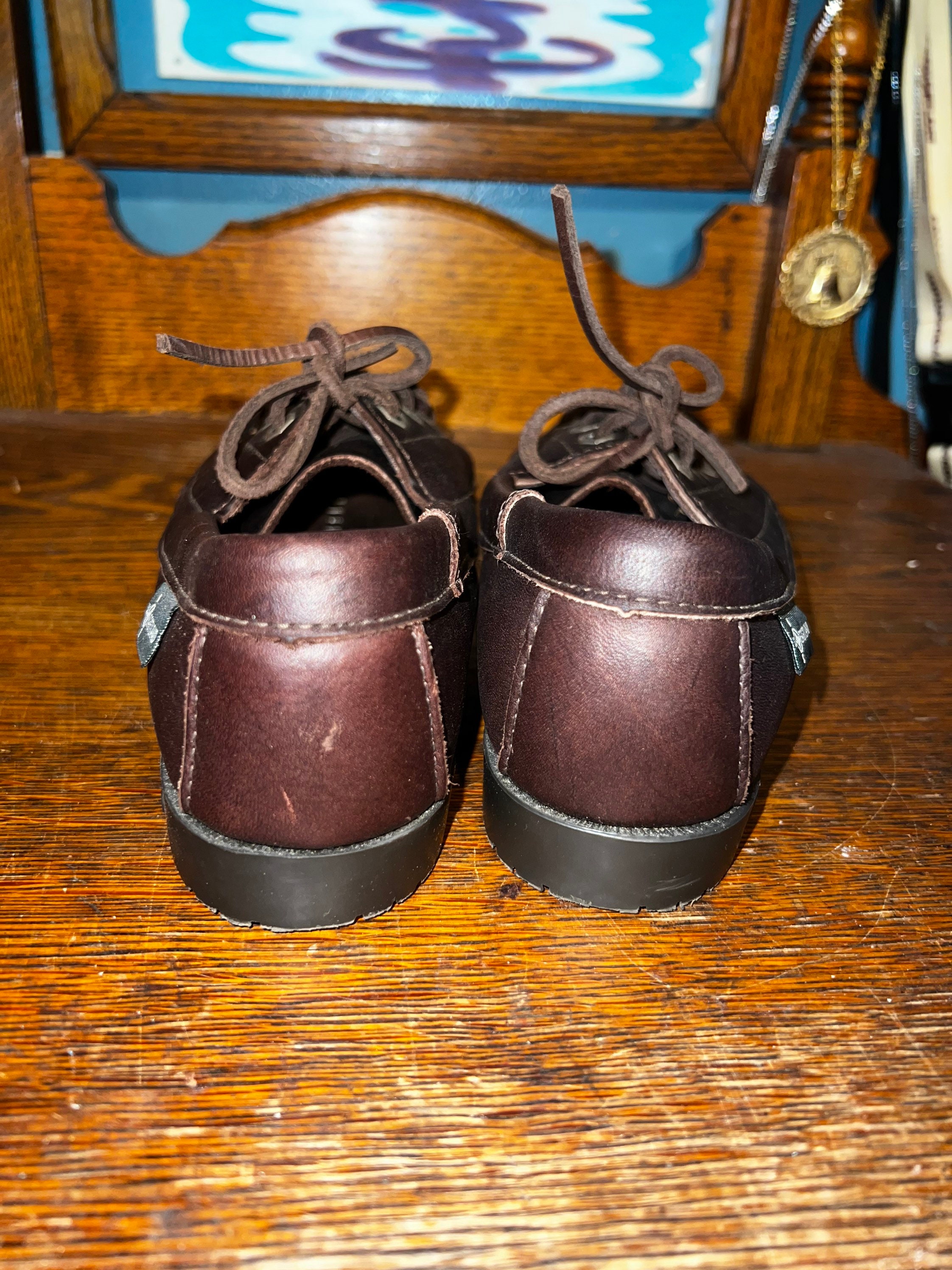 These are nice Eastlands! They are avery dark brown leather and in basically new vintage condition, I don’t think they’ve ever been worn.