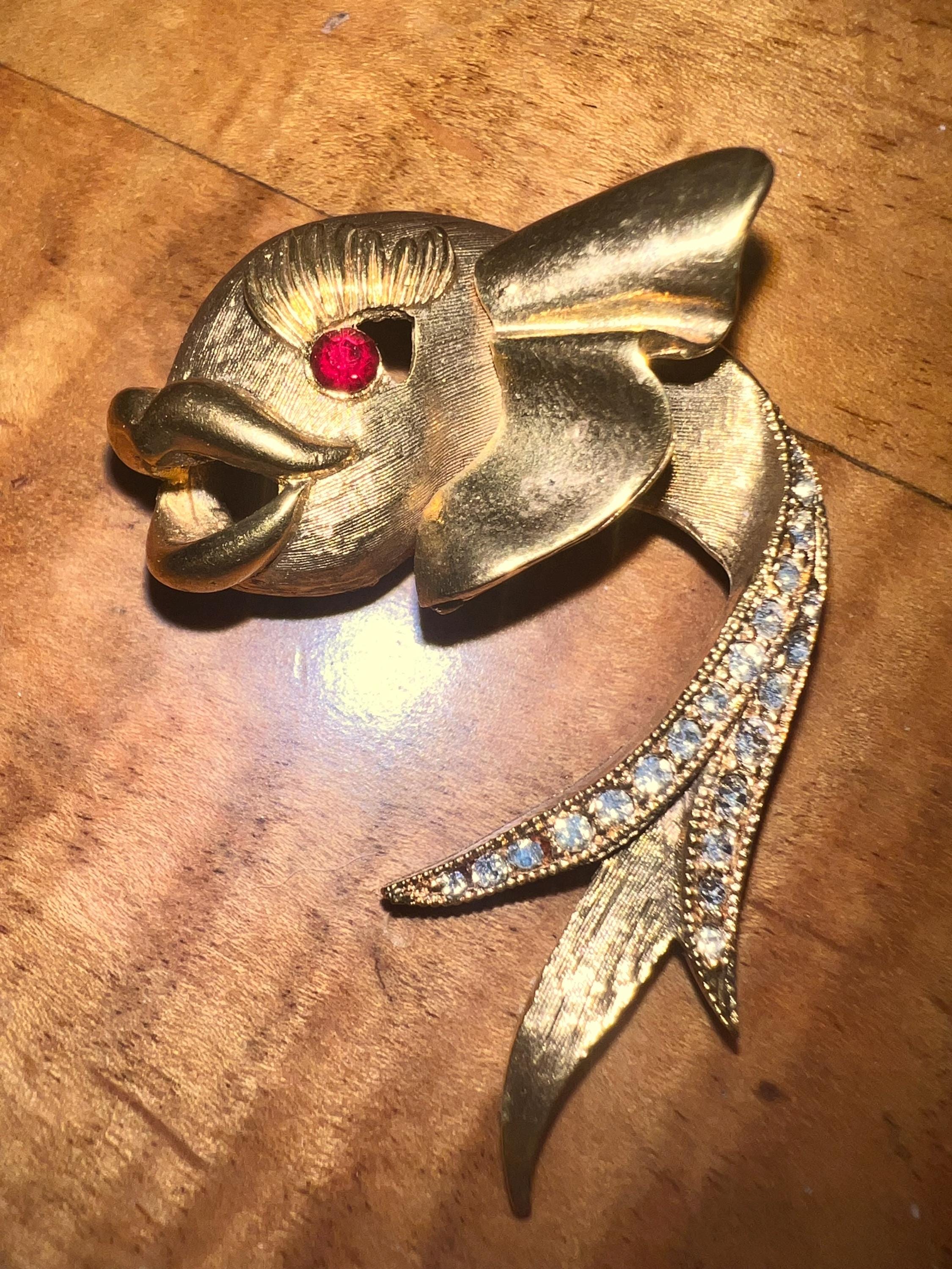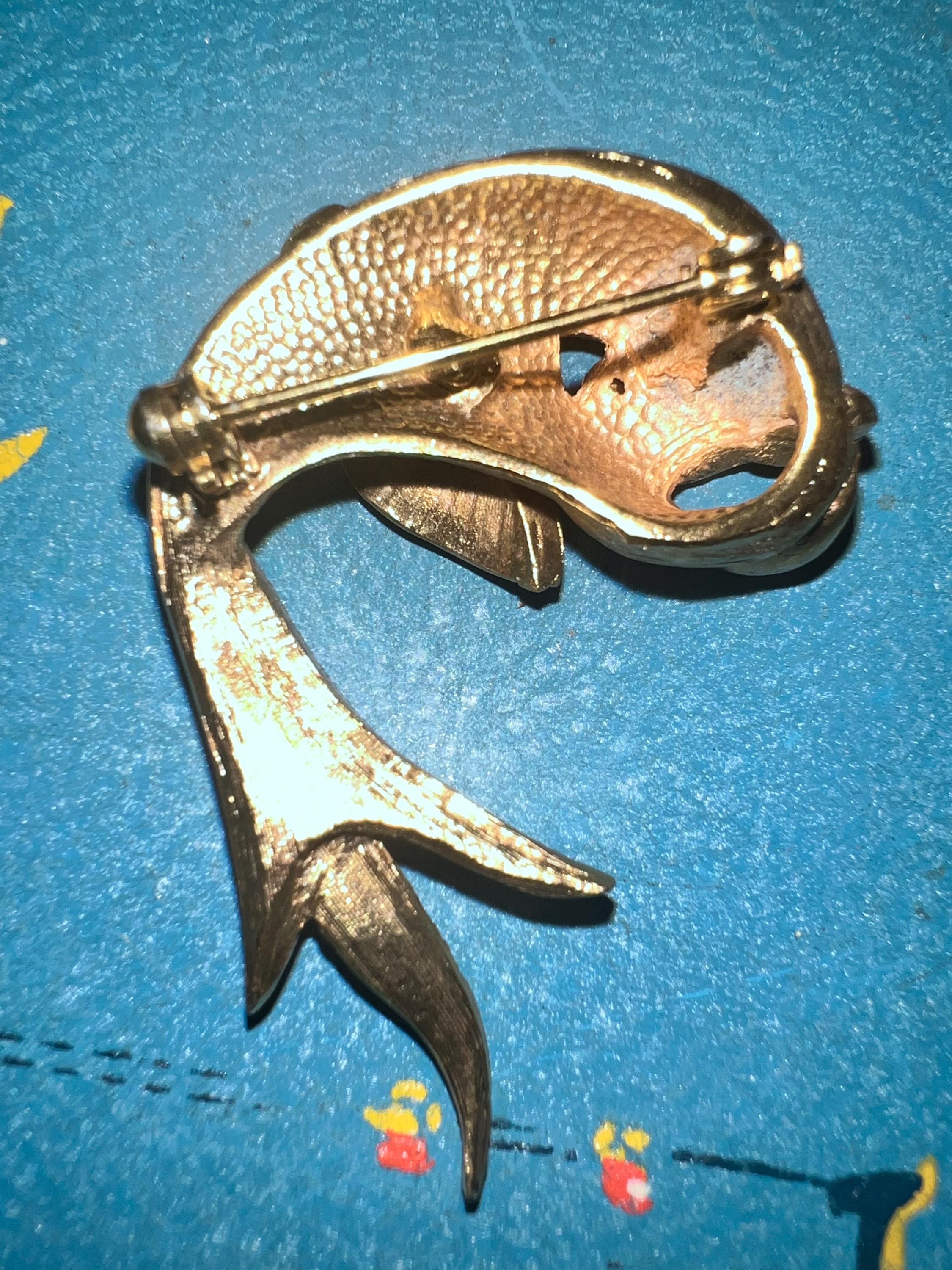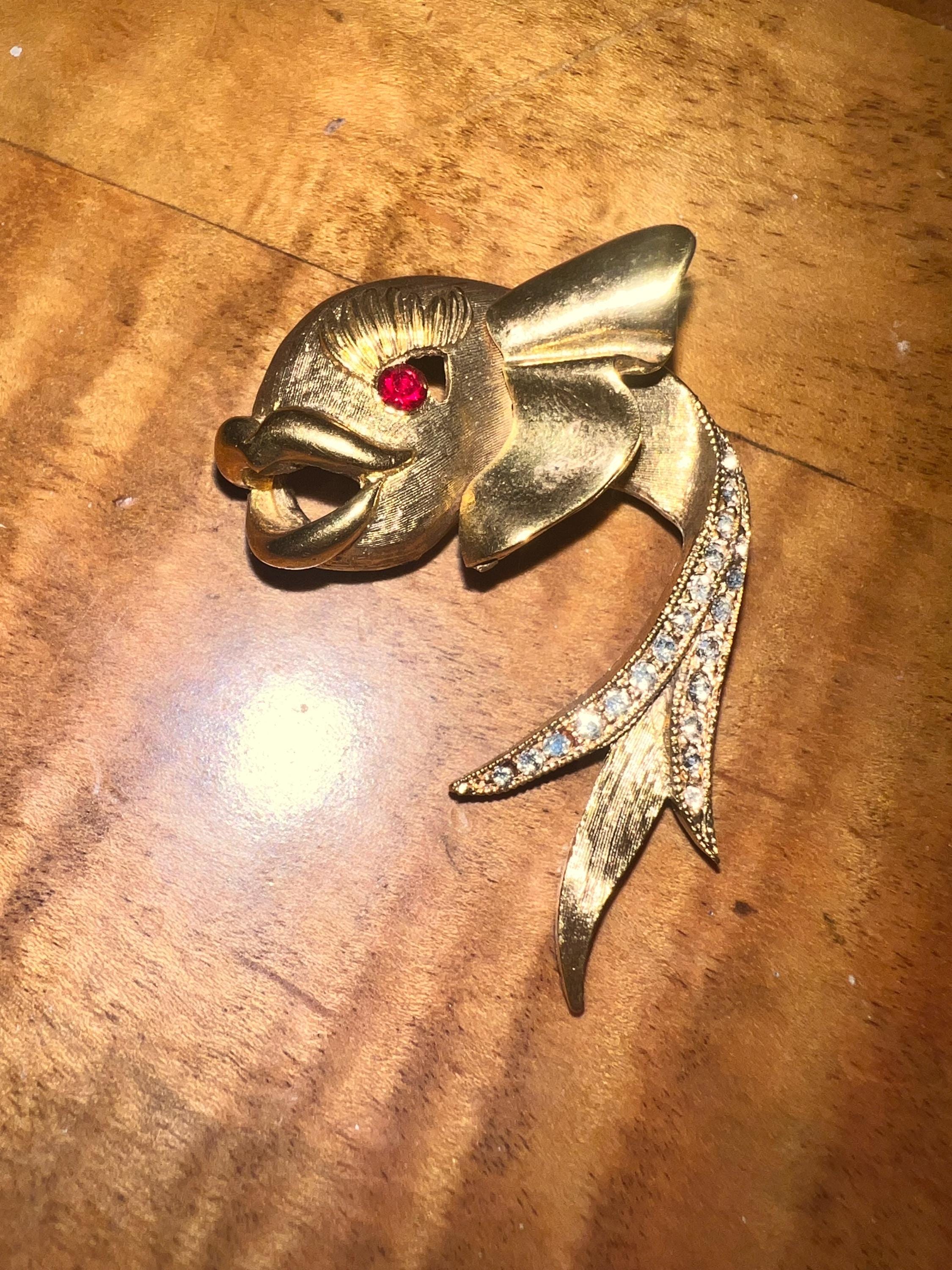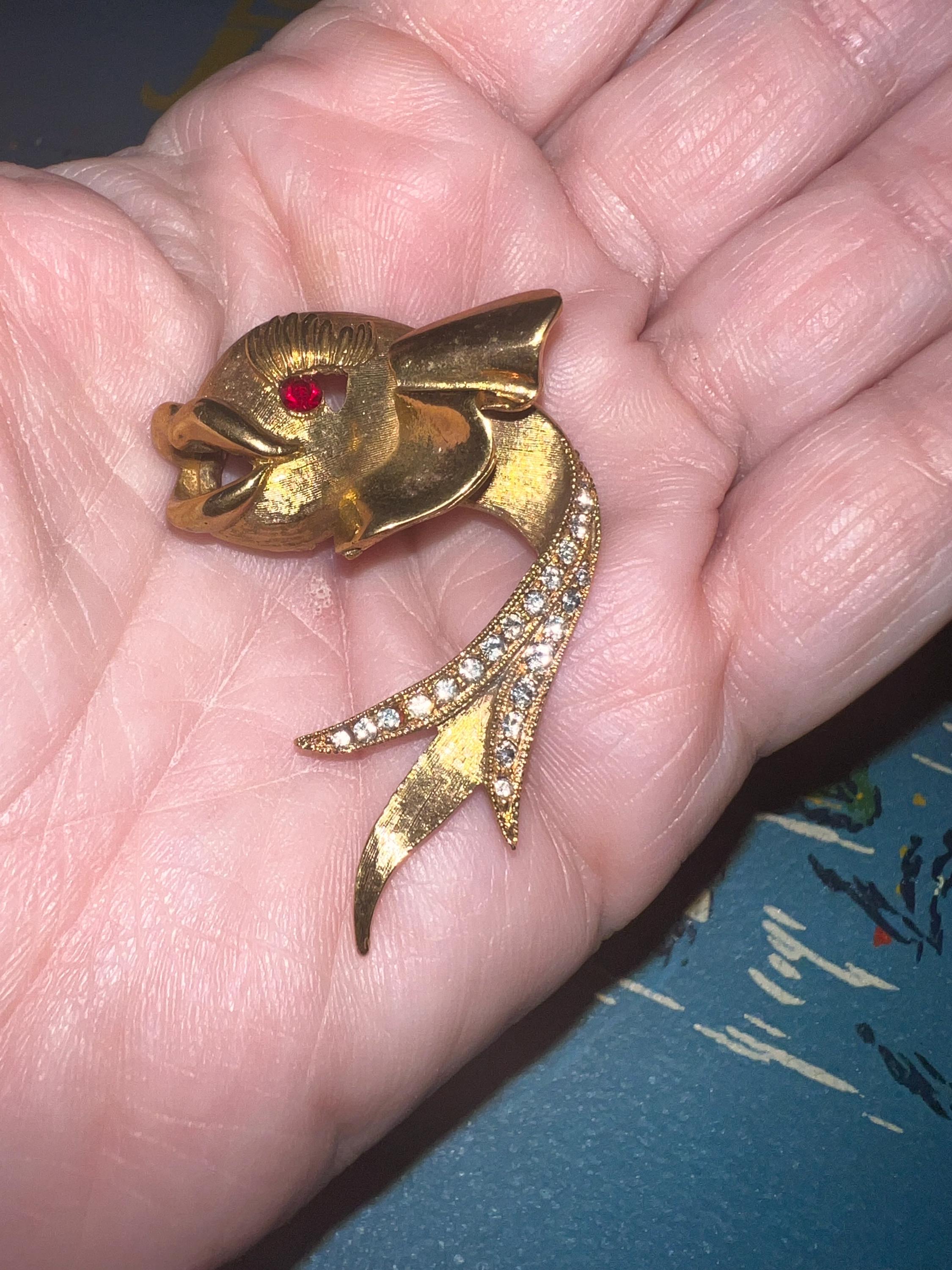 This is a really pretty unbranded gold fish brooch. He has a red ruby like eye and then rhinestones on the tail. it’s very nice and in good vintage condition.