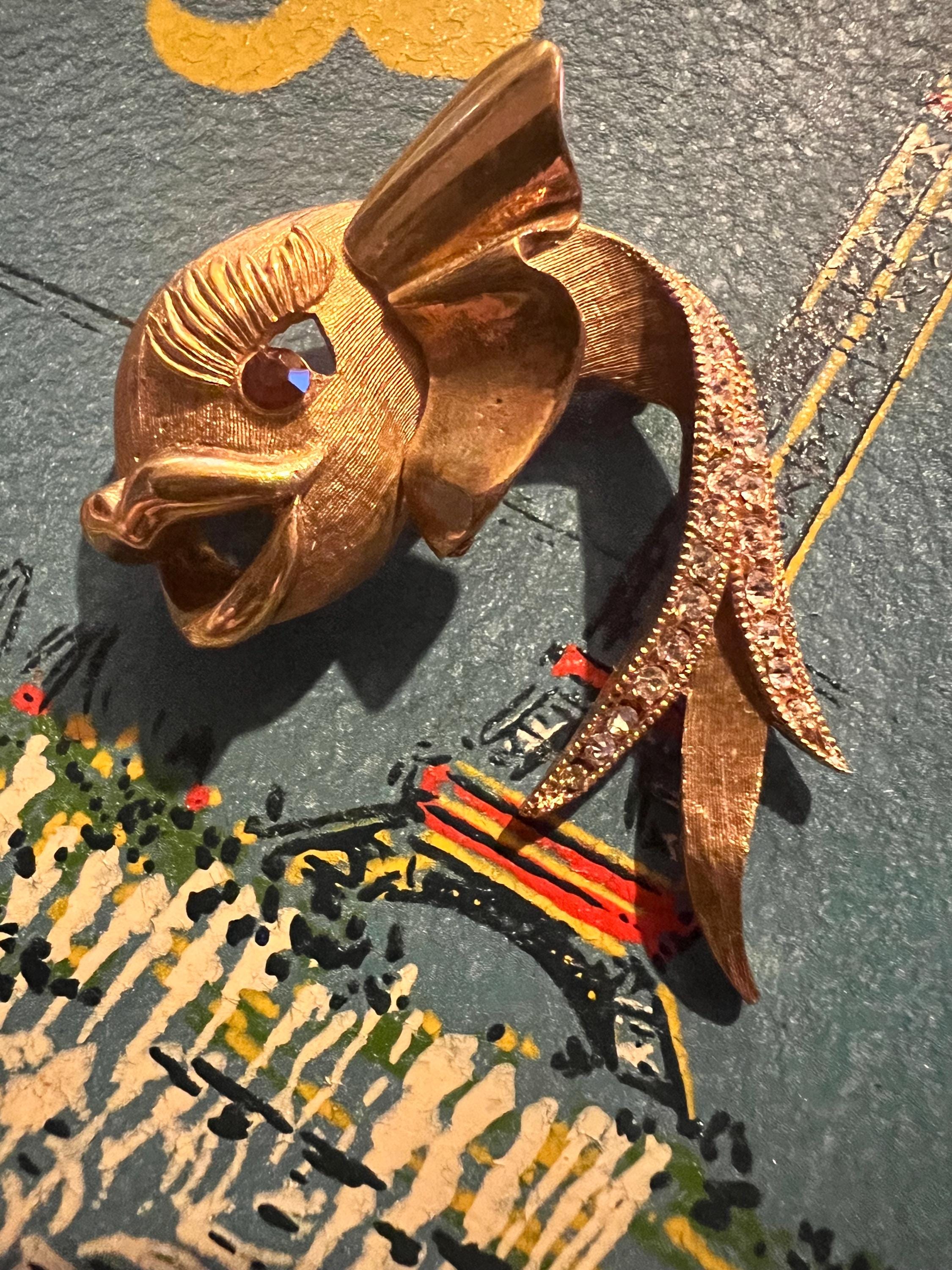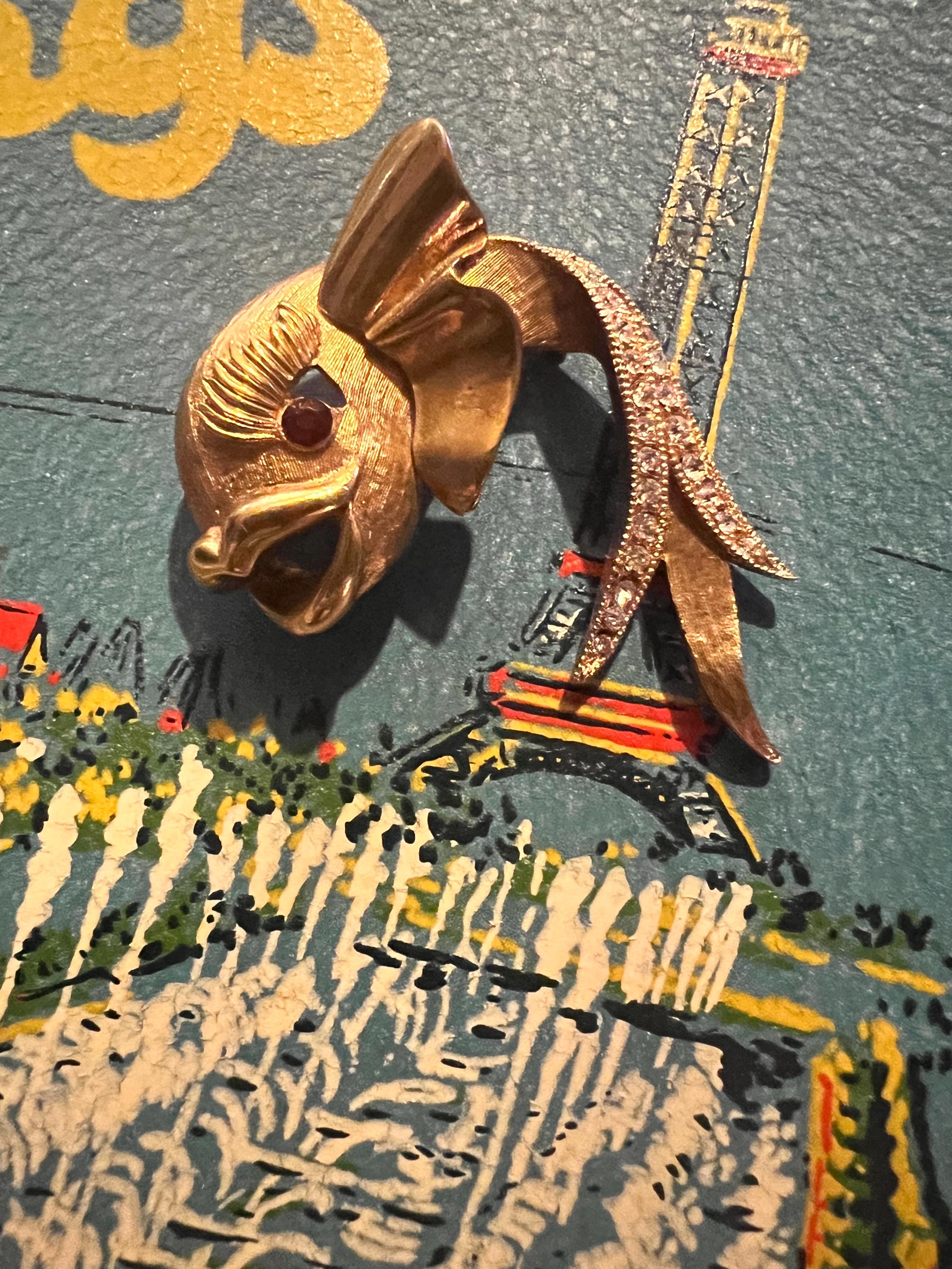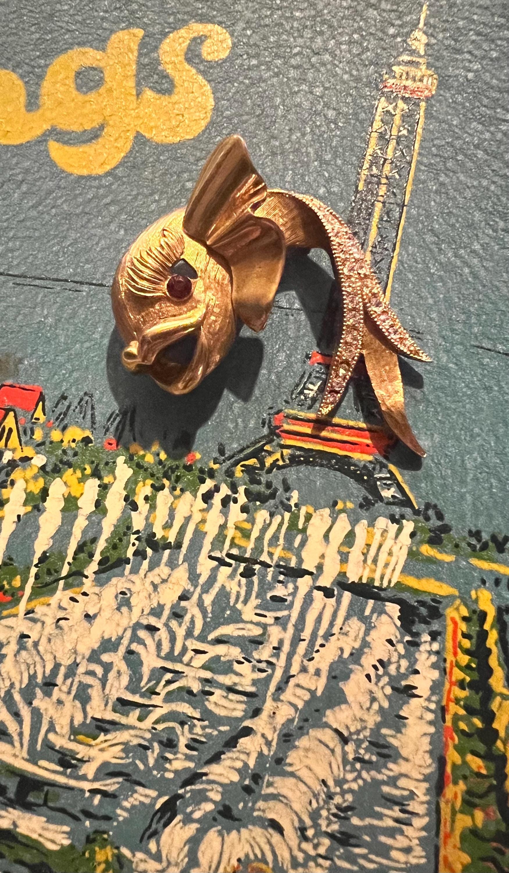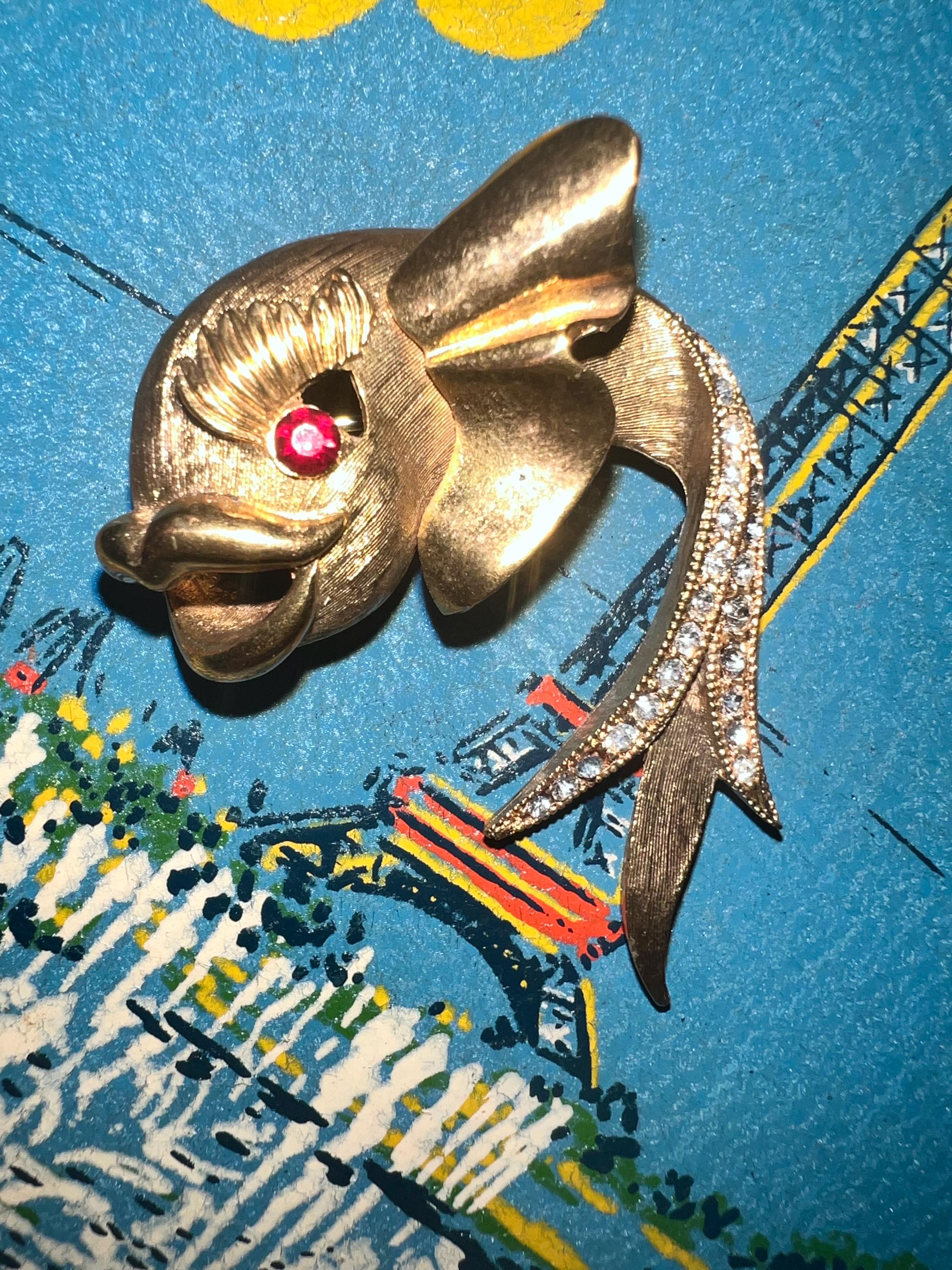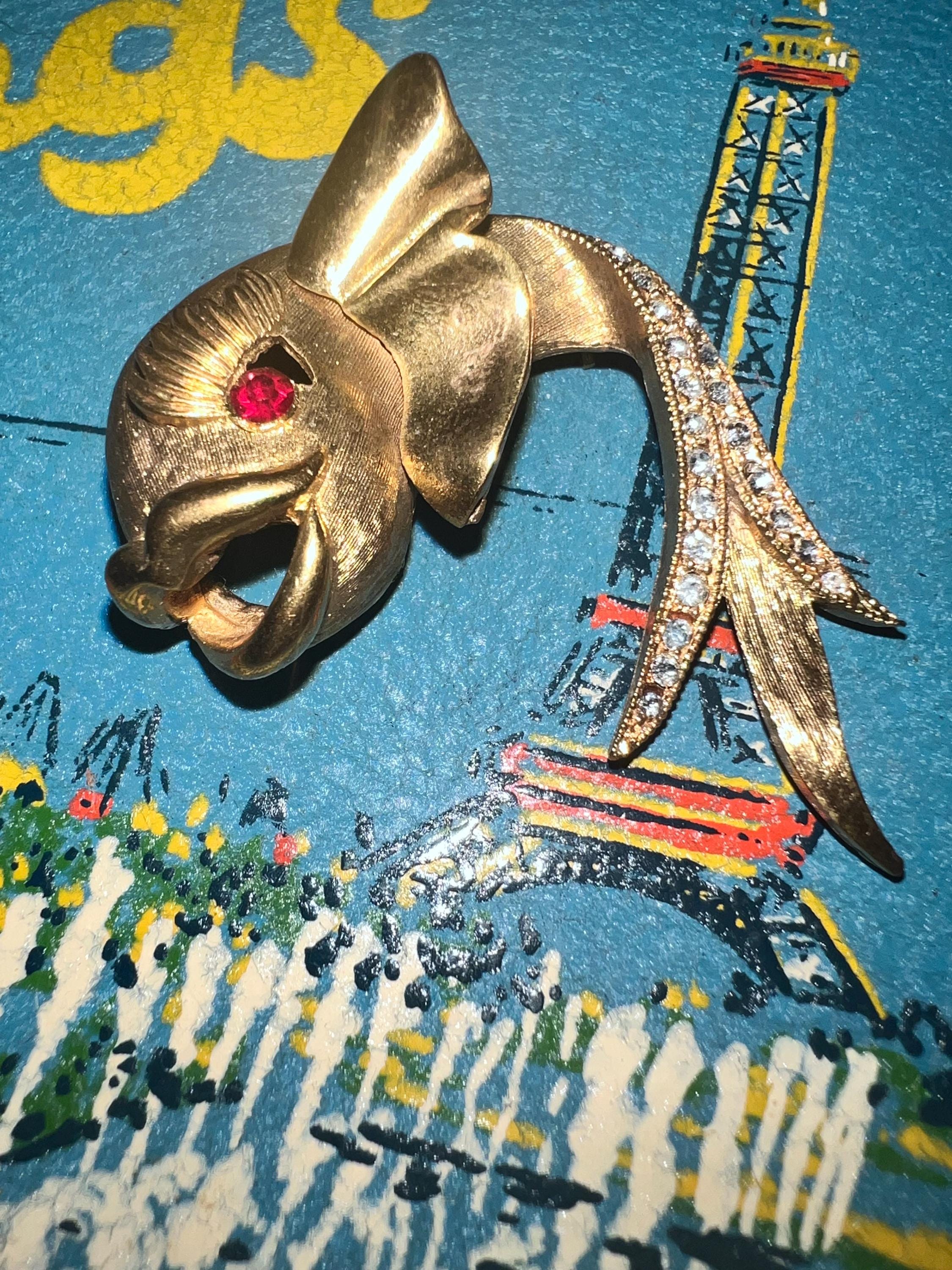 This is a really pretty unbranded gold fish brooch. He has a red ruby like eye and then rhinestones on the tail. it’s very nice and in good vintage condition.