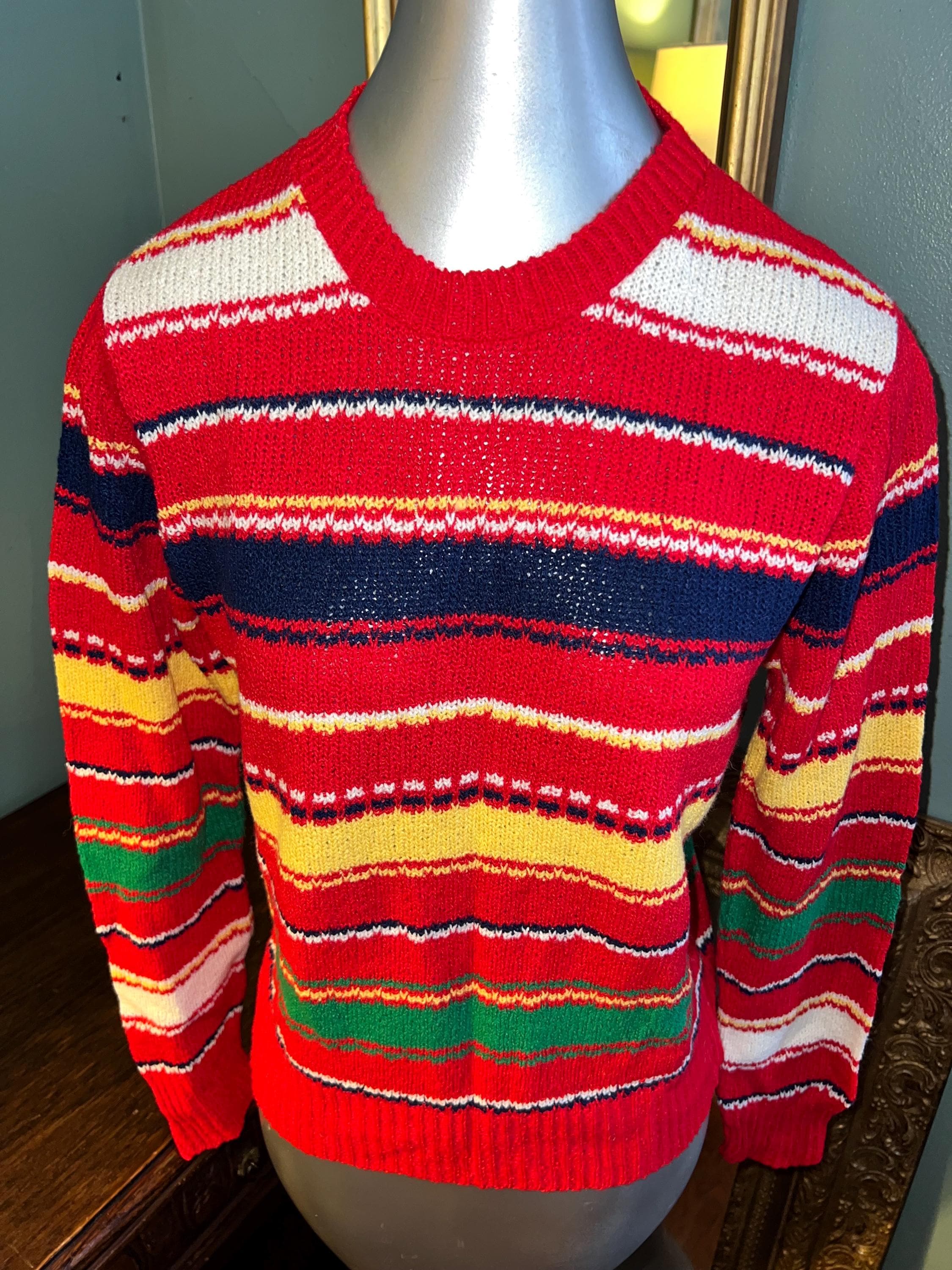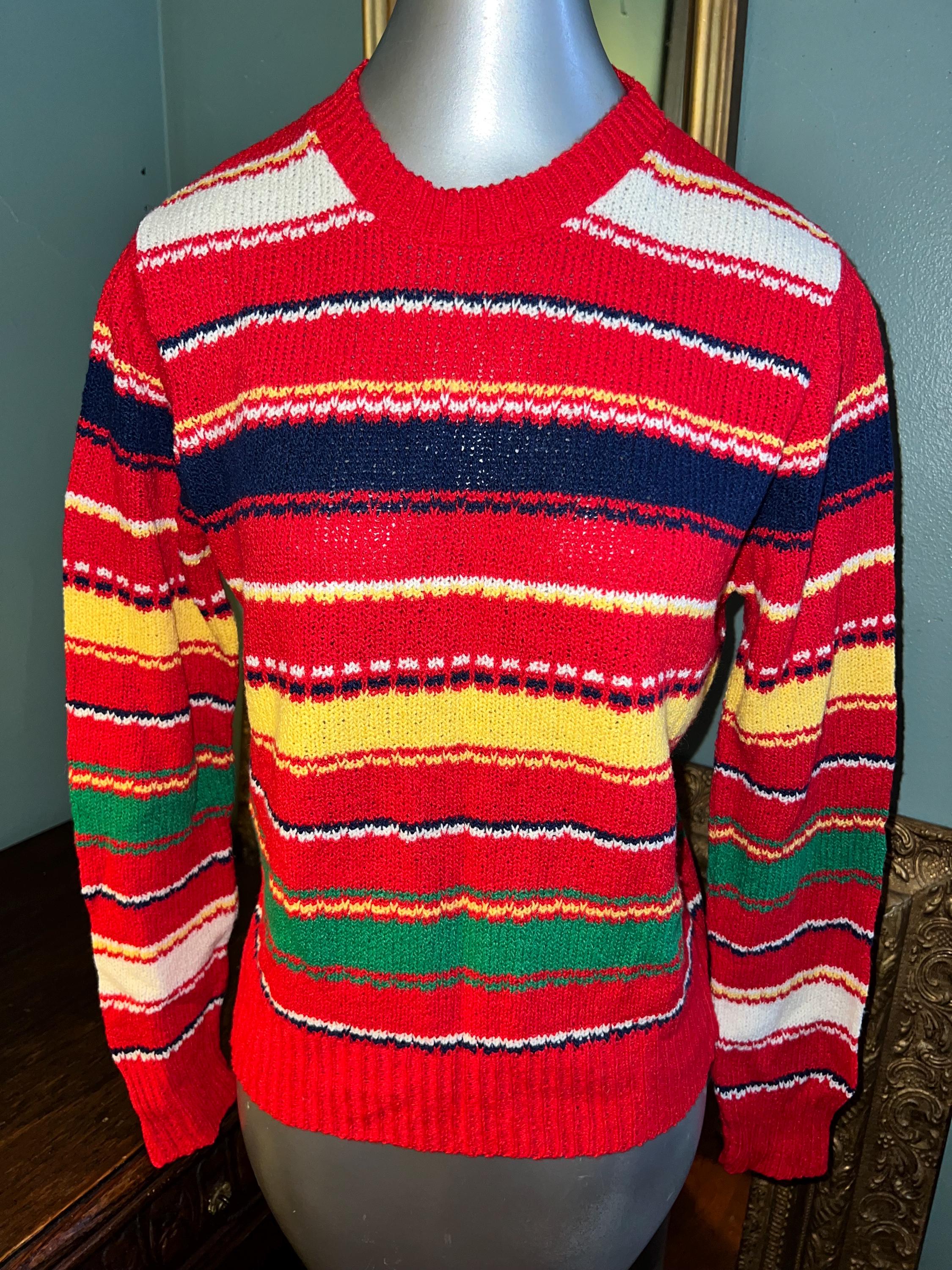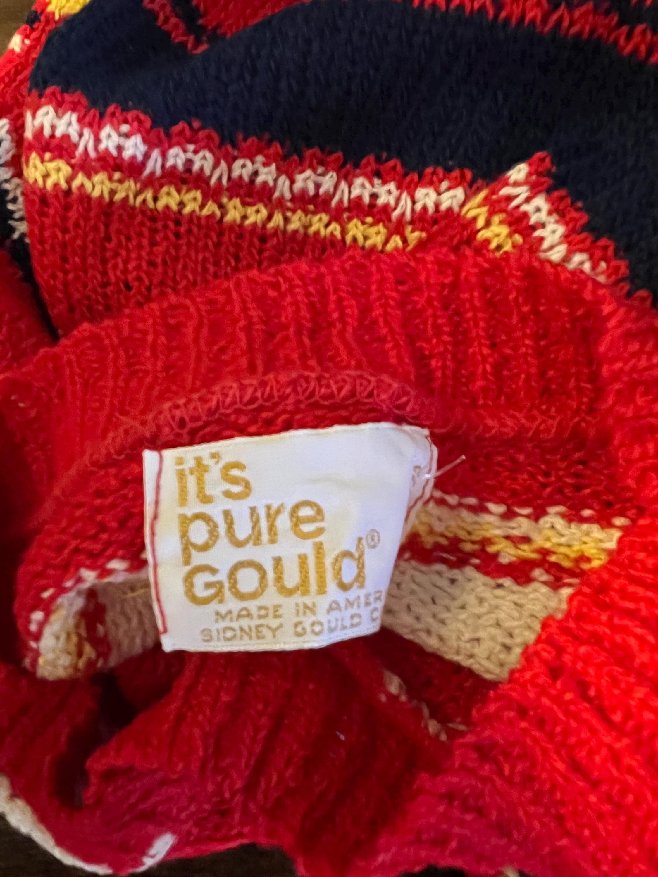 This is an excellent primary colors “It’s Pure Gould” sweater. It’s super thin so if you don’t like bulky sweaters this is perfect for you. It’s in great vintage condition.