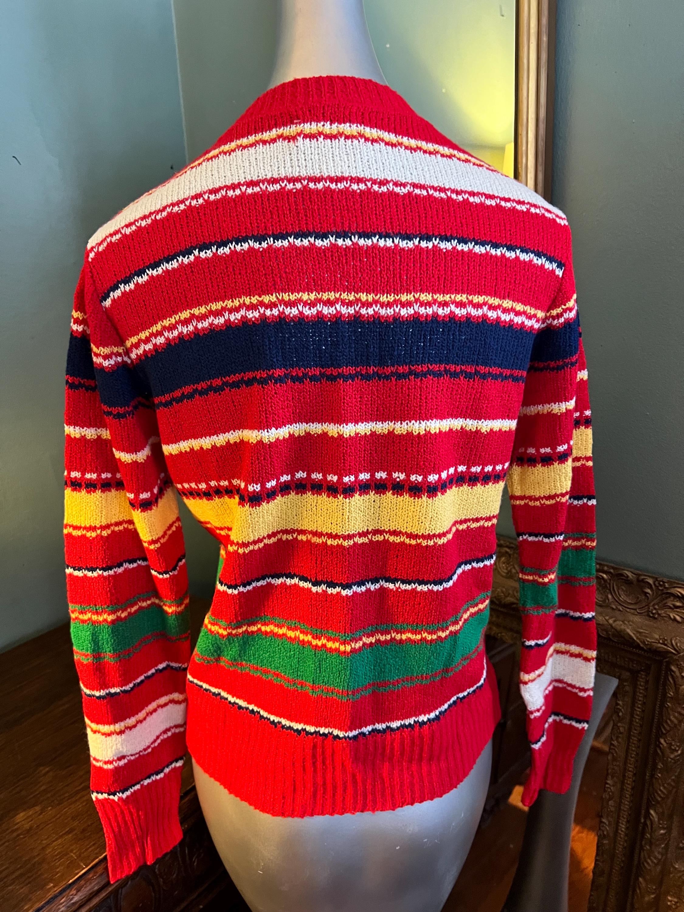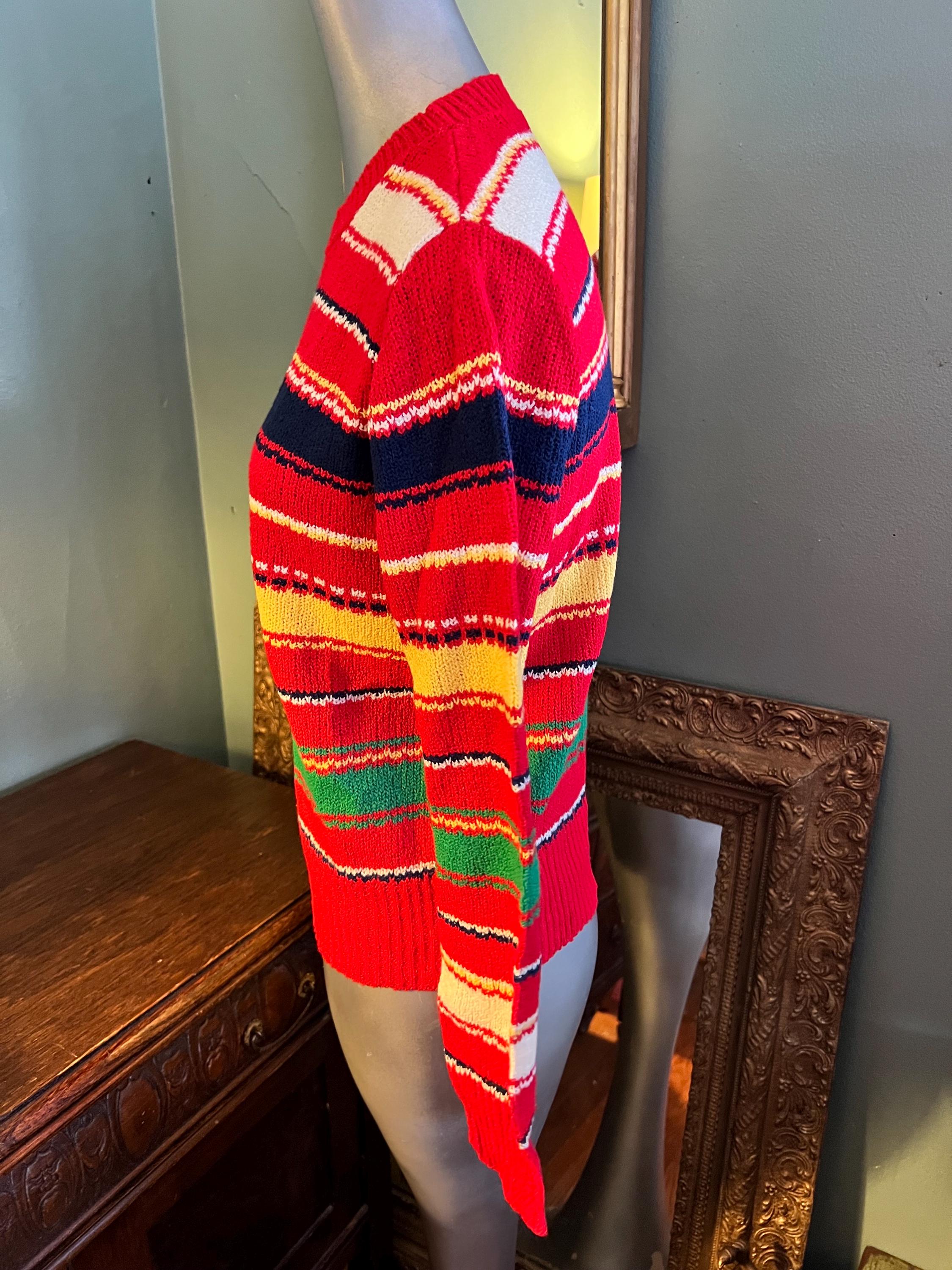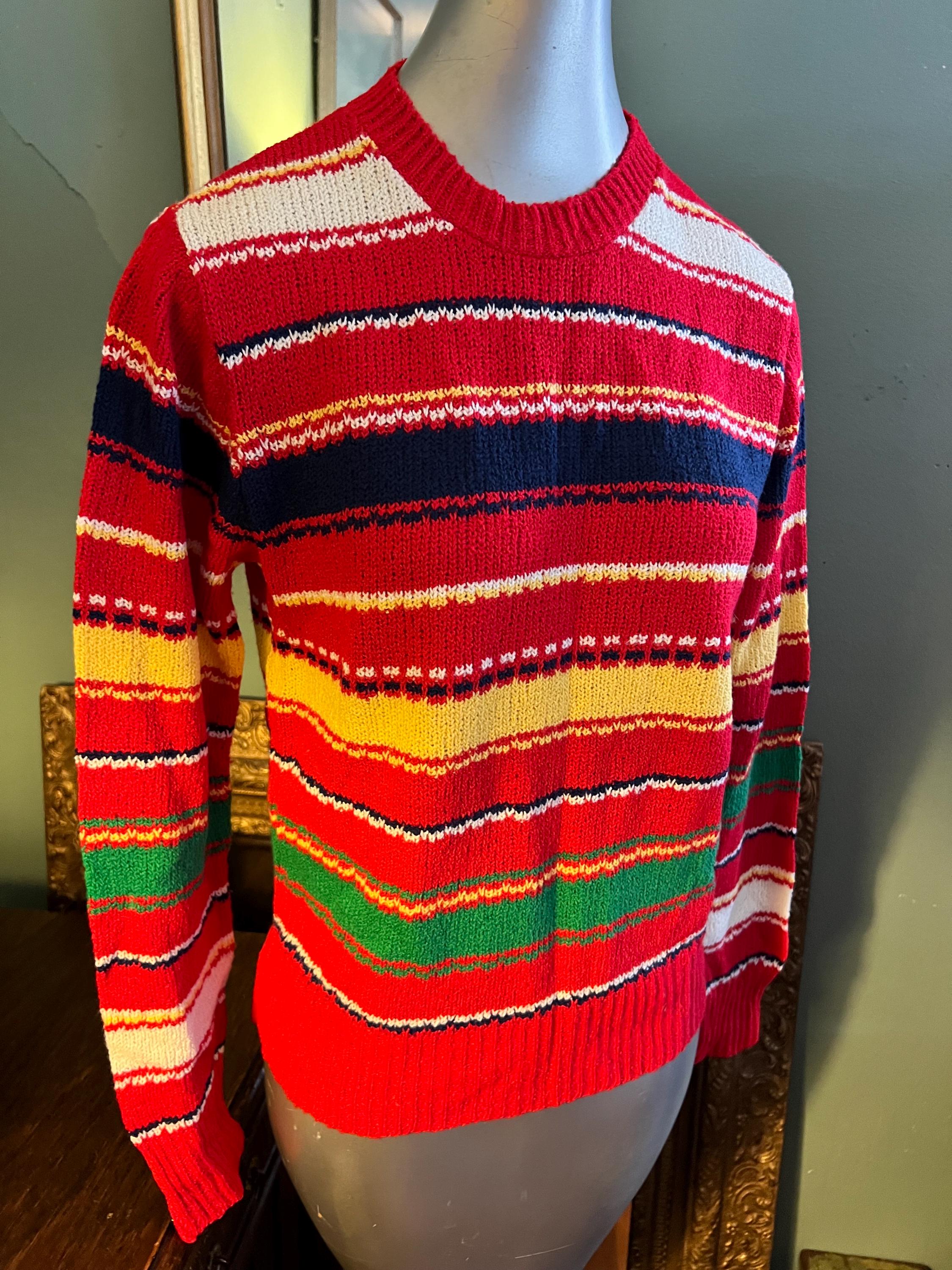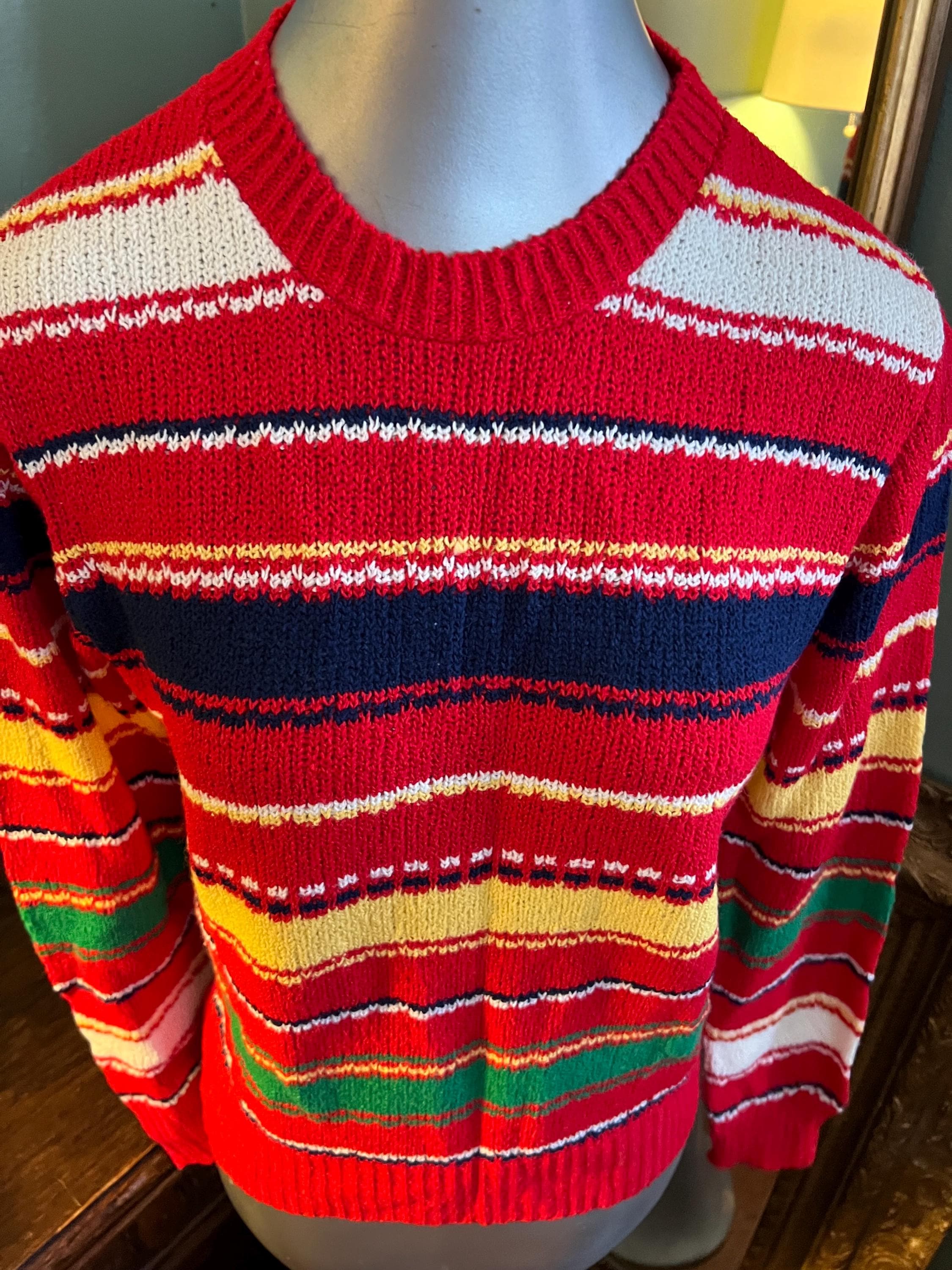 This is an excellent primary colors “It’s Pure Gould” sweater. It’s super thin so if you don’t like bulky sweaters this is perfect for you. It’s in great vintage condition.