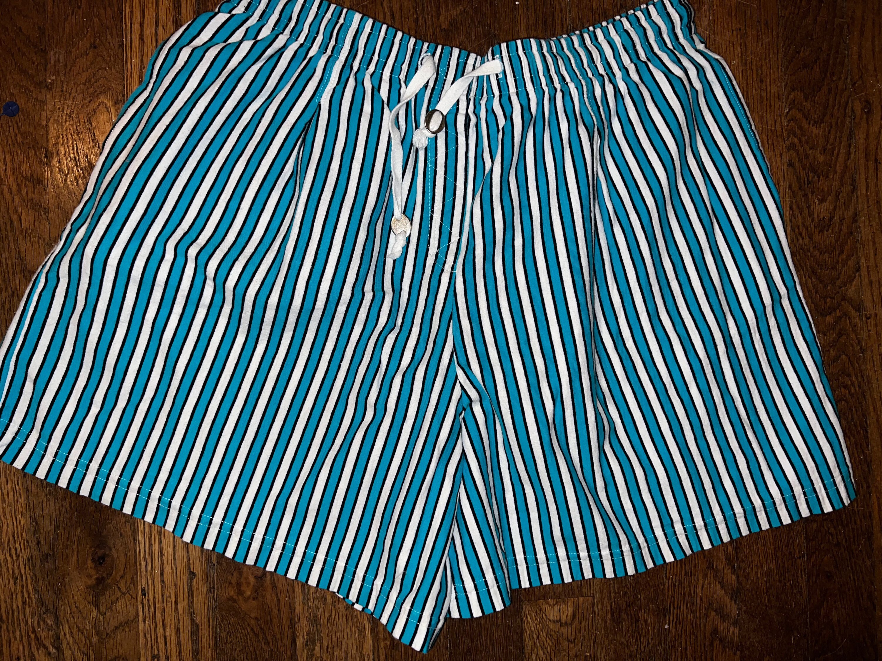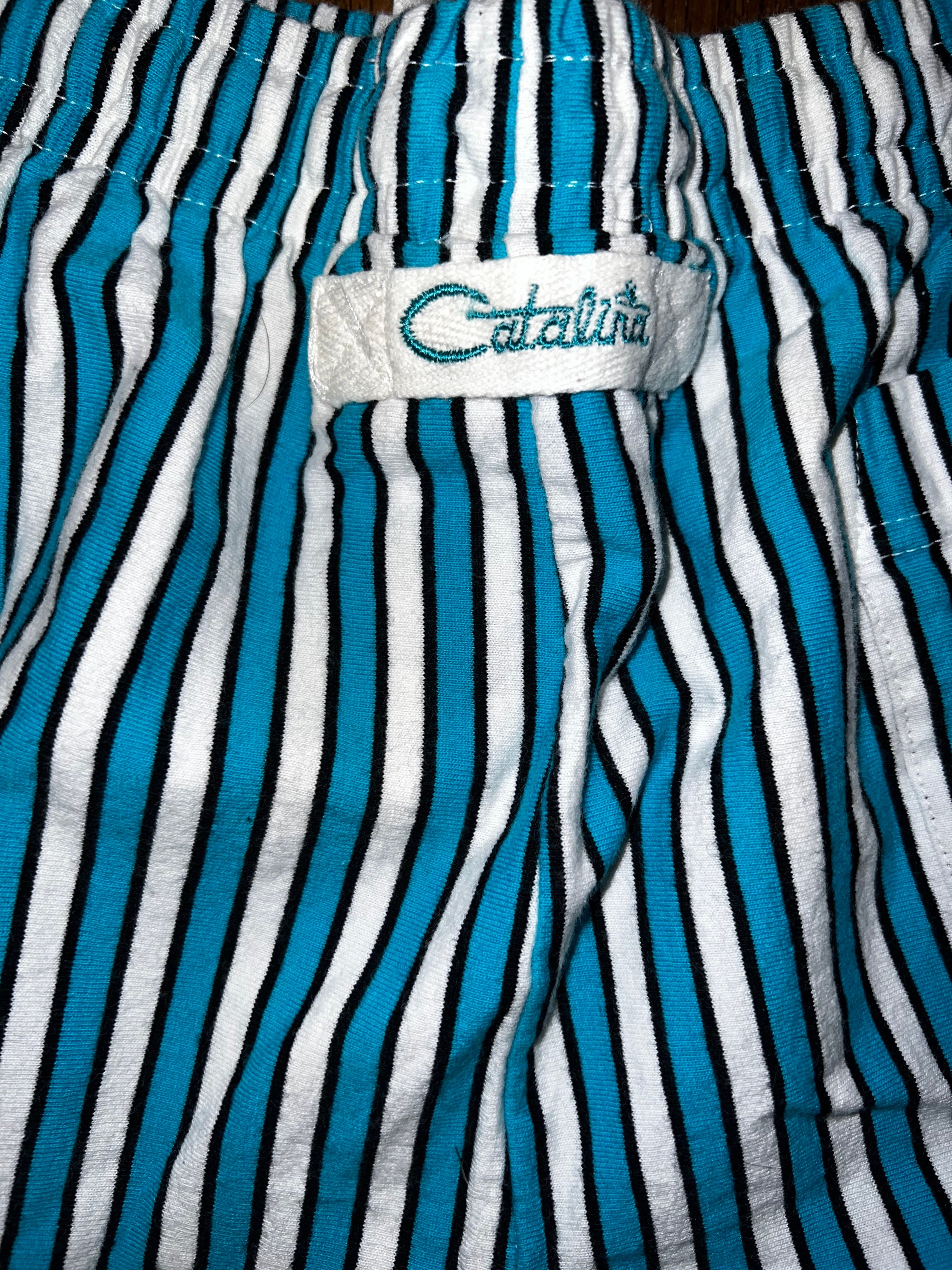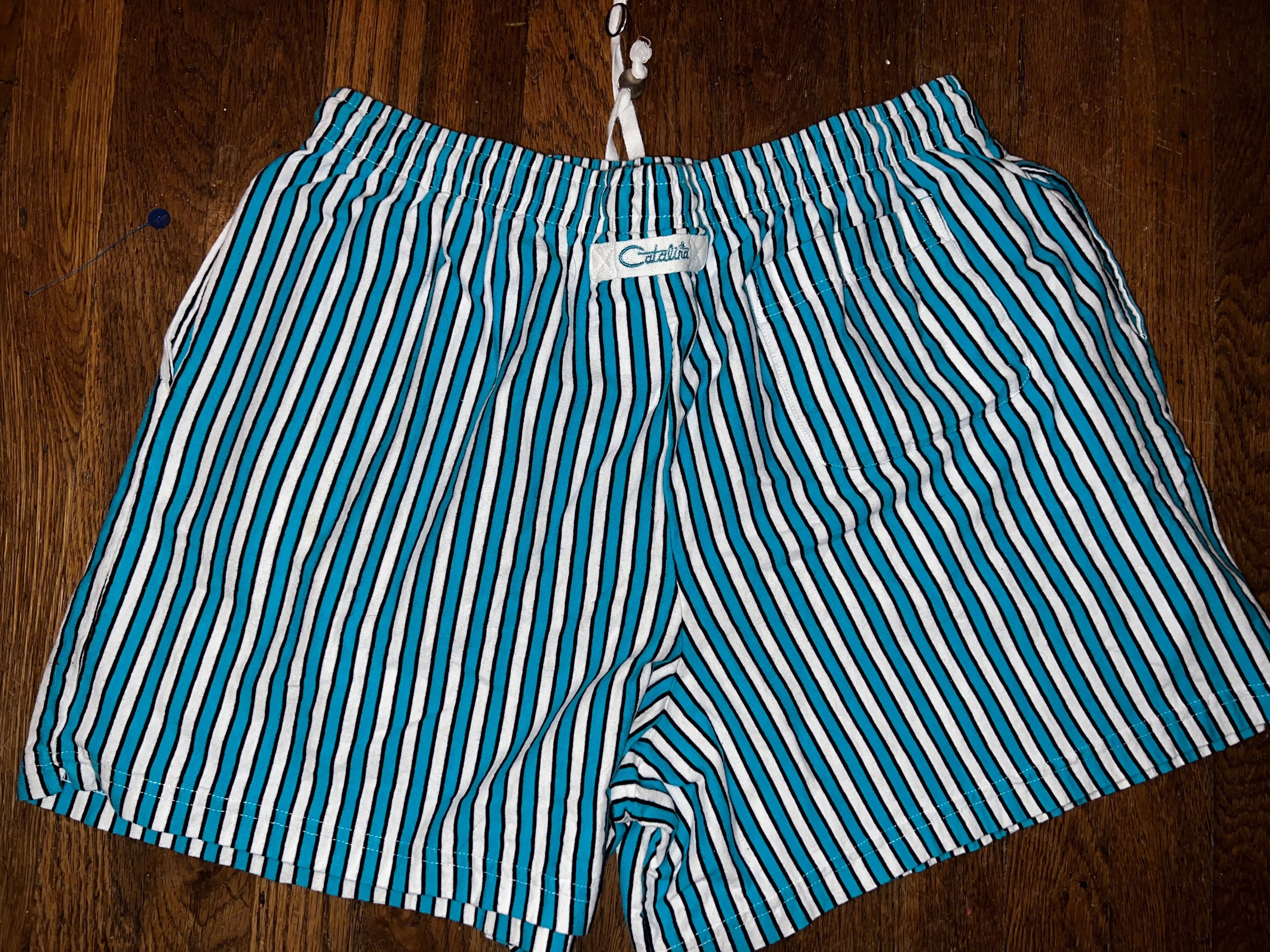 This is a cool pair of Catalina swim trunks/shorts. They have pockets and a drawstring waist and one back pocket. They are NOT lined and they have a little “Catalina” tag on the back. They are in good vintage condition.