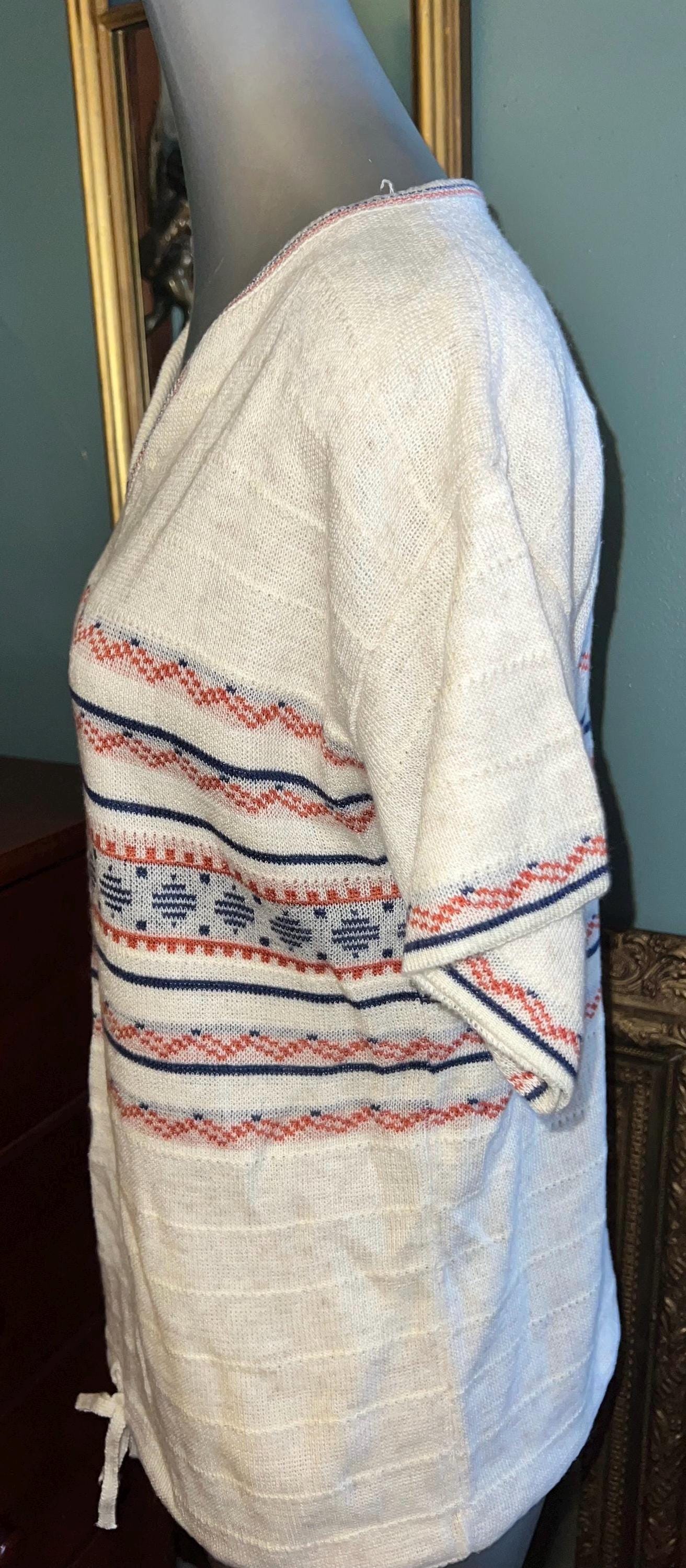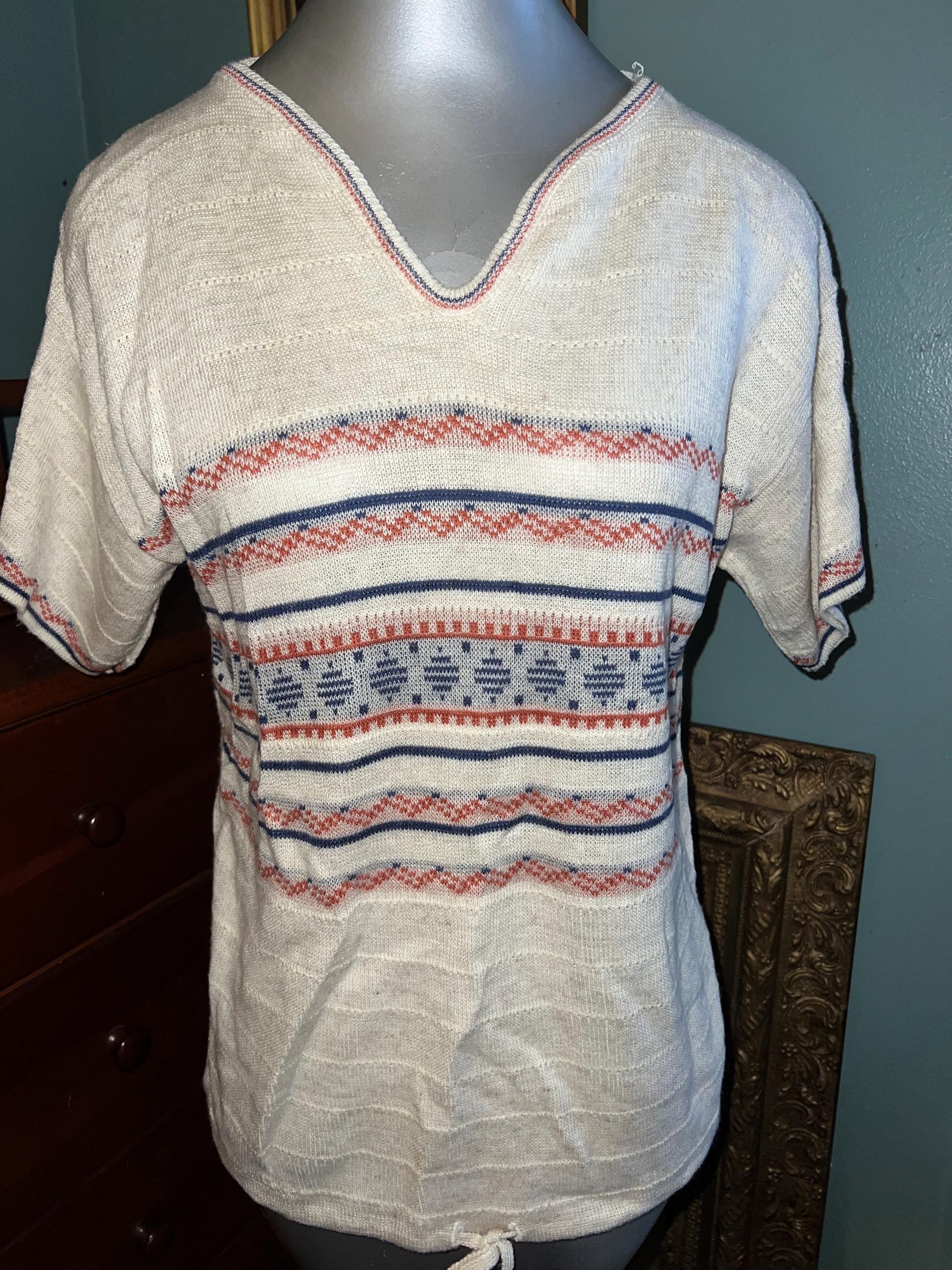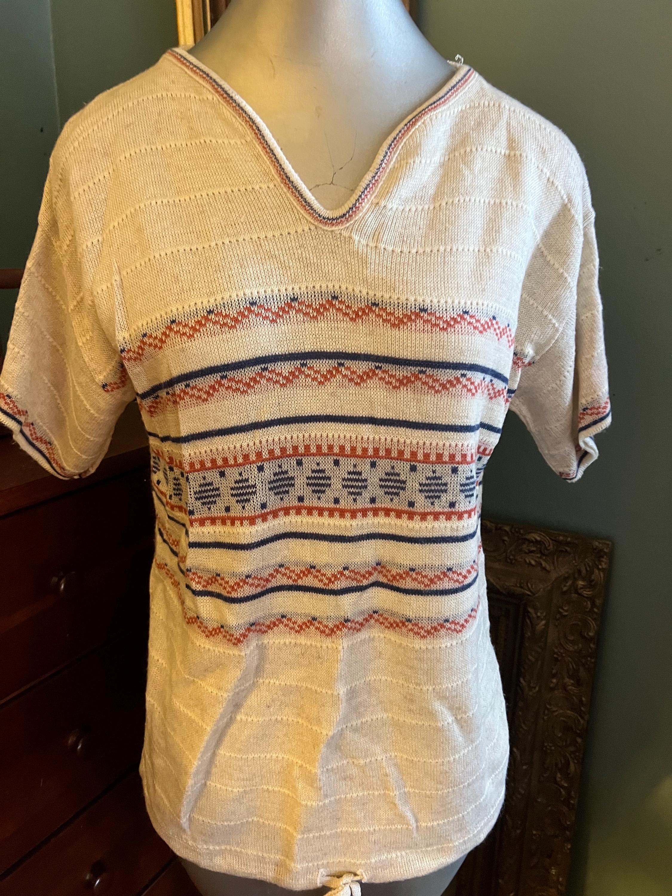 This sweater is too awesome! It has a great design and a drawstring bottom. It is in good vintage condition.
