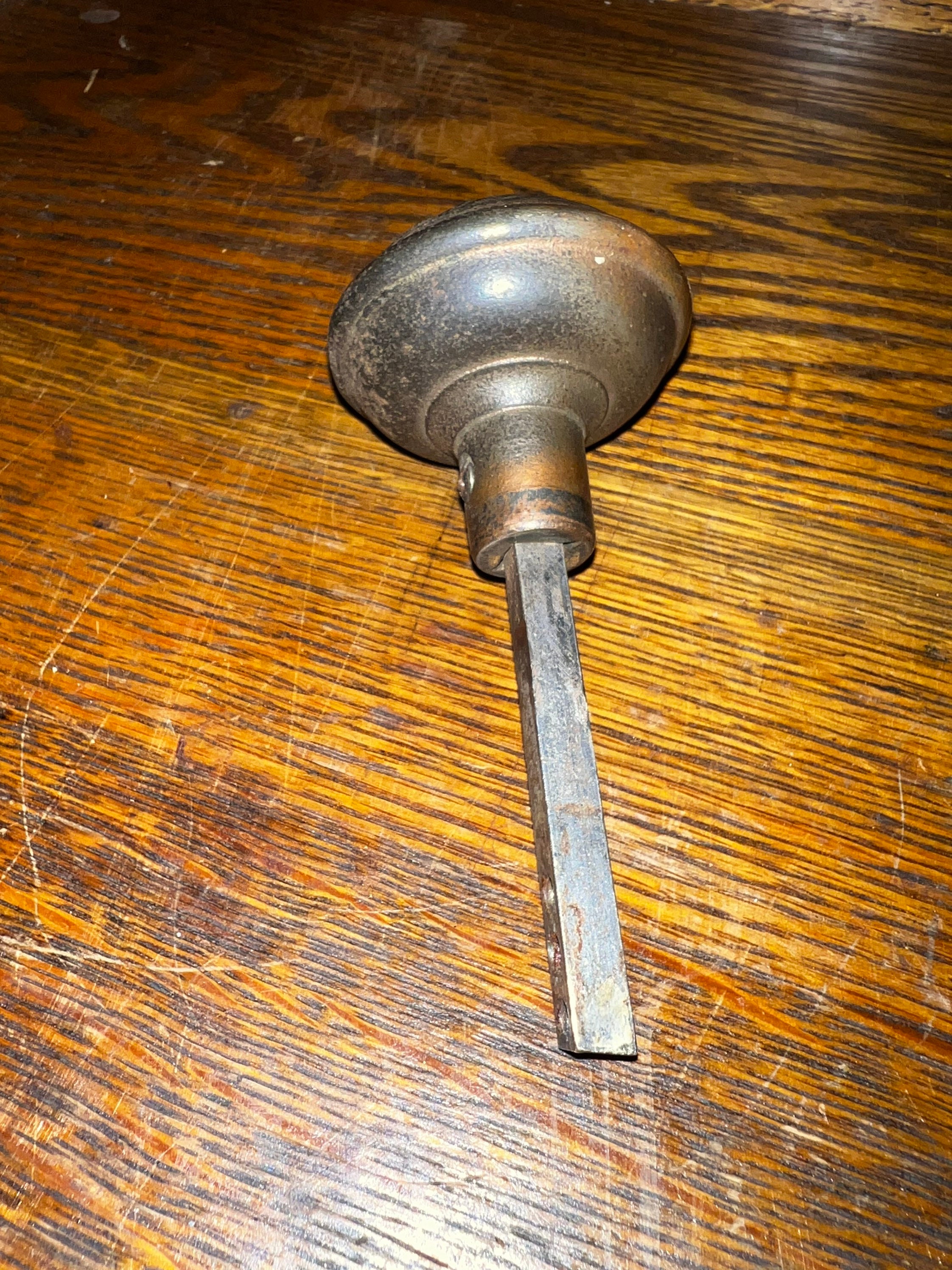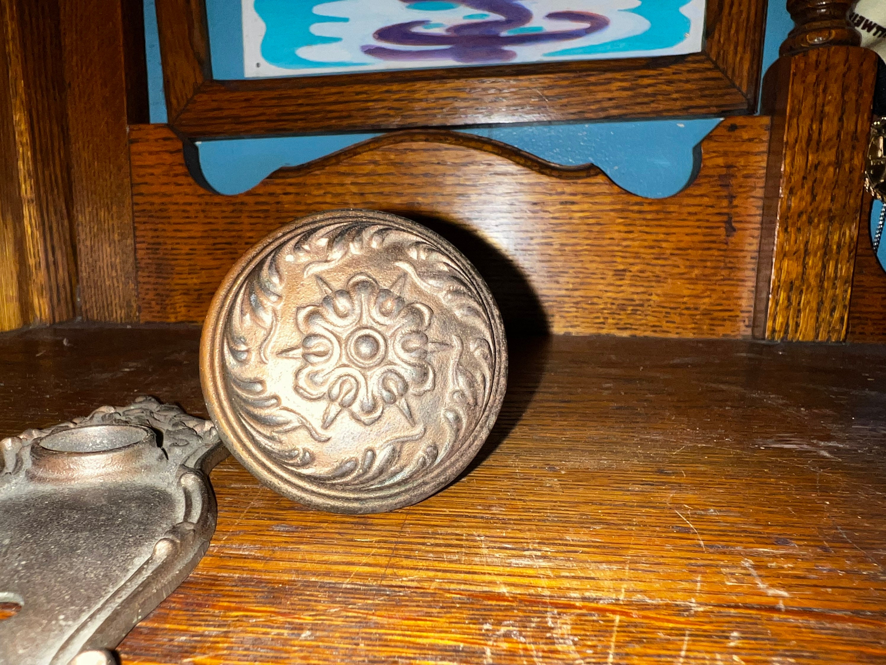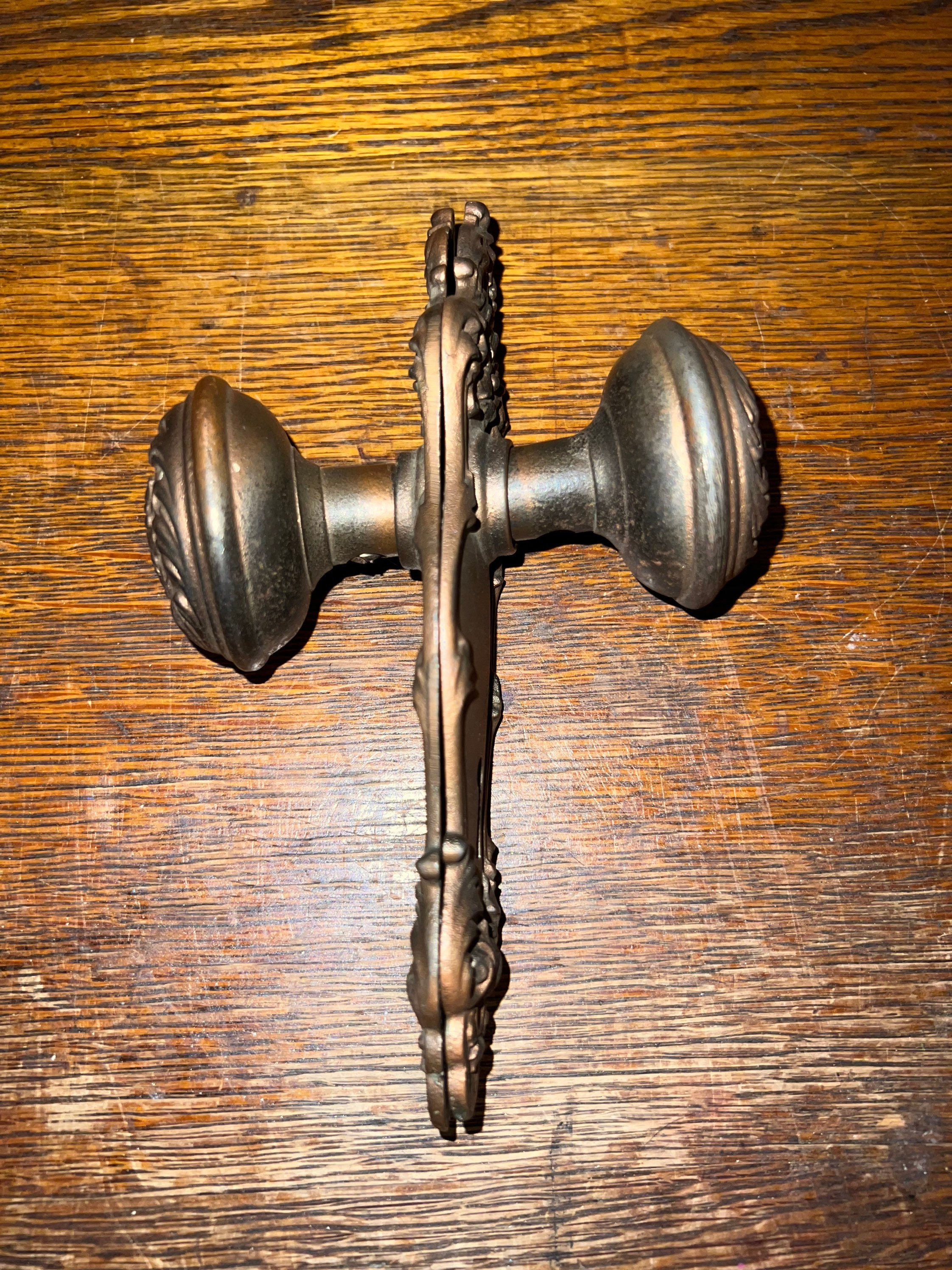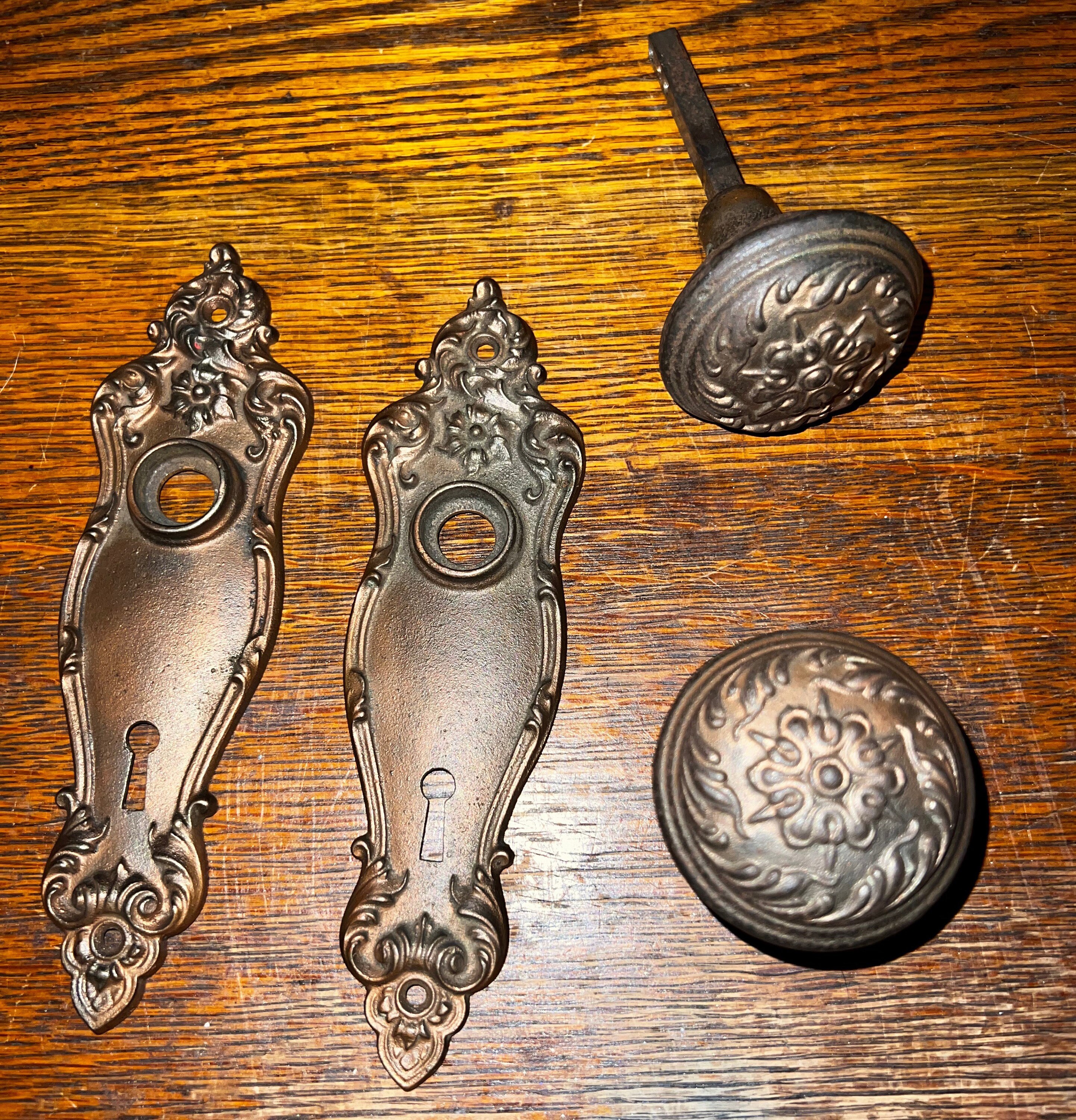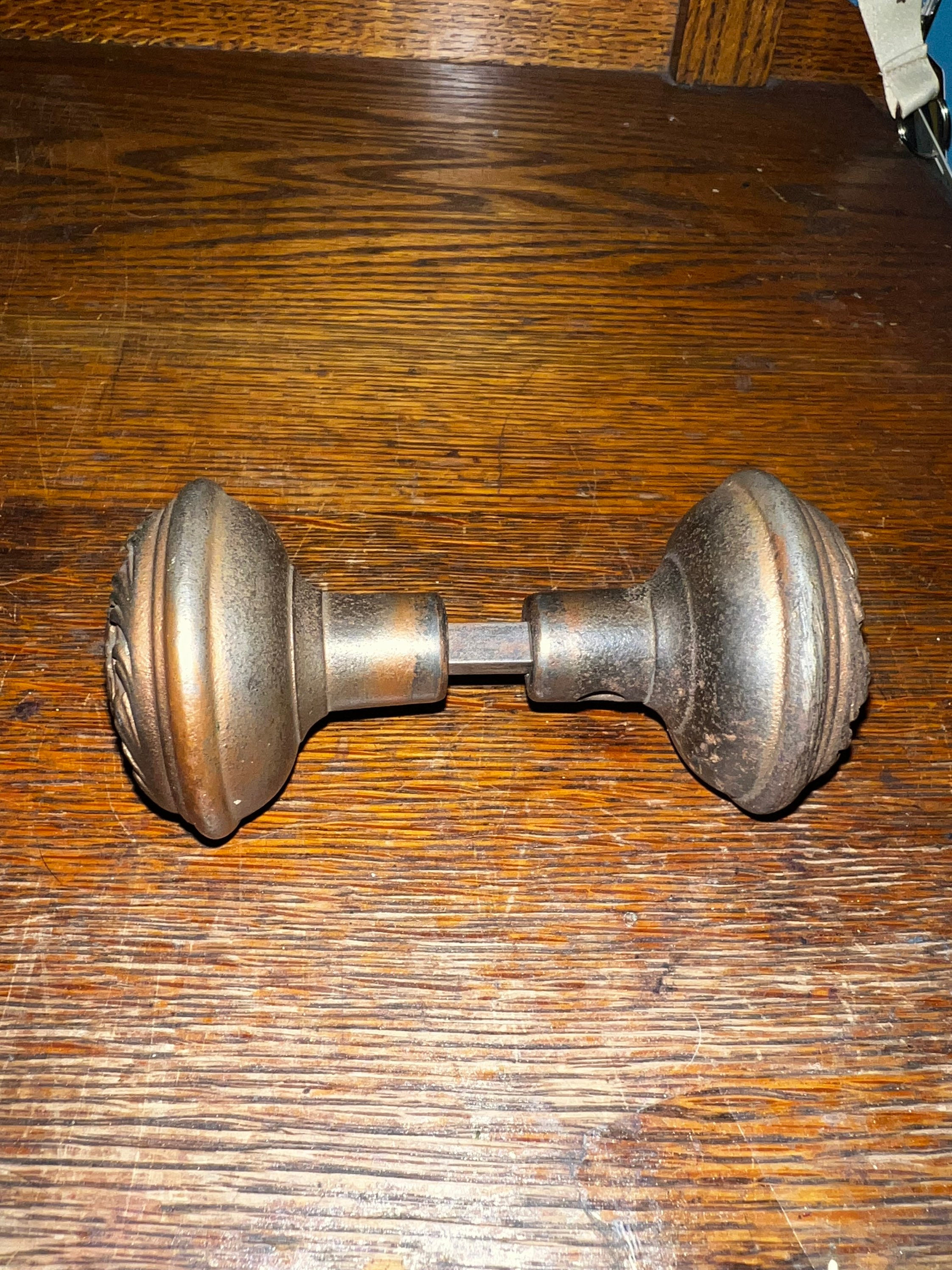 This is a really cool antique bronze door knob set. It was salvaged with both knob pieces as well as the matching plates for each side of the door.