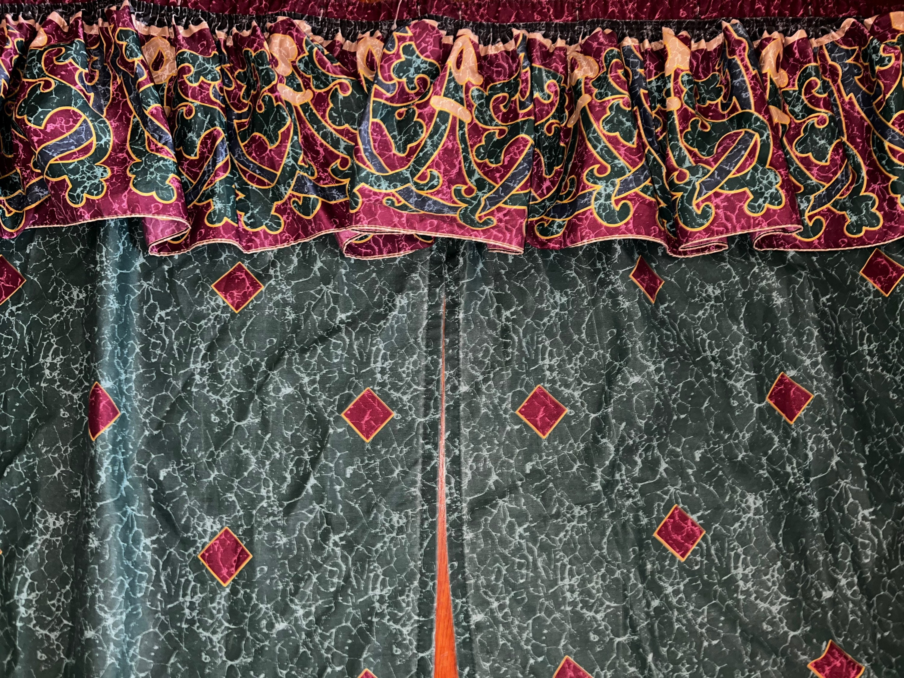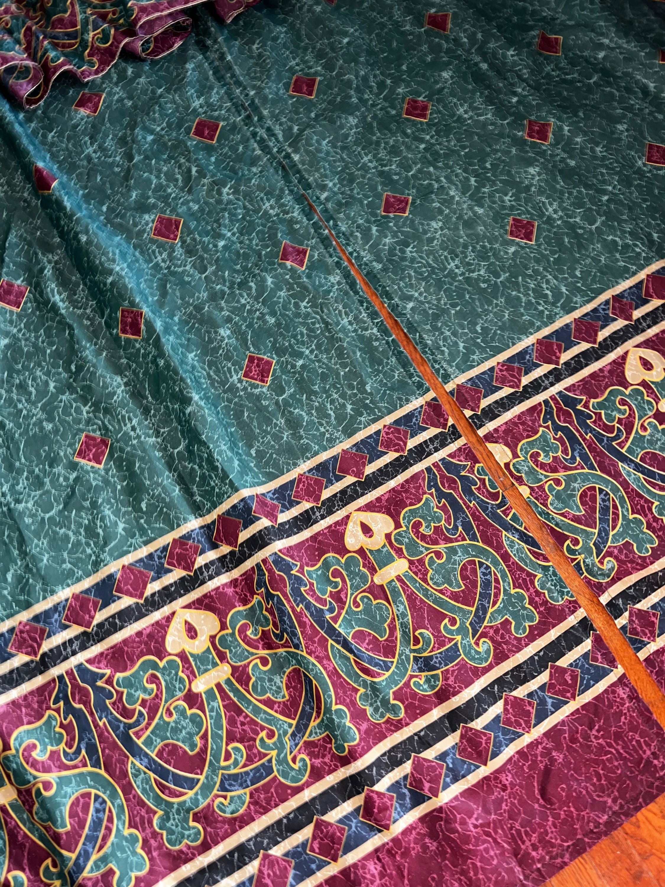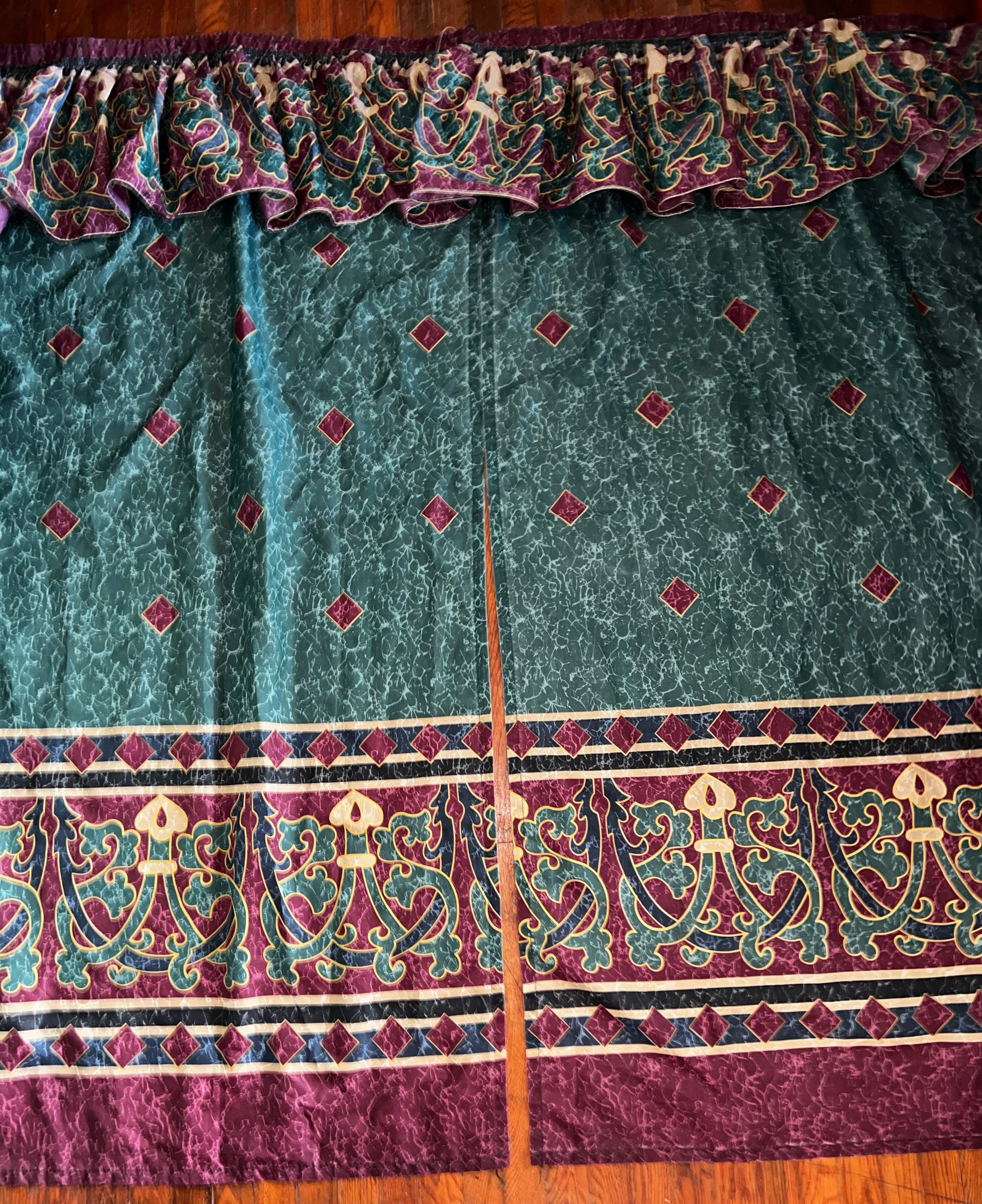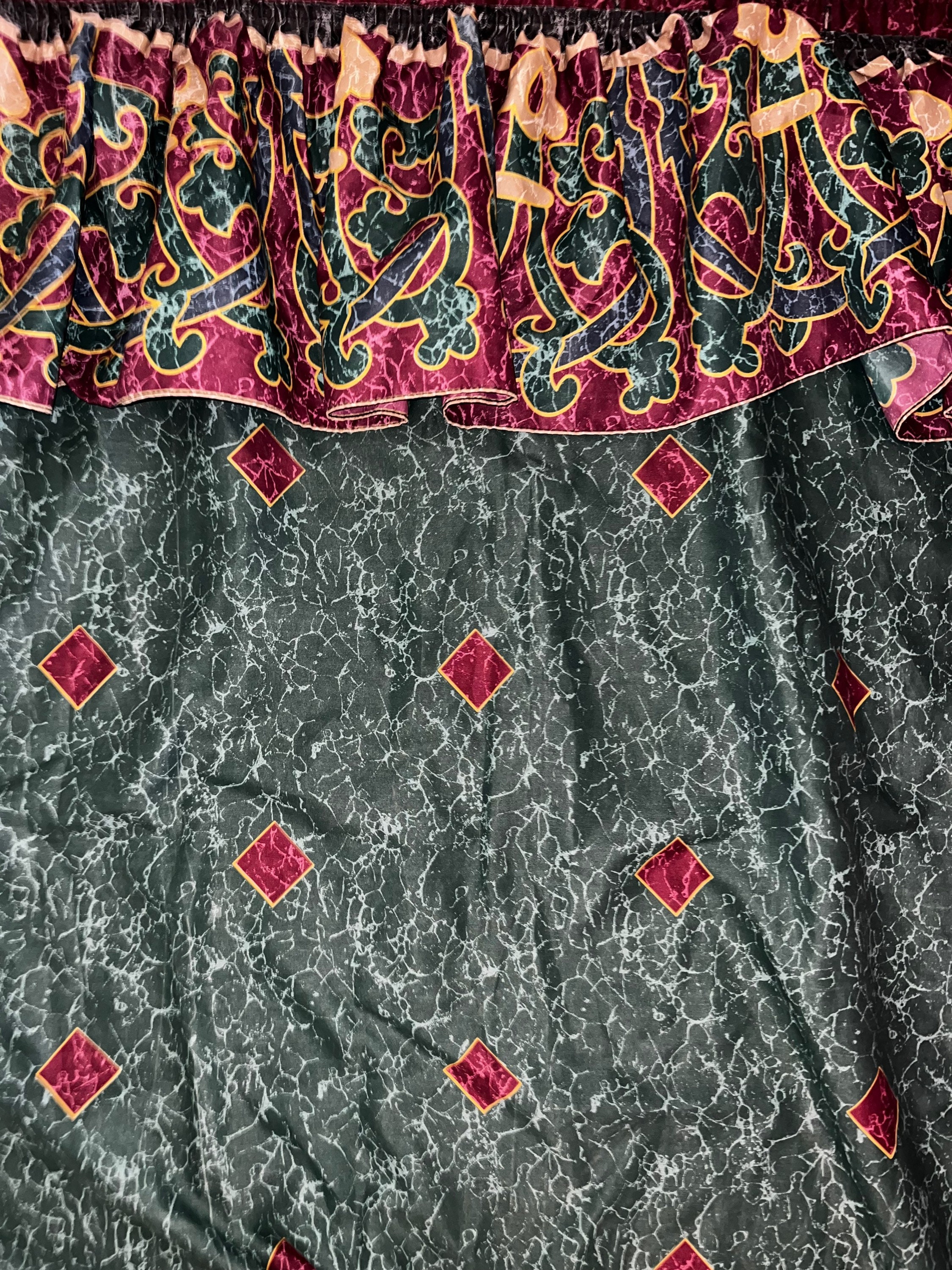 This is a cool 90’s split shower curtain. It is green, blue, and gold with a marble look to it. This style was very popular in the 90’s. zits in good vintage condition.