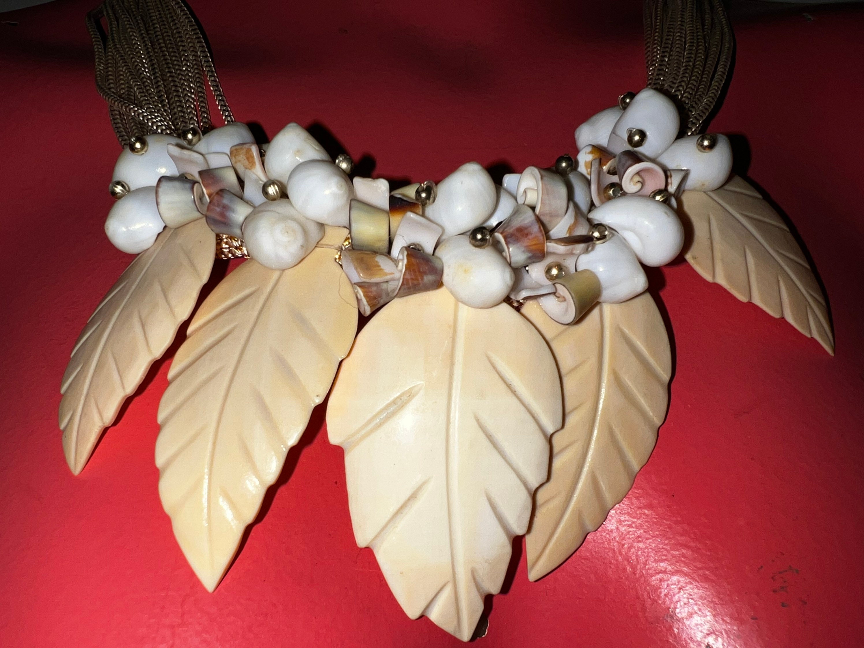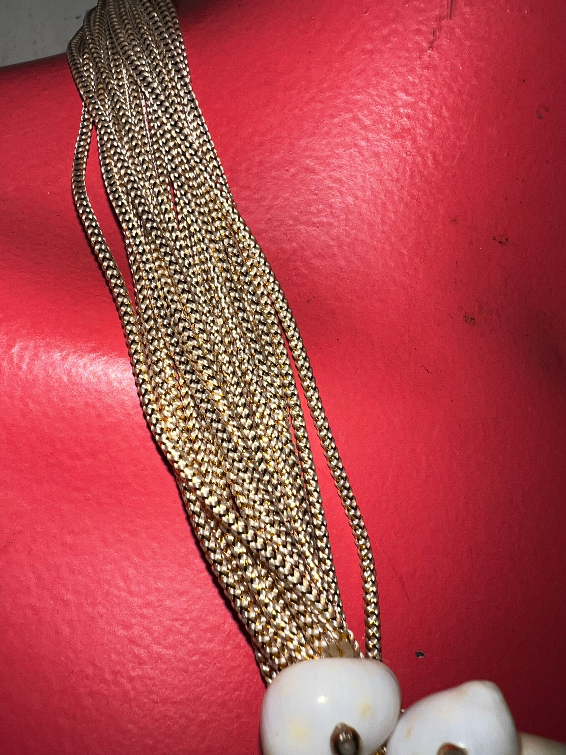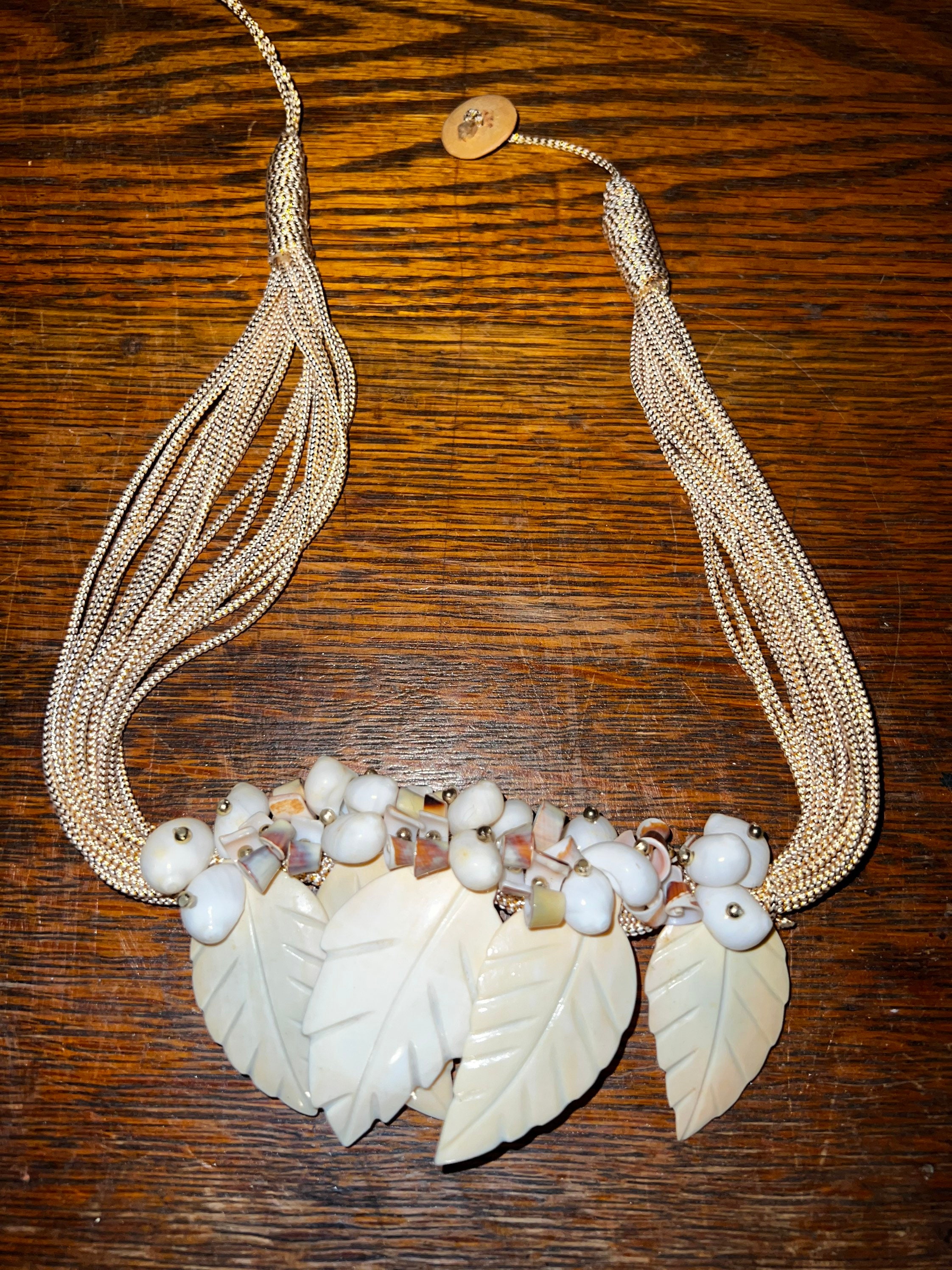 This is a really cool white shell necklace with gold rope and a button clasp. It’s cute! It’s in good vintage condition.