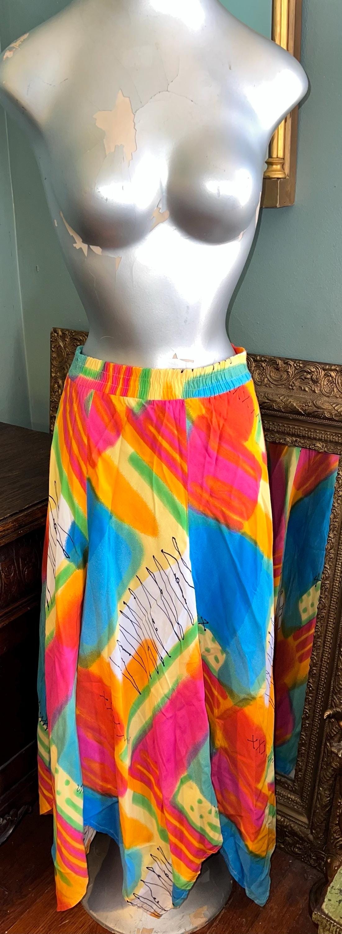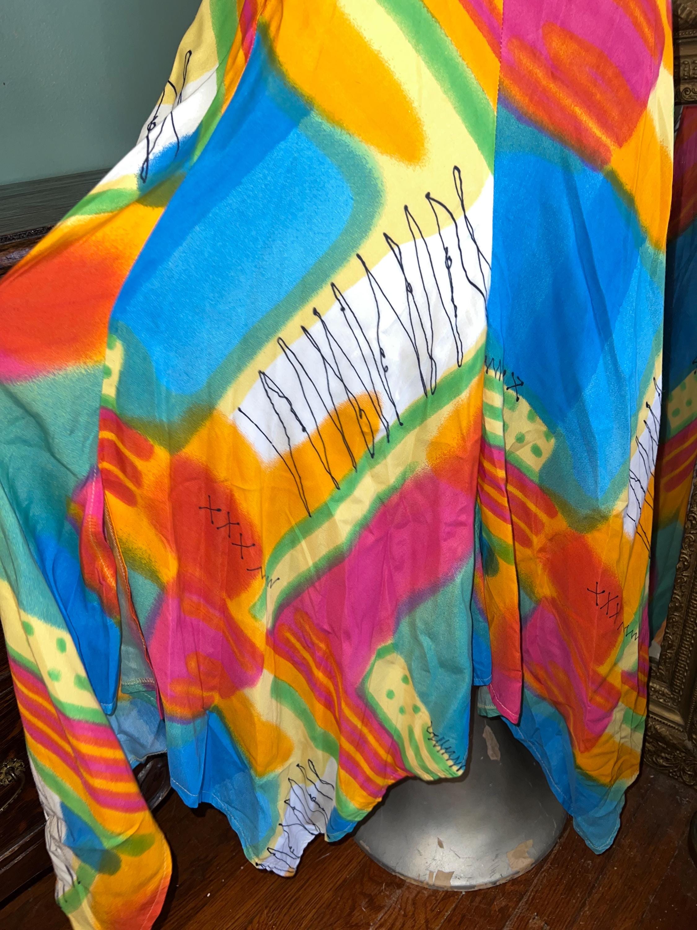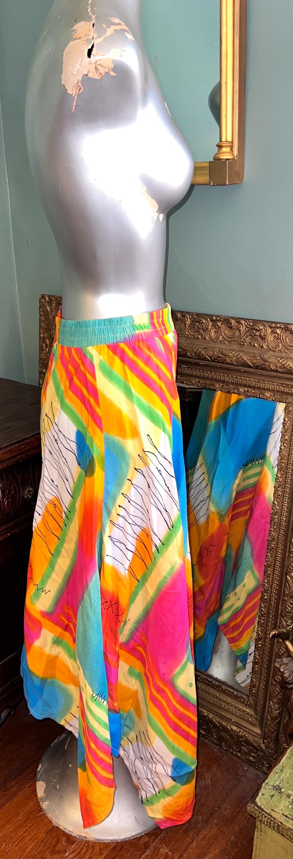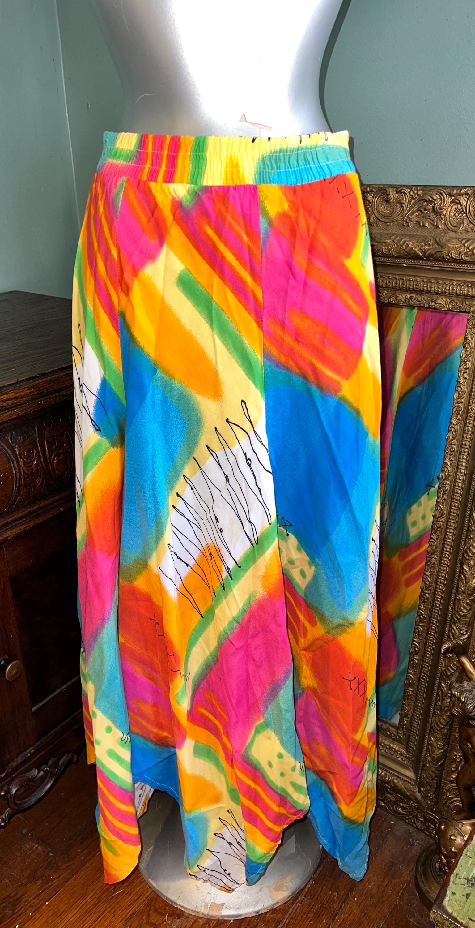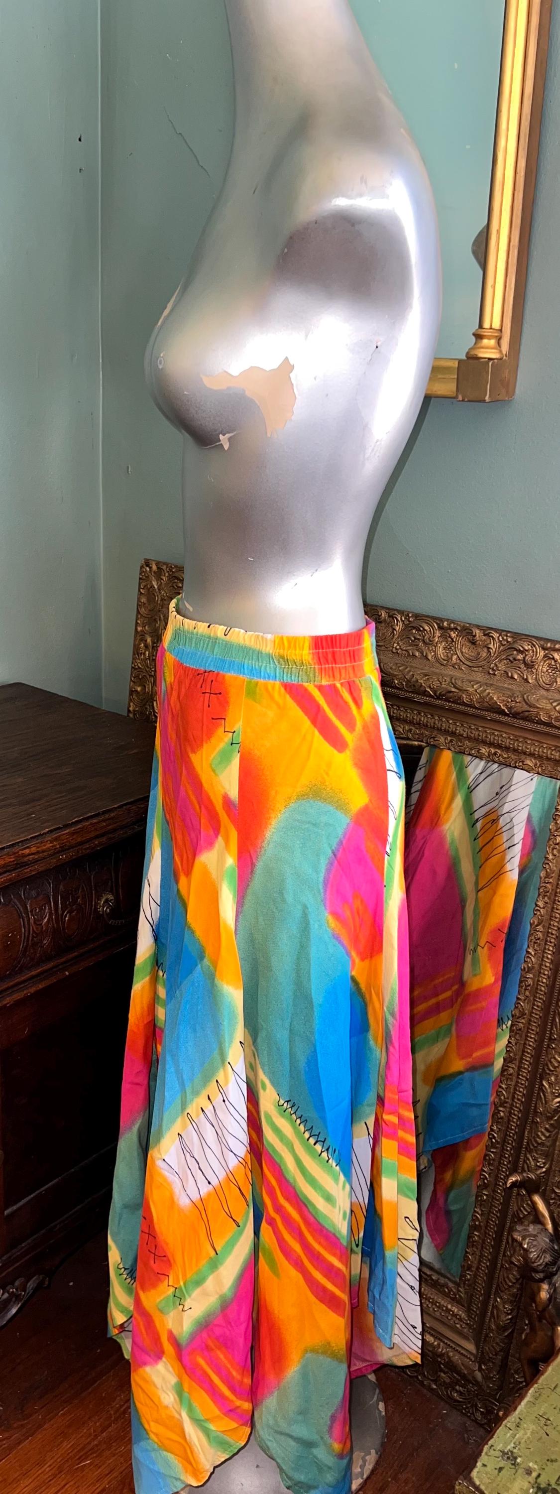 I love the colors on this skirt and how happy this looks with the way it’s cut at the bottom. It’s in great vintage condition, looks rarely worn. It has an elastic waist and it’s Super cute! It’s more then super cute. It’s “Happy” if you ask me. I would be smiling all day if I could wear this.