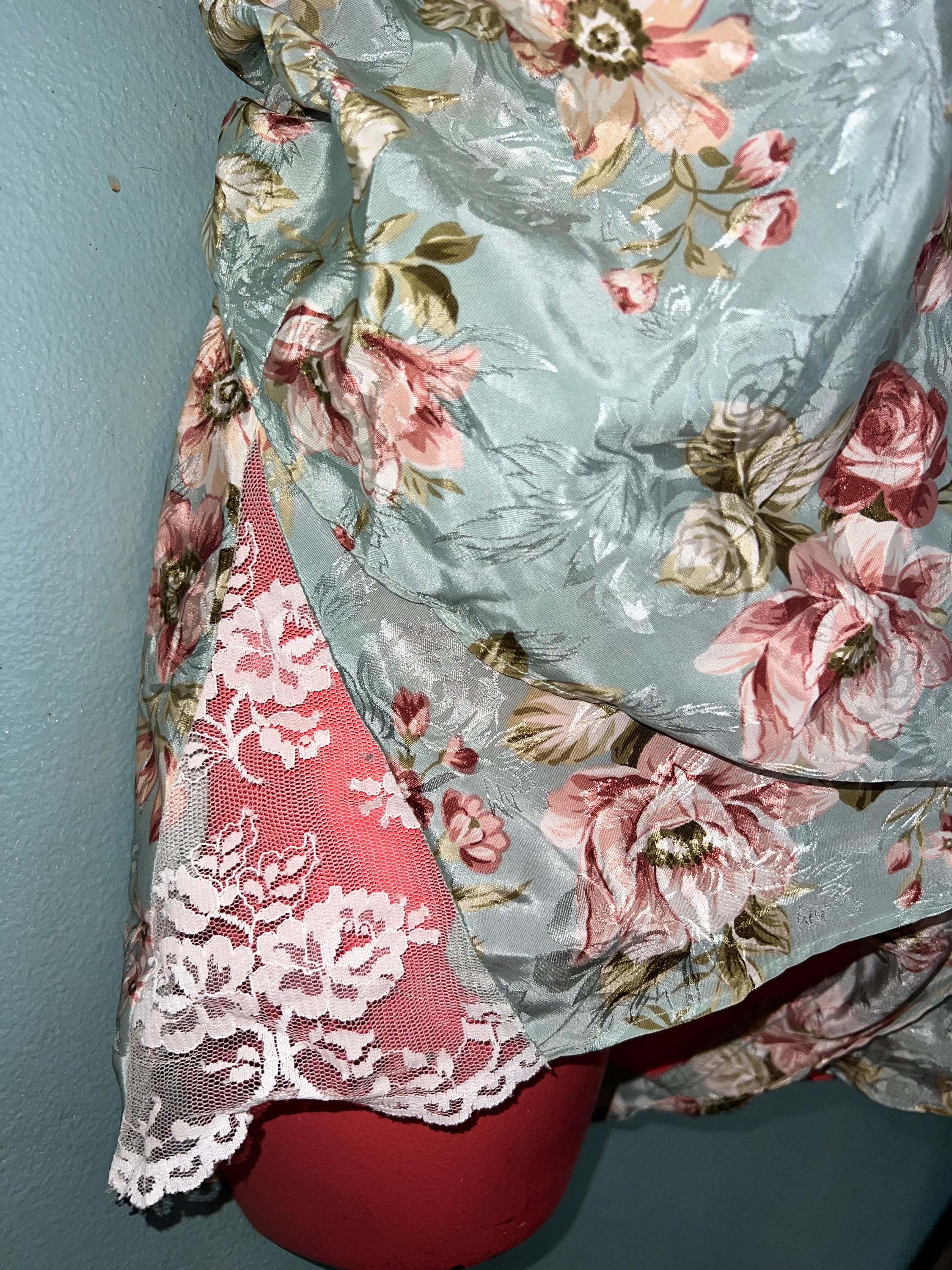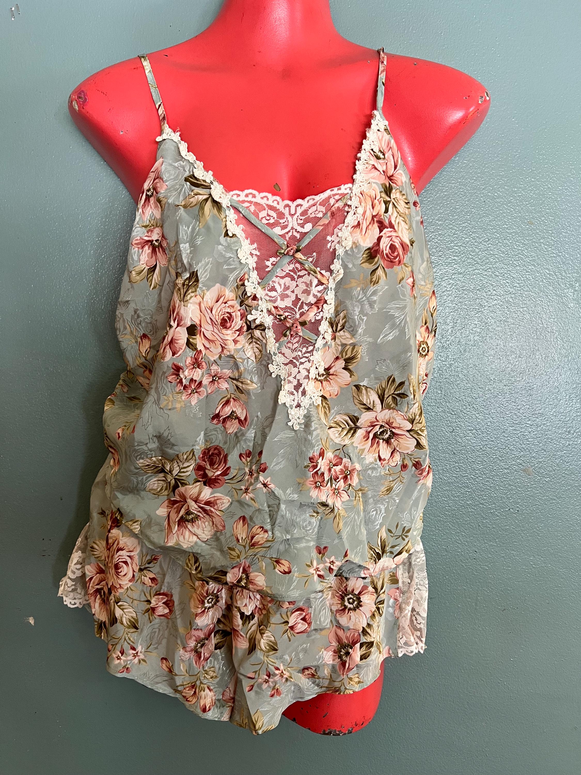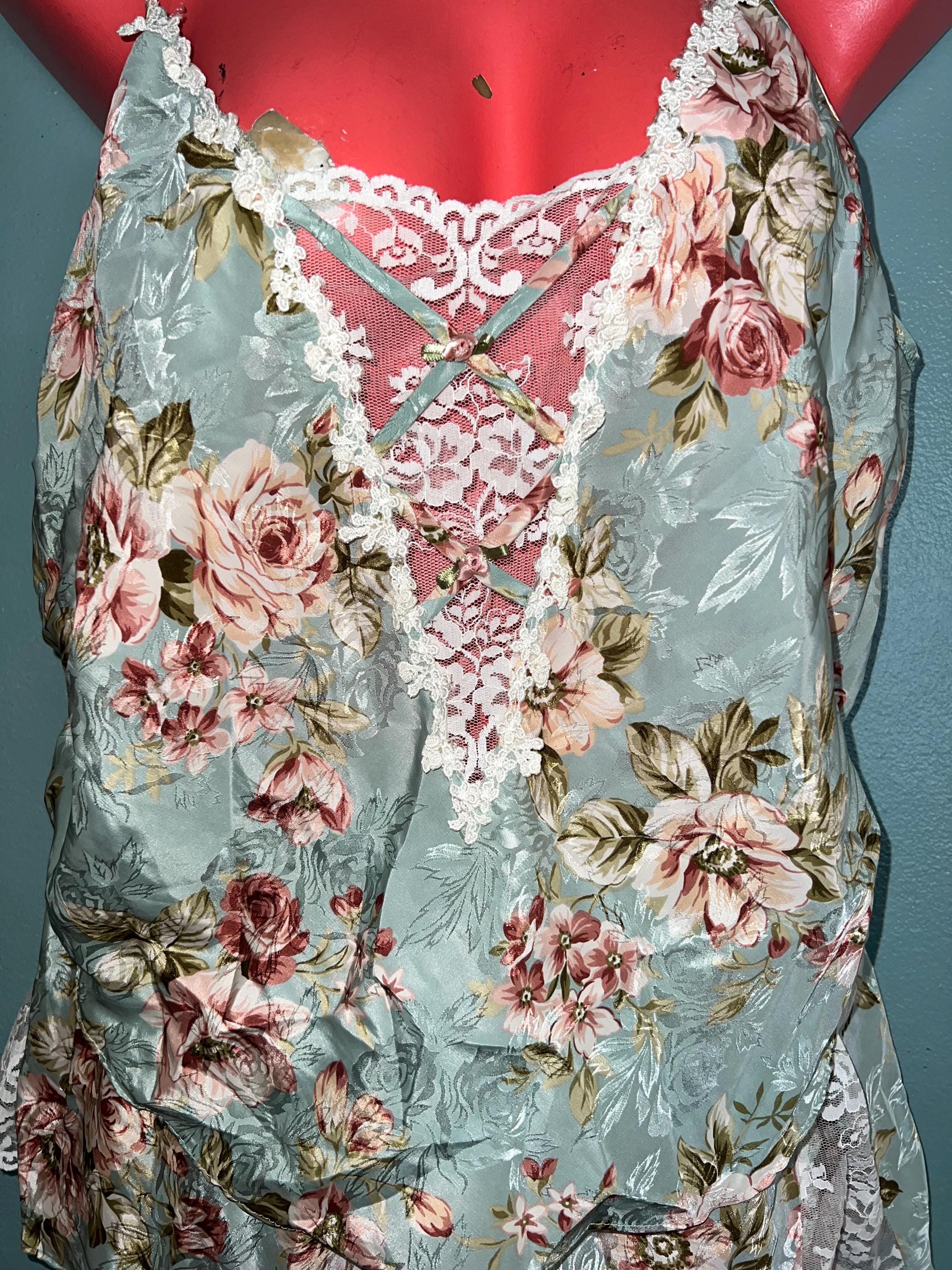 This is a really pretty set of 1980s pj’s. They are, sage green with flowers and lace to accent them. The set is in good vintage condition.