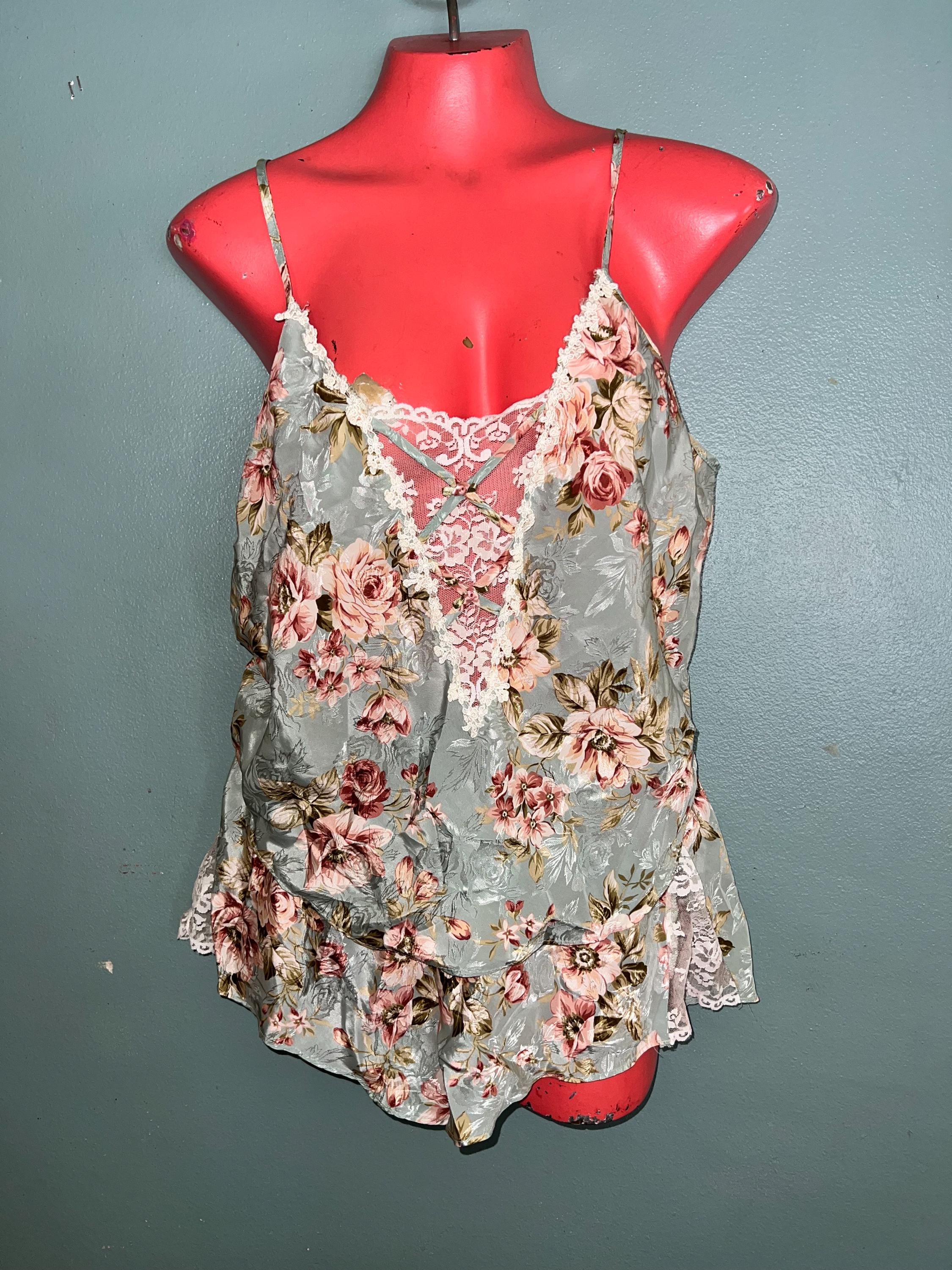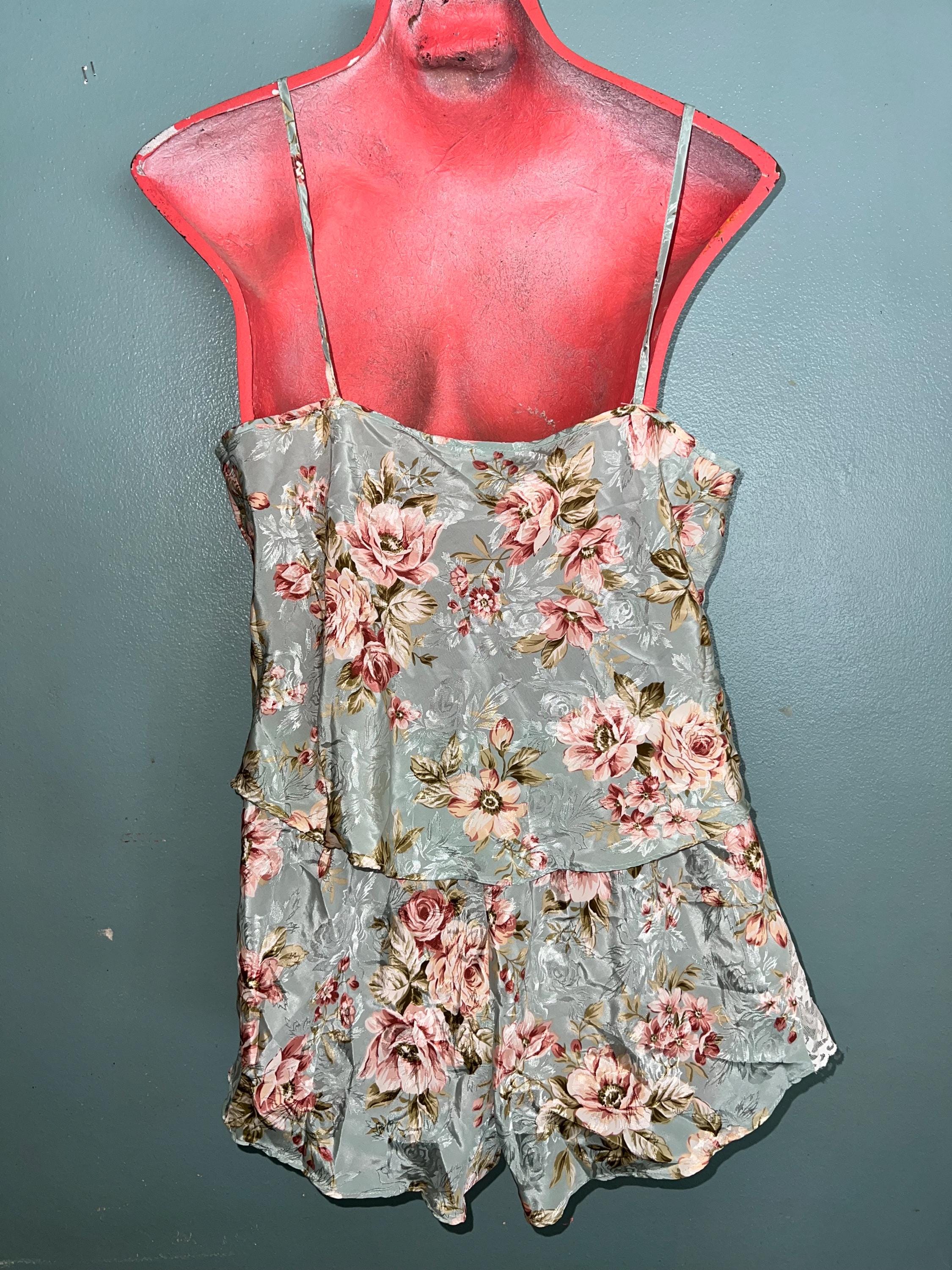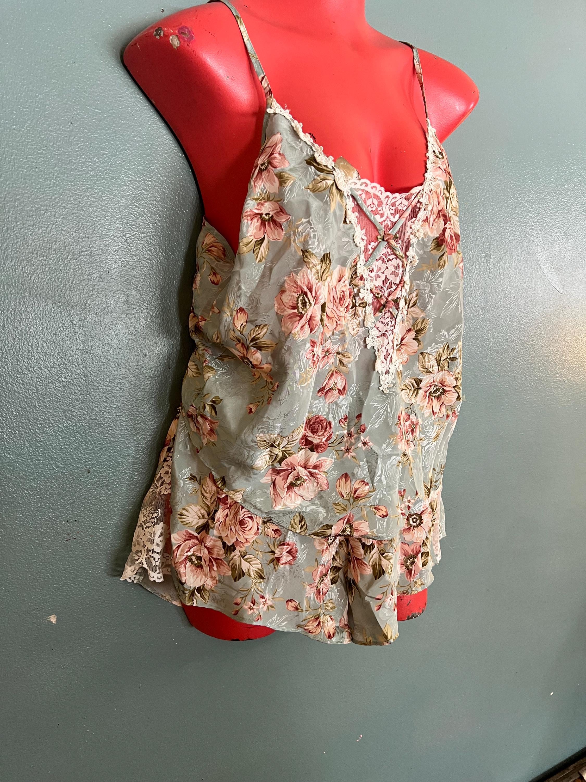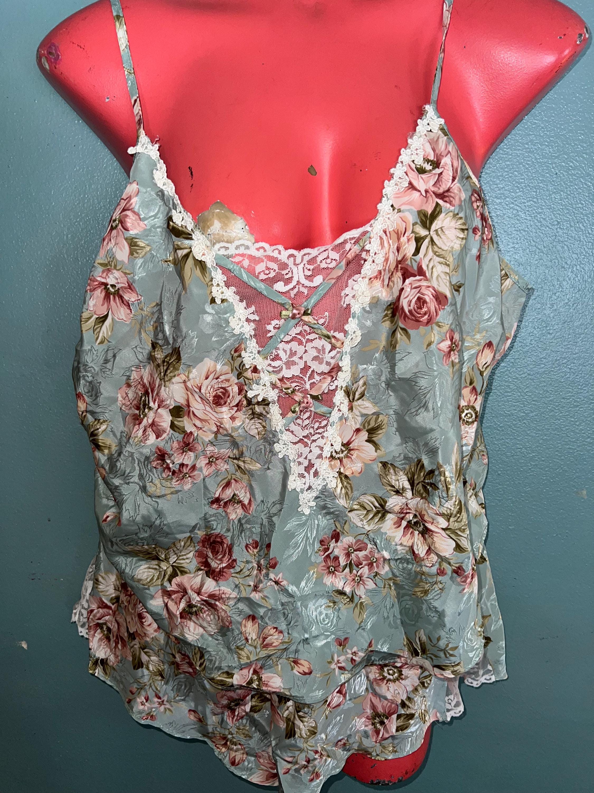 This is a really pretty set of 1980s pj’s. They are, sage green with flowers and lace to accent them. The set is in good vintage condition.