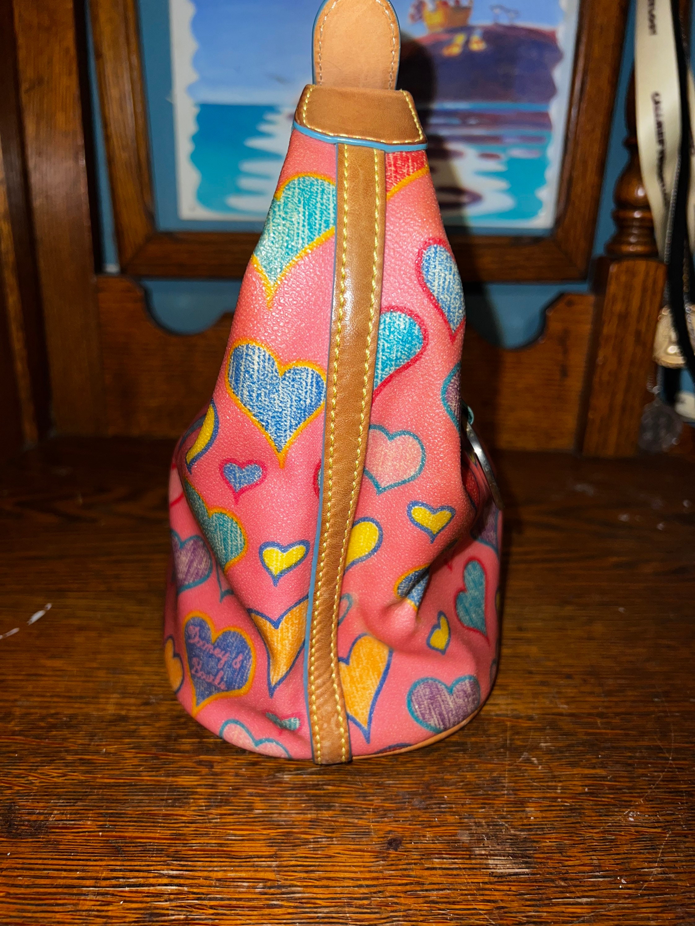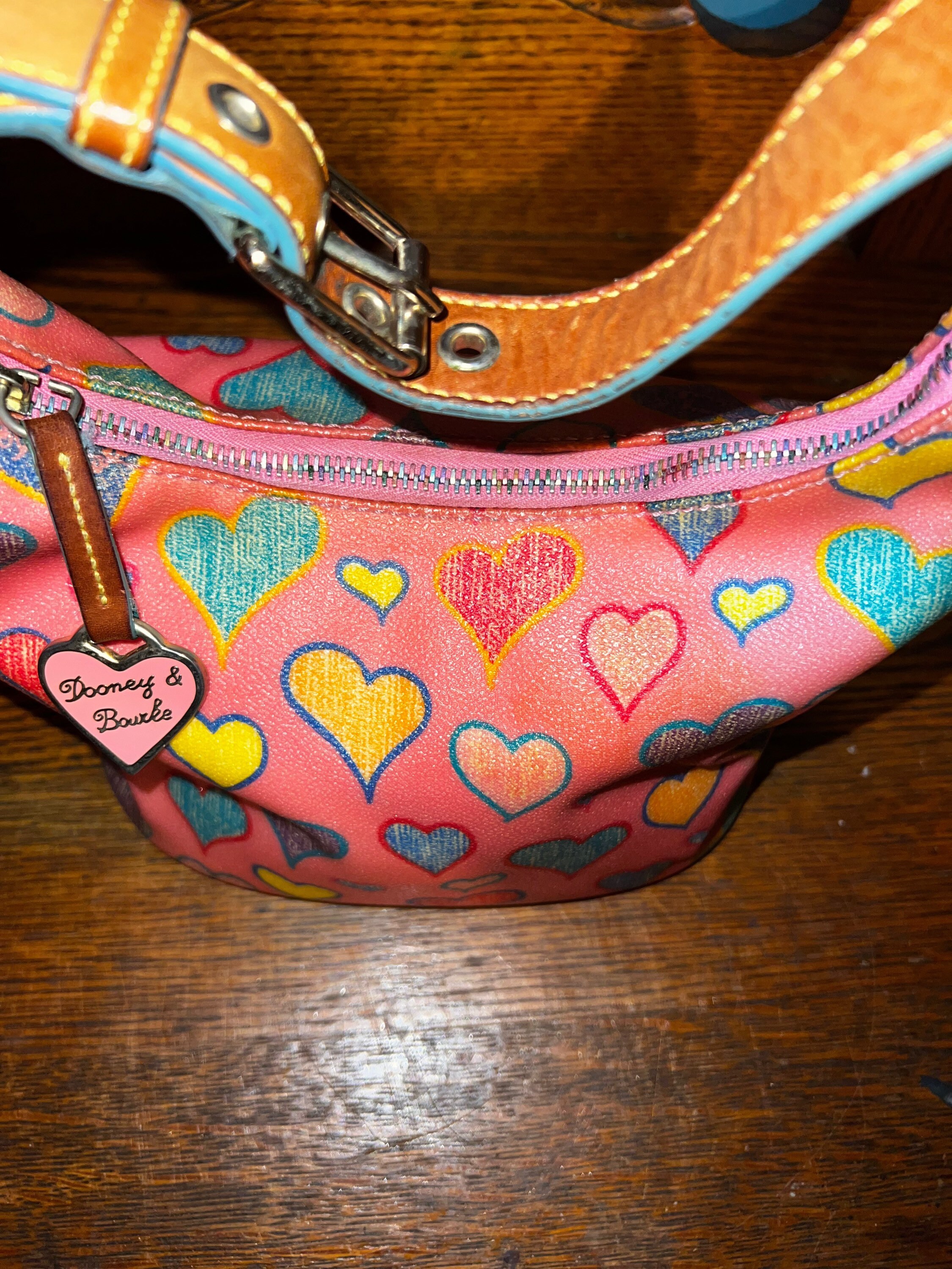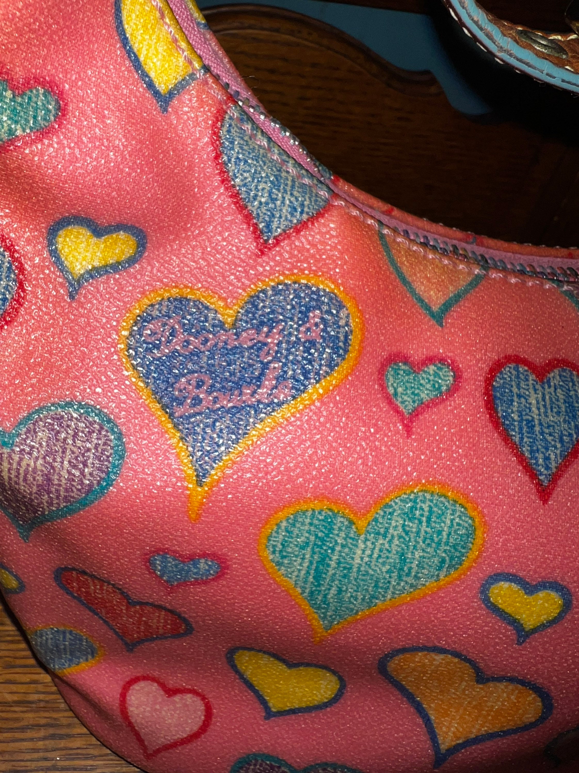 Very nice, cute little rainbow hearts Dooney and Bourke pink purse! I love it! It is in good vintage condition, but does have some light surface wear on the inside. The zipper is rainbow colored.