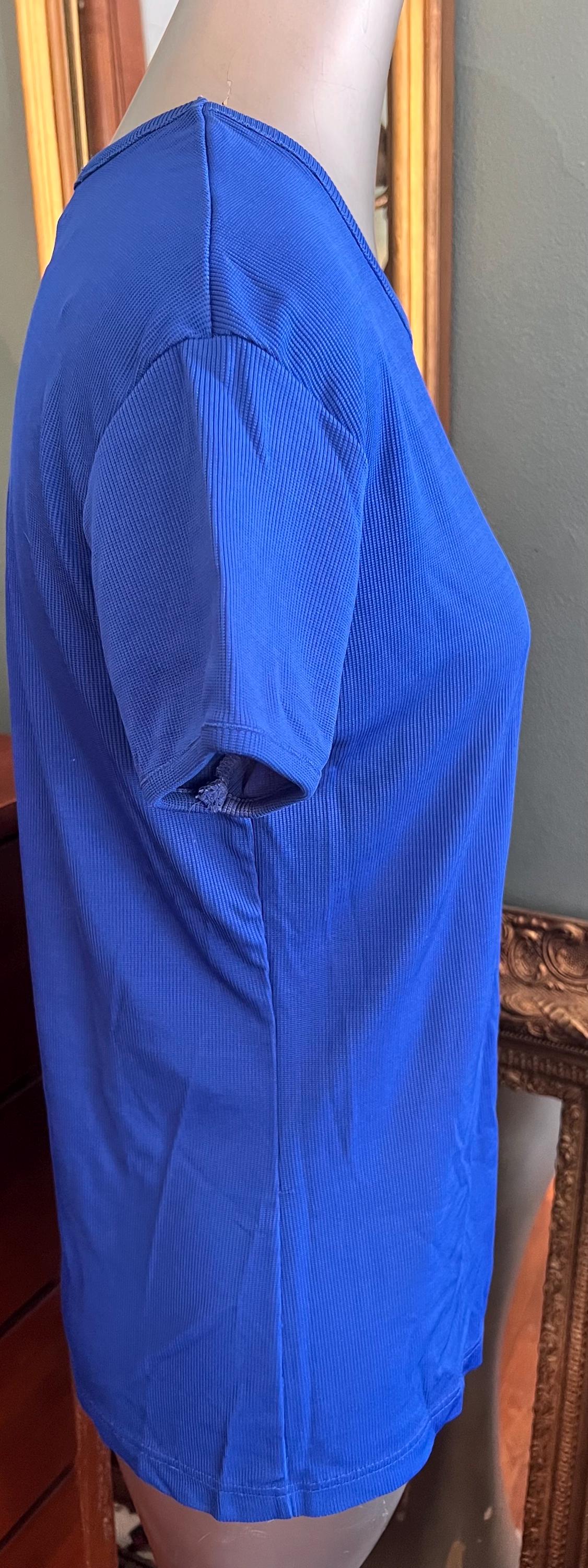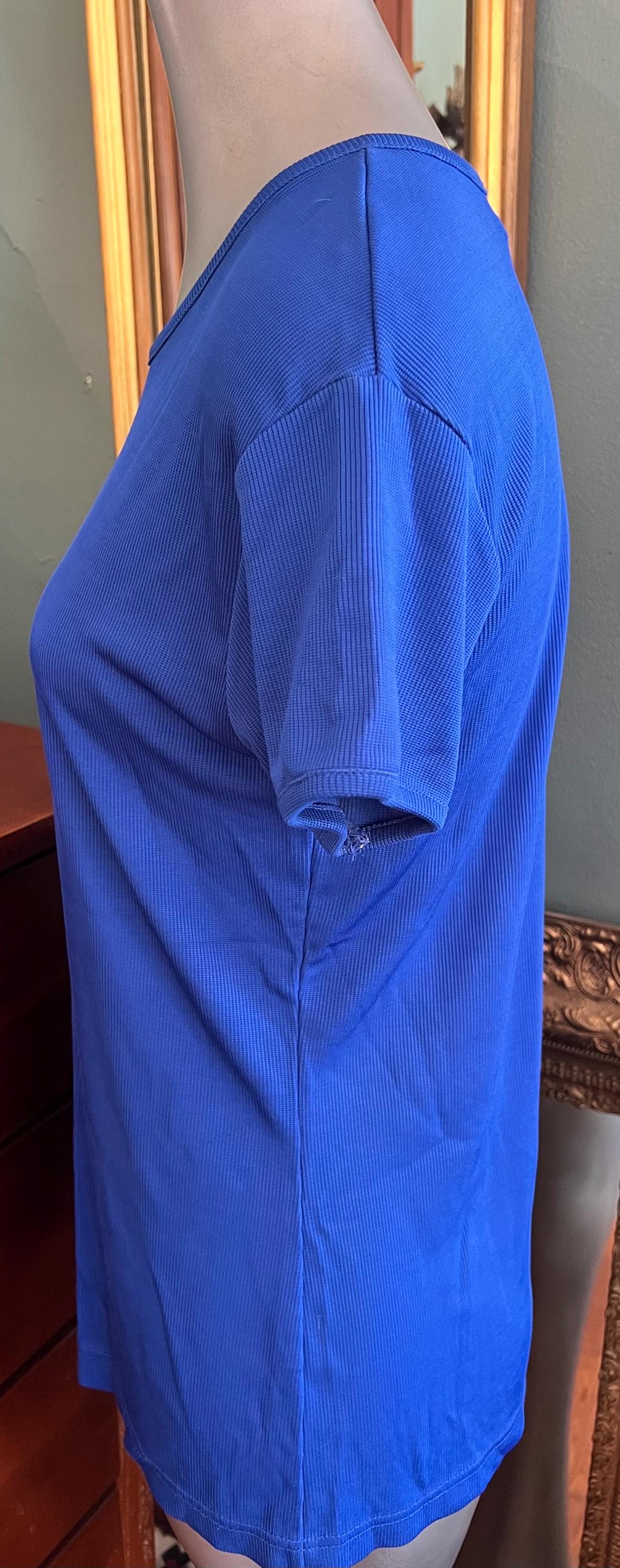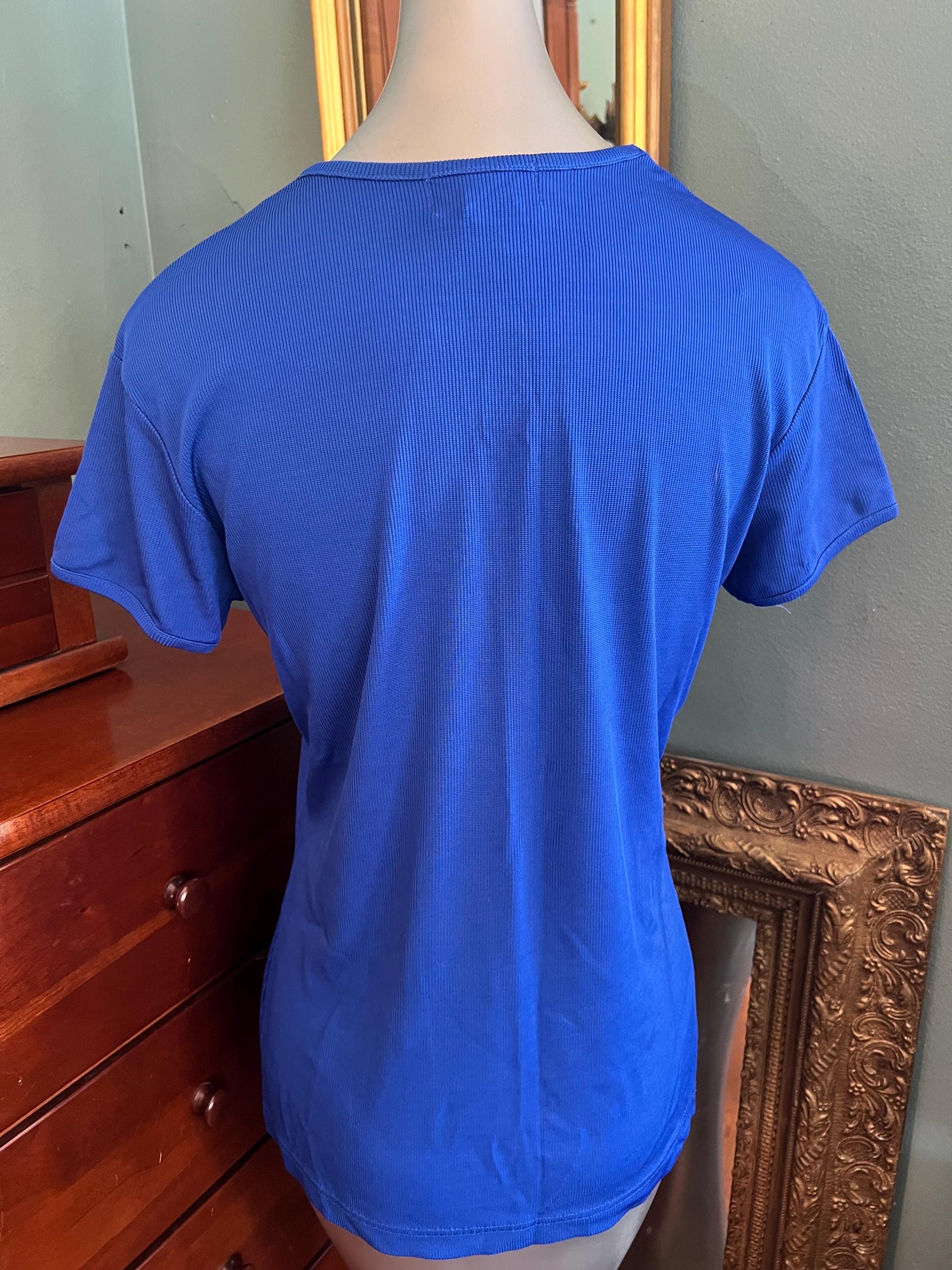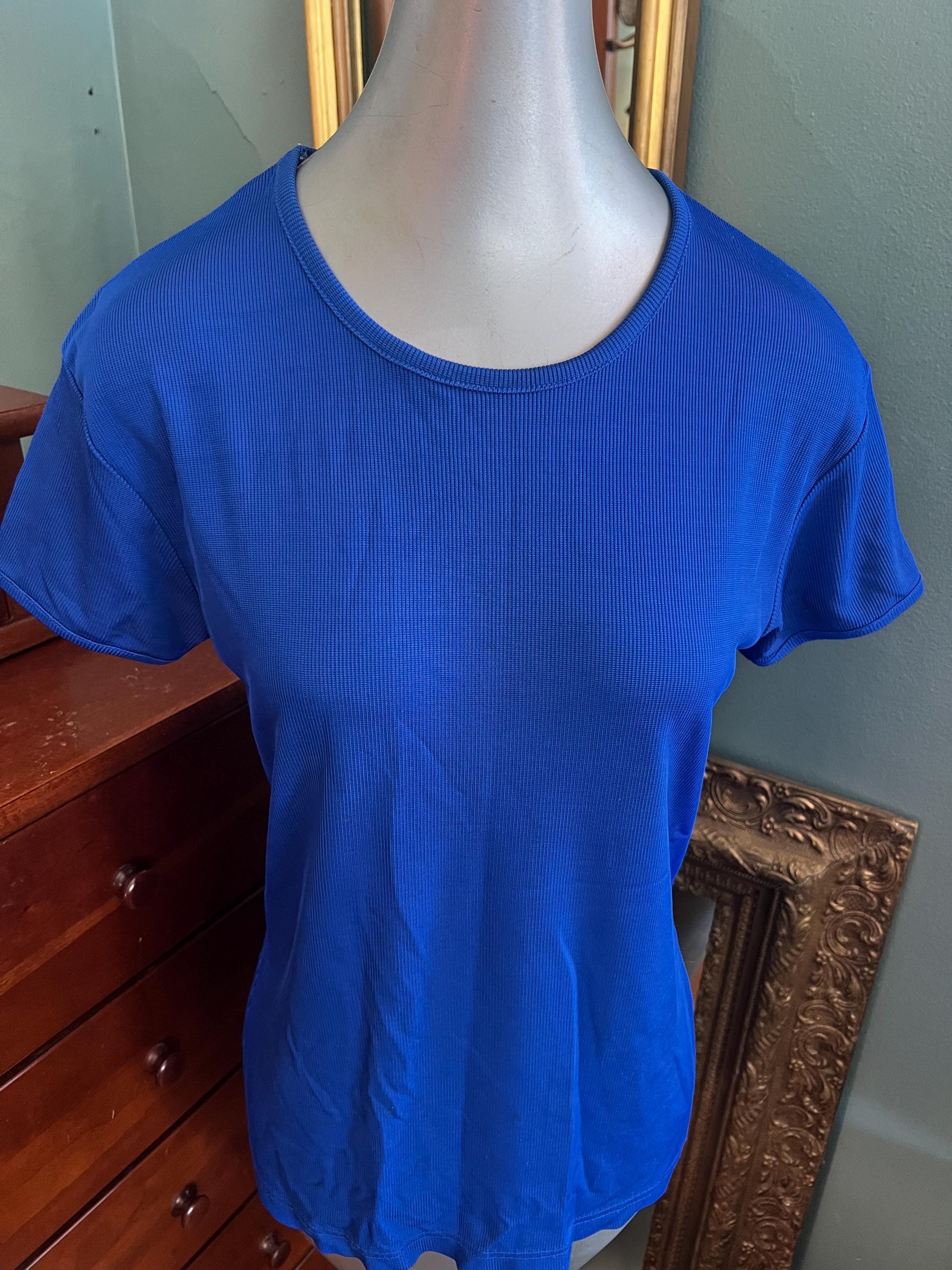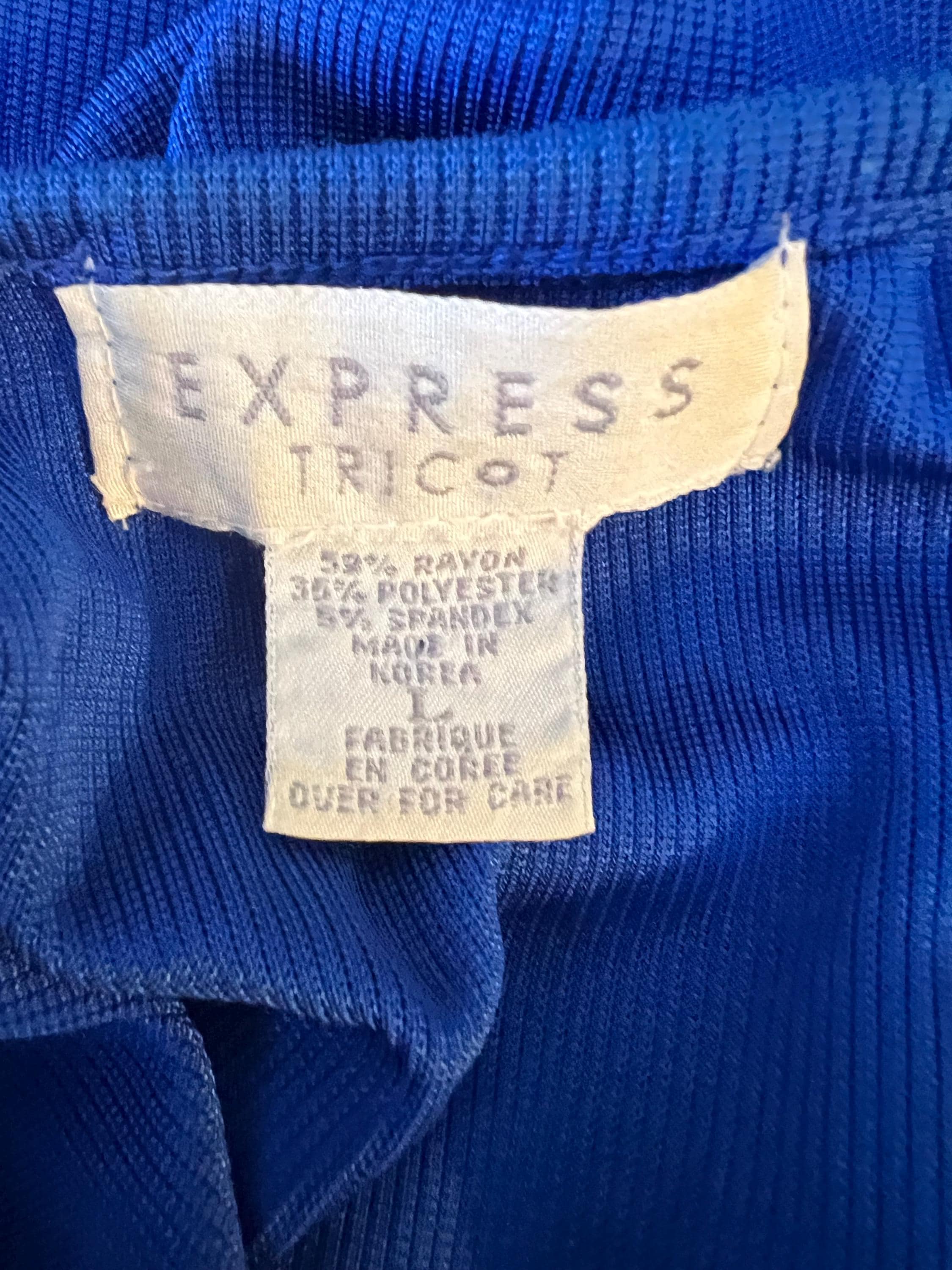 I love this blue shirt! It’s a late 80’s early 90’s Express shirt. I swear this was probably hanging in my closet in 1991! It’s very skinny feeling and is a combo of rayon and spandex. It’s in very good vintage condition.