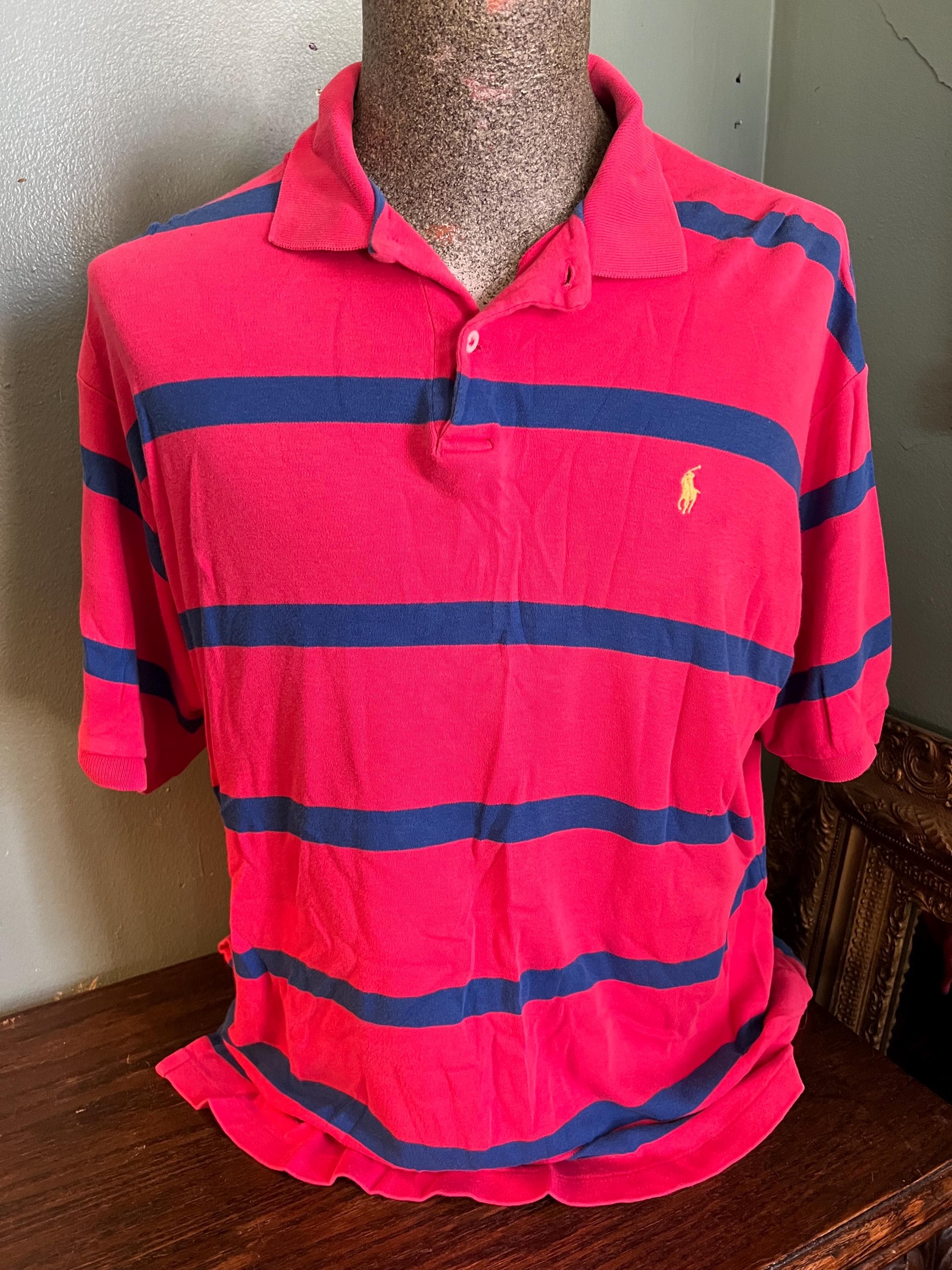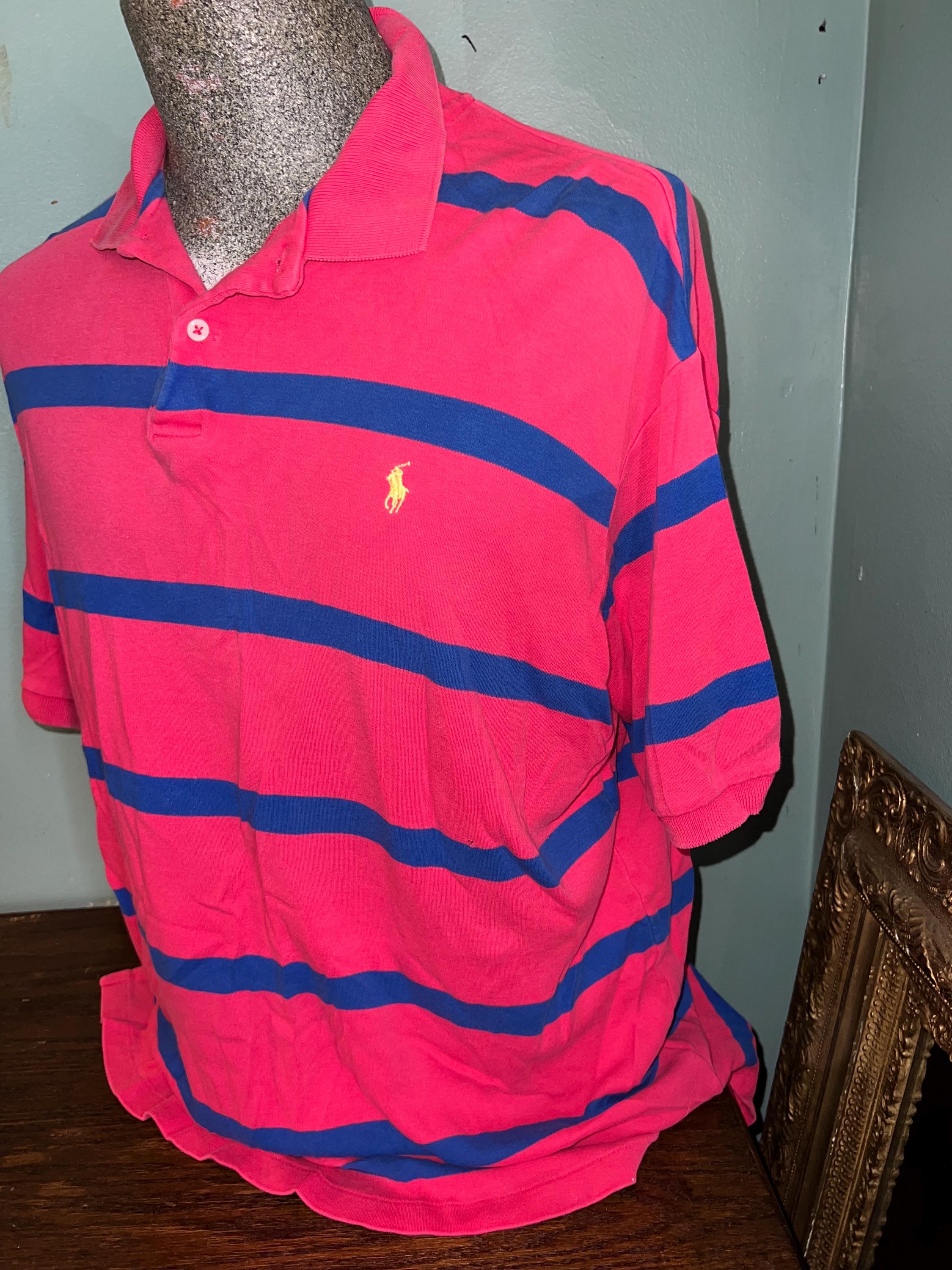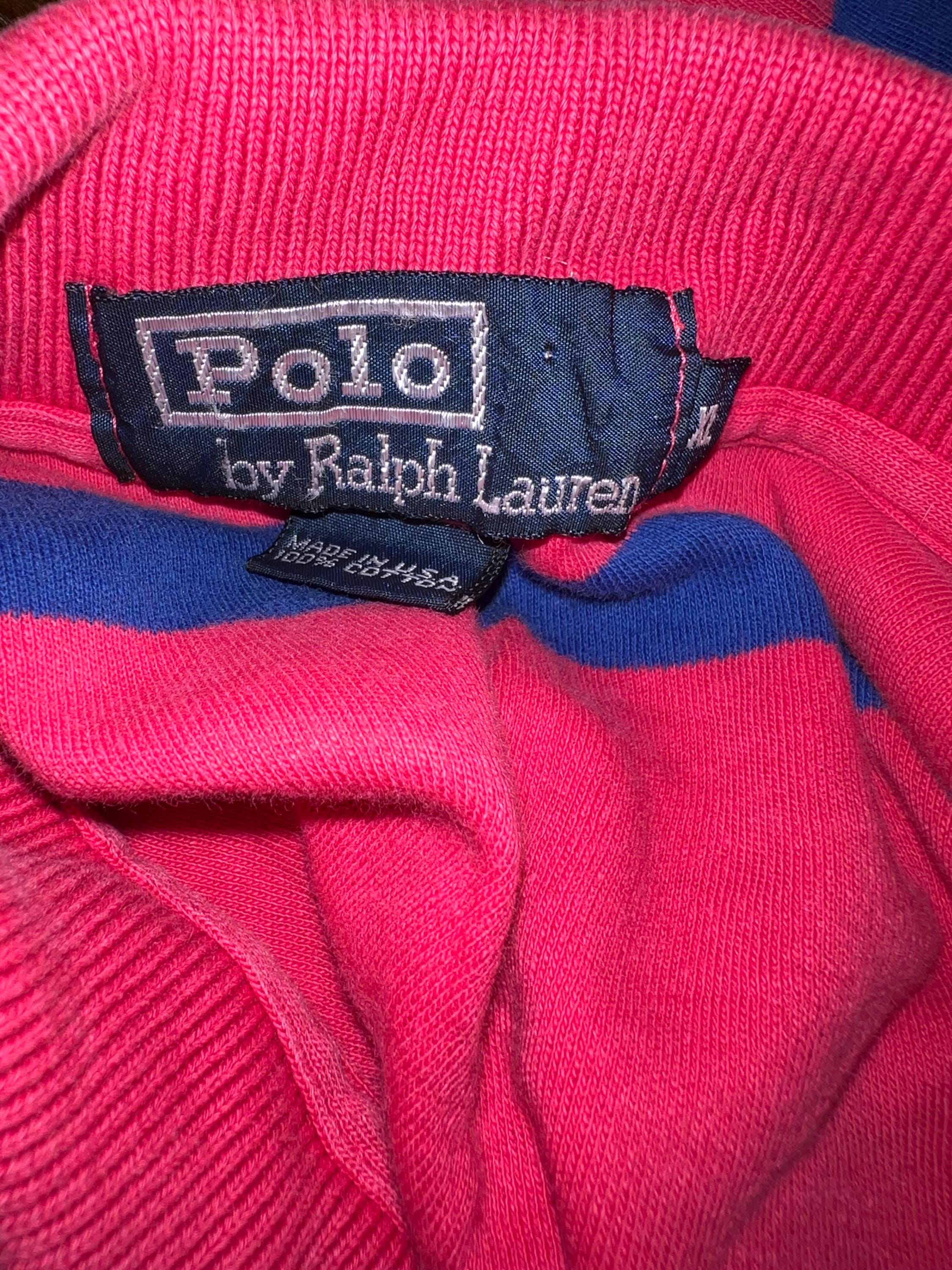 This awesome USA made early 90’s pink and blue striped Ralph Lauren Polo is only for you if you love a super soft worn in vintage shirt. It has two tiny holes one on front and one on the lower back part of shirt, (see photos). Therese, It’s in good vintage condition!