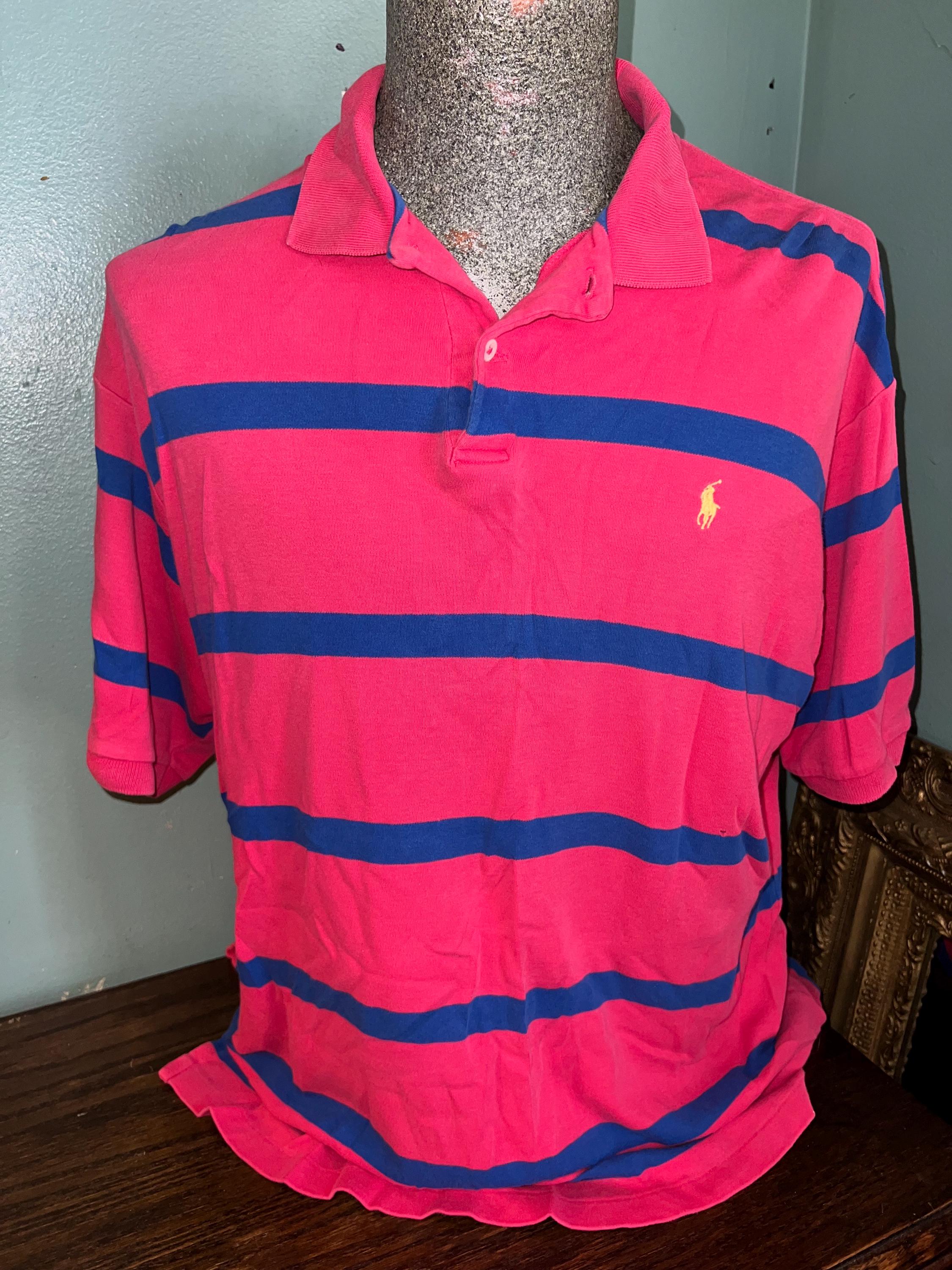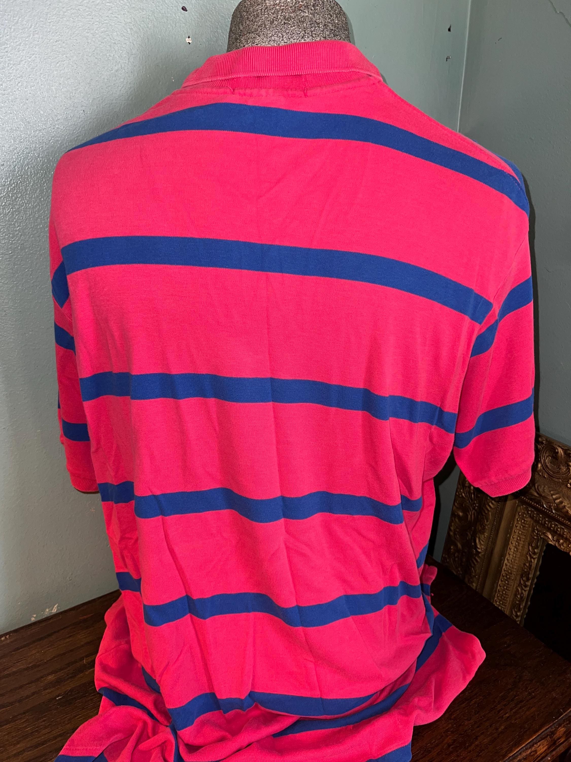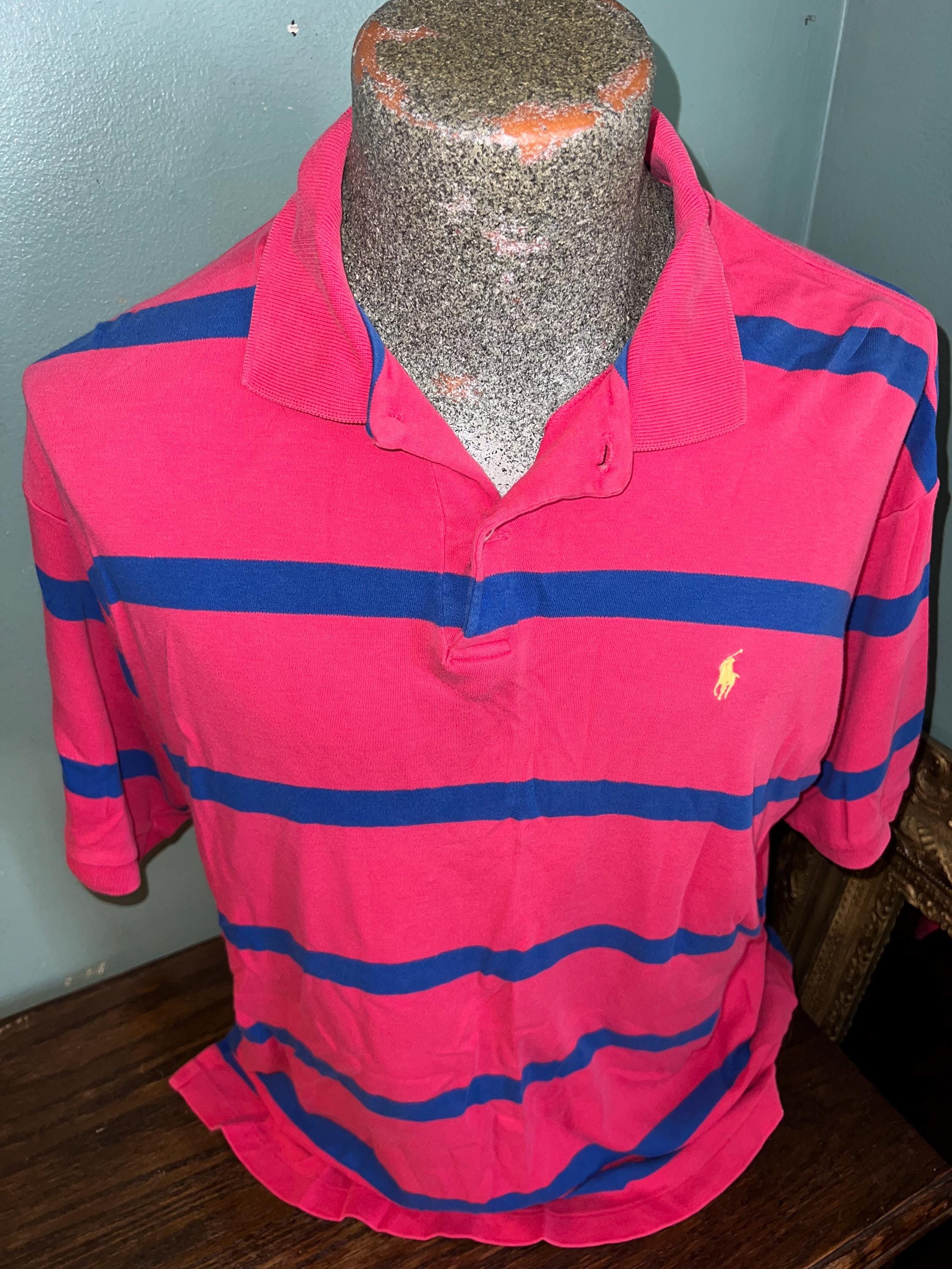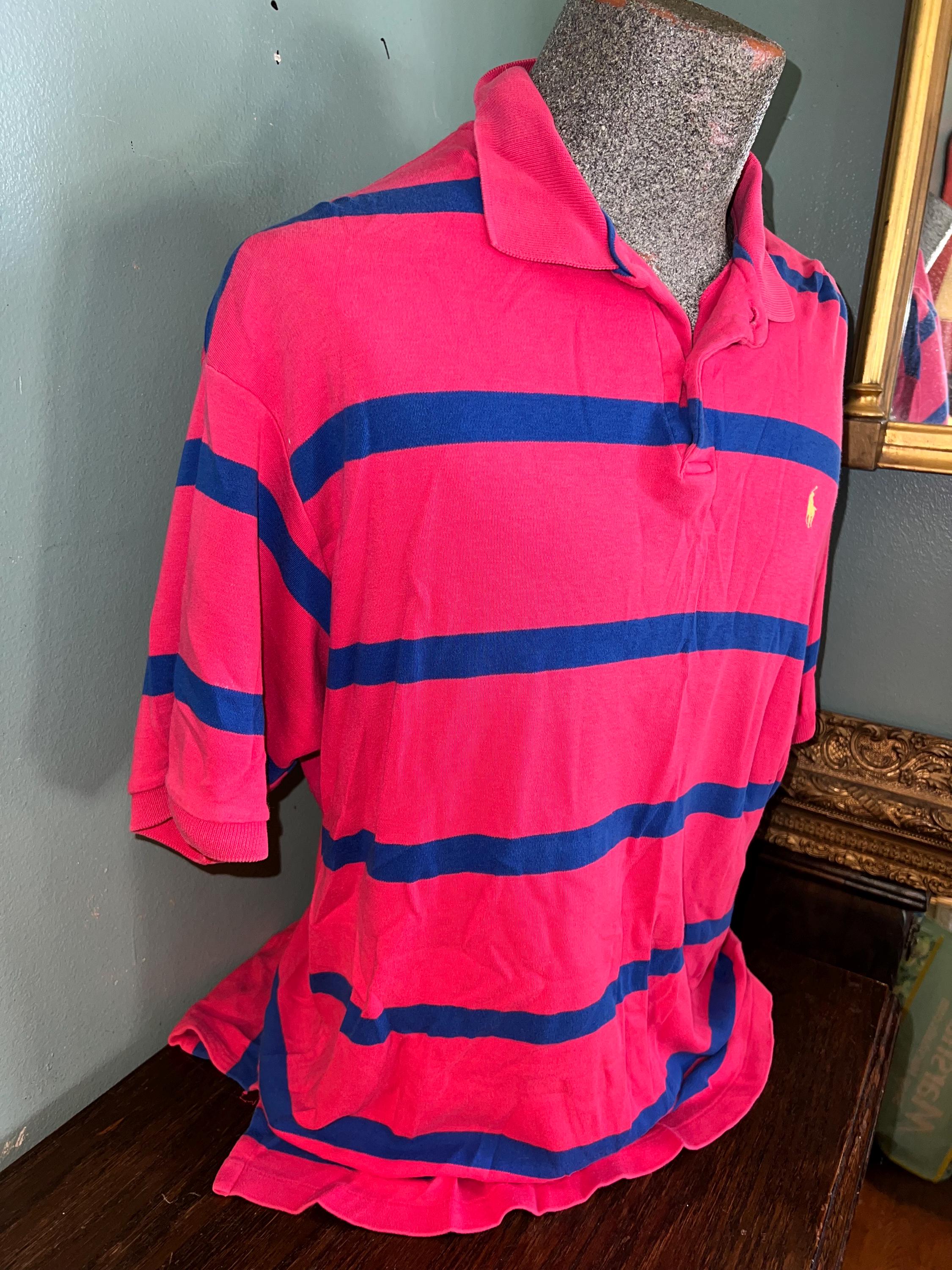 This awesome USA made early 90’s pink and blue striped Ralph Lauren Polo is only for you if you love a super soft worn in vintage shirt. It has two tiny holes one on front and one on the lower back part of shirt, (see photos). Therese, It’s in good vintage condition!