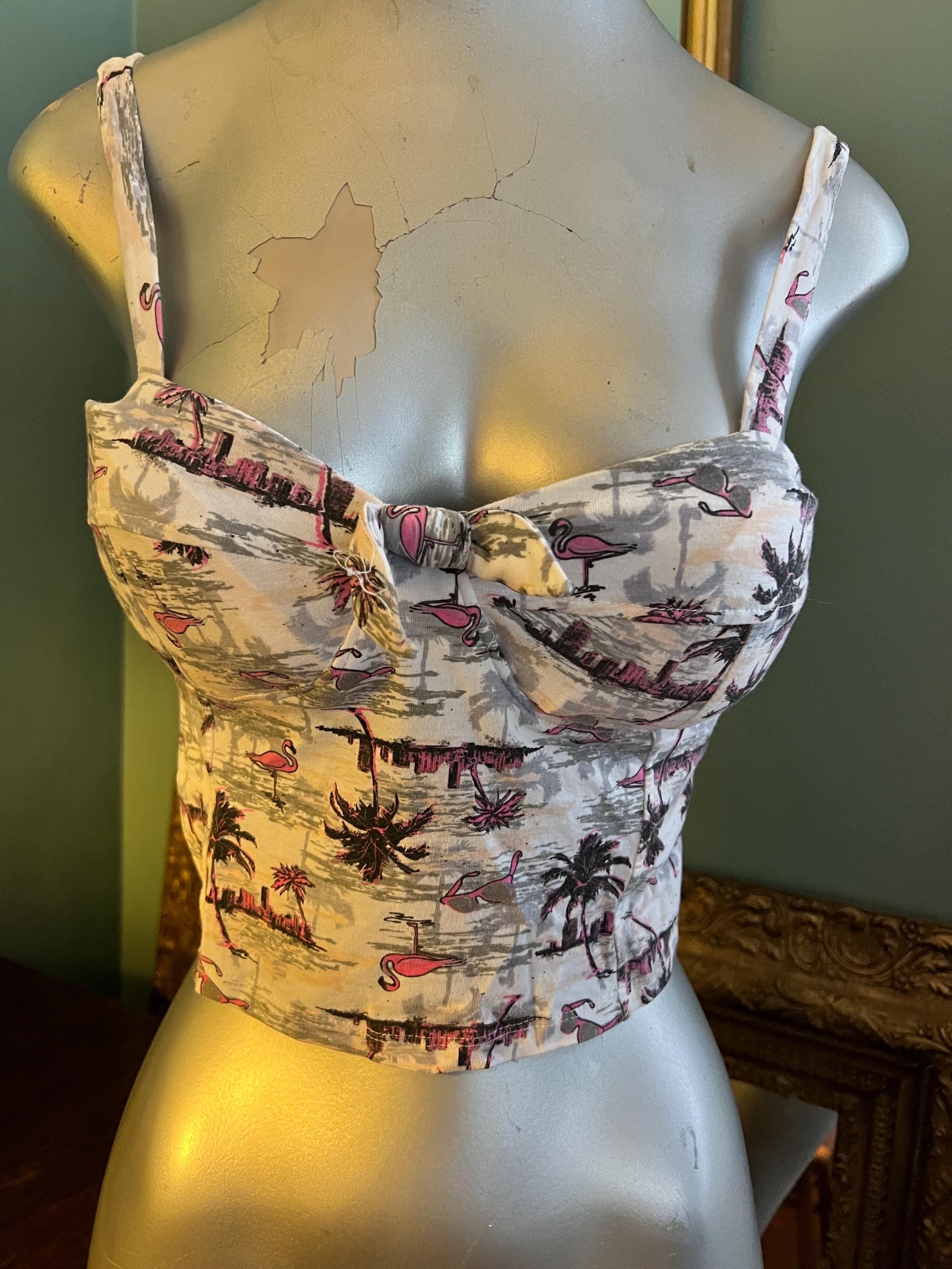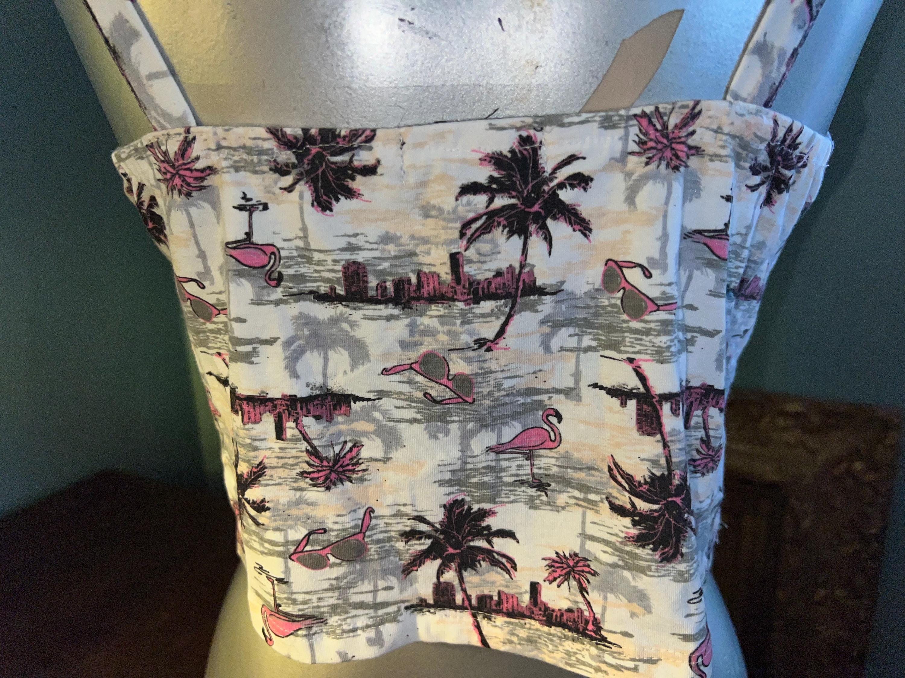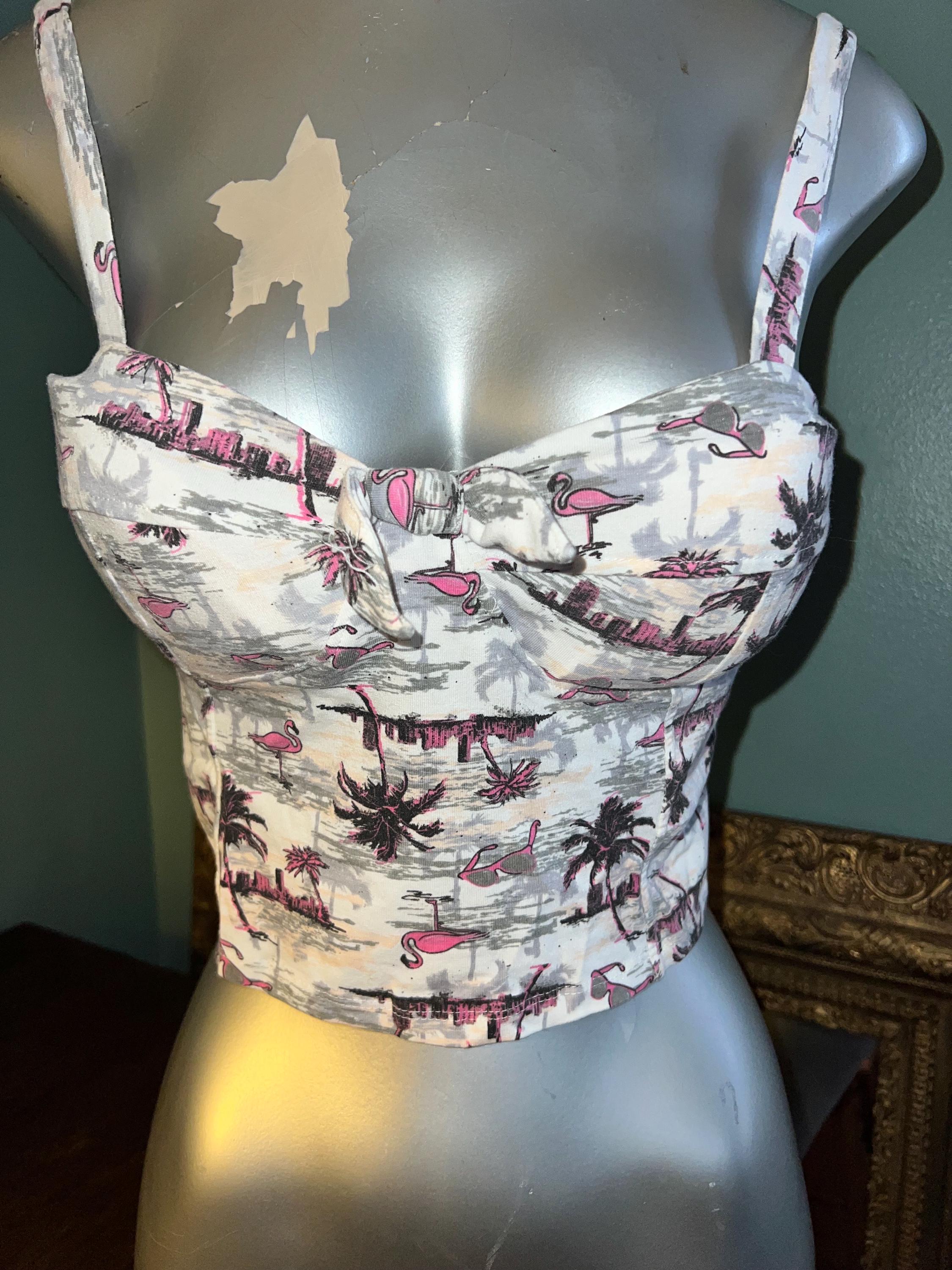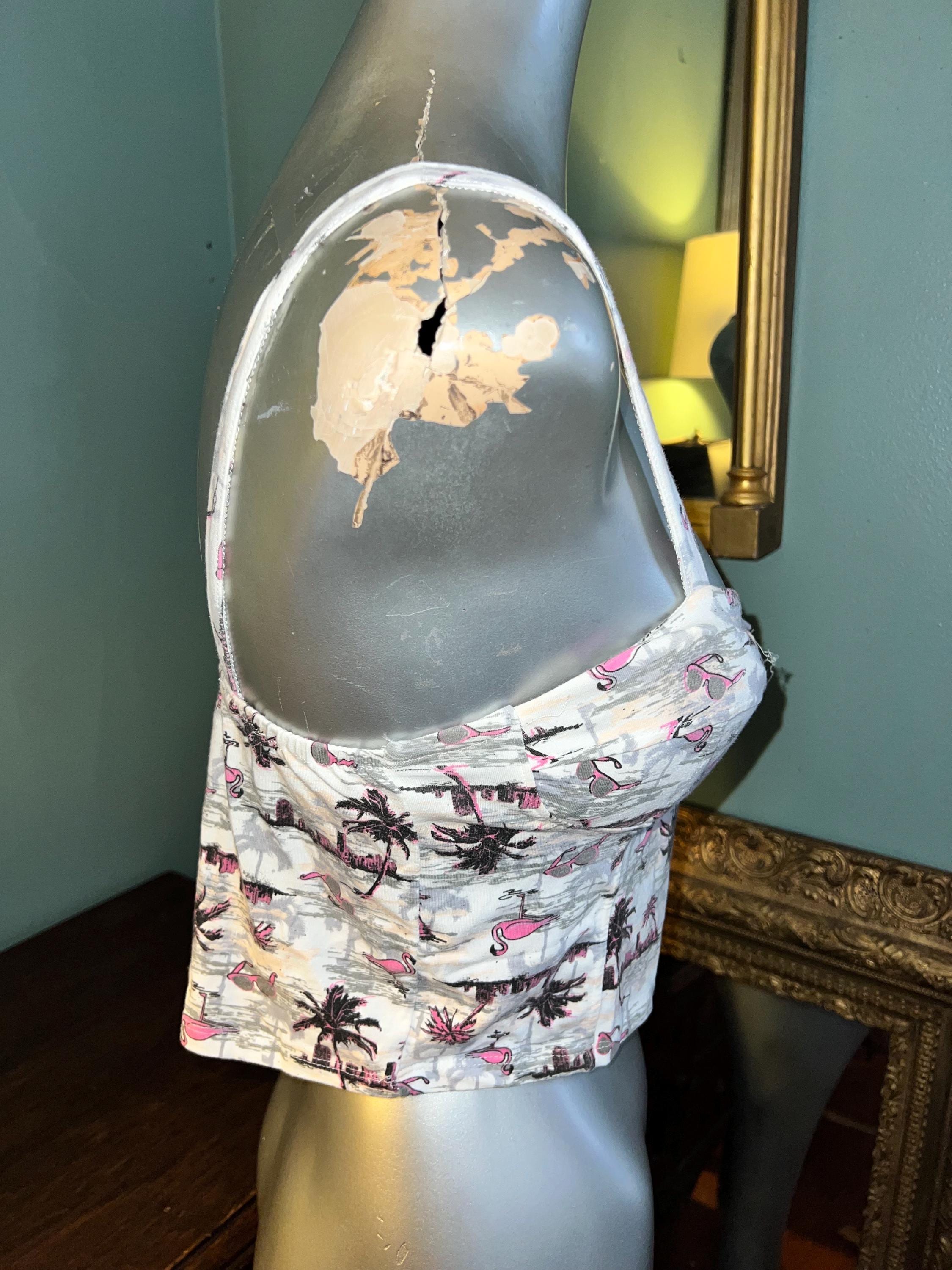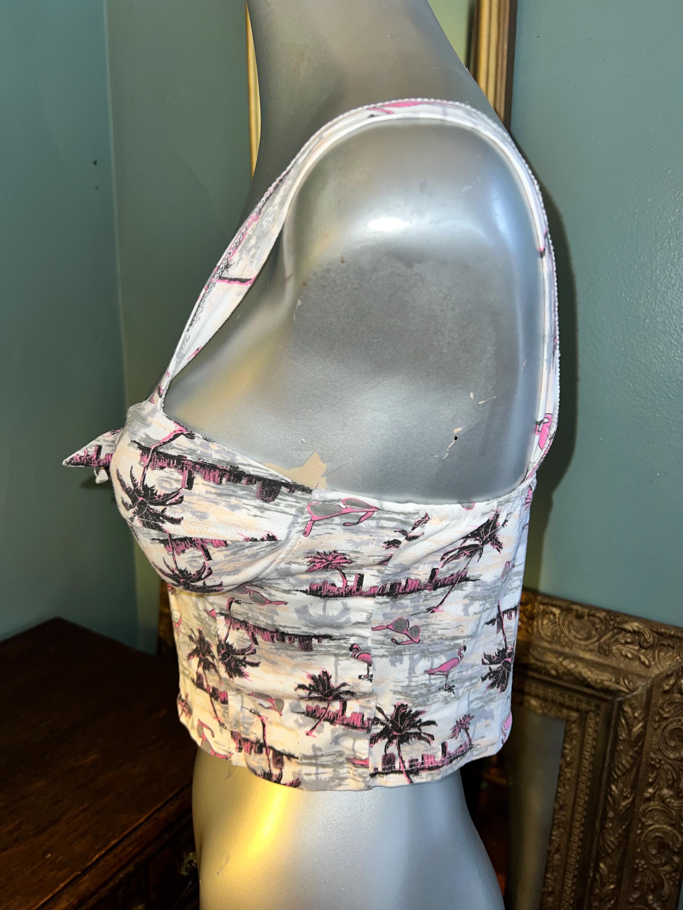 This is a cute little crop top/belly shirt. It’s mostly black, white, and gray with pink accents and pink flamingos. It’s fitted like a bra and it has padding in the bra. It’s absolutely adorable and in good vintage condition!