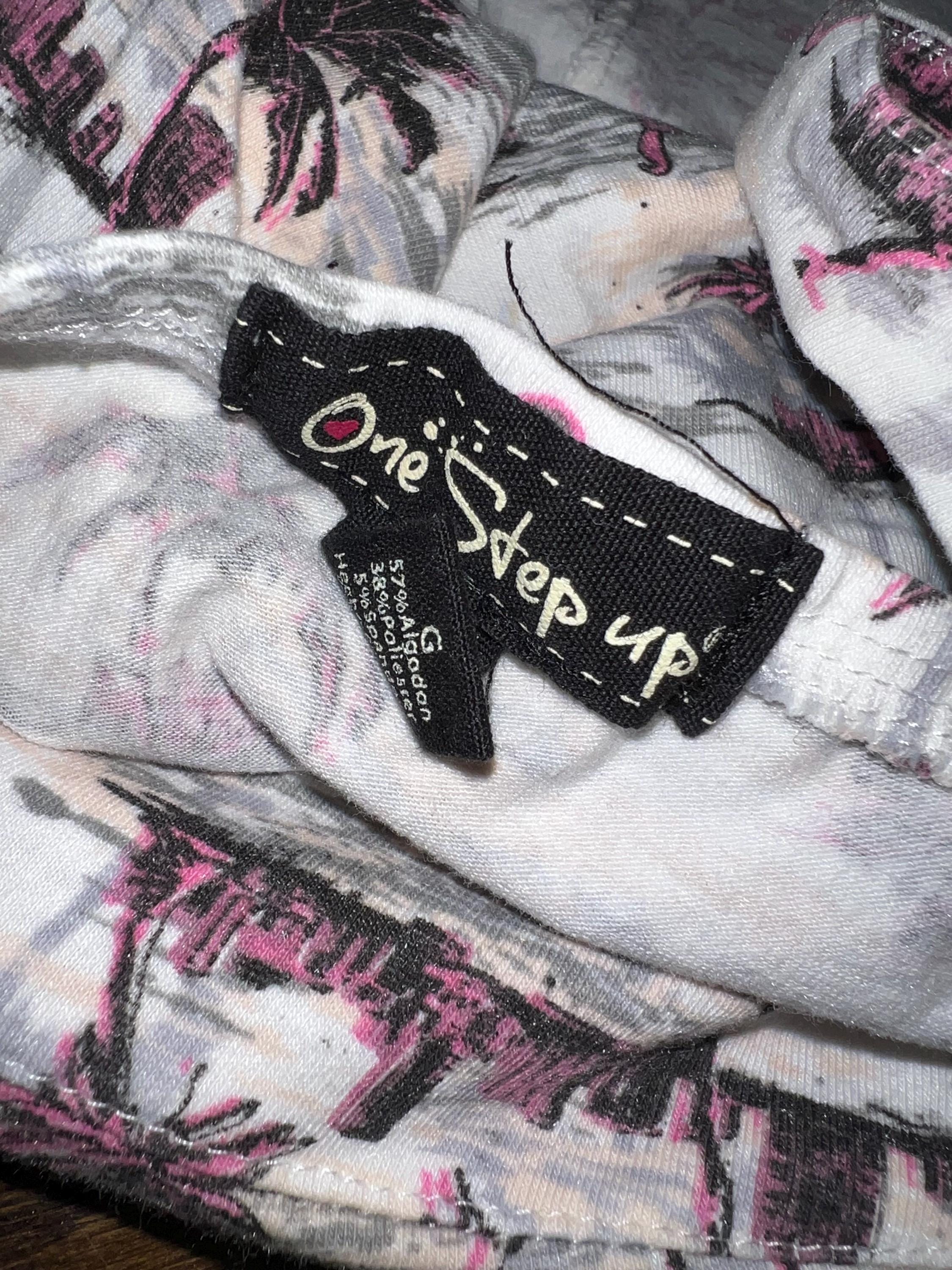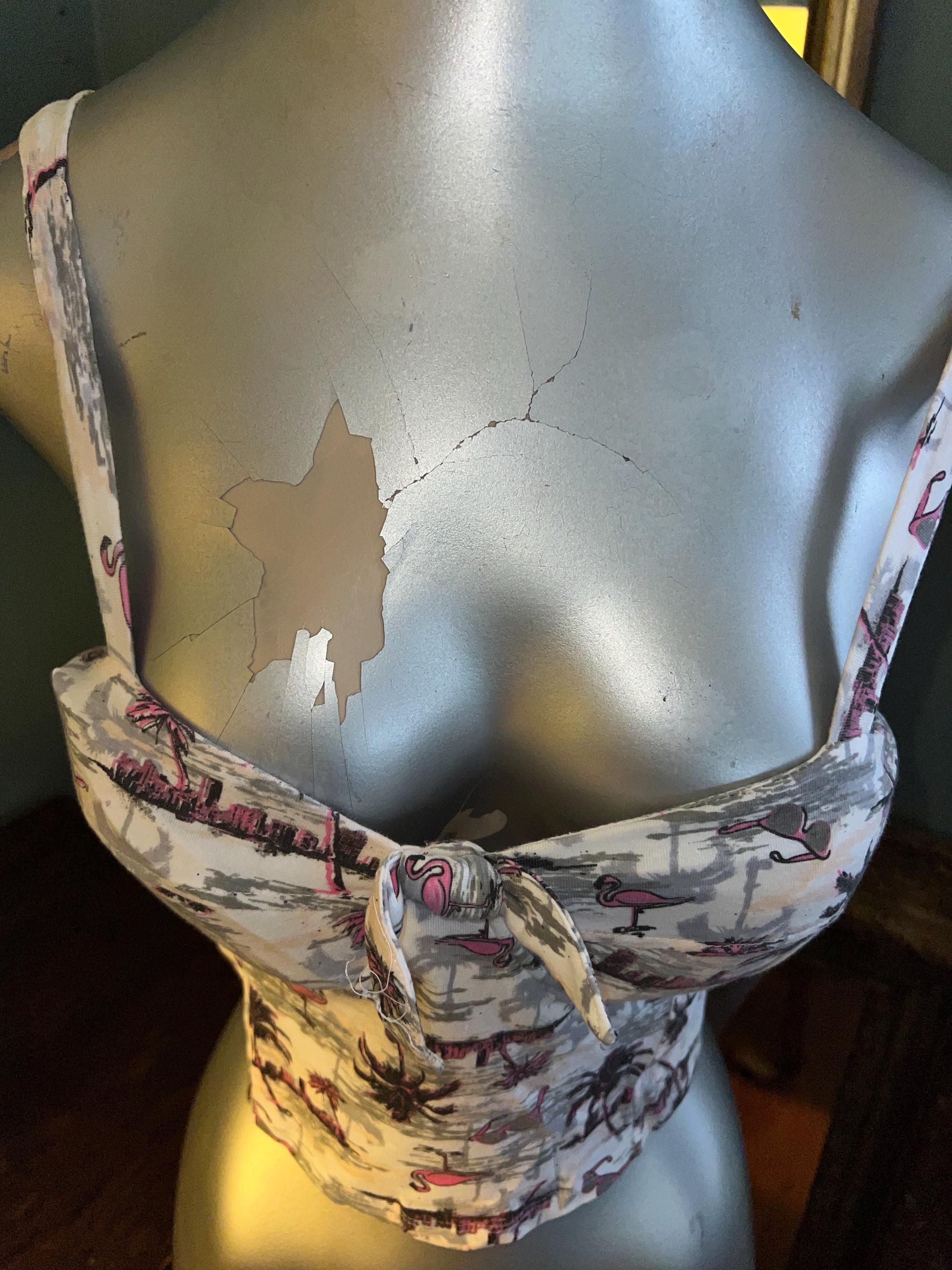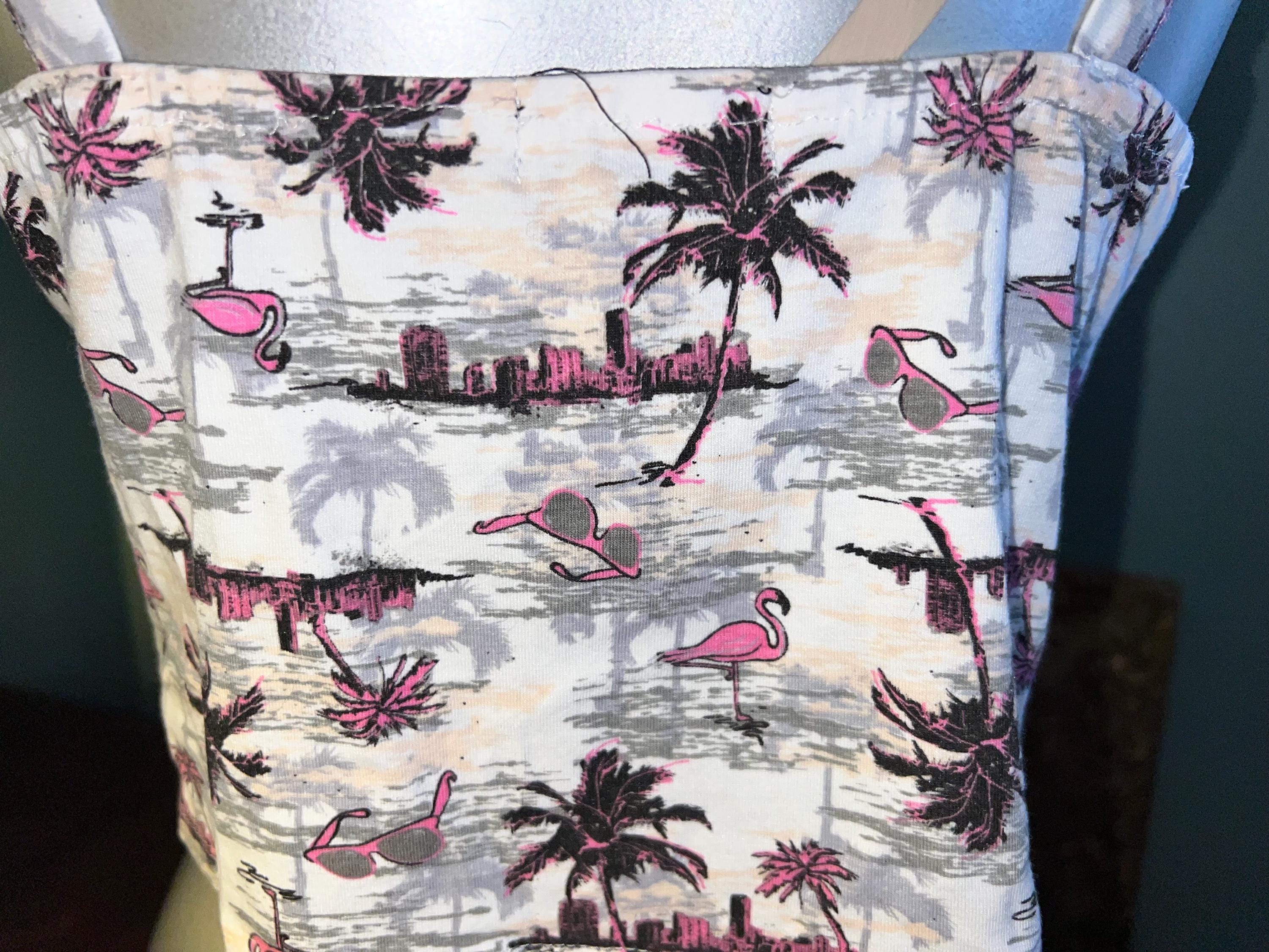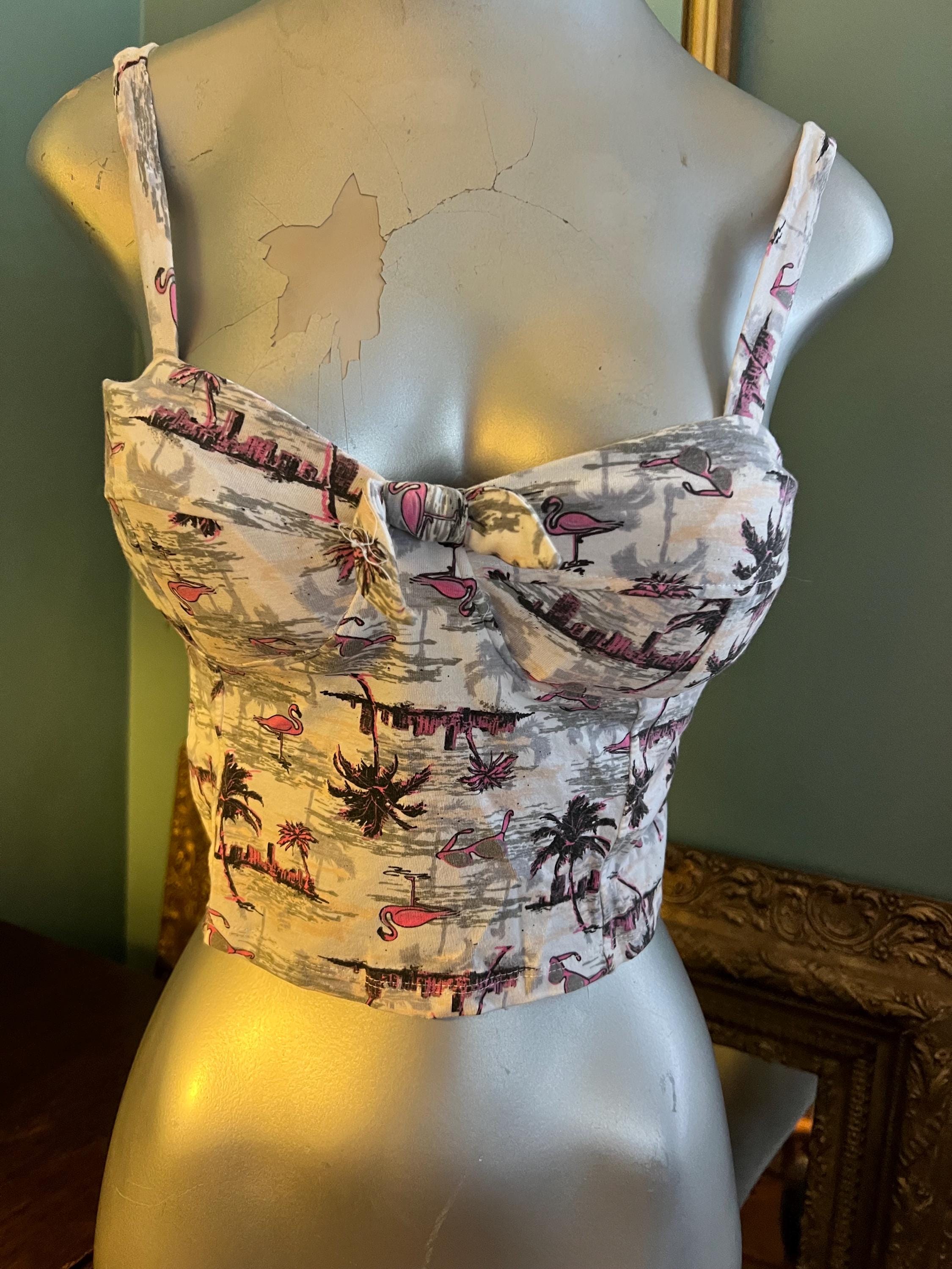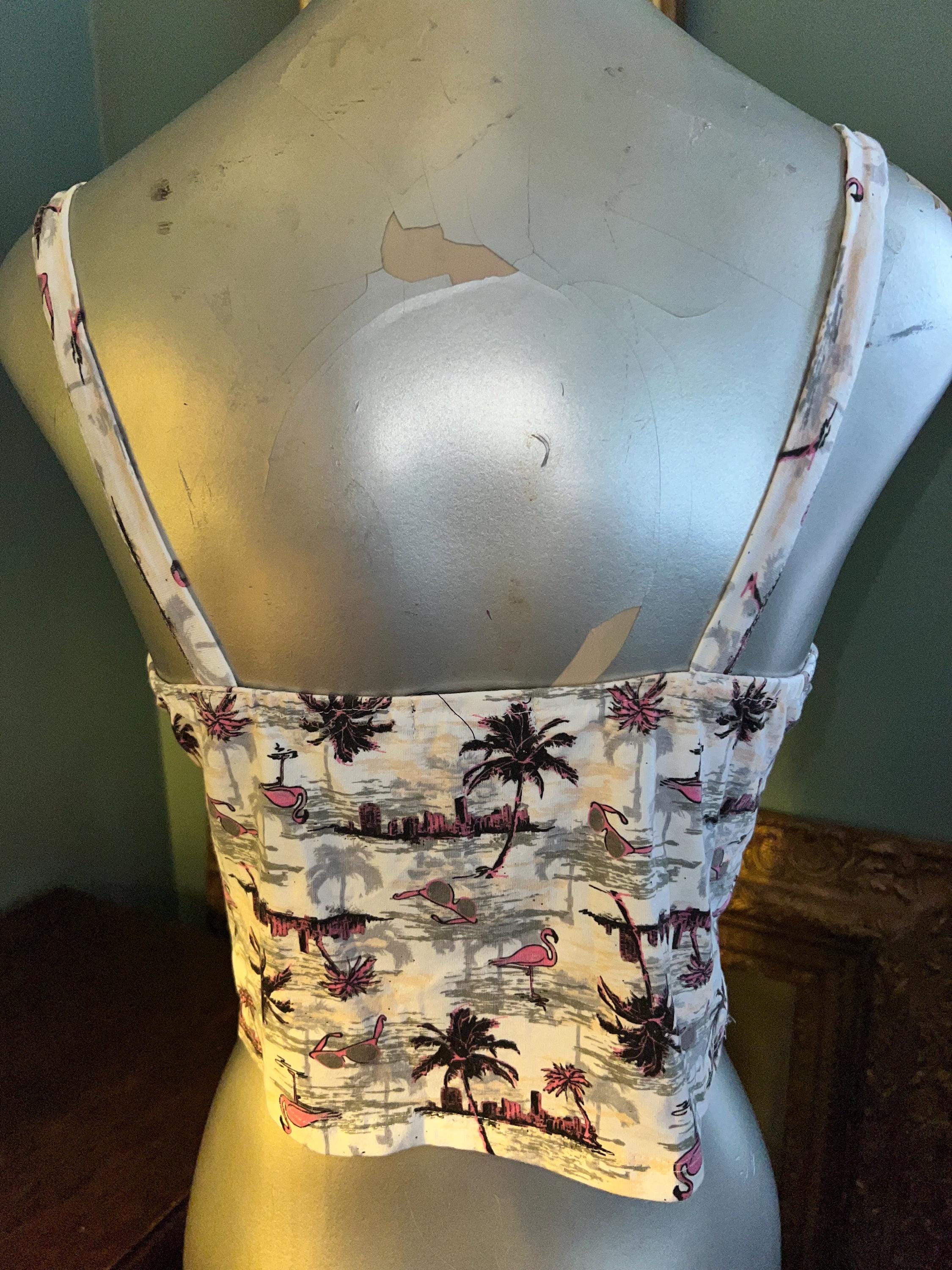This is a cute little crop top/belly shirt. It’s mostly black, white, and gray with pink accents and pink flamingos. It’s fitted like a bra and it has padding in the bra. It’s absolutely adorable and in good vintage condition!