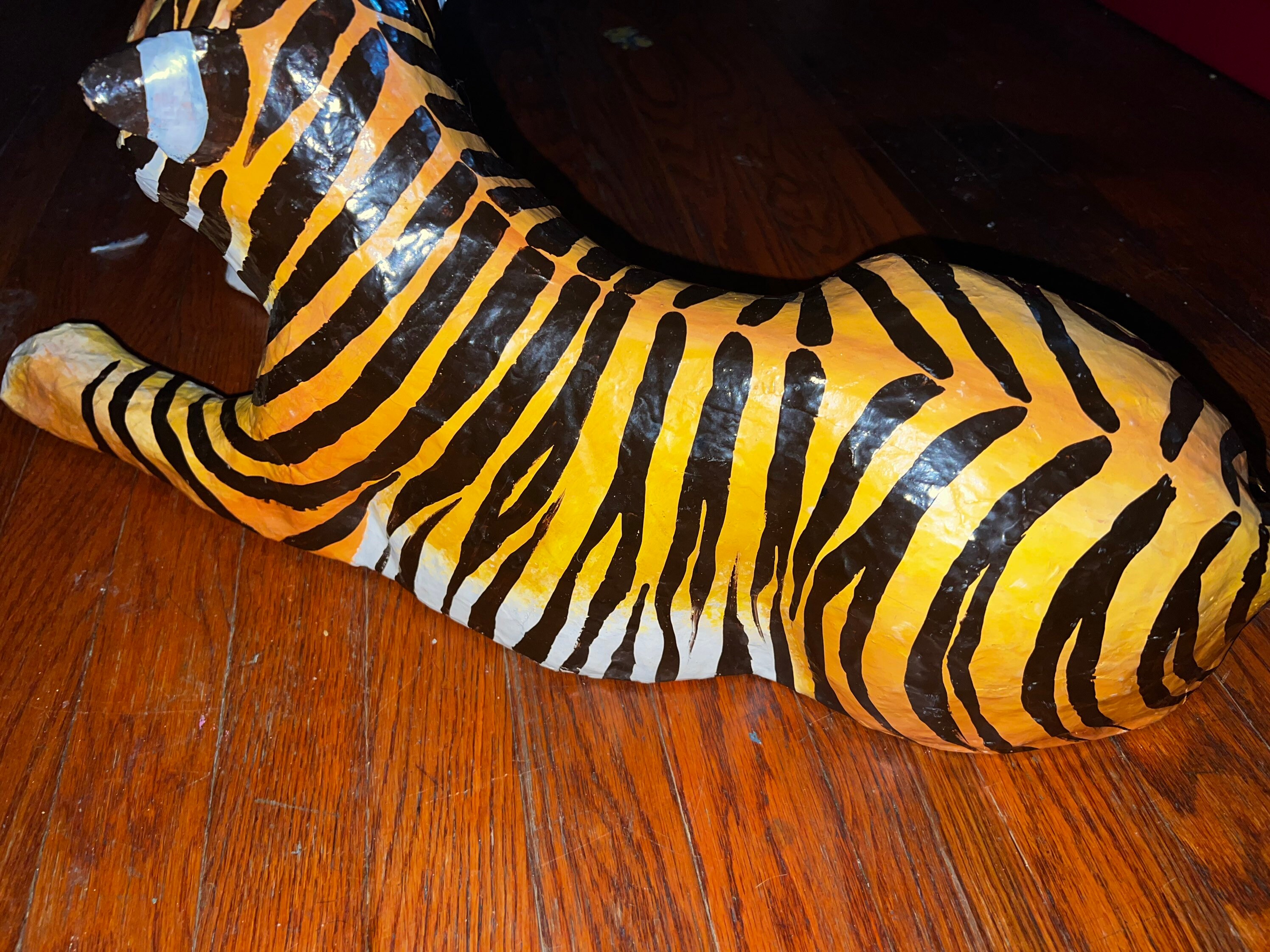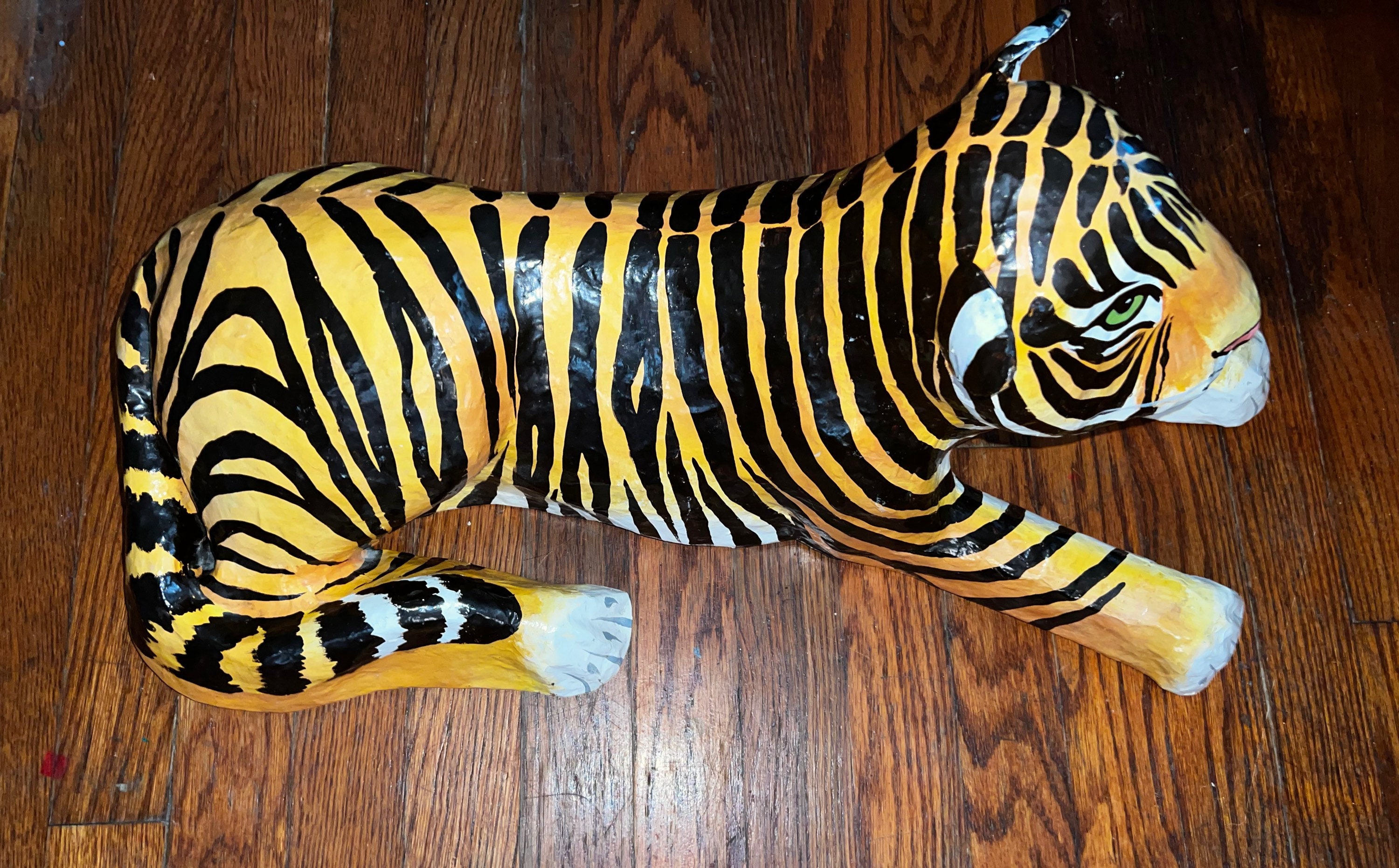 I love this huge but lightweight tiger! There’s no signature so I’m not sure who the artist is or where it’s from. i do know it only had one owner and was probably purchased in Mexico or one of the Caribbean islands.