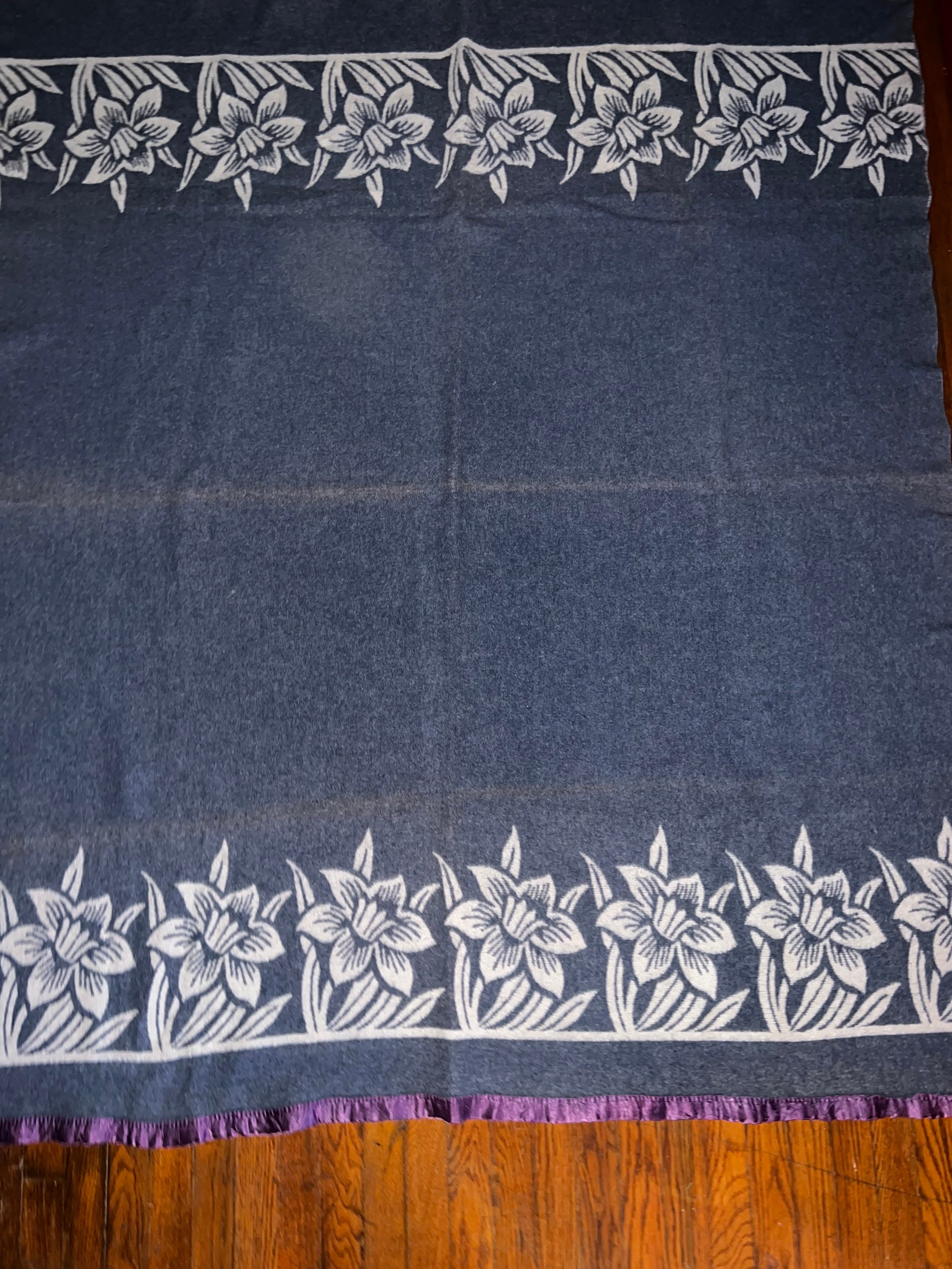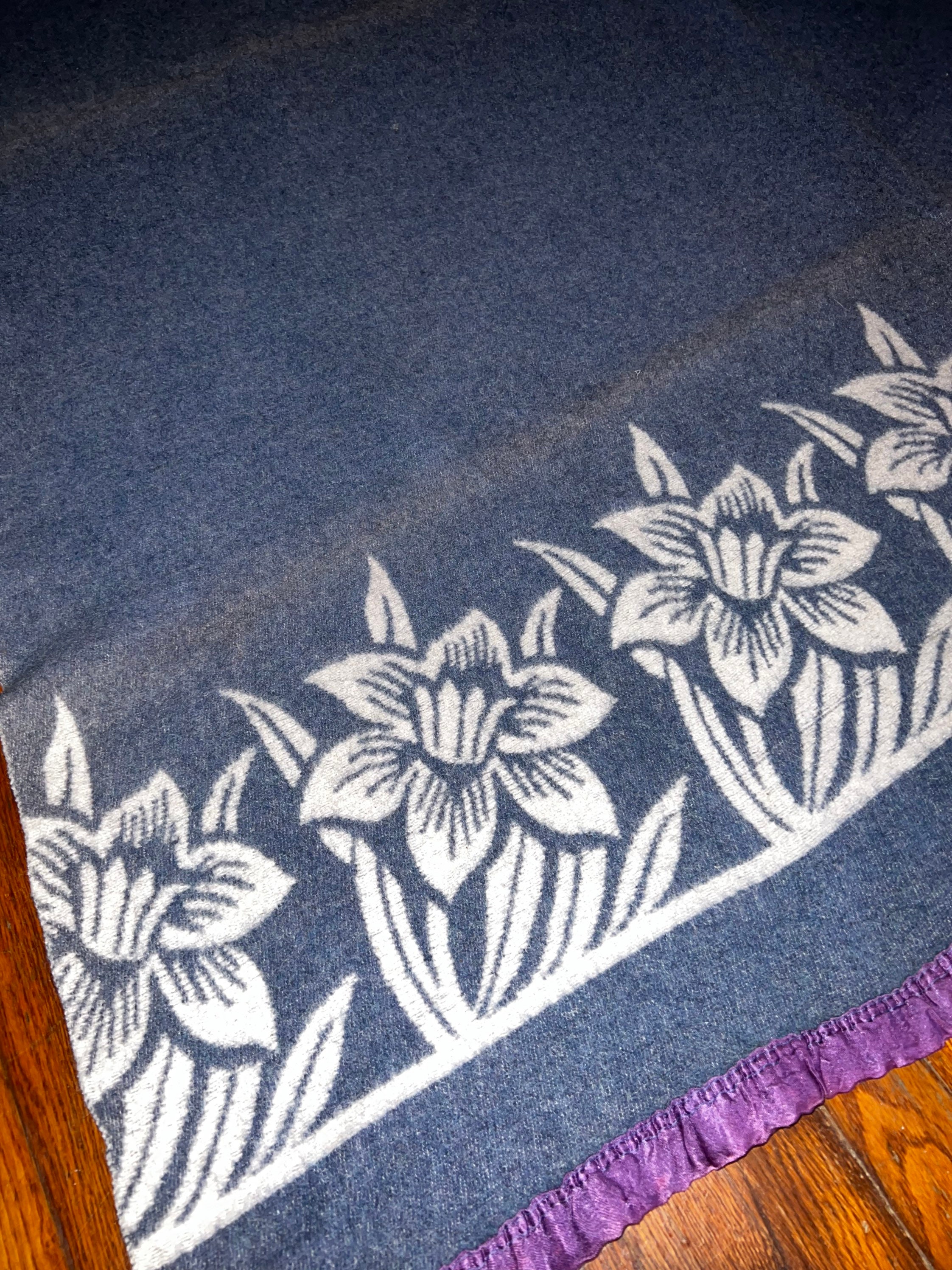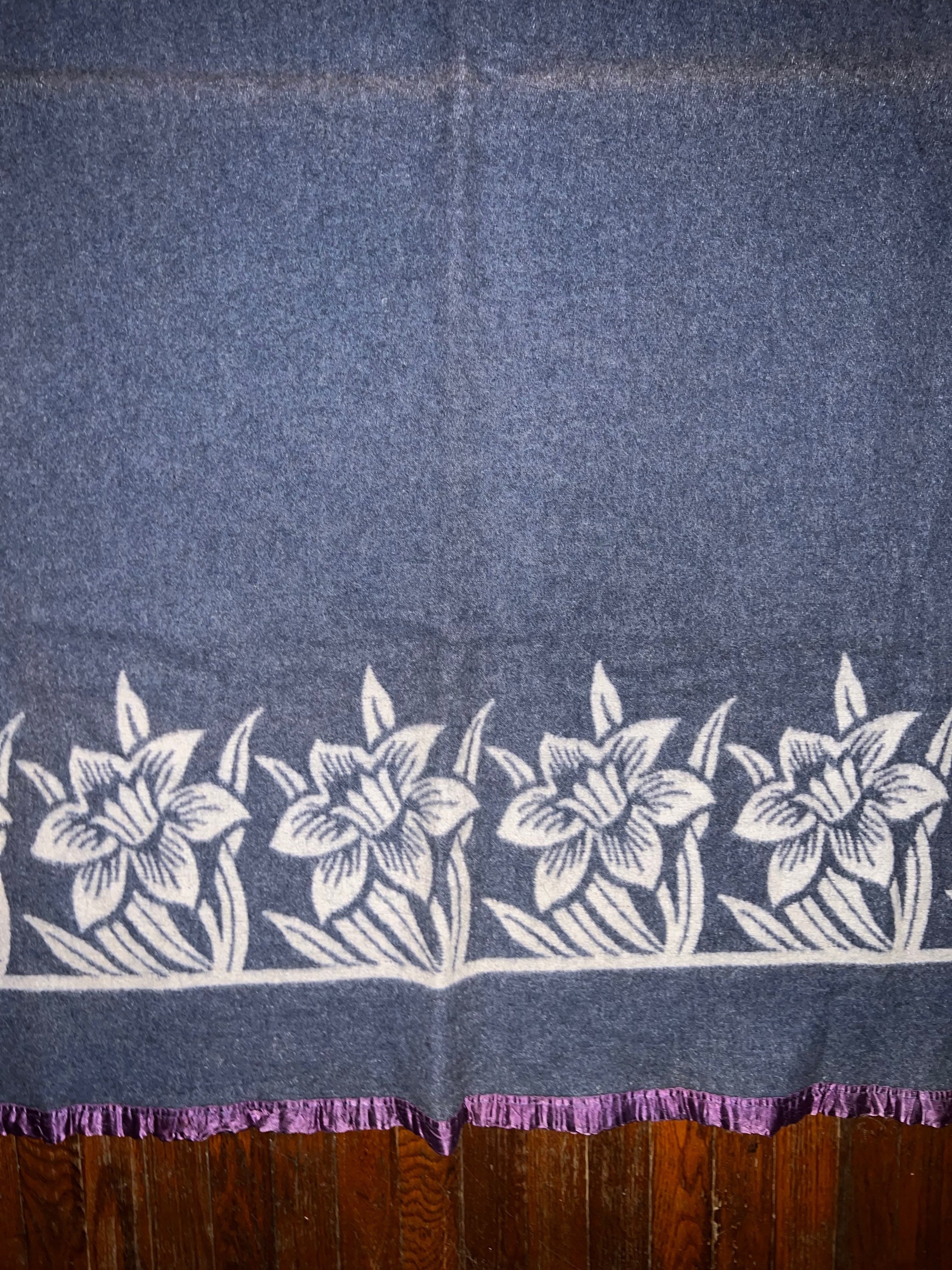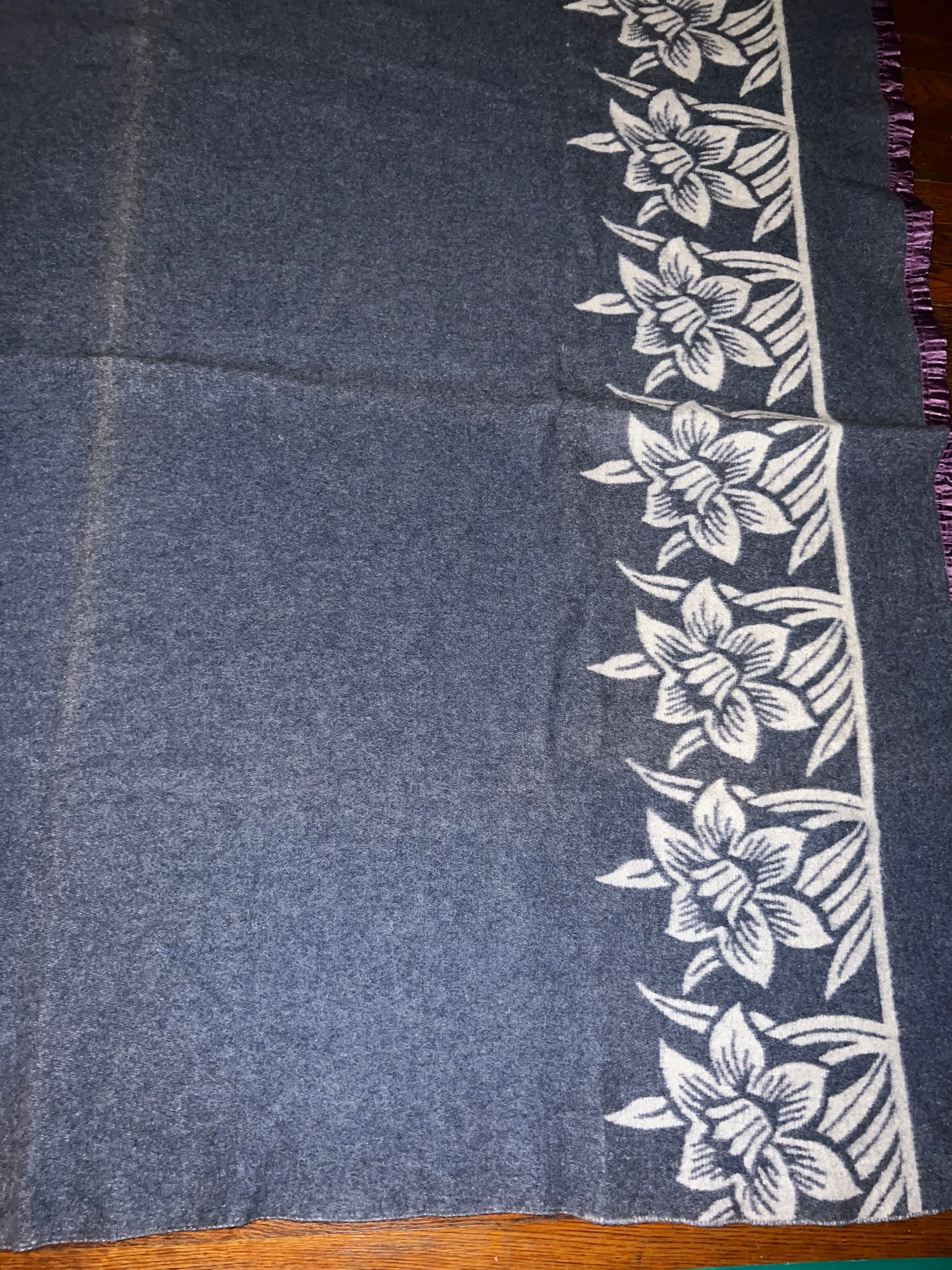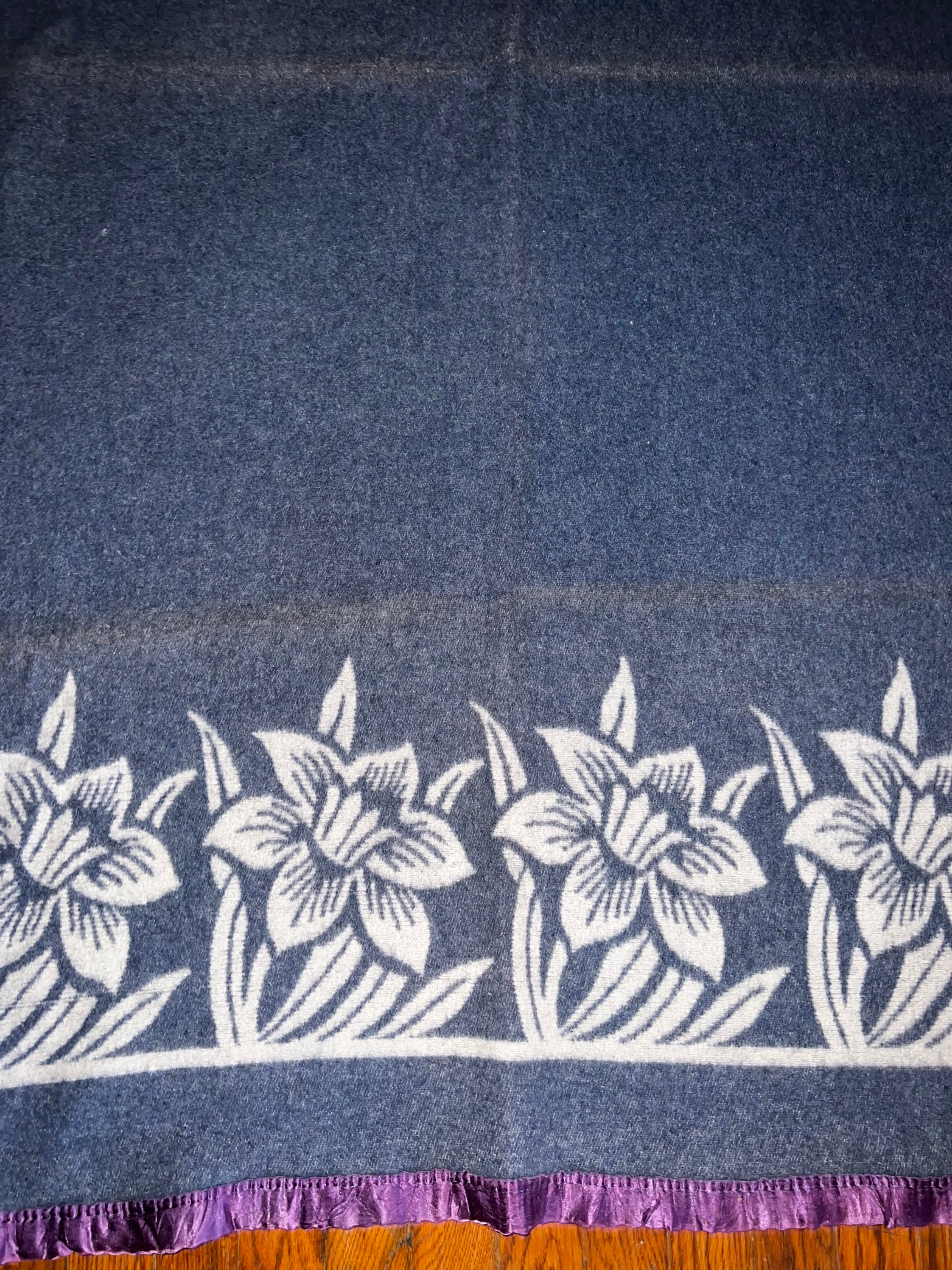 This blanket is so perfectly vintage! It’s wool or like wool material with a very cool design that features big flower power flowers! It also has gorgeous purple satin trim. The blanket looks very worn and is so soft from many uses. But this blanket has so much life left in it, it’ll look great tossed on the back of the couch or on your lap at the next campsite! No holes, stains, or tears.